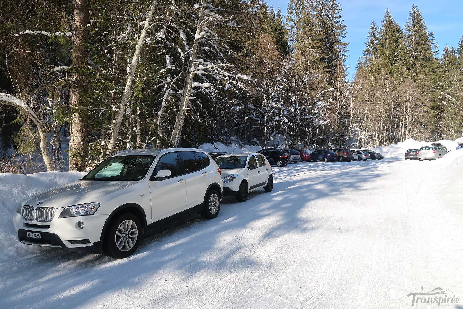 Un grand parking existe sous la ferme Les Pueys, nommé Parking des Pueys. La route est non déneigée et le parking se remplit vite. Je pars tranquillement par la route pour vite la couper et suivre une trace dans le pâturage. Le sentier est balisé.