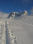 On arrive à un petit parking avant le virage du Pt1132 de Les Pars. On part à pieds pour mettre les skis après le pont. On monte ensuite vers Matélon par une route bien jolie en cette saison. On passe devant une prise d’eau de l’usine de Peuffeyrey (Peufaire sur la carte), pour ensuite partir dans la forêt, par le chemin d’été pour Le Fratchi. Ce passage en forêt est tout juste enneigée et il faut lever délicatement les skis pour éviter les cailloux ! On arrive dans la clairière des fermes de Le Fratchi (1421m) et on traverse la route pour à nouveau monter dans la forêt. On rencontre les cordes d’aide du chemin d’été juste avant de rejoindre la route que nous longeons pour un bref instant. On passe devant un panneau nous indiquant que la buvette est ouverte, mais j’ai cru que c’était un oubli. On tourne à gauche au Pt1540, pour remonter le chemin d’été en forêt qui débouche dans la clairière de Bovonne. On arrive à la buvette du ski-club de Bex à Bovonne, qui est donc bel et bien ouverte ! Quelle surprise. Nouchka, fatiguée si arrêtera avec Valdine la chienne (chien interdit !). De notre coté, on continue avec Christian pour monter dans le vallon vers La Motte. Le soleil fait enfin son apparition, après la neige, et cela nous réjouit ! On arrive à La Motte (1940m), avec une vue magnifique sur le Lion d’Argentine, juste devant nous et la chaine du Grand Muveran sur la droite. Lorsque nous arrivons, les personnes qui ont refait la trace descendent avec leur chien et vu l’épaisseur de la poudreuse, le berger allemand ressemble plus à une taupe qu’à un chien ! En tout cas, il s’éclate !