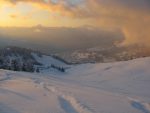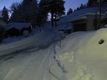 C’est le coucher du soleil, on ne s’attarde pas et on redescend dans une grosse poudreuse; on s’enfonce jusqu’aux genoux. Que du bonheur ! Mais la pente est faible vers Bovonne et il faut pousser un peu, pour redescendre sur les cotés du chemin de la montée. Au Pt1540, on prend la route, conseil de la gardienne de la buvette, car le chemin normal de la descente est en forêt et la neige y est trop faible. On se laisse glisser sur cette route et on retrouve Nouchka. On rejoint la route de Solalex au dessus de Cergnement. Vu la distance restante, on propose à Nouchka de rejoindre le départ de la piste de ski de fond et un couple de raquetteurs comme escorte ! Ils la rameront à un teamroom de La Barboleusaz. De notre coté on longe la route pour Matélon qui est un long faux plat. Pas terrible en ski, surtout qu’il fait presque nuit. A Matélon, la pente est meilleur et nous pouvons descendre le long du chemin de la montée jusqu’au pont de Les Pars. A la voiture, je découvre qu’il fait -10° et je comprends pourquoi mon appareil photo, malgré des piles pleines, n’arrivait que difficilement à prendre des photos.