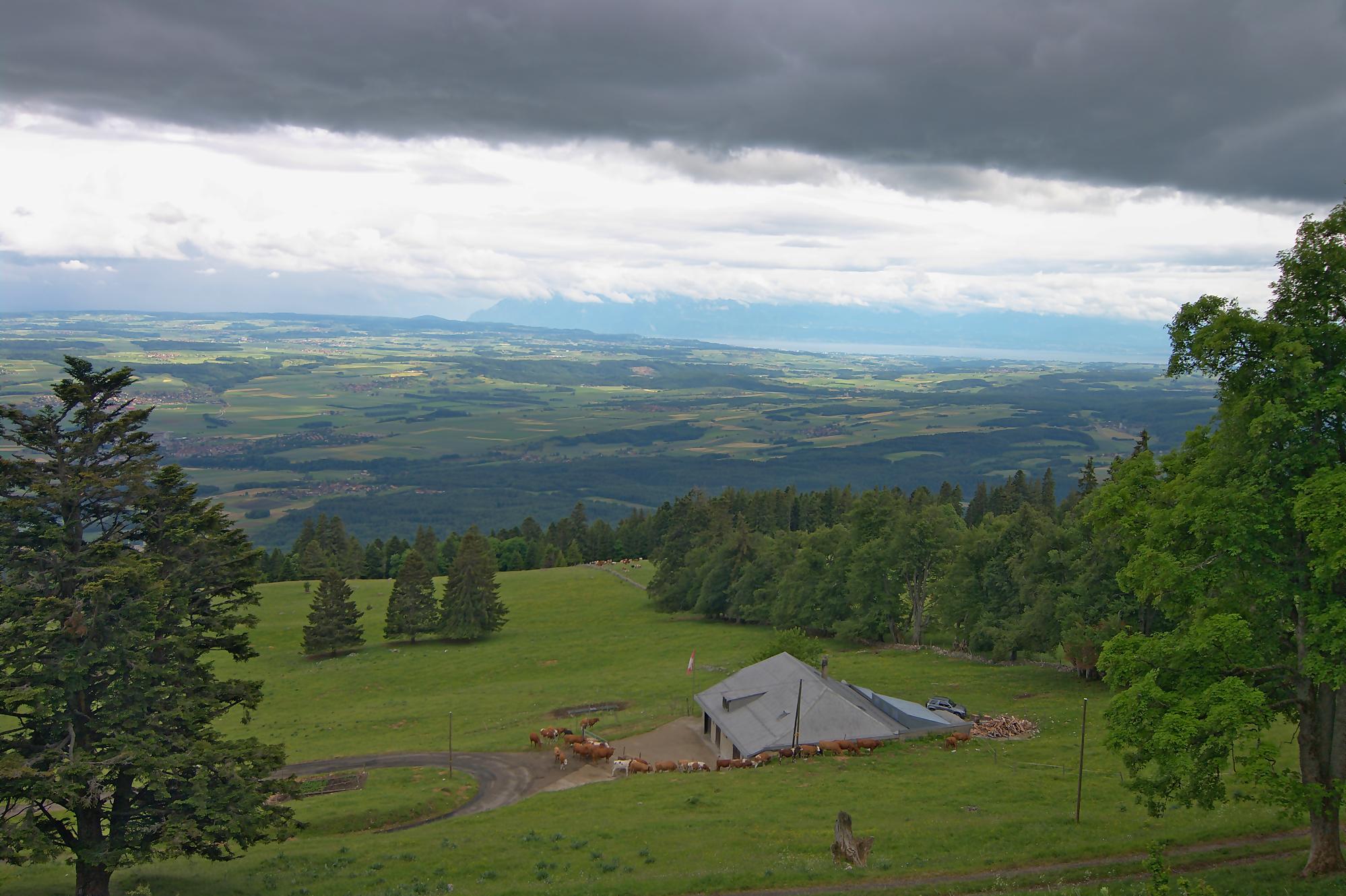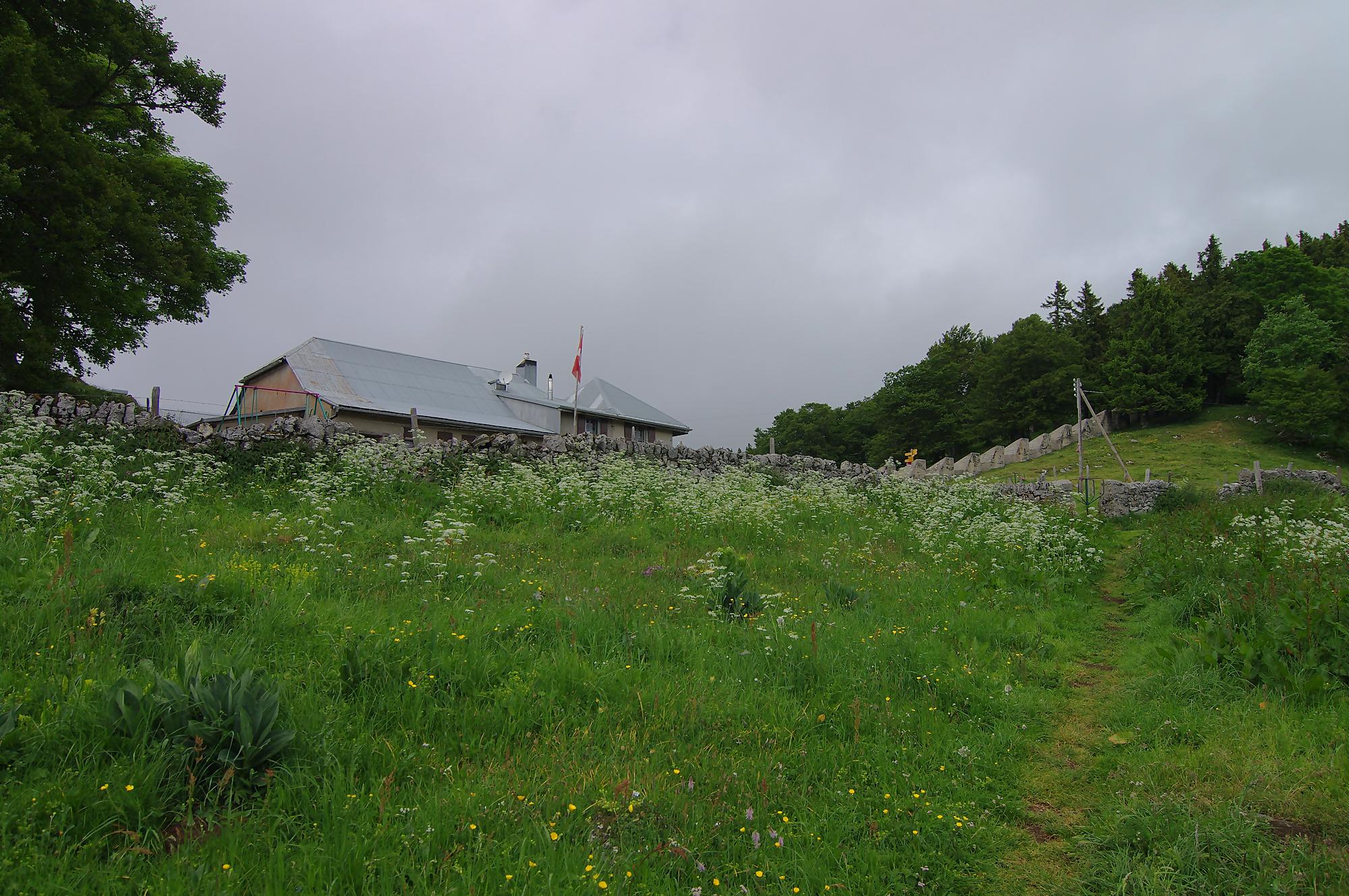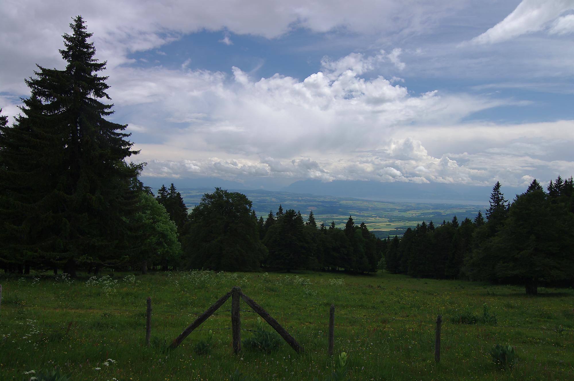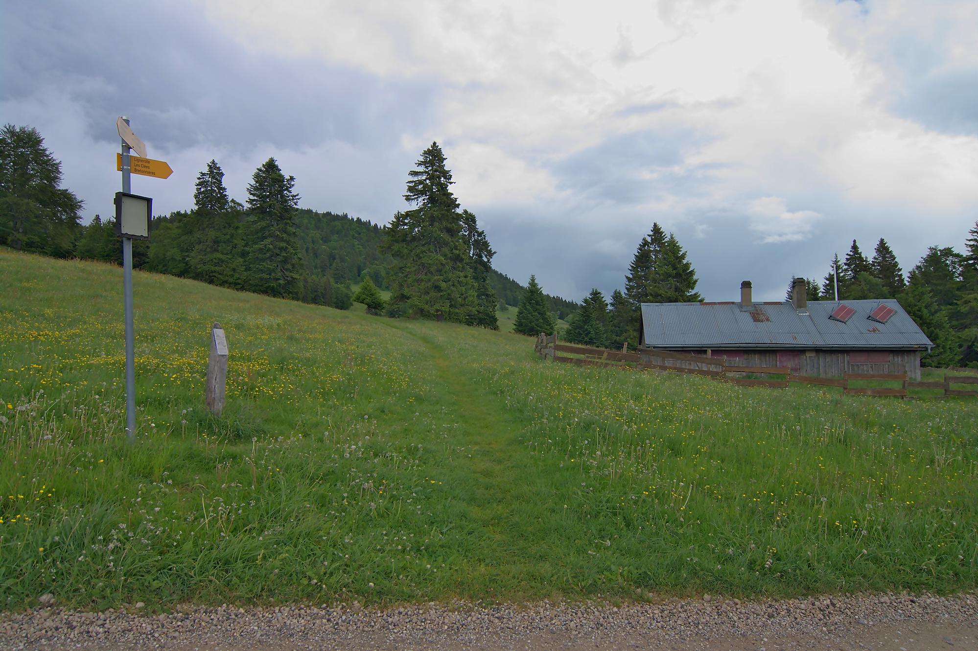 L’éclaircie tant attendue finit par arriver et je peux prendre un panorama. Puis je repars, et fait une visite au sommet voisin, Pt1554 au-dessus du chalet du Suchet. Je repasse devant ce restaurant pour descendre dans le champ direction La Matoule (ou Matoulaz), mais la pluie revient dire bonjour et je cours sous un arbre et rate une bifurcation; dans ce champ le marquage est faible et il faut bien suivre les traces. Après un peu d’errance, je retrouve le droit chemin et je bifurque dans la forêt pour rejoindre la ferme Le Rex.