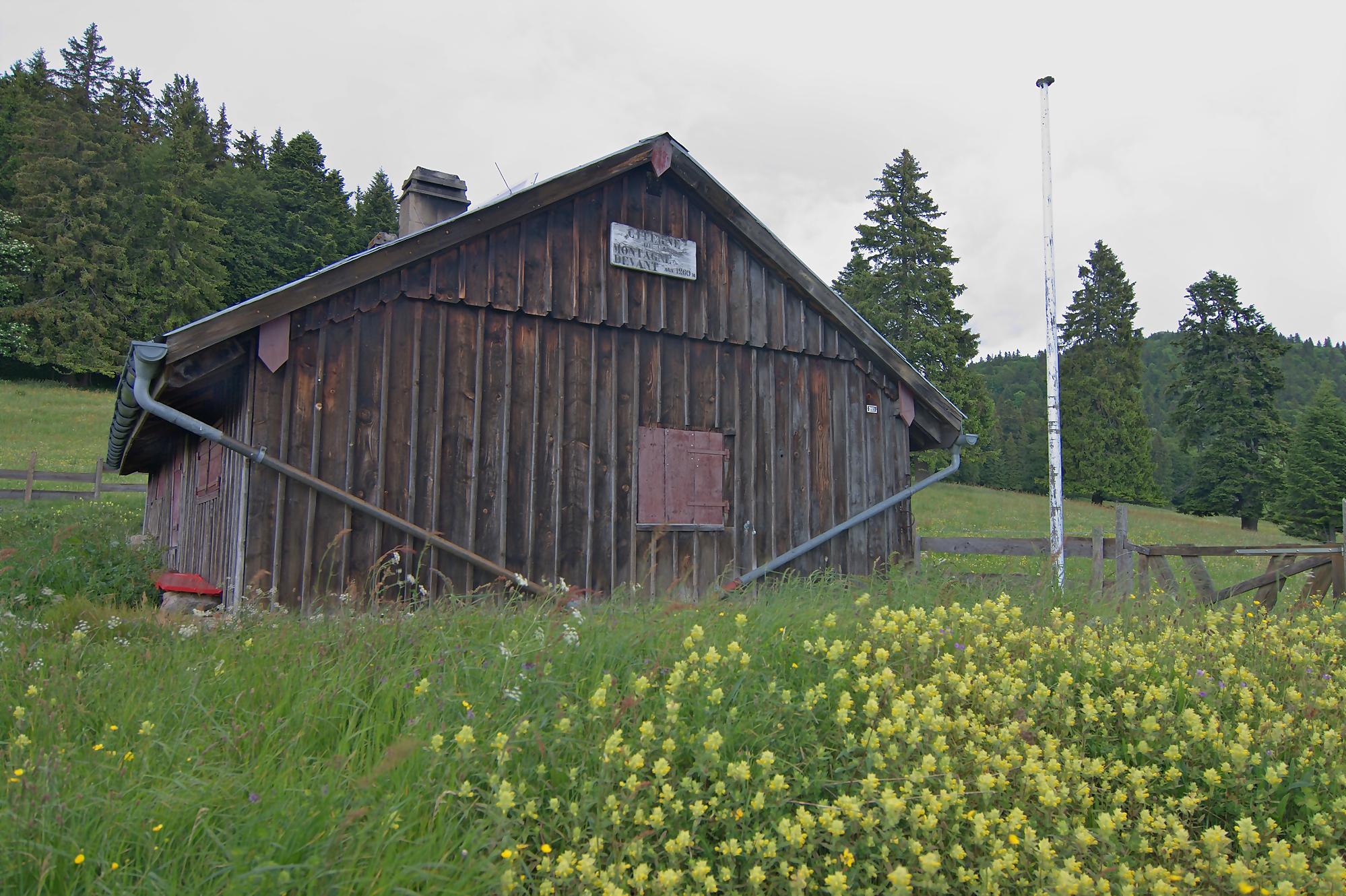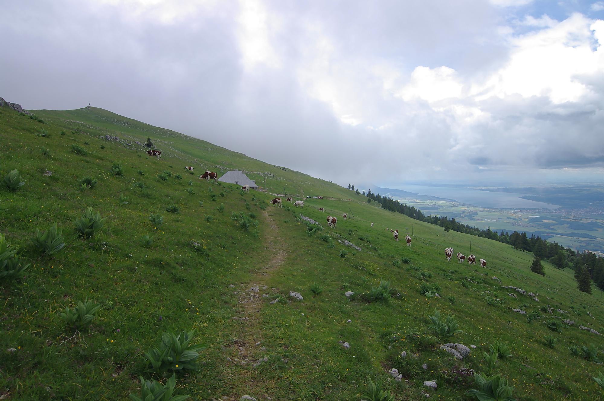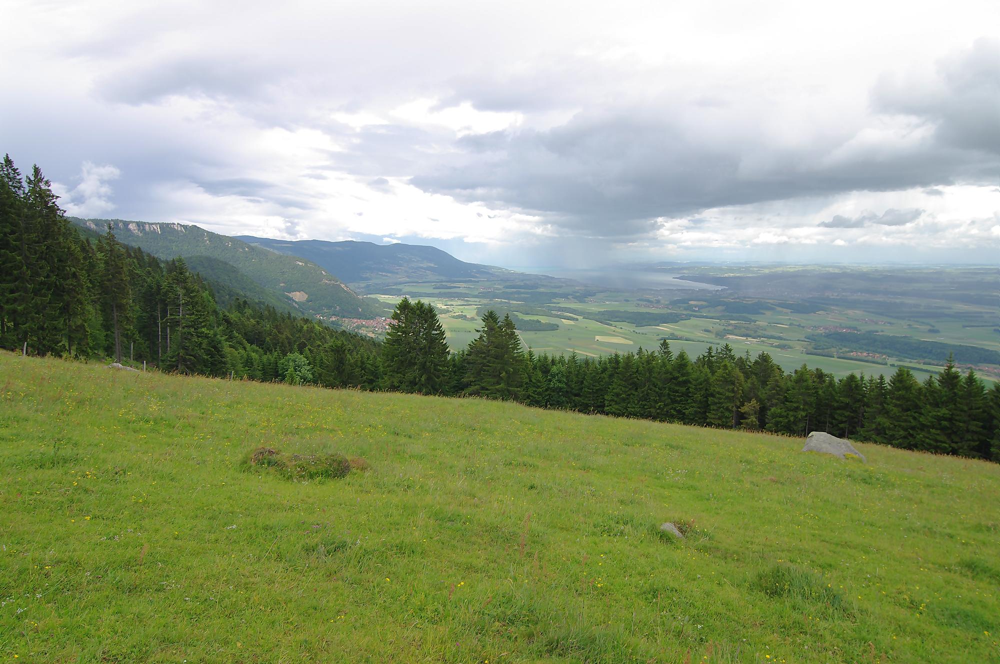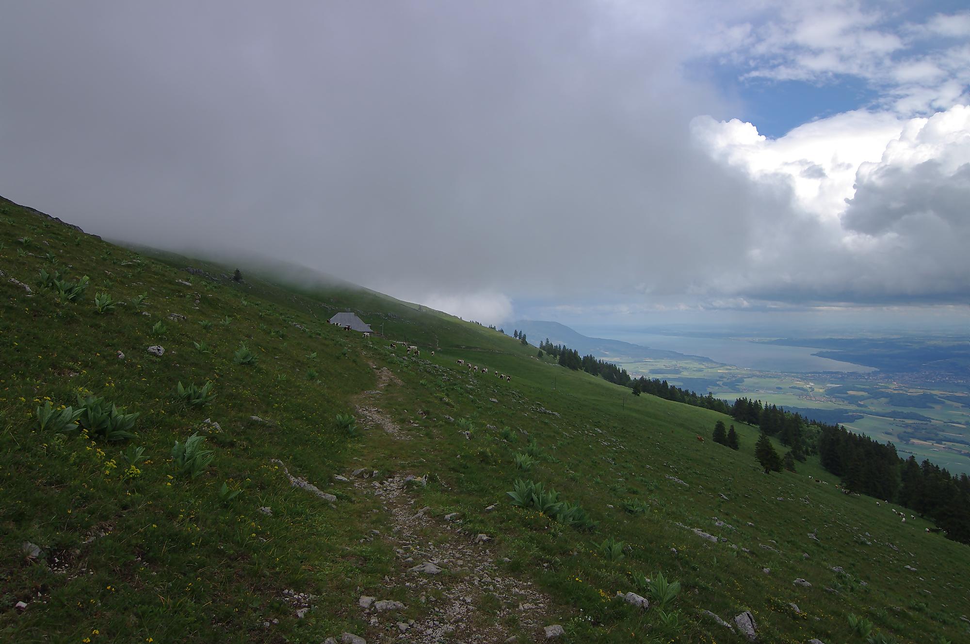 L’éclaircie tant attendue finit par arriver et je peux prendre un panorama. Puis je repars, et fait une visite au sommet voisin, Pt1554 au-dessus du chalet du Suchet. Je repasse devant ce restaurant pour descendre dans le champ direction La Matoule (ou Matoulaz), mais la pluie revient dire bonjour et je cours sous un arbre et rate une bifurcation; dans ce champ le marquage est faible et il faut bien suivre les traces. Après un peu d’errance, je retrouve le droit chemin et je bifurque dans la forêt pour rejoindre la ferme Le Rex.