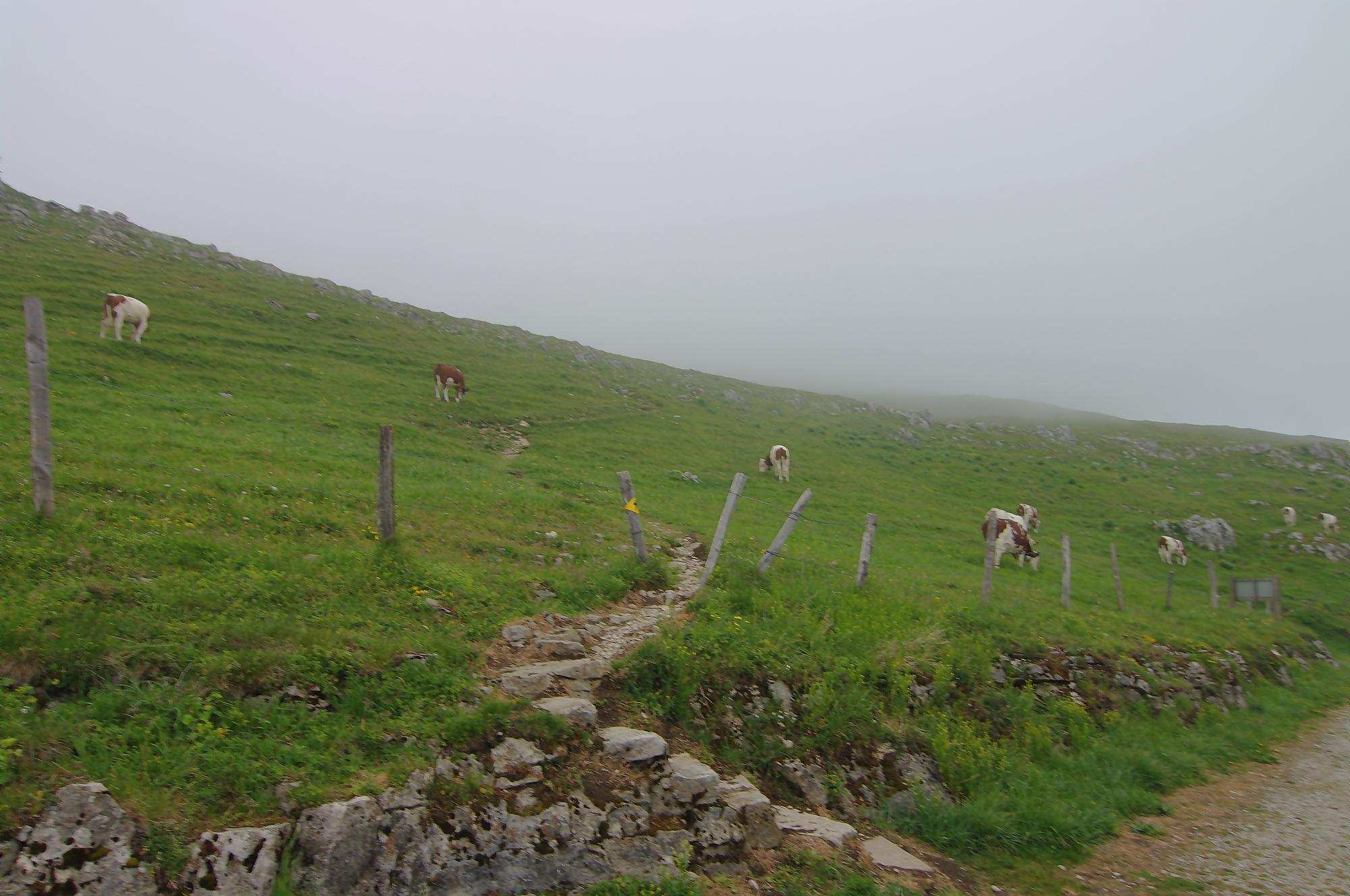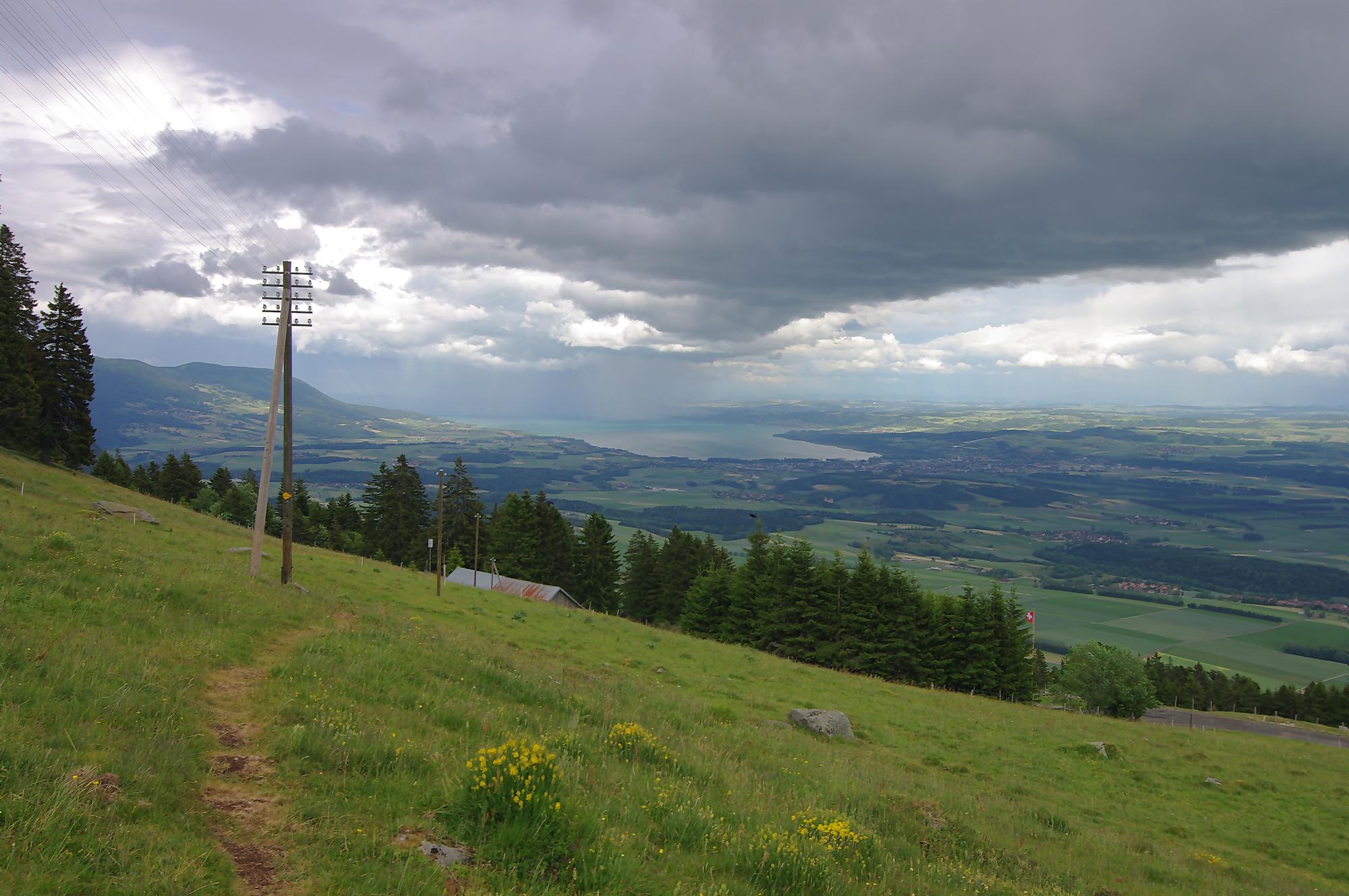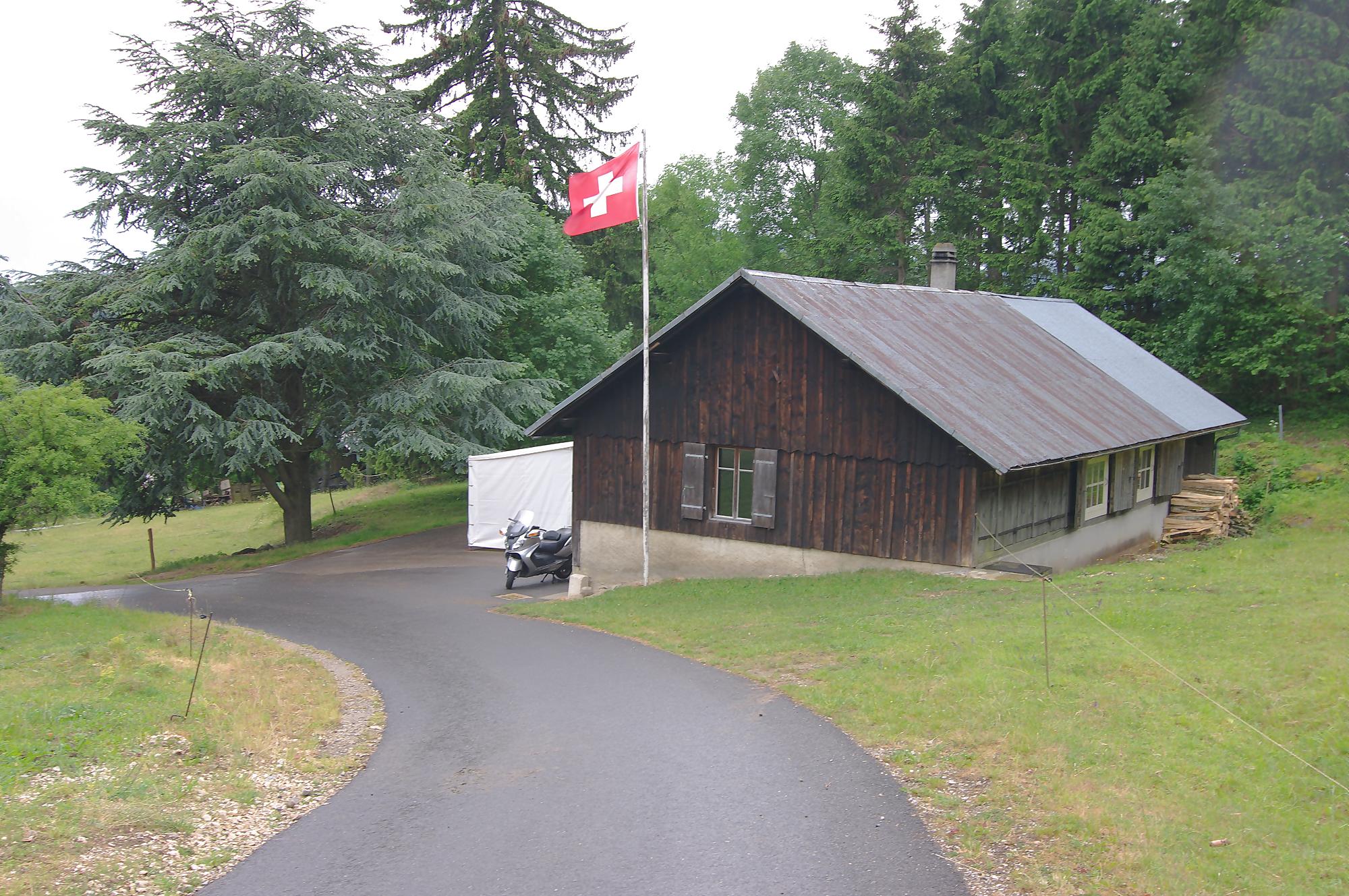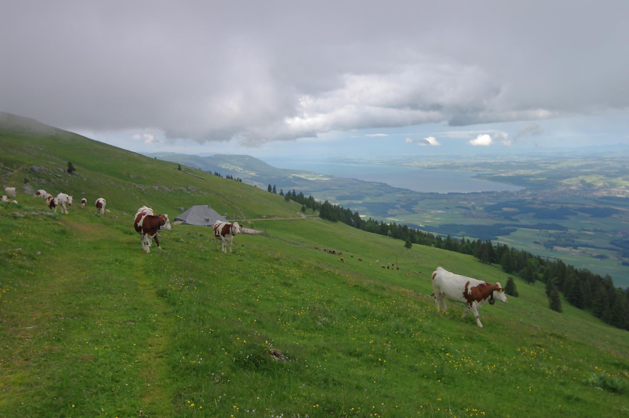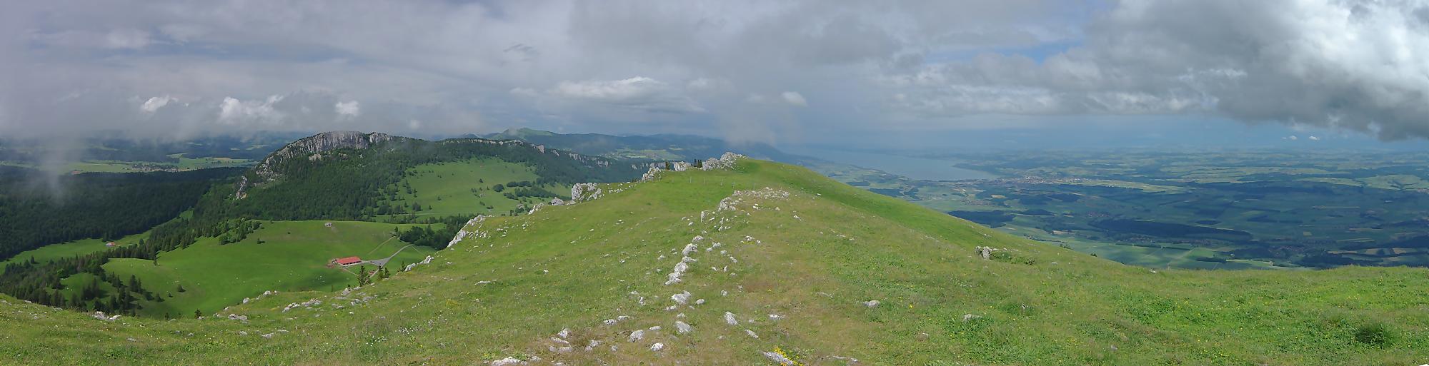 L’éclaircie tant attendue finit par arriver et je peux prendre un panorama. Puis je repars, et fait une visite au sommet voisin, Pt1554 au-dessus du chalet du Suchet. Je repasse devant ce restaurant pour descendre dans le champ direction La Matoule (ou Matoulaz), mais la pluie revient dire bonjour et je cours sous un arbre et rate une bifurcation; dans ce champ le marquage est faible et il faut bien suivre les traces. Après un peu d’errance, je retrouve le droit chemin et je bifurque dans la forêt pour rejoindre la ferme Le Rex.