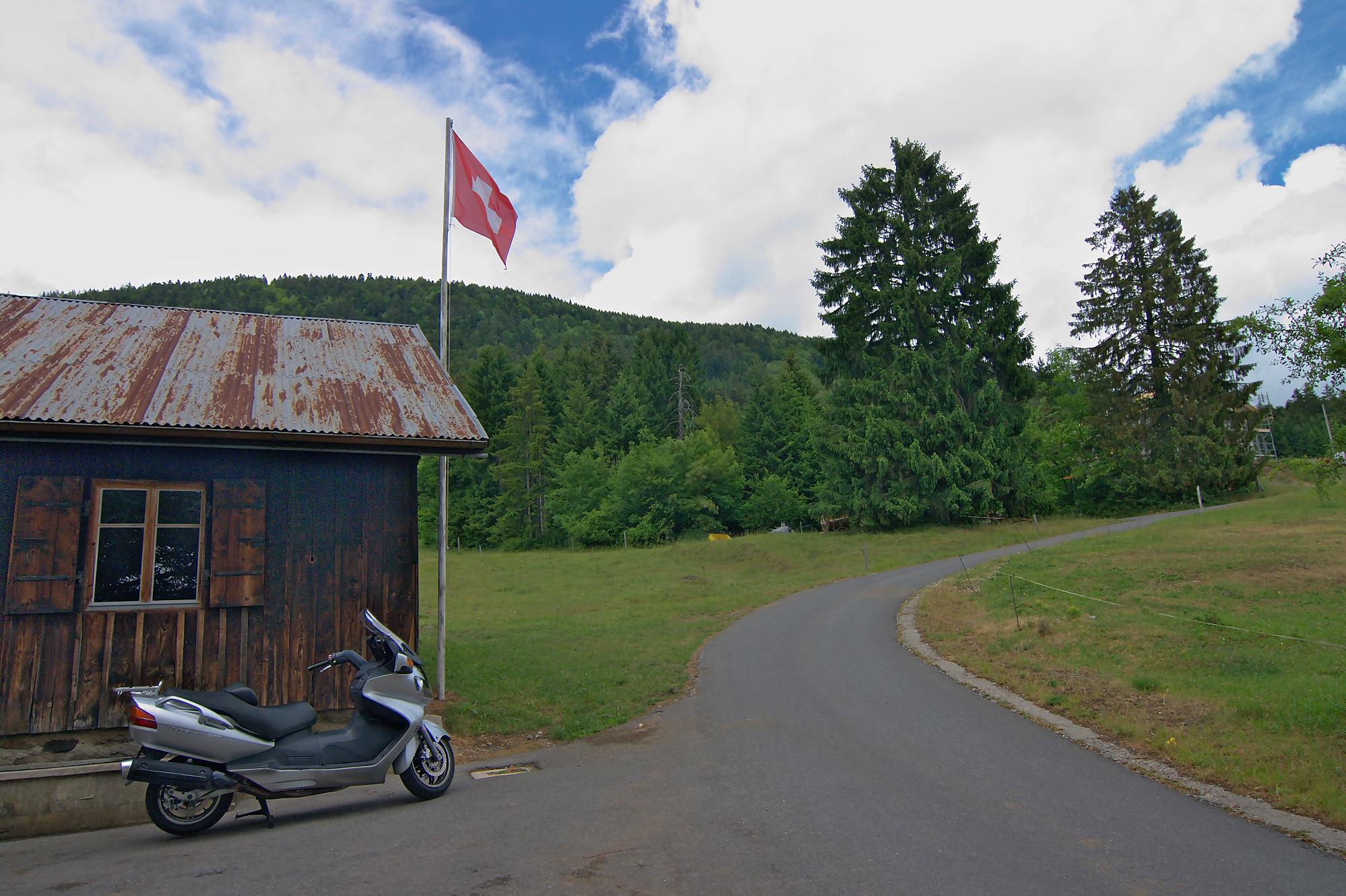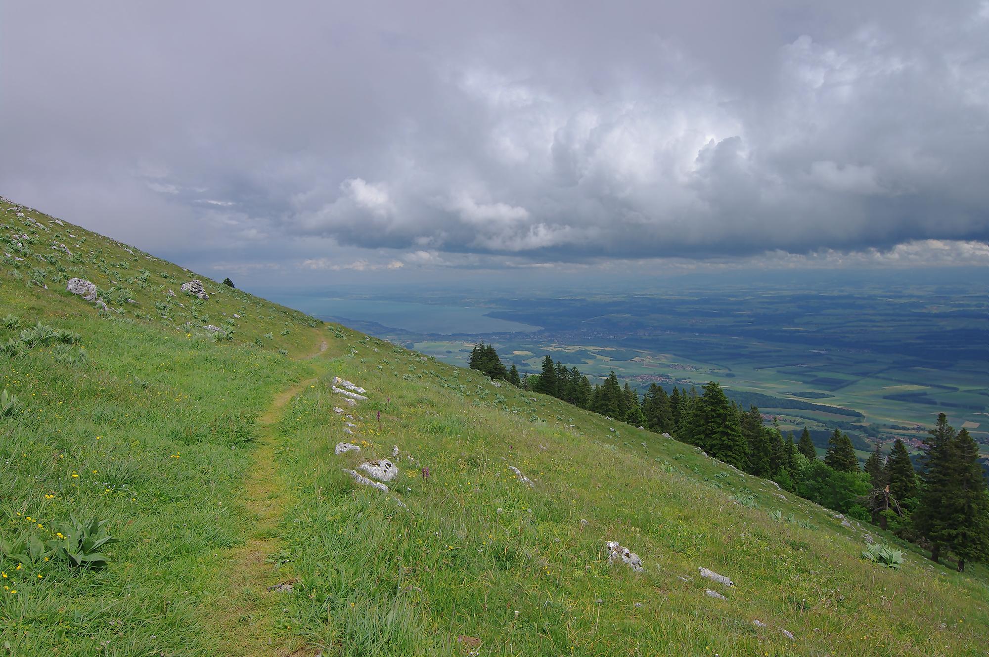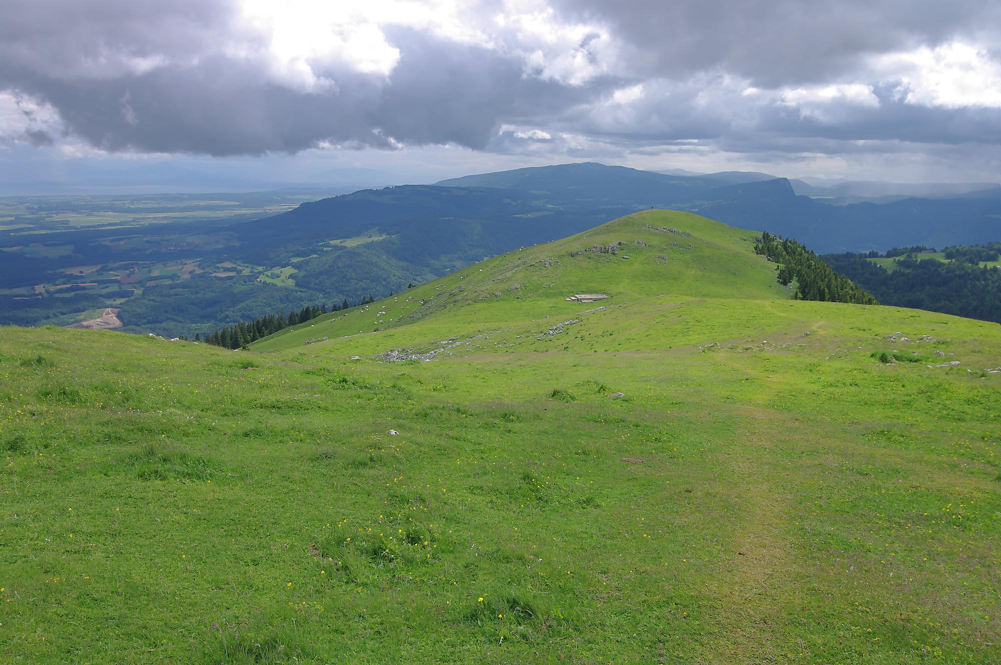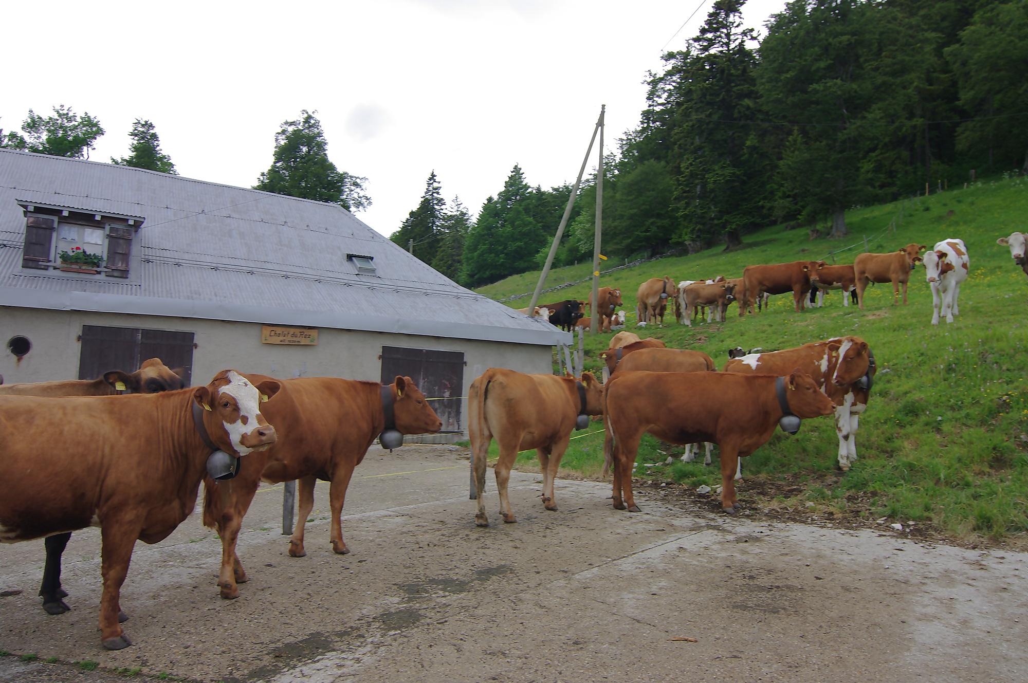 L’éclaircie tant attendue finit par arriver et je peux prendre un panorama. Puis je repars, et fait une visite au sommet voisin, Pt1554 au-dessus du chalet du Suchet. Je repasse devant ce restaurant pour descendre dans le champ direction La Matoule (ou Matoulaz), mais la pluie revient dire bonjour et je cours sous un arbre et rate une bifurcation; dans ce champ le marquage est faible et il faut bien suivre les traces. Après un peu d’errance, je retrouve le droit chemin et je bifurque dans la forêt pour rejoindre la ferme Le Rex.