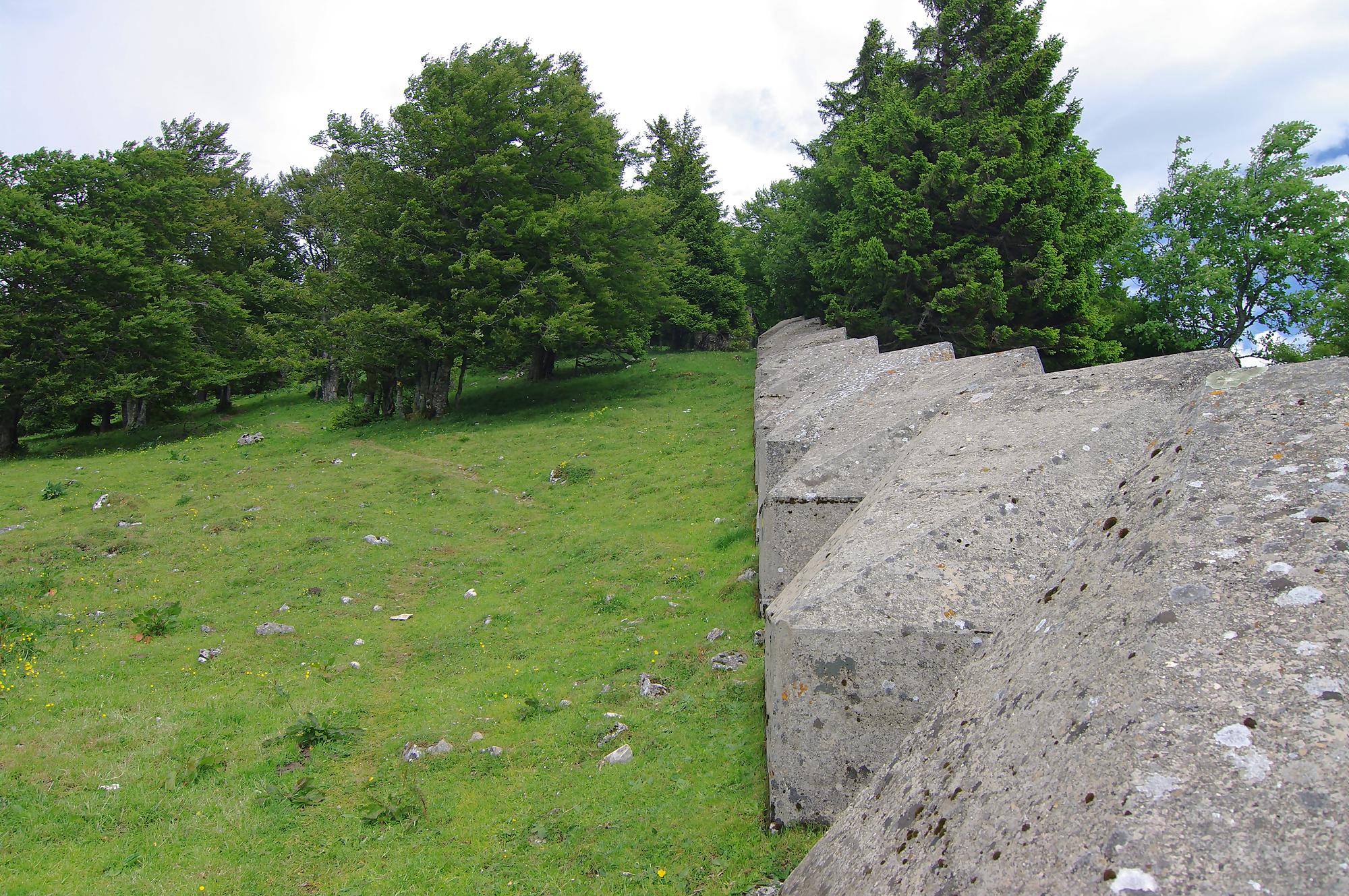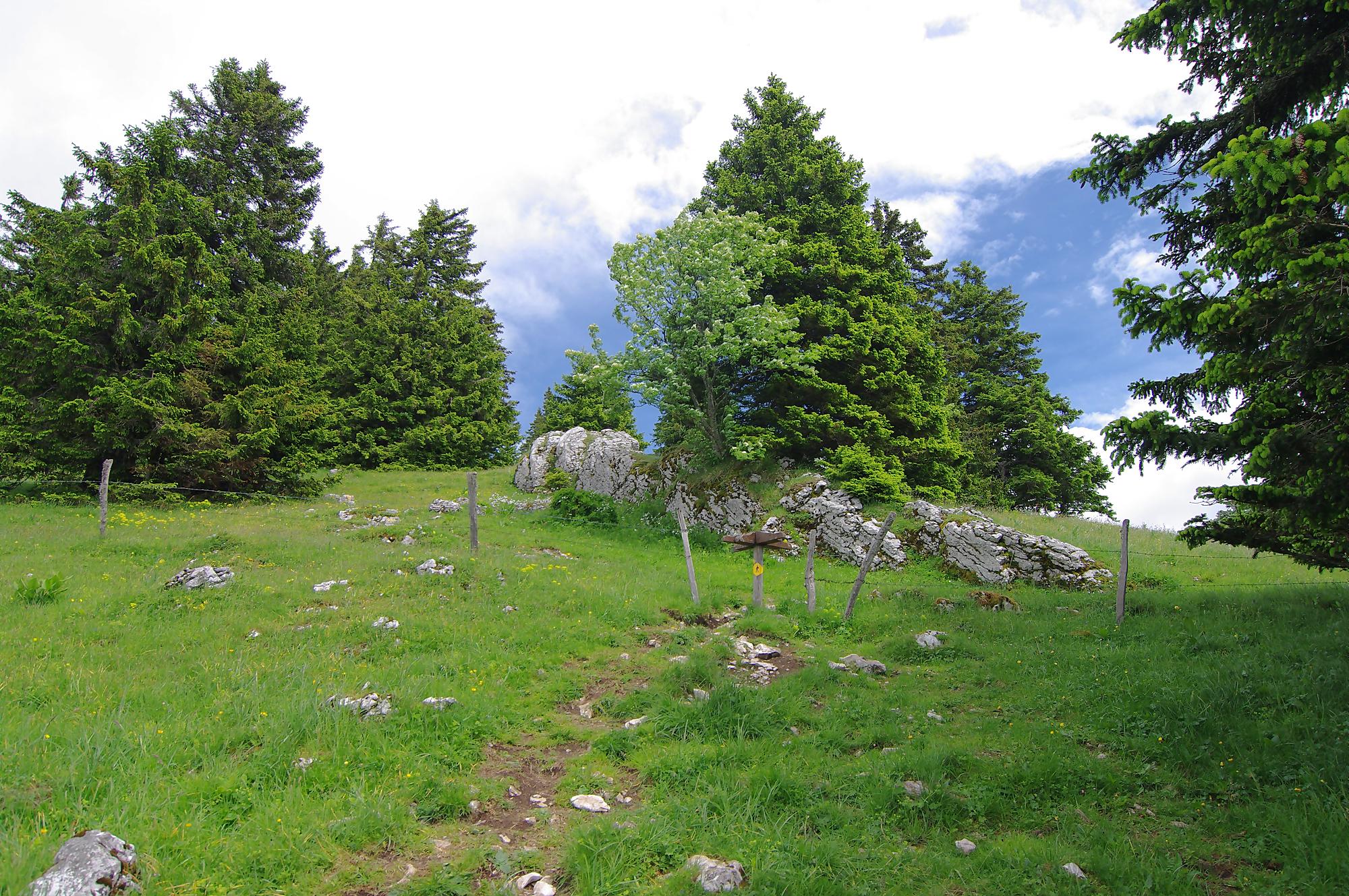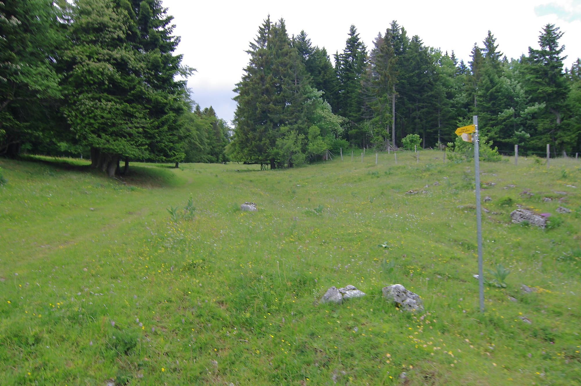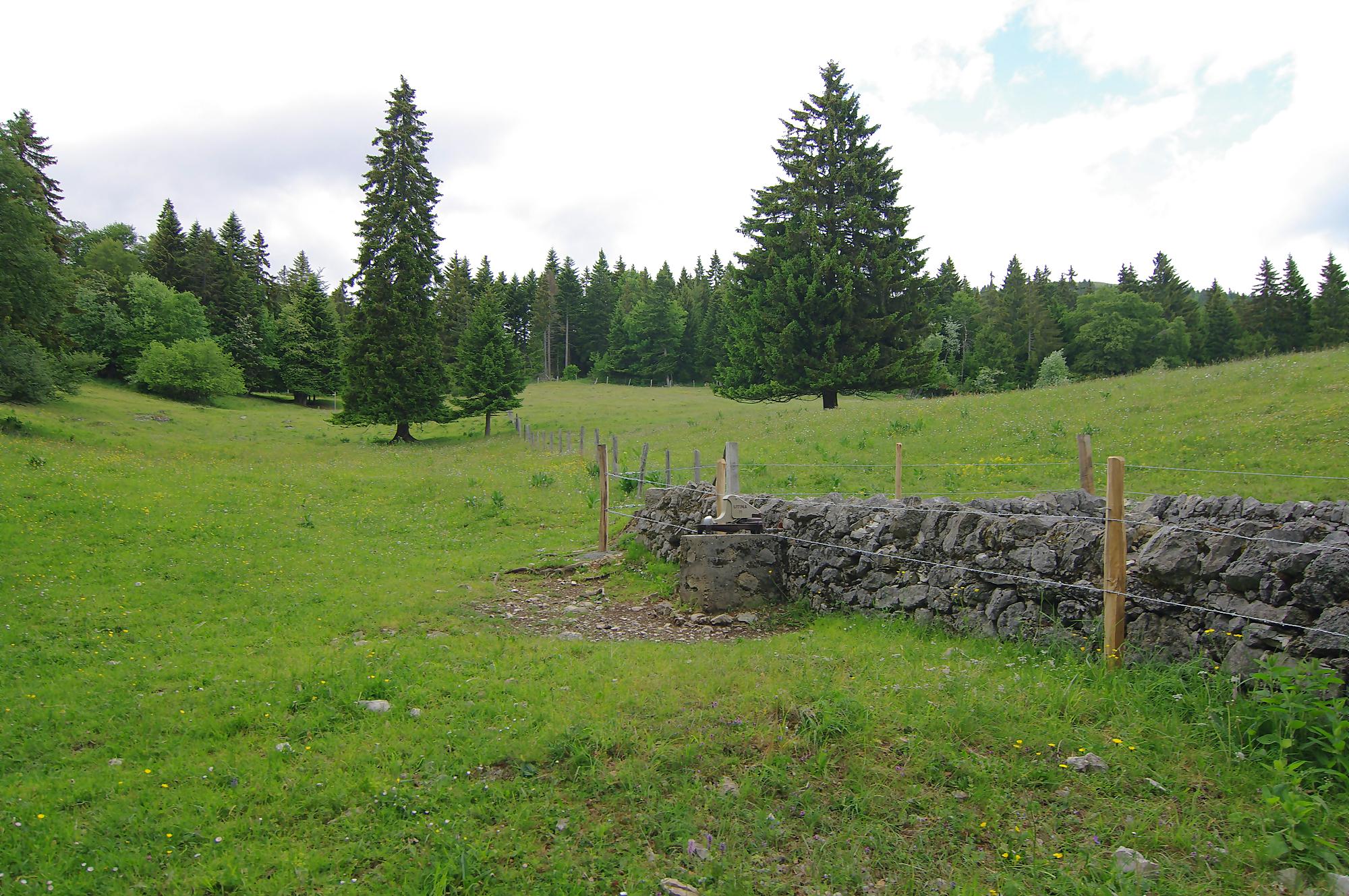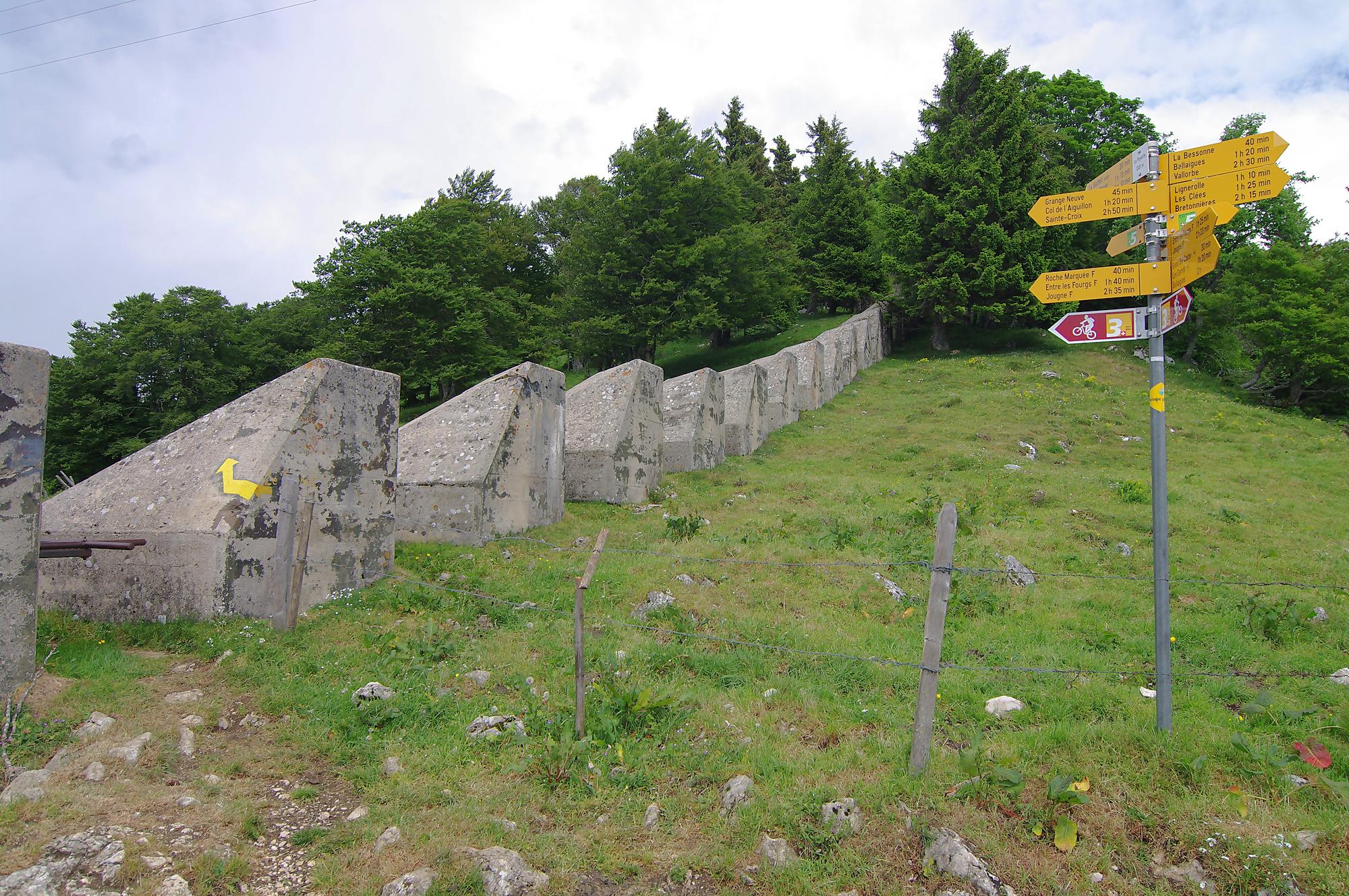 En sortant de la forêt, on passe devant la citerne du Pt1198 et on longe la clairière vers le haut. Le chemin se perd vers le haut et la pluie s’invite, je m’abrite donc sous les arbres le temps de laisser passer cette ondée. Cette dernière finie, je bifurque à gauche, longe la route et découvre que le chemin pédèstre continuait encore un peu dans le champ. J’arrive à la citerne du Pt1278 et suit le sentier qui monte vers La Poyette (1331m). Le sentier monte régulièrement, mais doucement, et traverse la forêt pour rejoindre la ferme de La Poyette (1331m). Ce lieu est chargé d’histoire car des toblerones en bêton, nous rappelent la défense imaginée pour la WW II (seconde guerre mondiale).