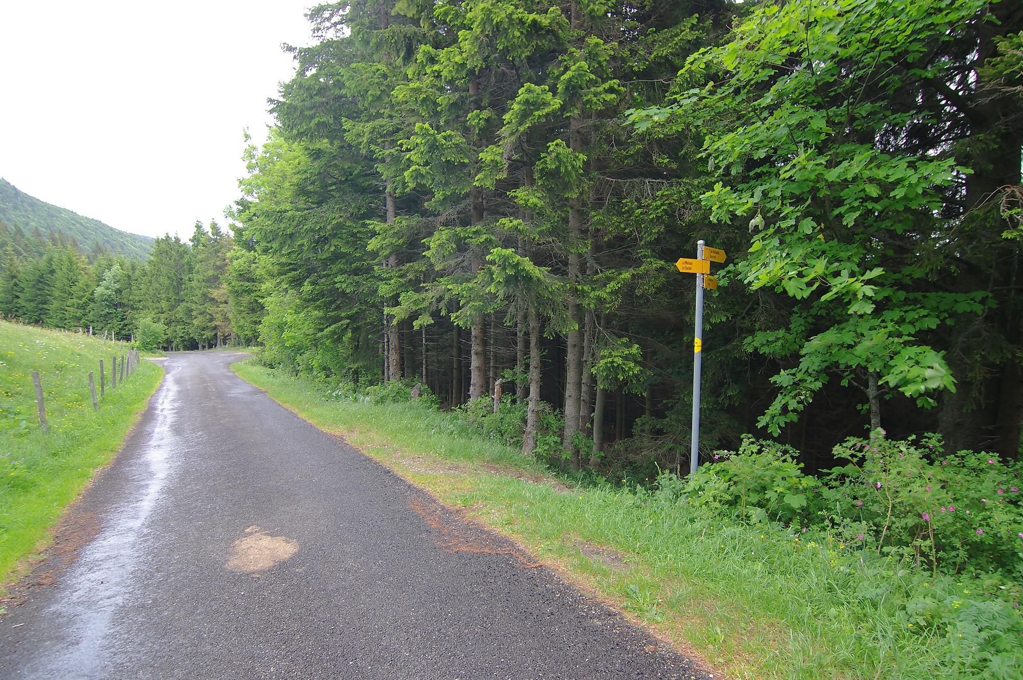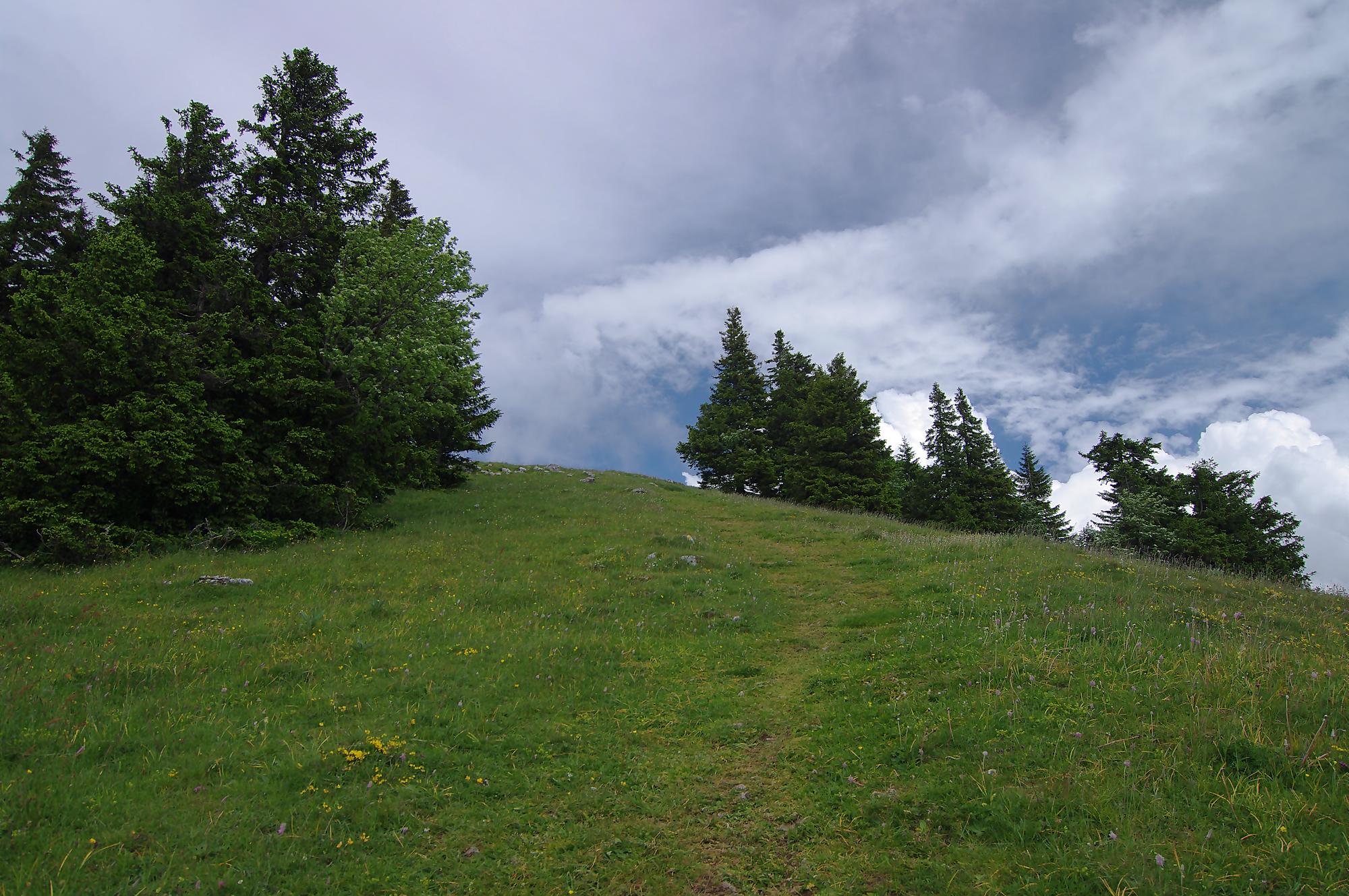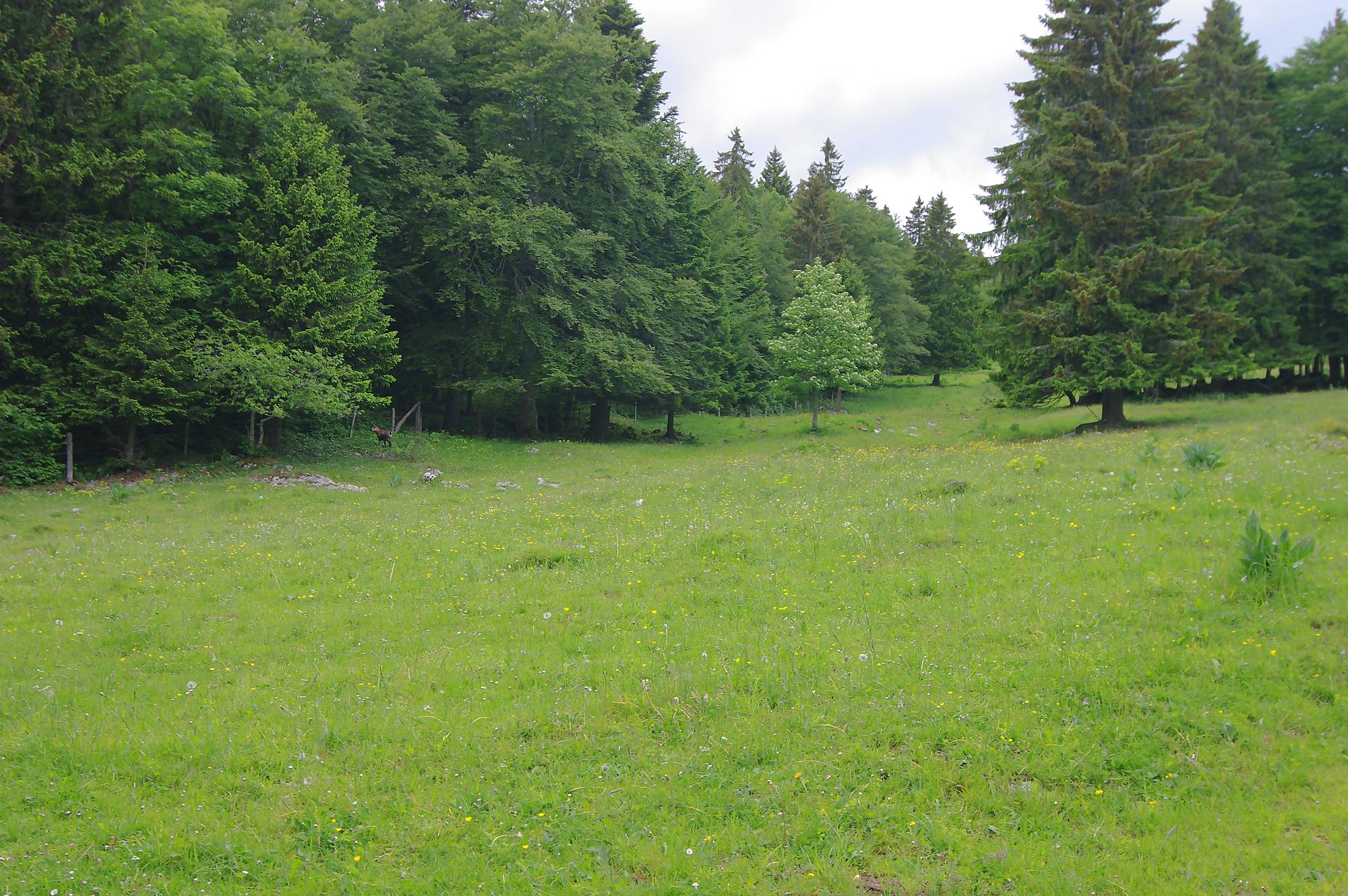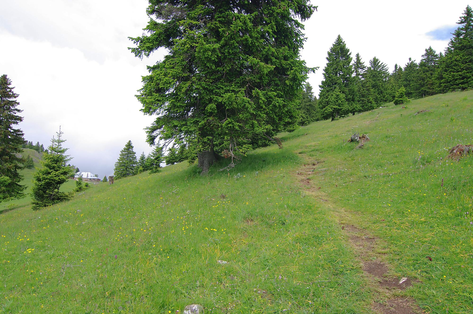 En sortant de la forêt, on passe devant la citerne du Pt1198 et on longe la clairière vers le haut. Le chemin se perd vers le haut et la pluie s’invite, je m’abrite donc sous les arbres le temps de laisser passer cette ondée. Cette dernière finie, je bifurque à gauche, longe la route et découvre que le chemin pédèstre continuait encore un peu dans le champ. J’arrive à la citerne du Pt1278 et suit le sentier qui monte vers La Poyette (1331m). Le sentier monte régulièrement, mais doucement, et traverse la forêt pour rejoindre la ferme de La Poyette (1331m). Ce lieu est chargé d’histoire car des toblerones en bêton, nous rappelent la défense imaginée pour la WW II (seconde guerre mondiale).