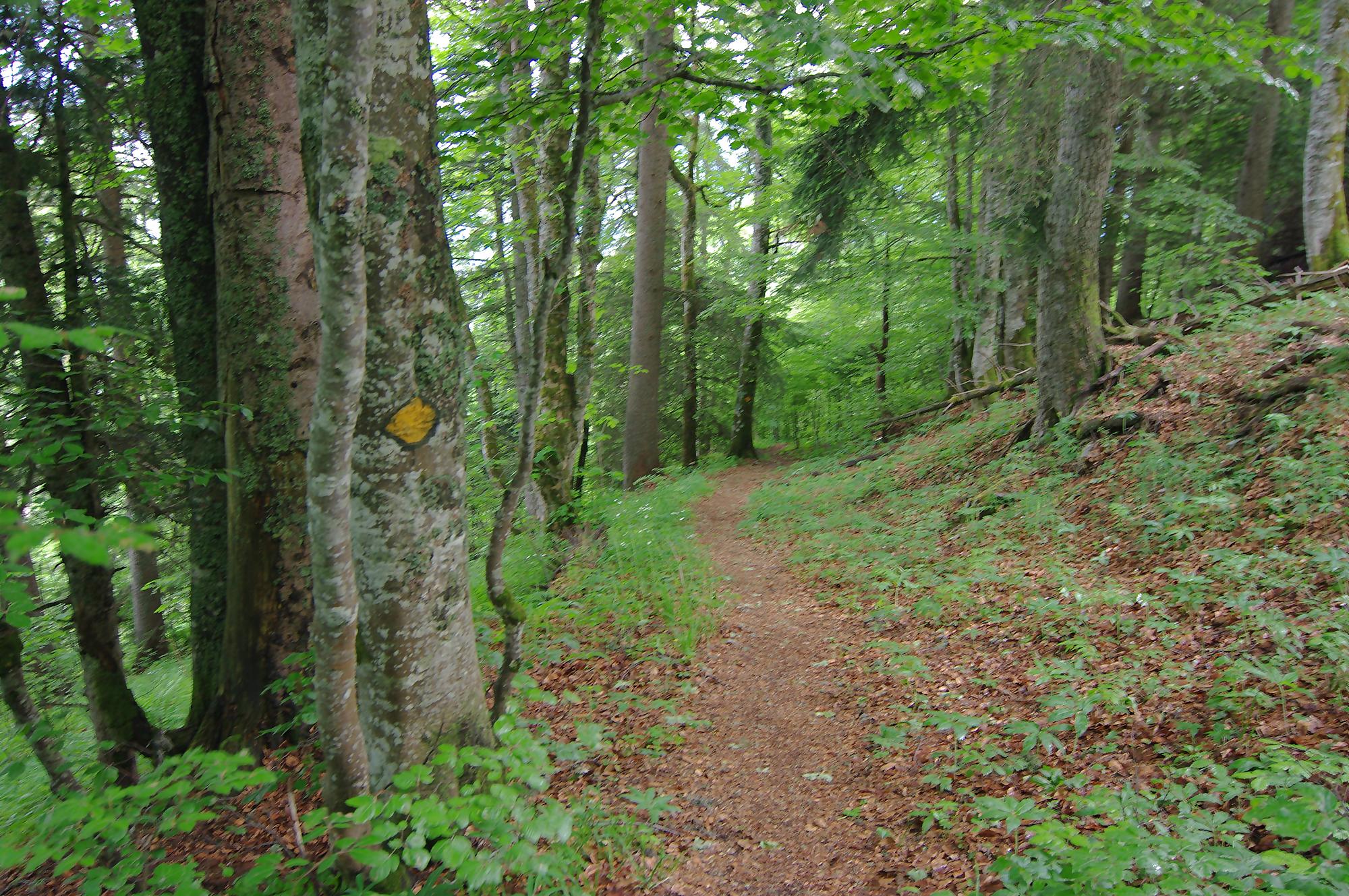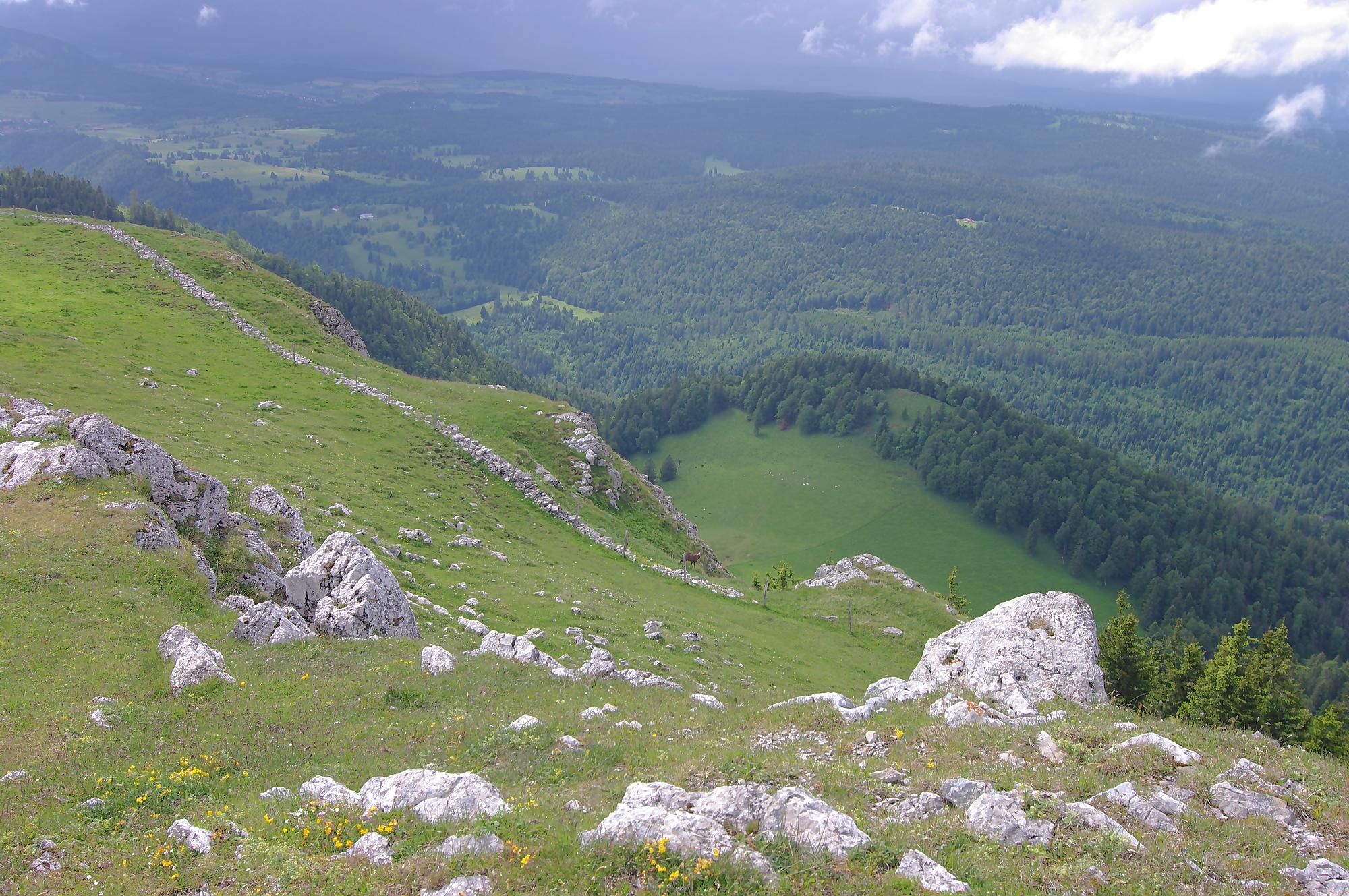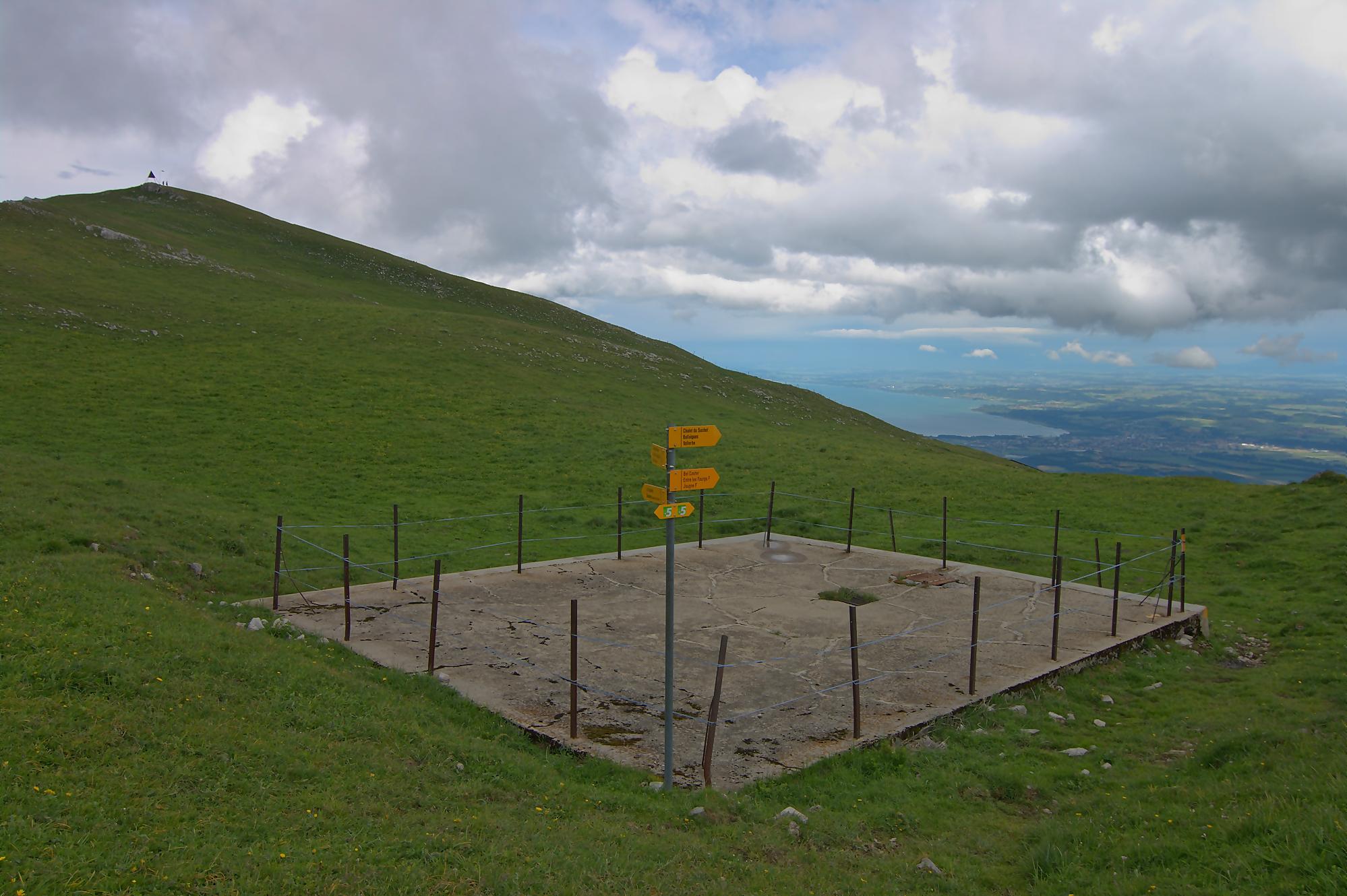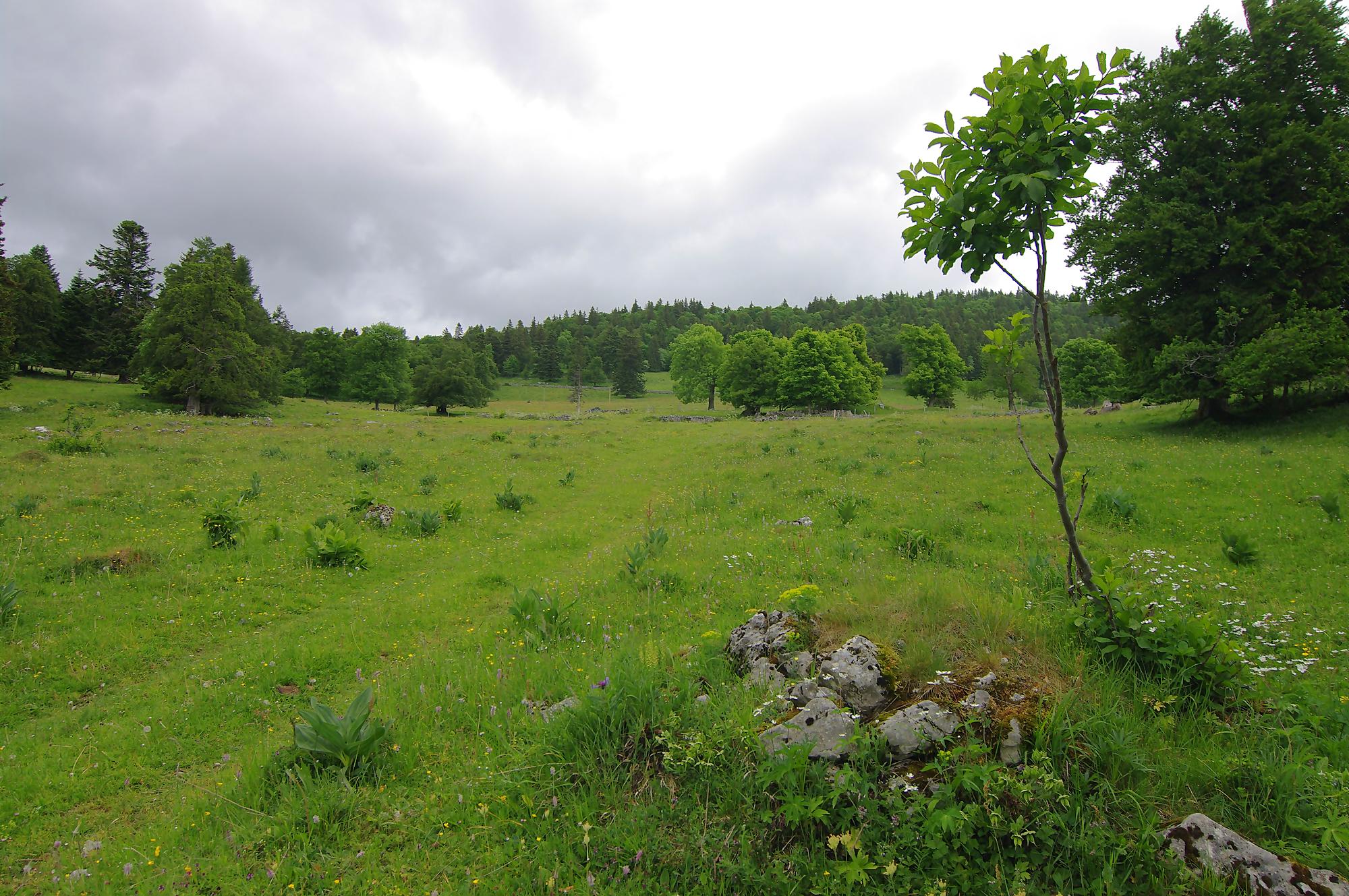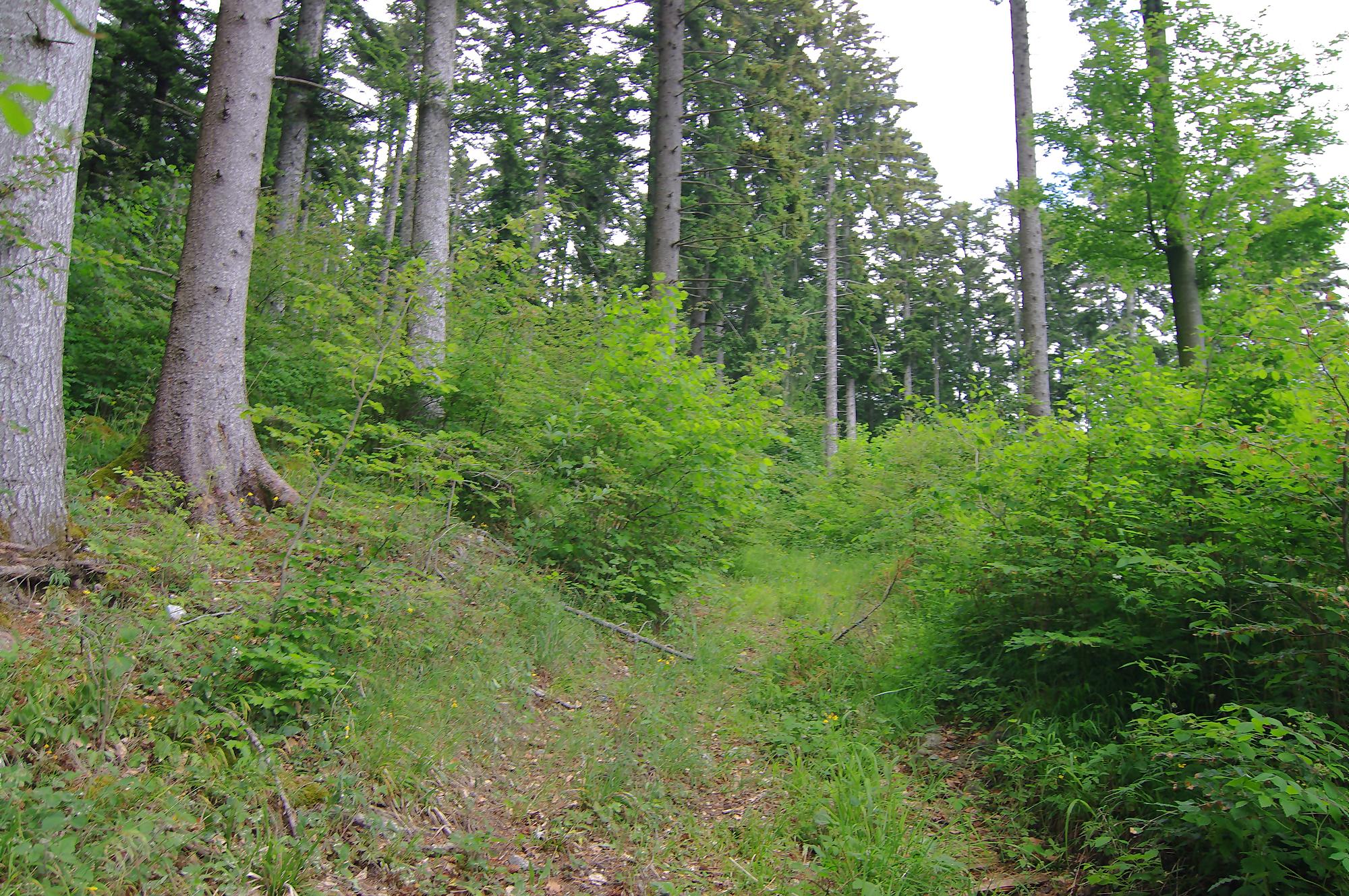 En sortant de la forêt, on passe devant la citerne du Pt1198 et on longe la clairière vers le haut. Le chemin se perd vers le haut et la pluie s’invite, je m’abrite donc sous les arbres le temps de laisser passer cette ondée. Cette dernière finie, je bifurque à gauche, longe la route et découvre que le chemin pédèstre continuait encore un peu dans le champ. J’arrive à la citerne du Pt1278 et suit le sentier qui monte vers La Poyette (1331m). Le sentier monte régulièrement, mais doucement, et traverse la forêt pour rejoindre la ferme de La Poyette (1331m). Ce lieu est chargé d’histoire car des toblerones en bêton, nous rappelent la défense imaginée pour la WW II (seconde guerre mondiale).