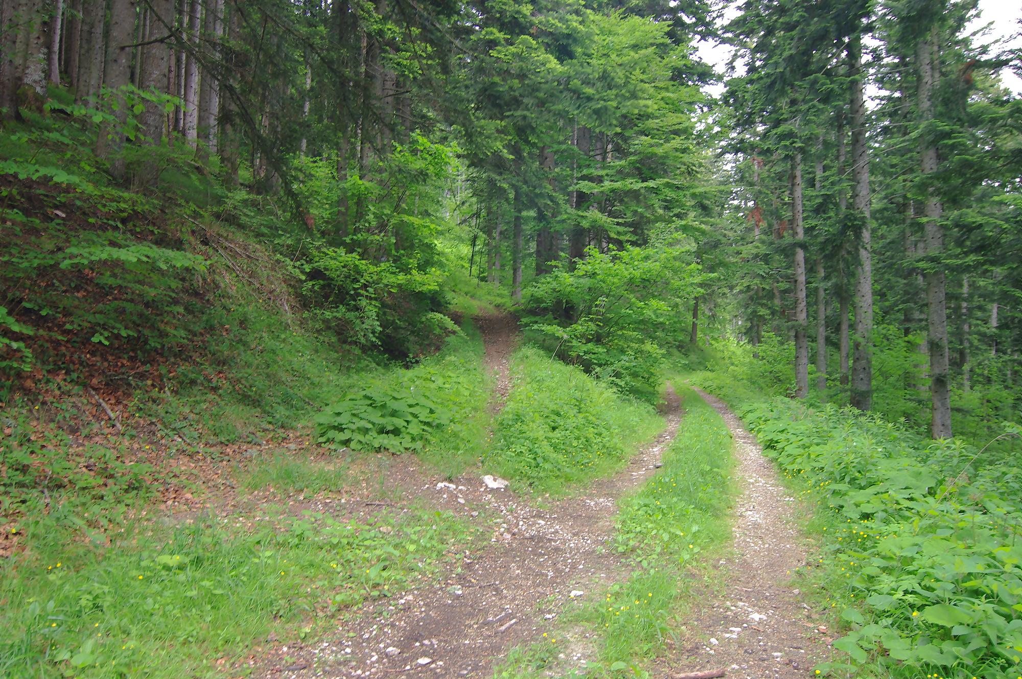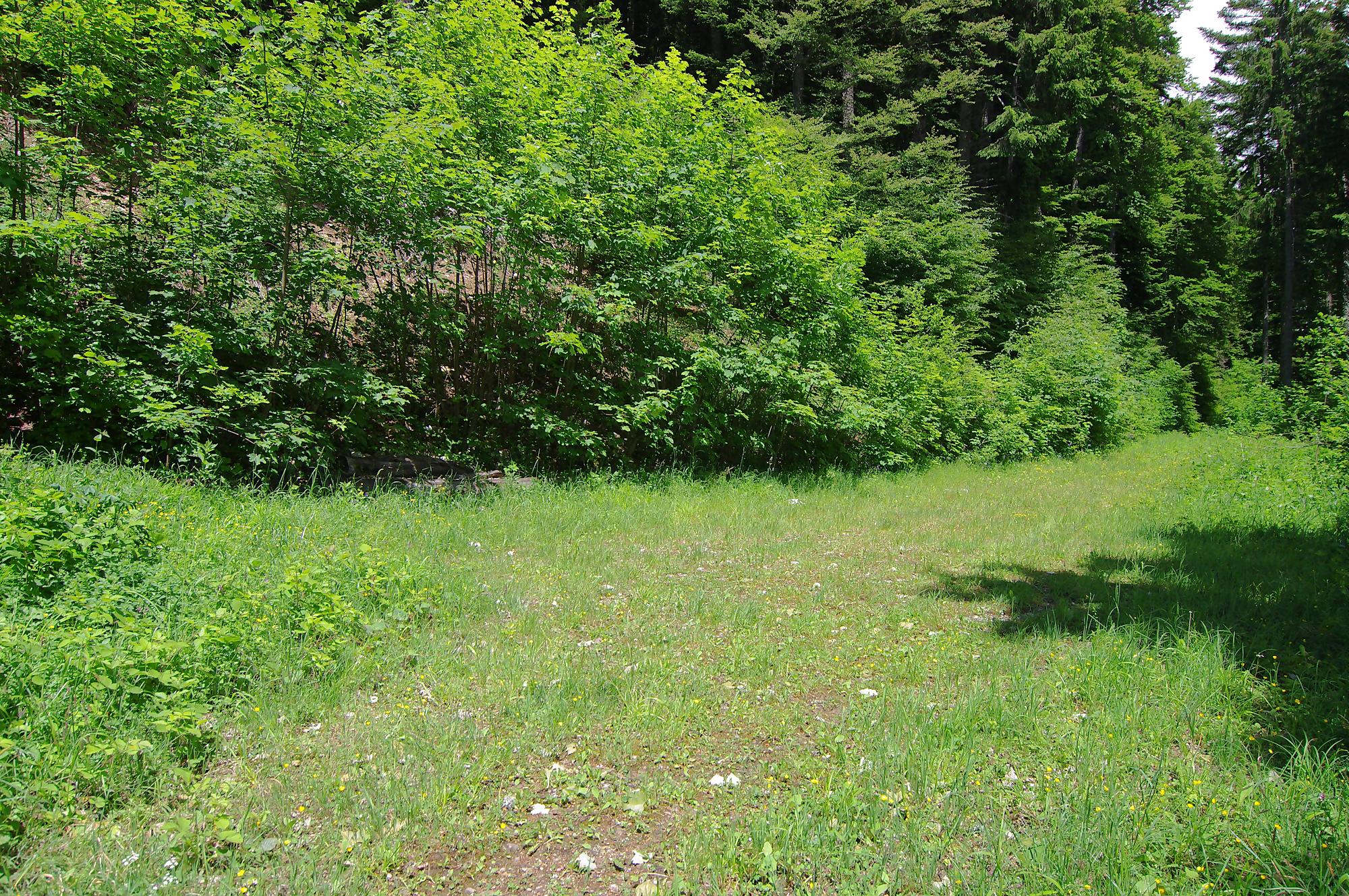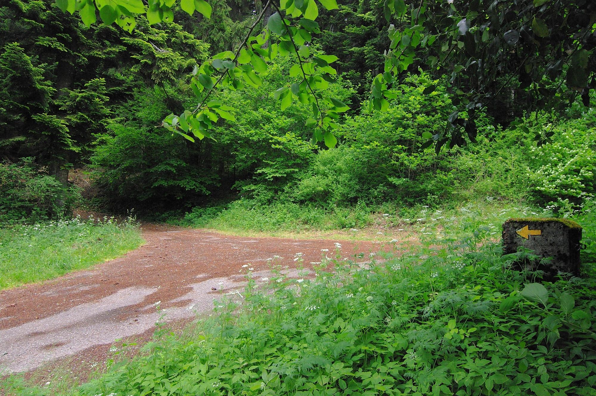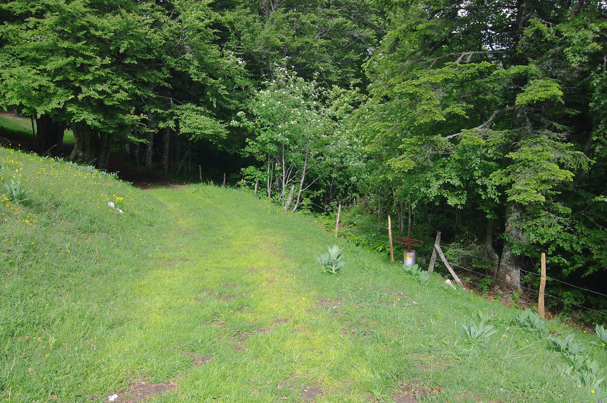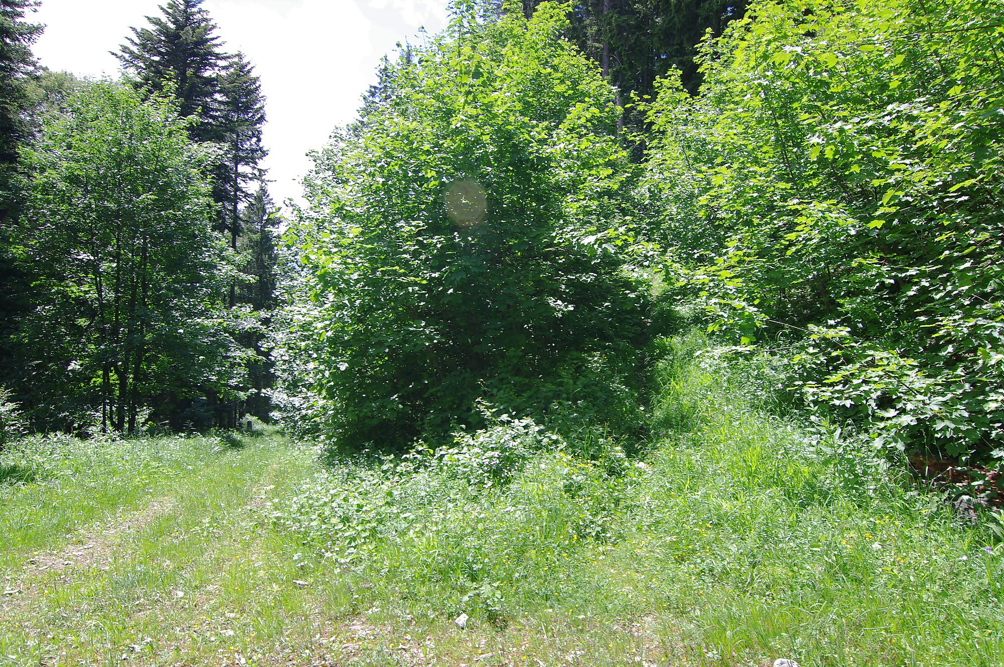 En sortant de la forêt, on passe devant la citerne du Pt1198 et on longe la clairière vers le haut. Le chemin se perd vers le haut et la pluie s’invite, je m’abrite donc sous les arbres le temps de laisser passer cette ondée. Cette dernière finie, je bifurque à gauche, longe la route et découvre que le chemin pédèstre continuait encore un peu dans le champ. J’arrive à la citerne du Pt1278 et suit le sentier qui monte vers La Poyette (1331m). Le sentier monte régulièrement, mais doucement, et traverse la forêt pour rejoindre la ferme de La Poyette (1331m). Ce lieu est chargé d’histoire car des toblerones en bêton, nous rappelent la défense imaginée pour la WW II (seconde guerre mondiale).