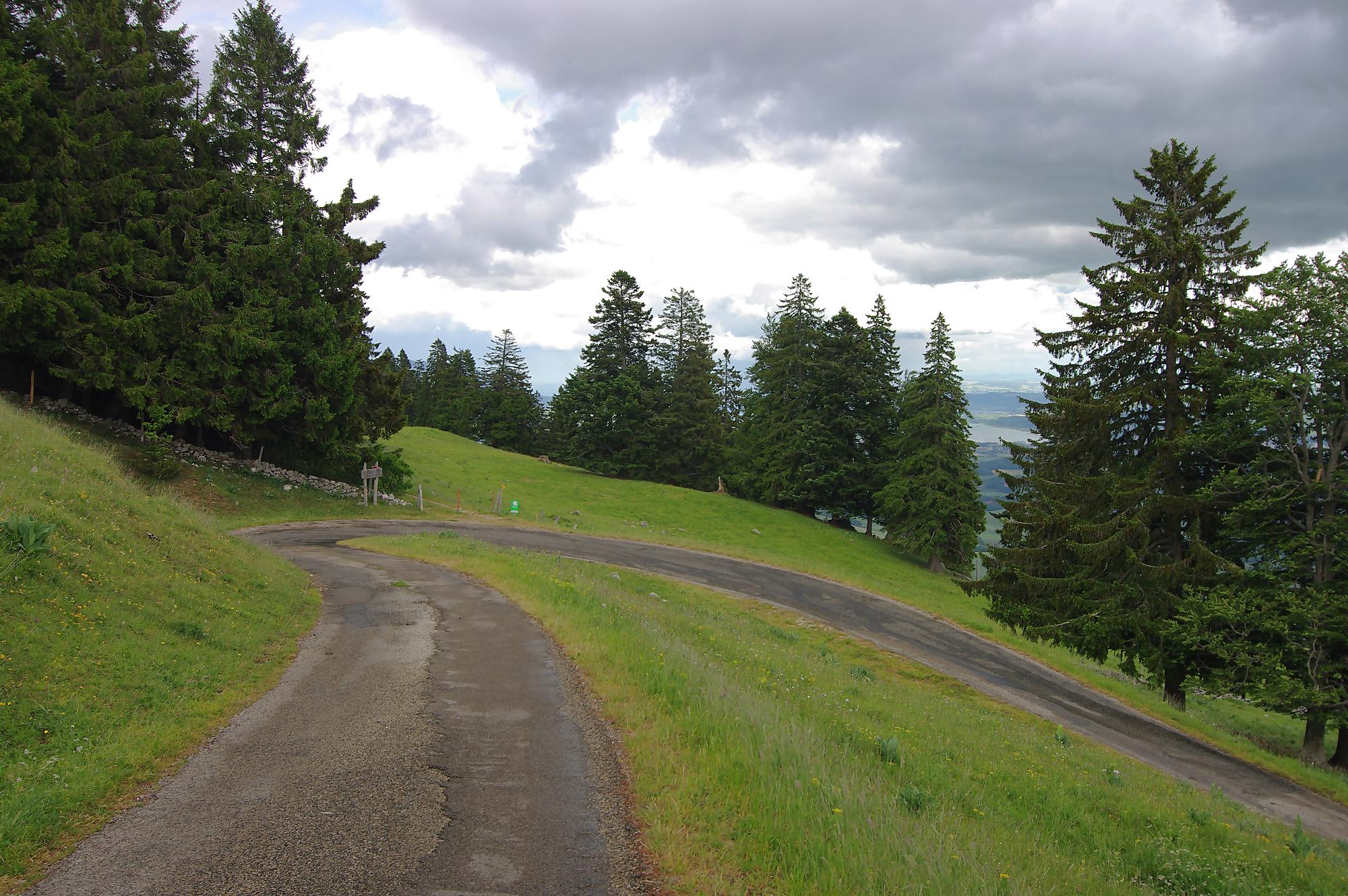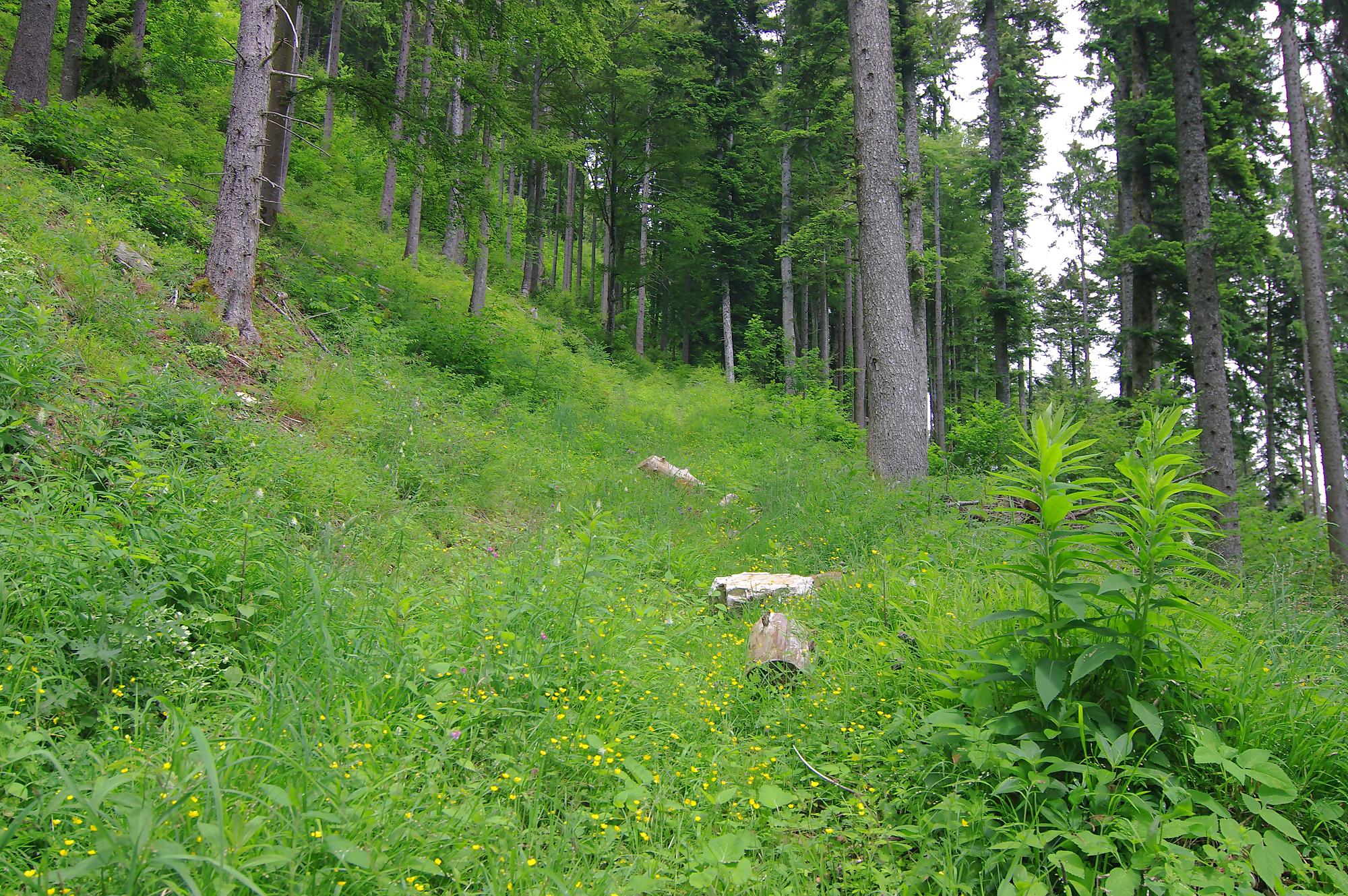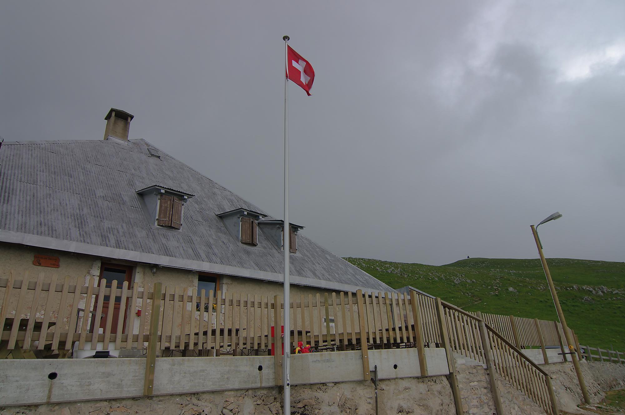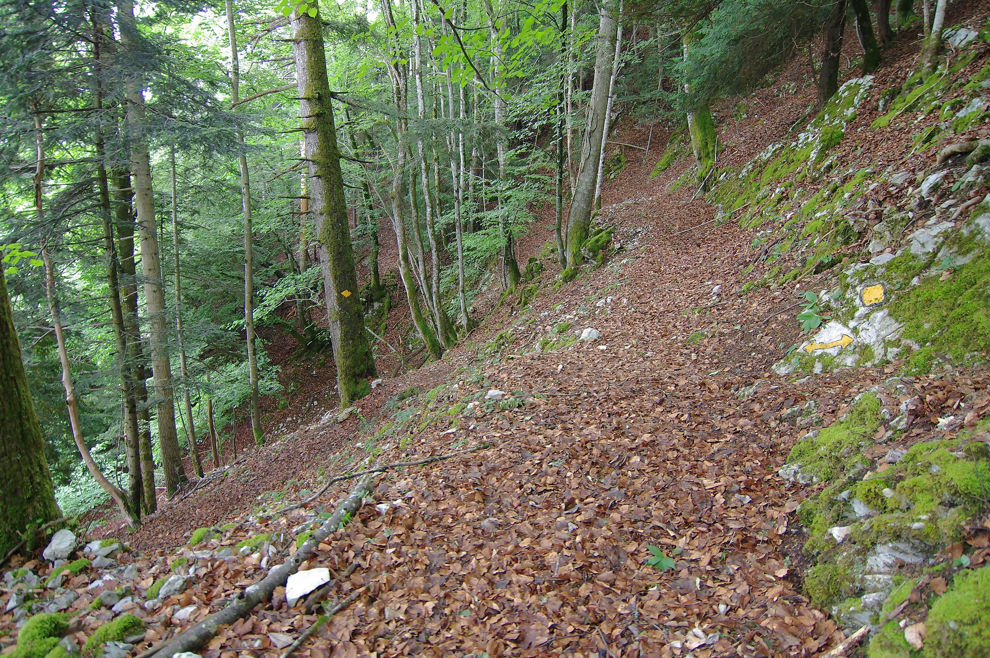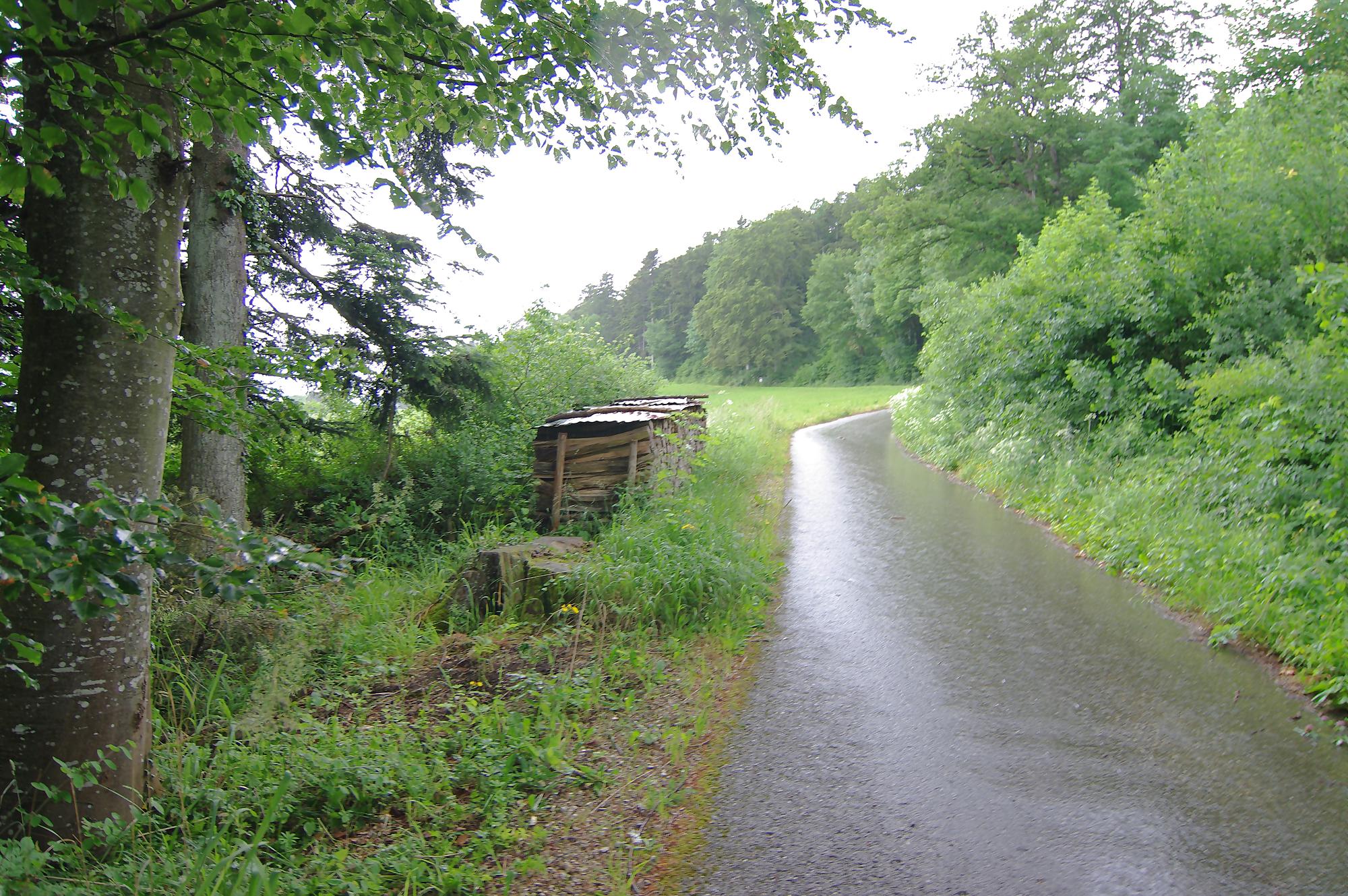 En sortant de la forêt, on passe devant la citerne du Pt1198 et on longe la clairière vers le haut. Le chemin se perd vers le haut et la pluie s’invite, je m’abrite donc sous les arbres le temps de laisser passer cette ondée. Cette dernière finie, je bifurque à gauche, longe la route et découvre que le chemin pédèstre continuait encore un peu dans le champ. J’arrive à la citerne du Pt1278 et suit le sentier qui monte vers La Poyette (1331m). Le sentier monte régulièrement, mais doucement, et traverse la forêt pour rejoindre la ferme de La Poyette (1331m). Ce lieu est chargé d’histoire car des toblerones en bêton, nous rappelent la défense imaginée pour la WW II (seconde guerre mondiale).