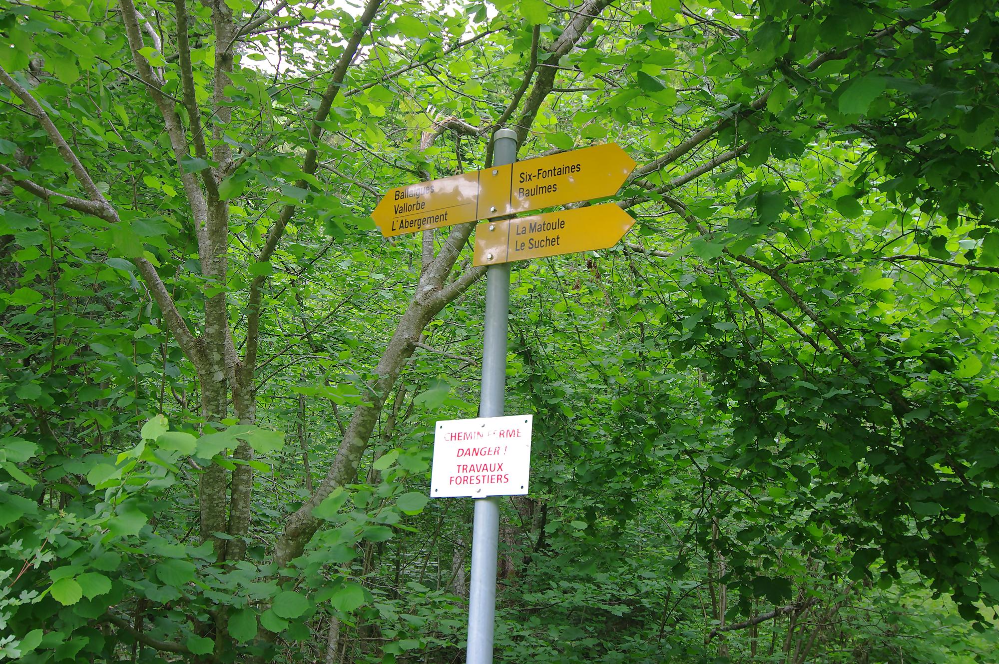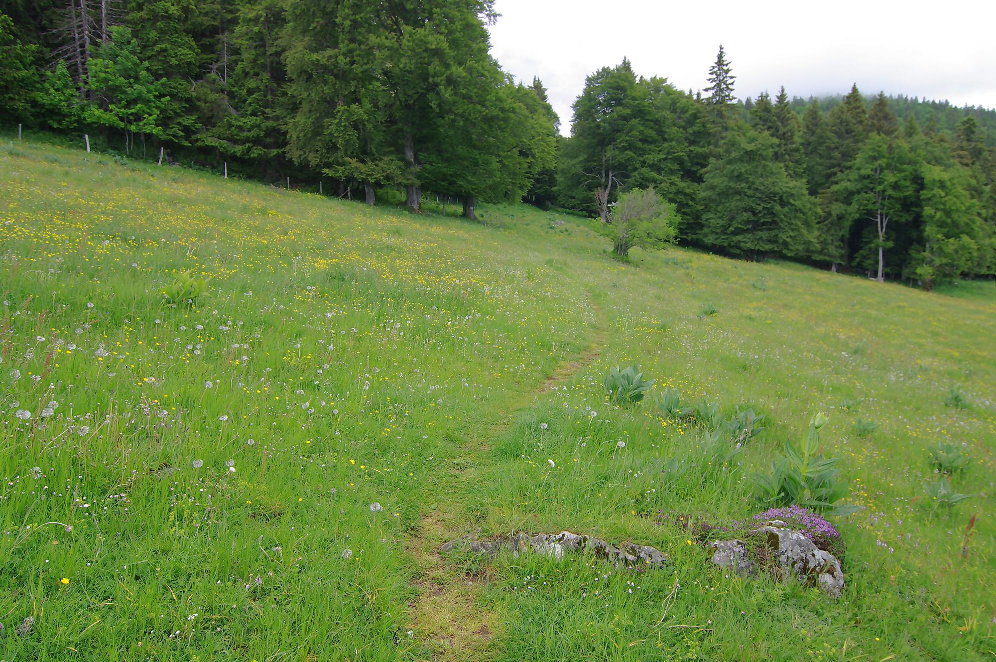 Après un passage sur la route, on coupe dans un champ direction La Matoule. Cette traversée de champ est très jolie, tant au niveau des fleurs que des rochers qui sont des bloc erratiques (voir cette randonnée au même endroit pour plus de détails), juste dommage que les fils électriques soient trop visibles. On arrive à La Matoule (1144m) (ou Matoulaz) qui est un restaurant dont la table semble réputée. Après ce restaurant, je traverse le champ, la sente se perd, mais il y a un marquage sur les pierres de temps en temps. Il faut donc ouvrir l’oeil. On rejoint la route et je m’enfonce dans la forêt de Bois de Ban.