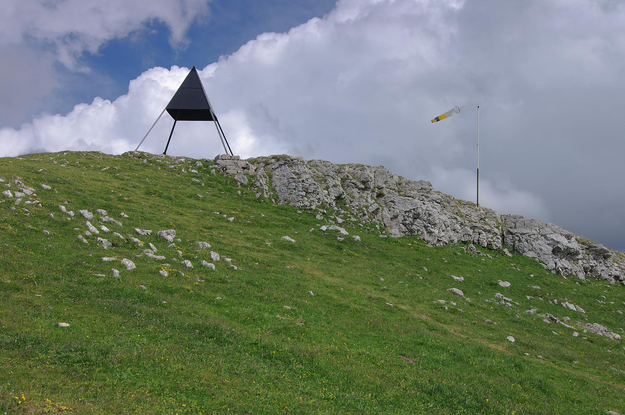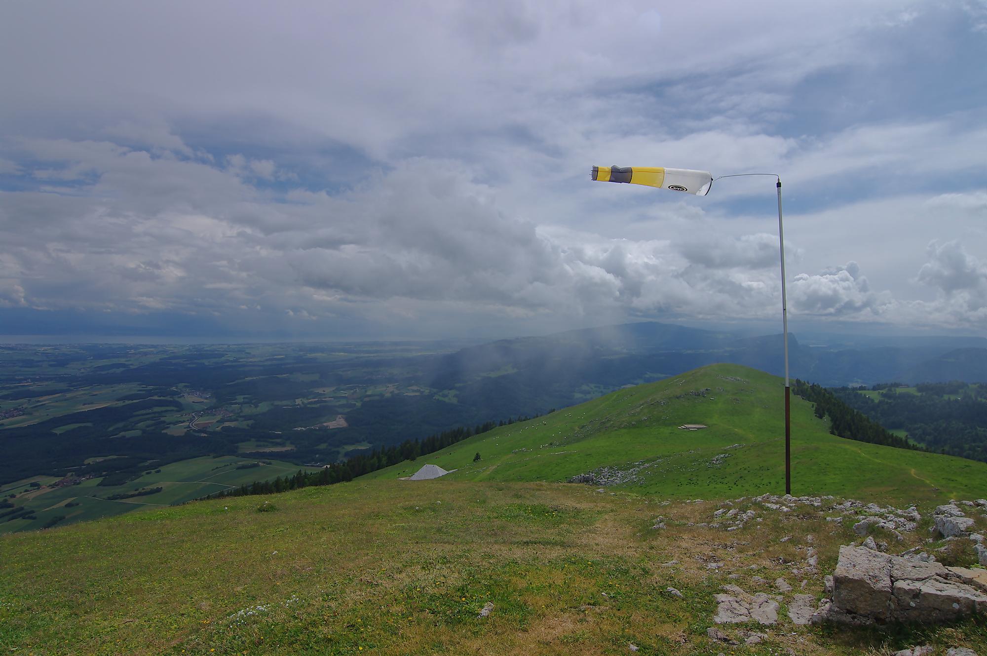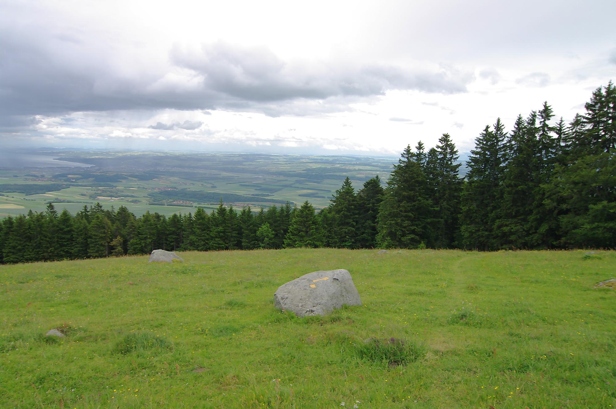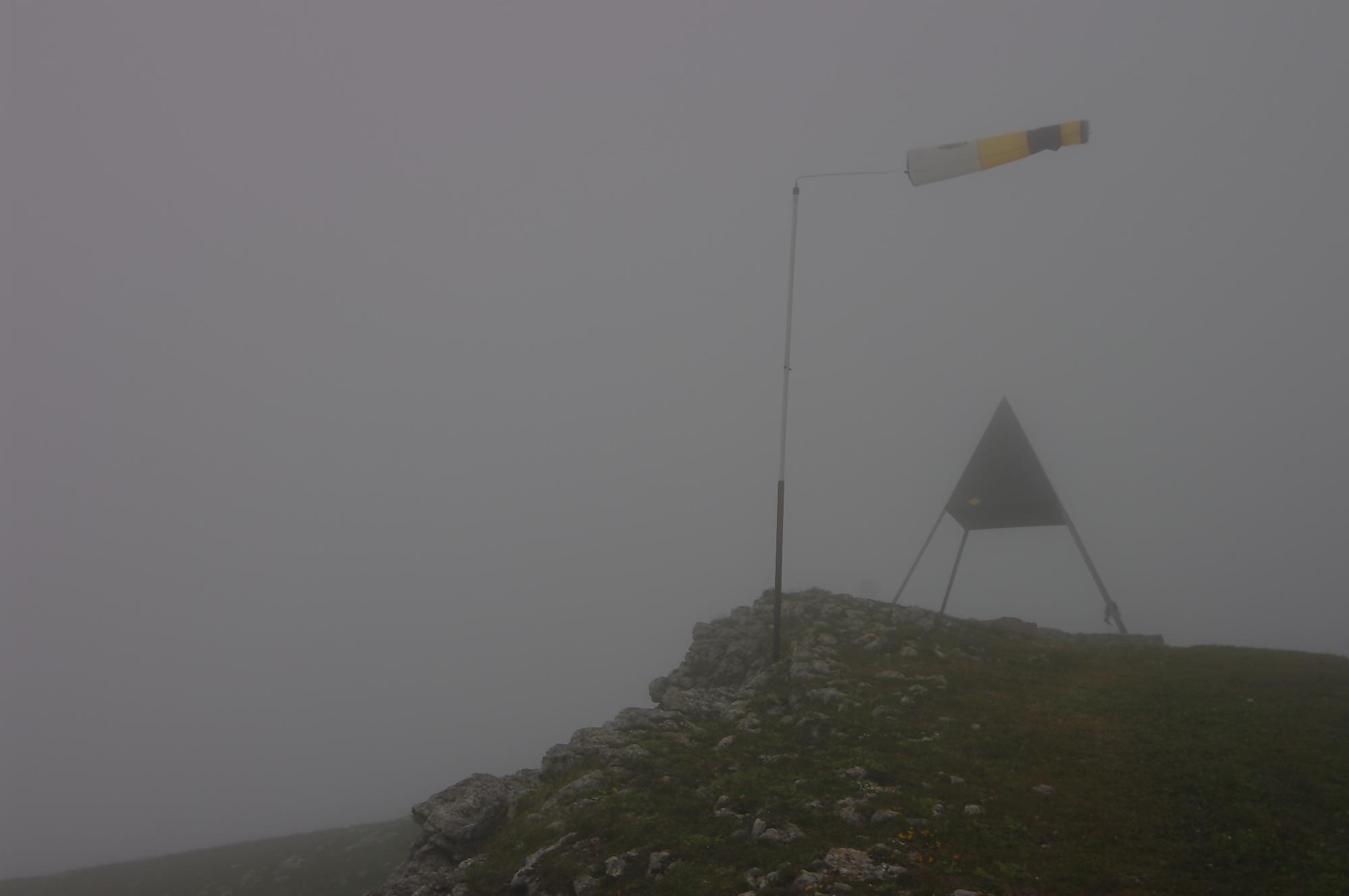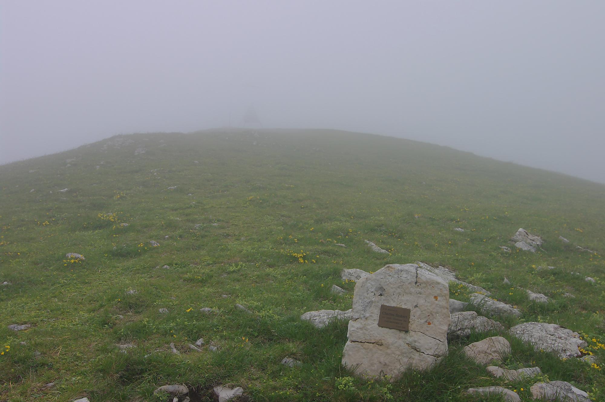 On traverse ces toblerones pour partir en direction du Suchet par un chemin qui monte un peu plus fort. J’ai bien apprécié ce passage, le chemin est esthétique. On change de versant et la vue se dégage sur le lac de Neuchâtel. La buvette du Suchet est devant nous, on y passe à côté. Mais la brume me rejoint, le soleil faisant évaporer l’humidité tombée précédement. J’arrive au sommet du Suchet, 1588m, marqué par la pyramide (point de géodésie). Je reste planté devant cette pyramide plus d’une heure, en attendant une éclaircie, cela permet une pause casse-croute !