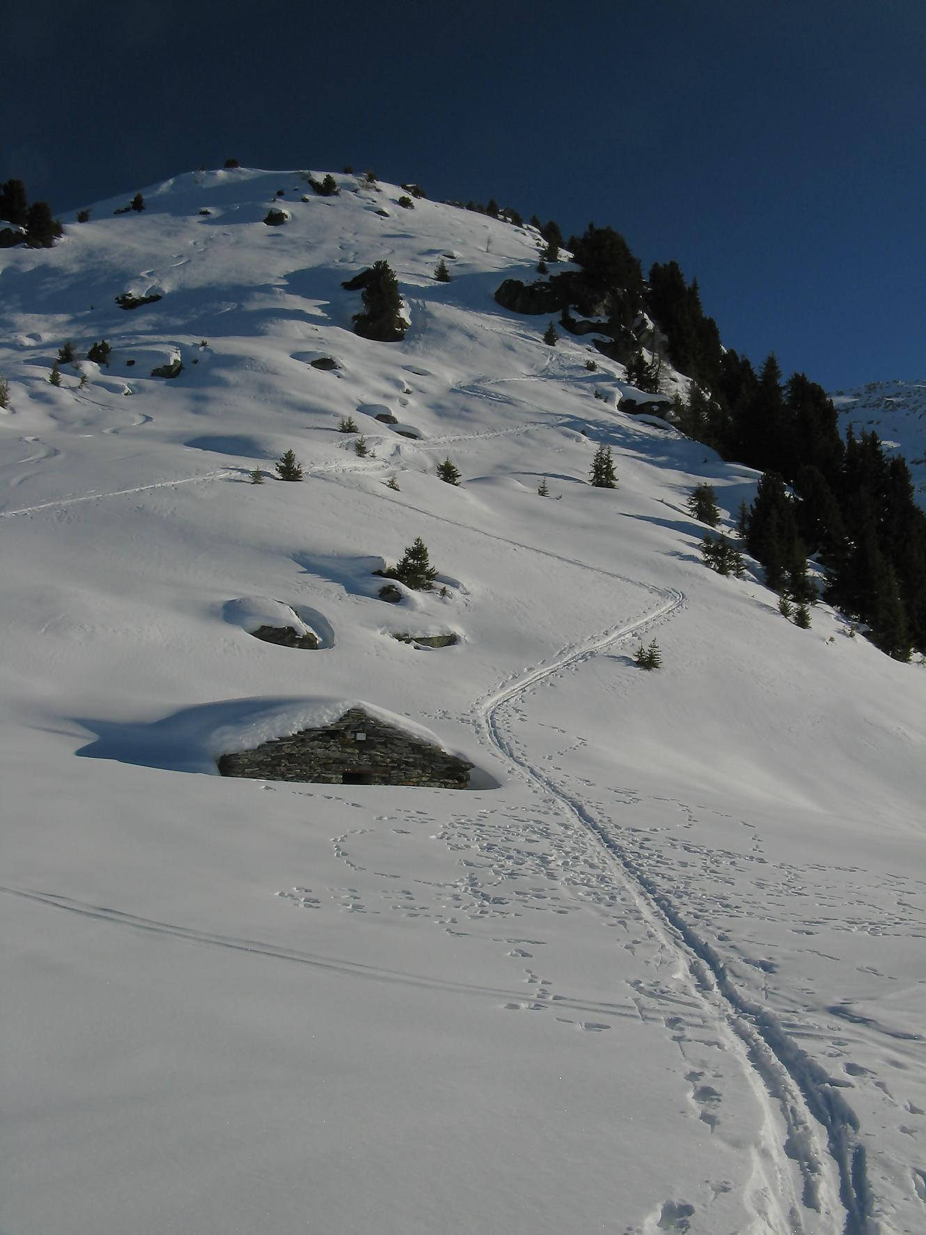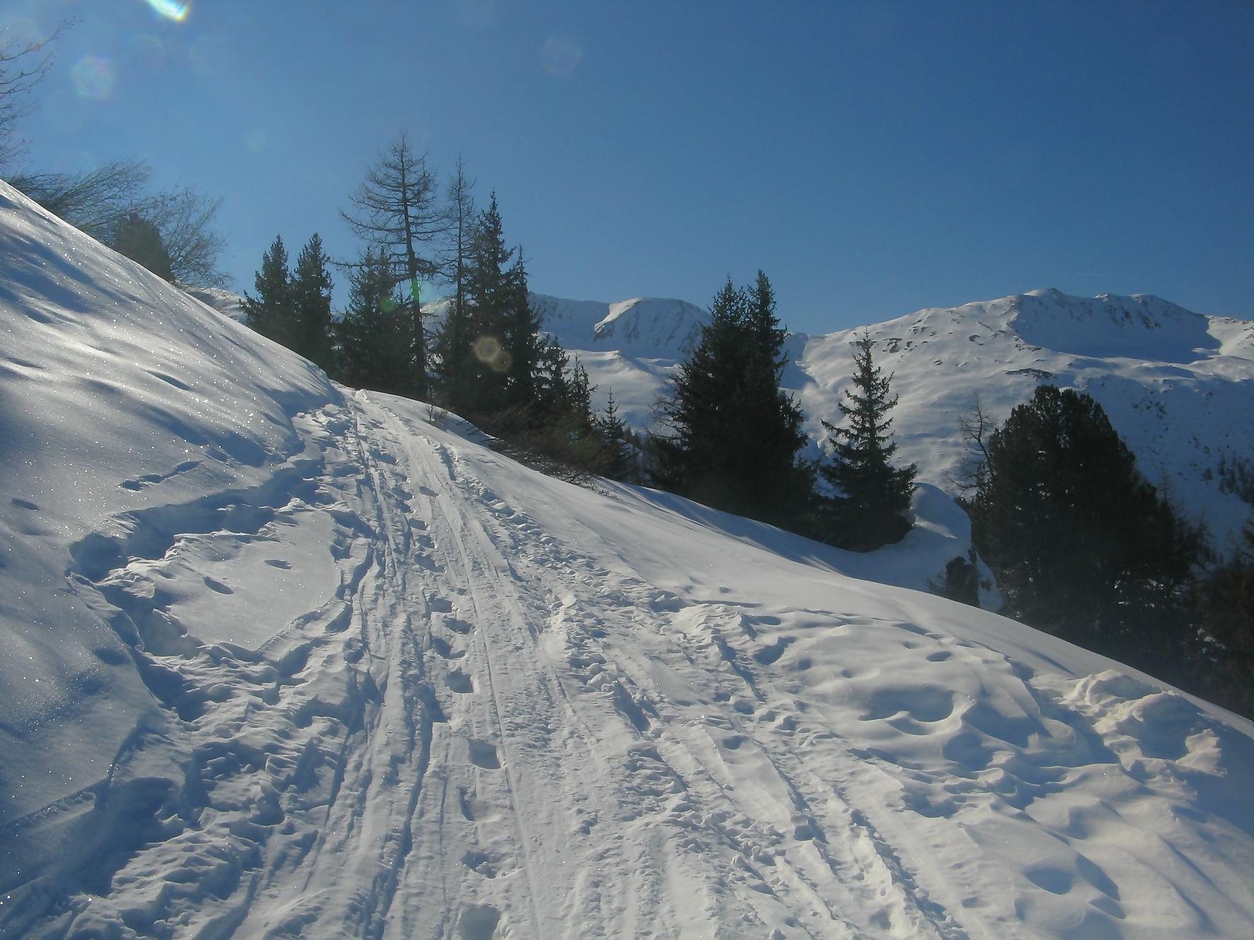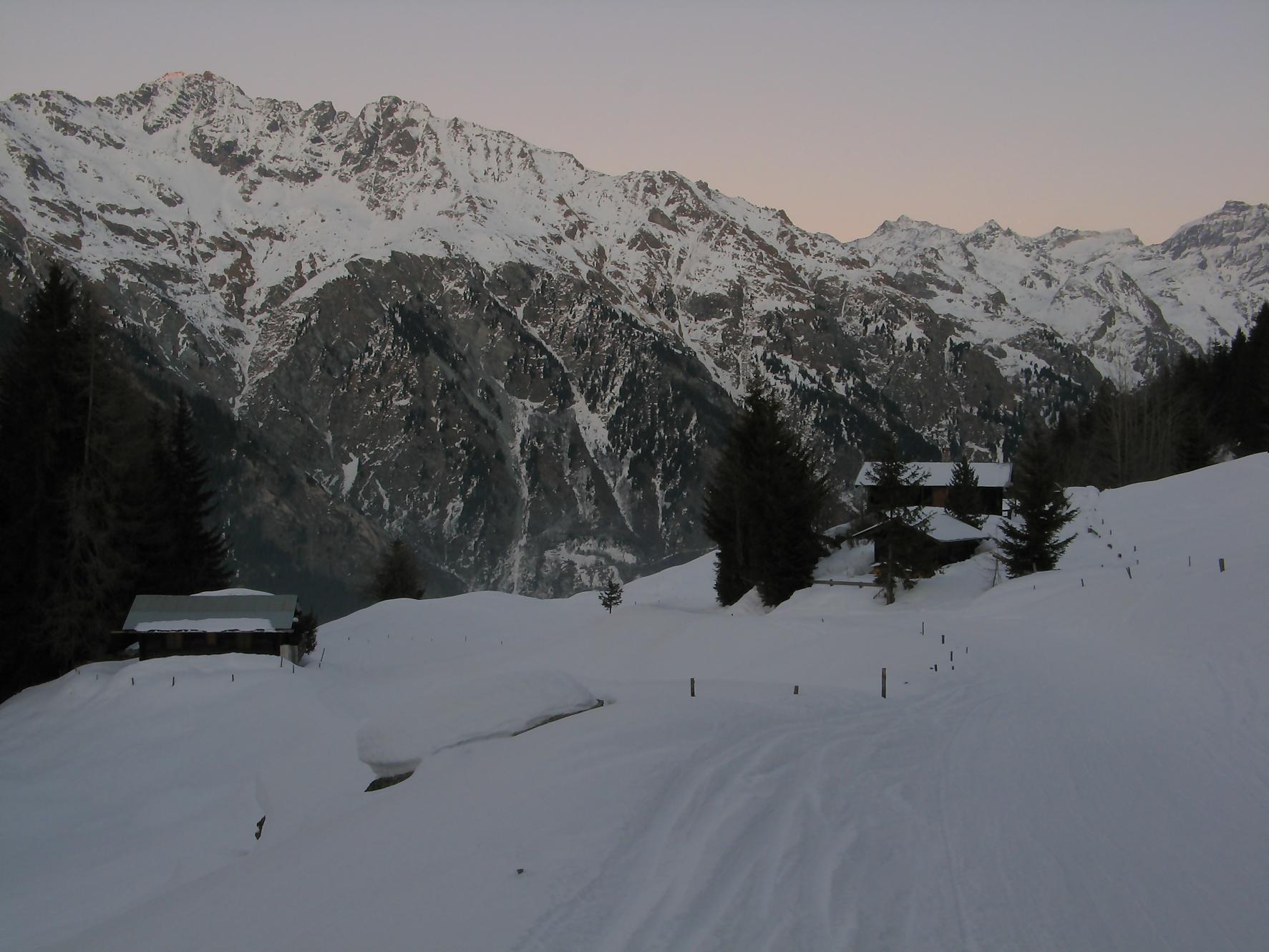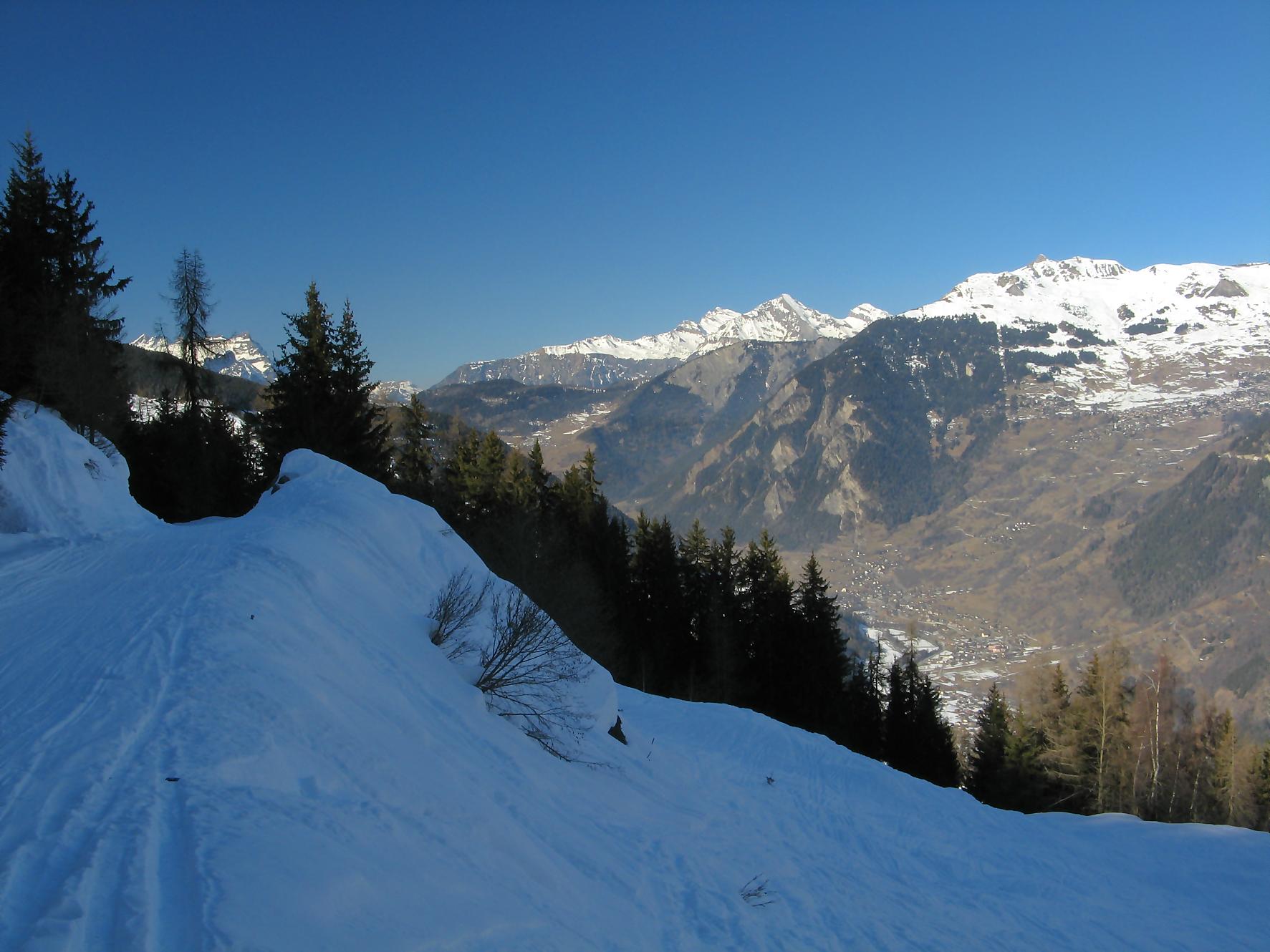 Pour cette sortie, je me fixe un objectif ambiteux de monter au Mont Rogneux depuis Champsec, soit 2000 m de dénivelé. Je n’ai encore jamais atteint ce niveau en ski, on verra bien si j’y arrive. Je prends donc le train puis change à Martigny pour le Saint-Bernard-Express et à Verbier je prends le bus. Pendant l’attente du bus, je discute avec deux personnes aussi en ski de randonnée qui vont monter à la cabane Brunet et me conseillent de partir depuis Lourtier. Je pars donc de Lourtier (1074 m), en descendant à pied la route de Plan-Rosay. Je chausse depuis Plan-Rosay et parts en travers pour La Tinte : passage en forêt, avec une pente, de quelques mètres, délicate, un passage déneigé pour arriver aux chalets de La Tinte. On part ensuite dans la clairière sur la droite, par le chemin d’été vers le Pt1300. Puis la pente s’adoucit pour rejoindre le chalet du Pt1401 et ensuite c’est par une petite route qu’on rejoint Plénadzeu, Pt1456. J’ai fait ce parcours avec deux personnes dont un homme qui n’avait plus de bras ! Chapeau, il devait juste être accompagné pour les diverses manipulations. Ces personnes continuent vers la cabane Brunet. De mon côté, je pensais prendre le chemin normal par la route mais je vois un couloir avec des traces de descente et décide donc de le remonter (couloir passant par Le Partset puis Folorsi). Le bas du couloir n’est pas évident car étroit et pentu ce qui m’a valu de faire quelques mètres à pied. Je retrouve la route au niveau de Folorsi, toujours pentu mais il y a la place pour les conversions. J’arrive à La Treutse gardé par une barre rocheuse que je contourne par la droite, à flanc de coteau à la fin. J’arrive sous le Pt2093 à l’E. Je retrouve le soleil et je comprends ici que mon horaire est trop tardif pour tenter le Mont Rogneux. Je choisis donc de faire la crête du Goli des Seyons car j’y vois des traces. Je monte sur la gauche pour arriver à un abri en pierres (Pt2092). Le chemin redevient pentu puis s’adoucit et on change de versant avant le Pt2229. Le chemin est très esthétique, une crête avec des rochers apparents, magnifique. Puis j’arrive au sommet local, Pt2368. Je profite d’une magnifique vue sur les Dents du Midi, Verbier, et les montagnes de l’autre côté du val de Bagnes. Par contre le Mont Rogneux n’est pas visible.