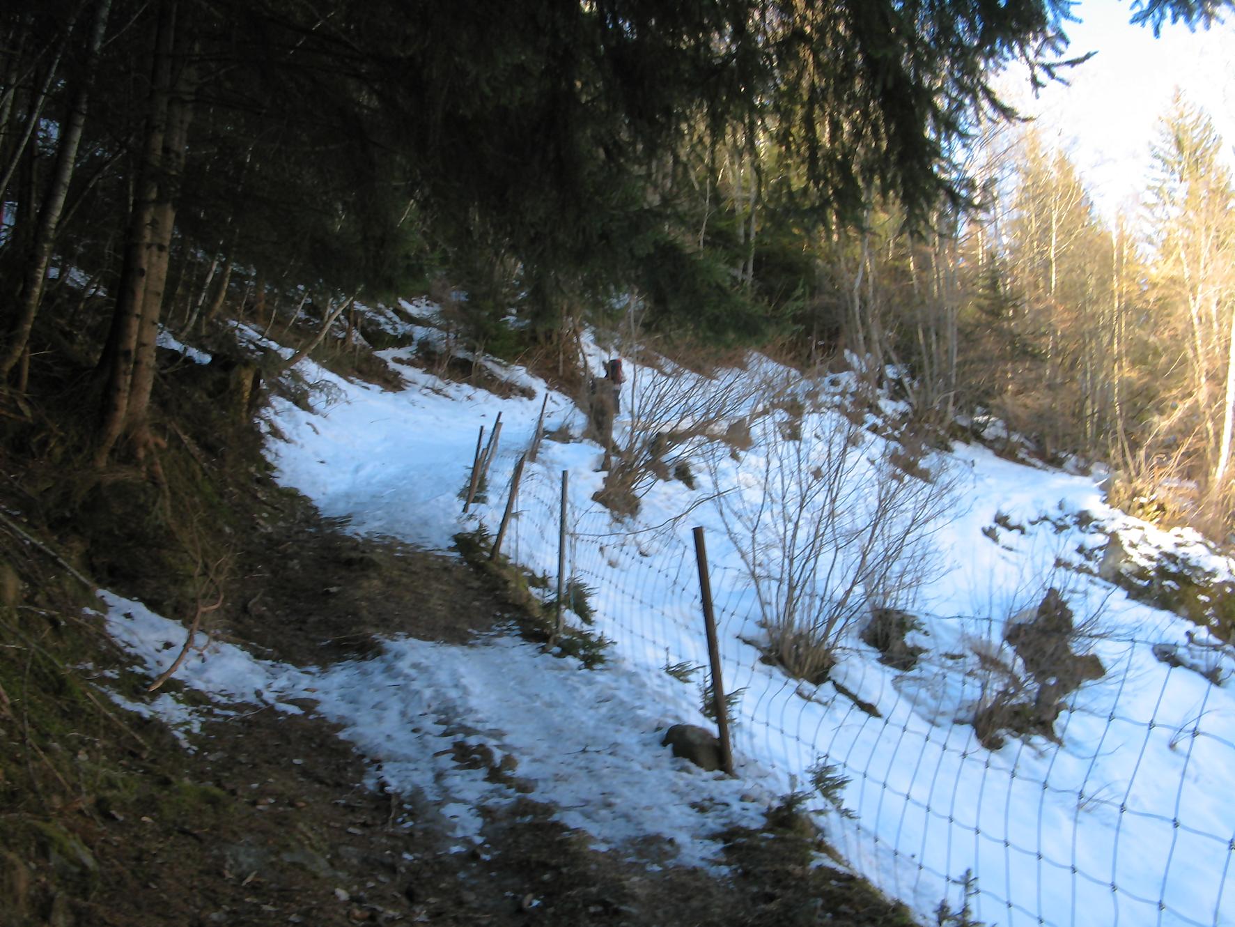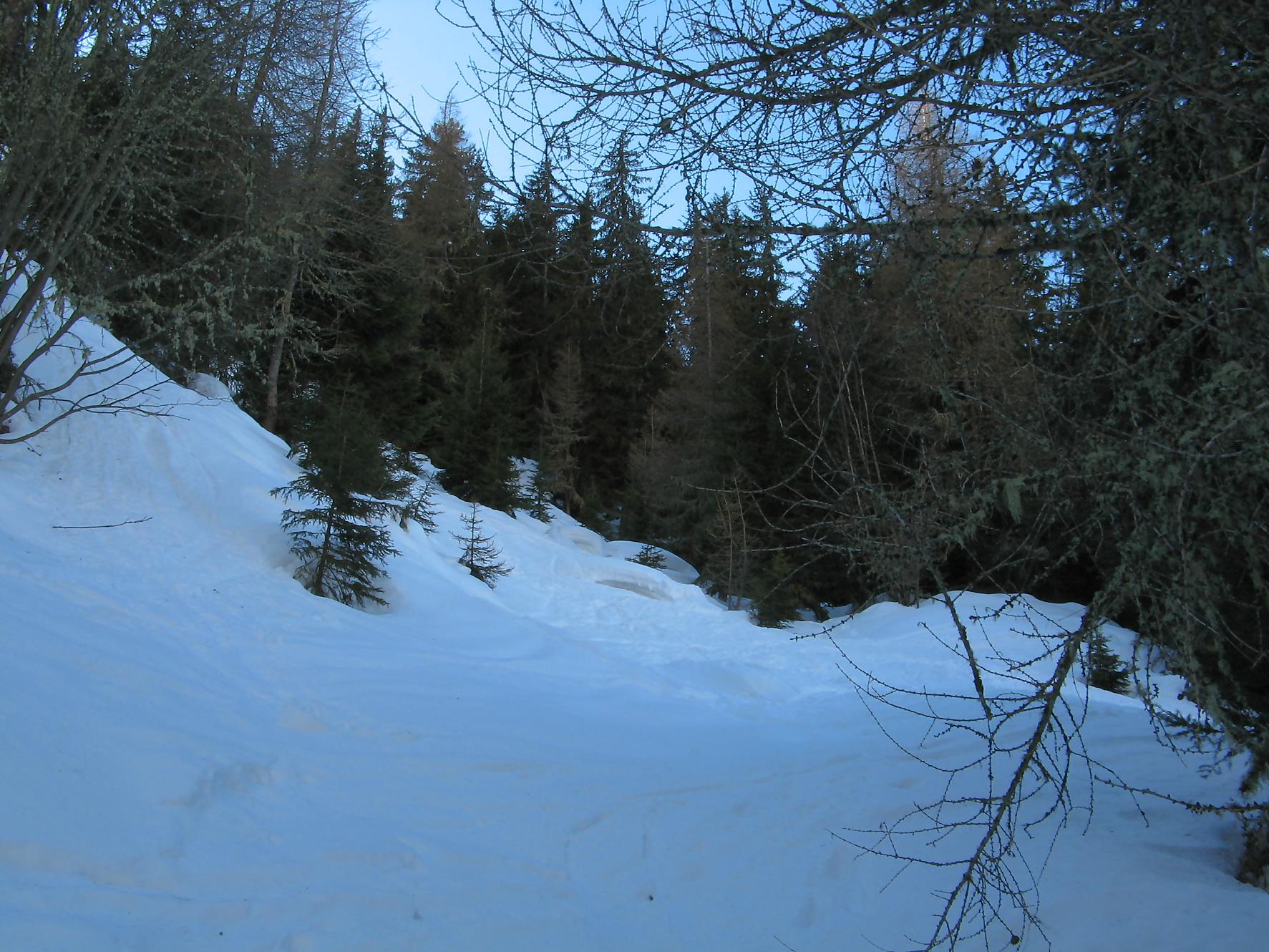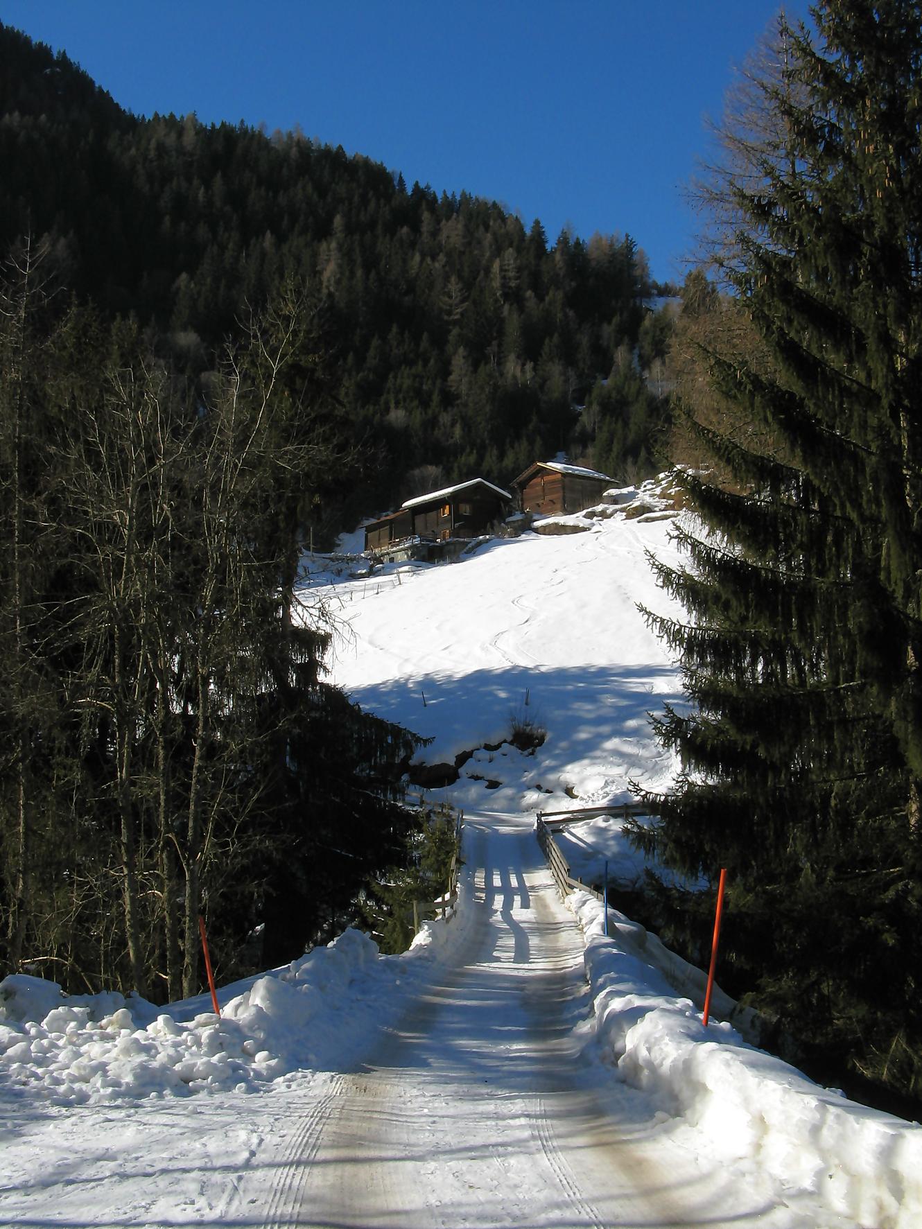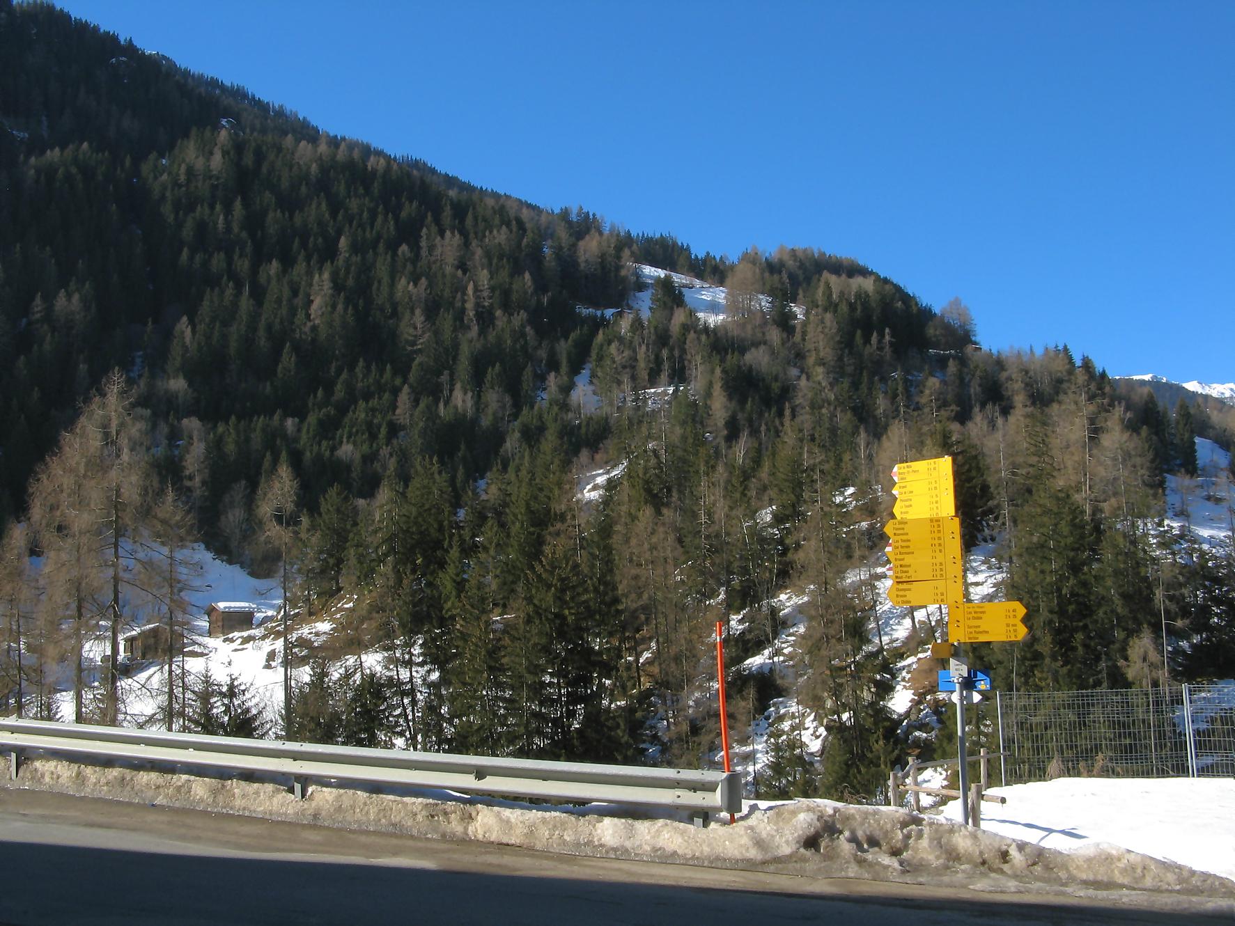 Pour cette sortie, je me fixe un objectif ambiteux de monter au Mont Rogneux depuis Champsec, soit 2000 m de dénivelé. Je n’ai encore jamais atteint ce niveau en ski, on verra bien si j’y arrive. Je prends donc le train puis change à Martigny pour le Saint-Bernard-Express et à Verbier je prends le bus. Pendant l’attente du bus, je discute avec deux personnes aussi en ski de randonnée qui vont monter à la cabane Brunet et me conseillent de partir depuis Lourtier. Je pars donc de Lourtier (1074 m), en descendant à pied la route de Plan-Rosay. Je chausse depuis Plan-Rosay et parts en travers pour La Tinte : passage en forêt, avec une pente, de quelques mètres, délicate, un passage déneigé pour arriver aux chalets de La Tinte. On part ensuite dans la clairière sur la droite, par le chemin d’été vers le Pt1300. Puis la pente s’adoucit pour rejoindre le chalet du Pt1401 et ensuite c’est par une petite route qu’on rejoint Plénadzeu, Pt1456. J’ai fait ce parcours avec deux personnes dont un homme qui n’avait plus de bras ! Chapeau, il devait juste être accompagné pour les diverses manipulations. Ces personnes continuent vers la cabane Brunet. De mon côté, je pensais prendre le chemin normal par la route mais je vois un couloir avec des traces de descente et décide donc de le remonter (couloir passant par Le Partset puis Folorsi). Le bas du couloir n’est pas évident car étroit et pentu ce qui m’a valu de faire quelques mètres à pied. Je retrouve la route au niveau de Folorsi, toujours pentu mais il y a la place pour les conversions. J’arrive à La Treutse gardé par une barre rocheuse que je contourne par la droite, à flanc de coteau à la fin. J’arrive sous le Pt2093 à l’E. Je retrouve le soleil et je comprends ici que mon horaire est trop tardif pour tenter le Mont Rogneux. Je choisis donc de faire la crête du Goli des Seyons car j’y vois des traces. Je monte sur la gauche pour arriver à un abri en pierres (Pt2092). Le chemin redevient pentu puis s’adoucit et on change de versant avant le Pt2229. Le chemin est très esthétique, une crête avec des rochers apparents, magnifique. Puis j’arrive au sommet local, Pt2368. Je profite d’une magnifique vue sur les Dents du Midi, Verbier, et les montagnes de l’autre côté du val de Bagnes. Par contre le Mont Rogneux n’est pas visible.