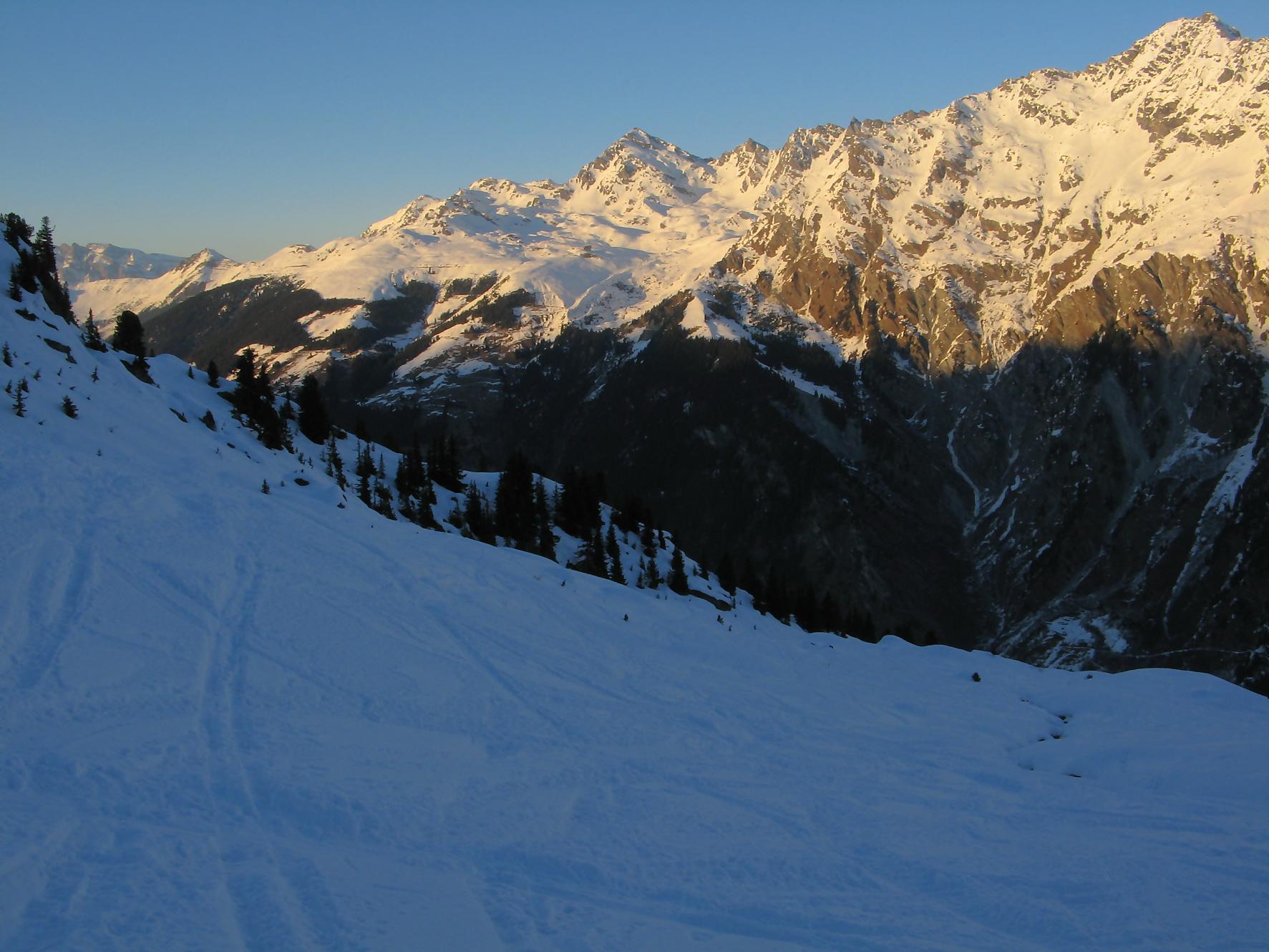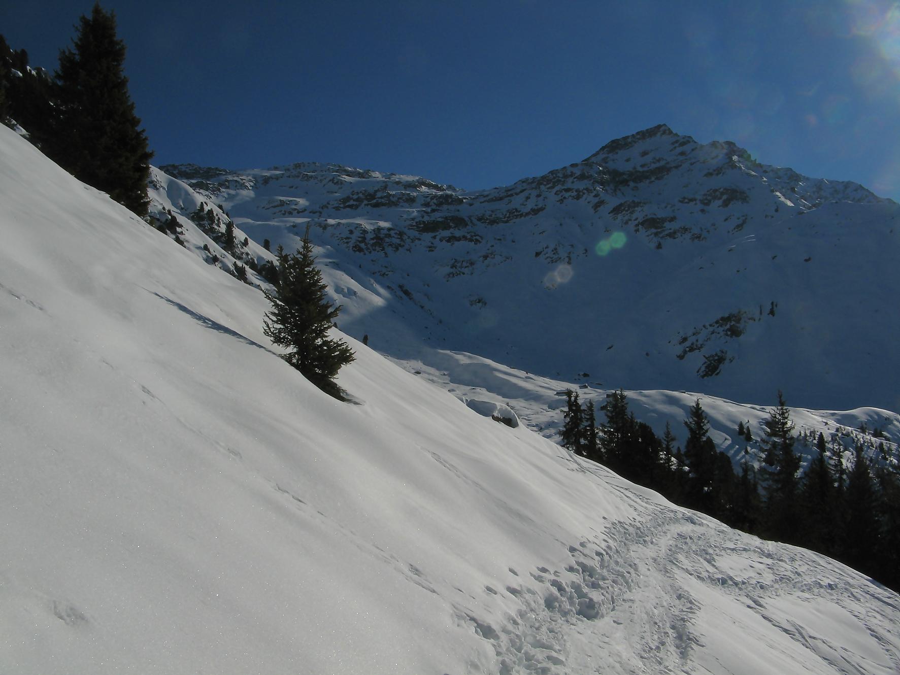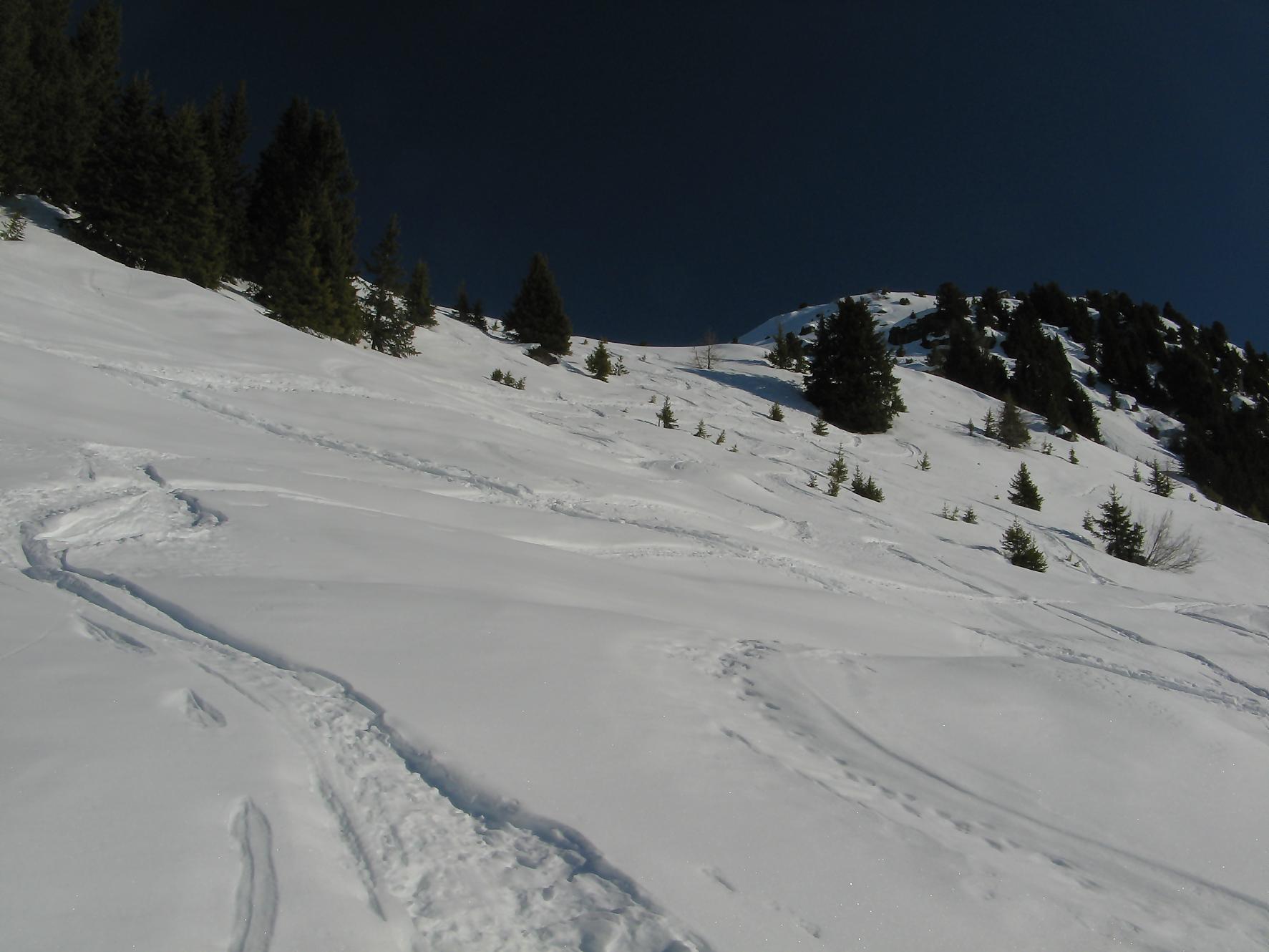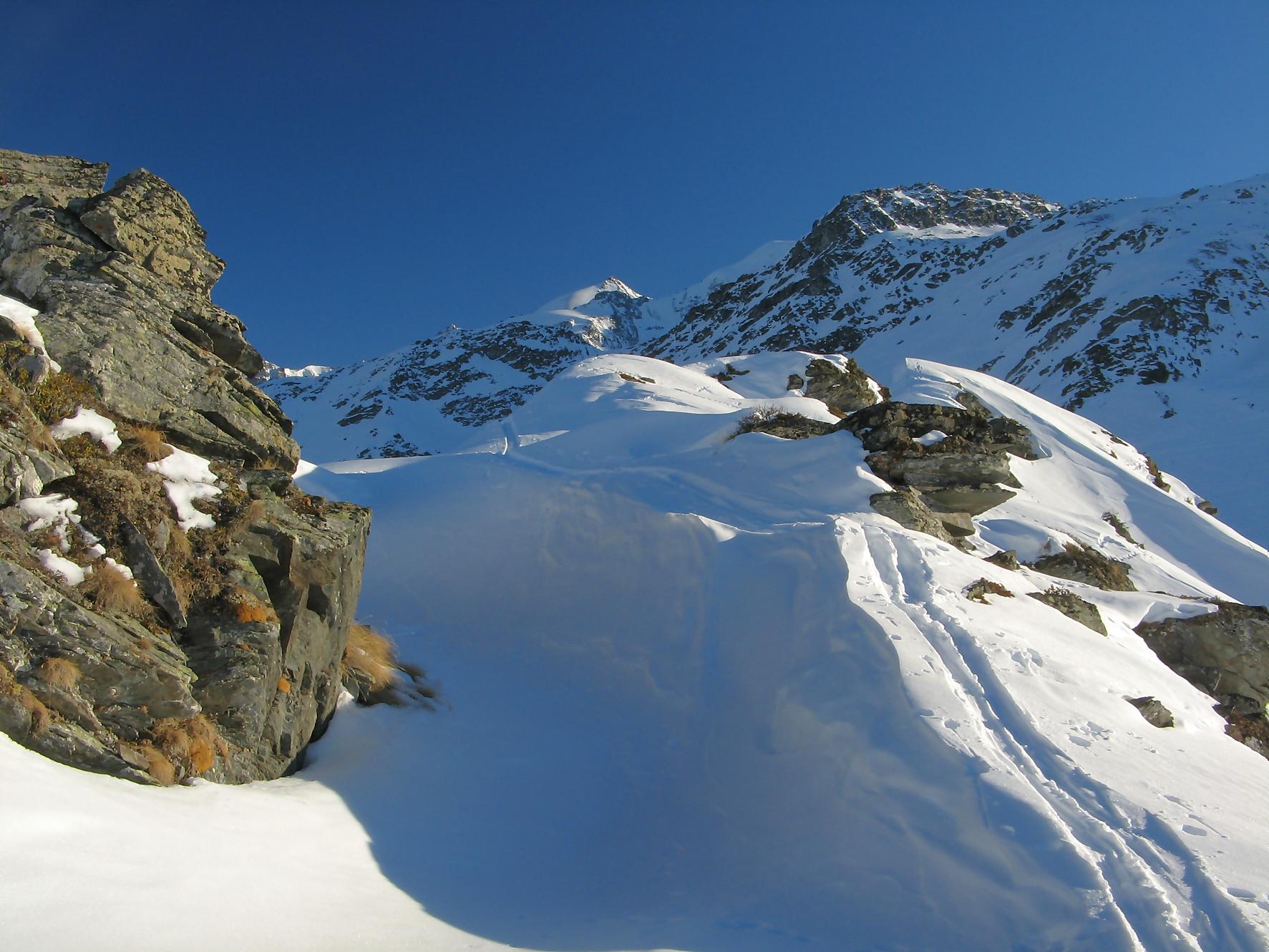 Pour la descente, on se laisse glisser en dévers le long de la crête pour rejoindre le col sous le Pt2386. On se laisse descendre dans la belle combe de Comba Servay, une belle poudreuse m’attend. Cela ne m’empêche pas une gamelle et de perdre 10 min à rechercher mon ski. Les stoppeurs n’est pas une solution pour le ski de randonnée.