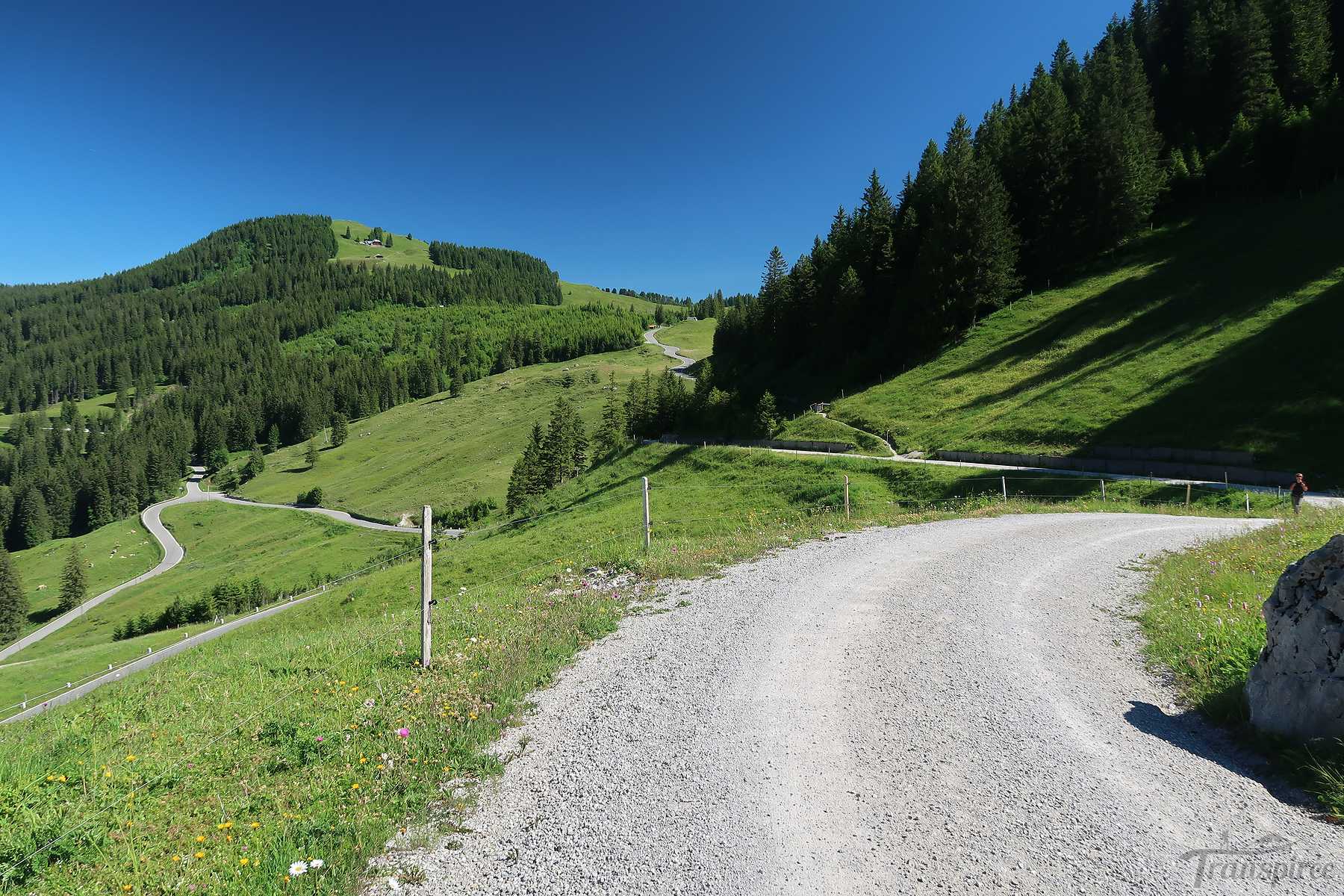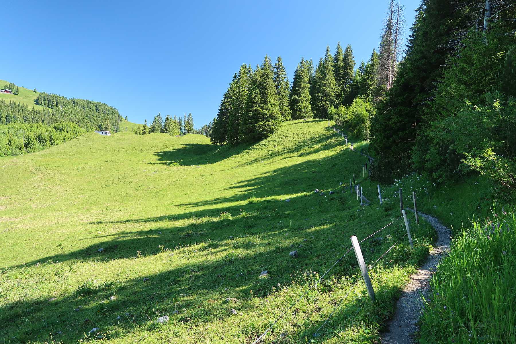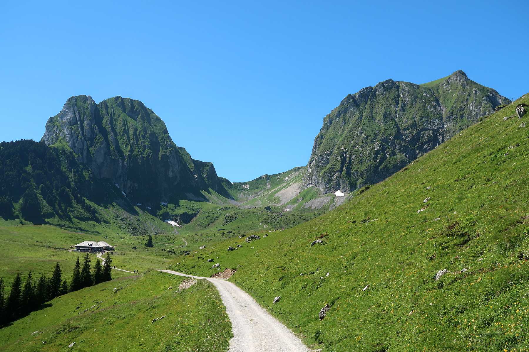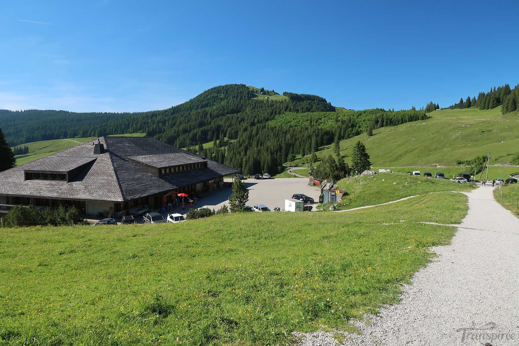 En arrivant depuis Fribourg, on visite l’arrière pays pour arriver à la ferme de Underi Gantrischhütte. Il y a bien de place pour se garer (ainsi qu’au-dessus, Pt1580). Nous partons par le pâturage puis un chemin en forêt (épicéas et pins) agréable, mais la route étant passante, nous profitons du bruit des motos et de ceux qui la confonde avec un rallye.