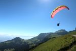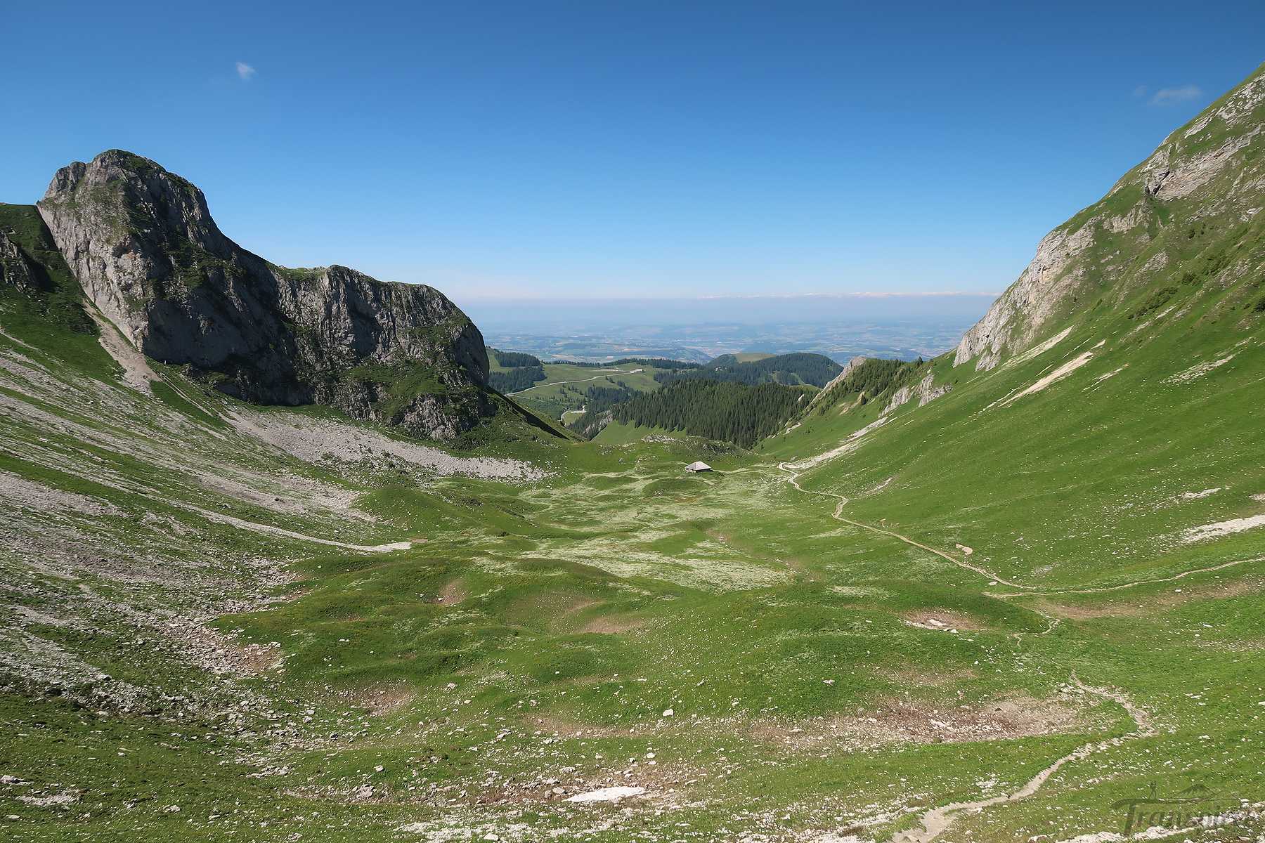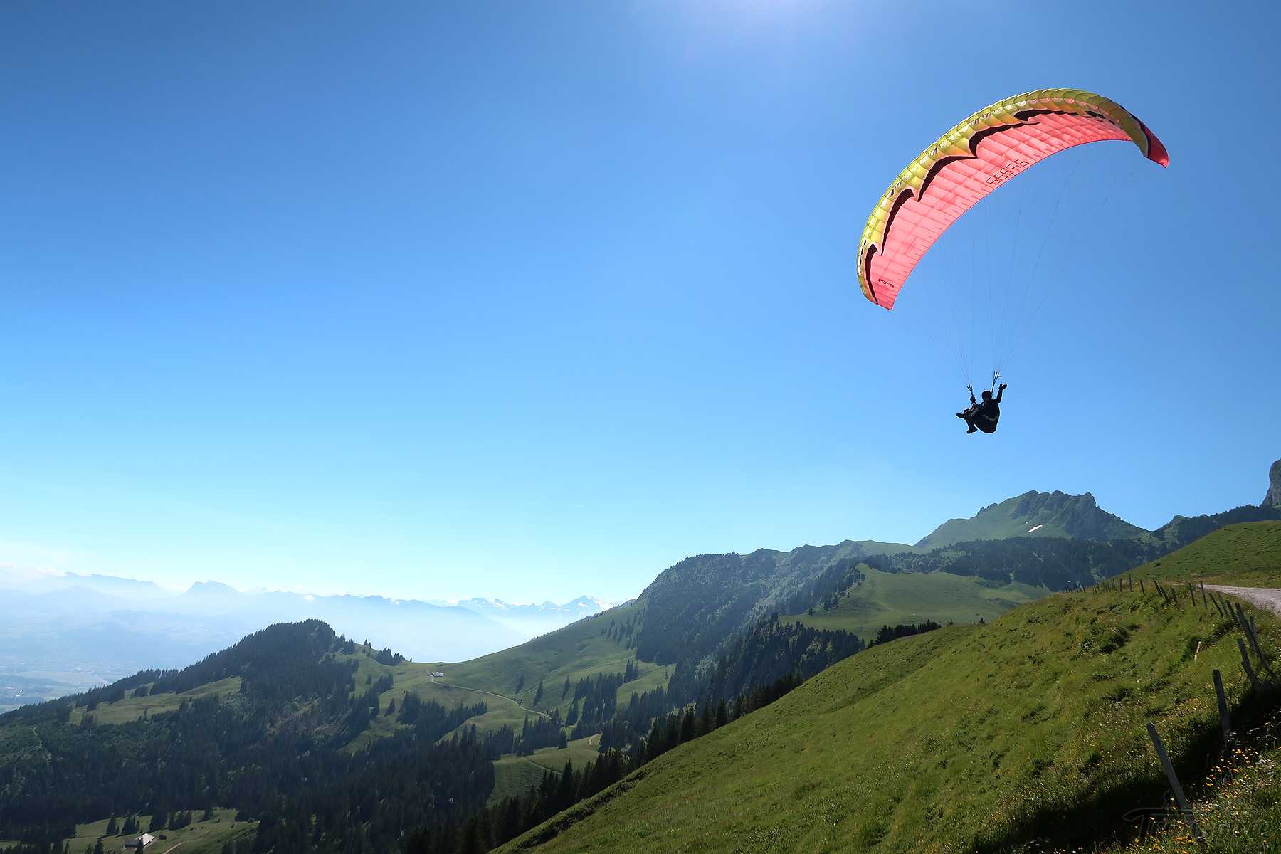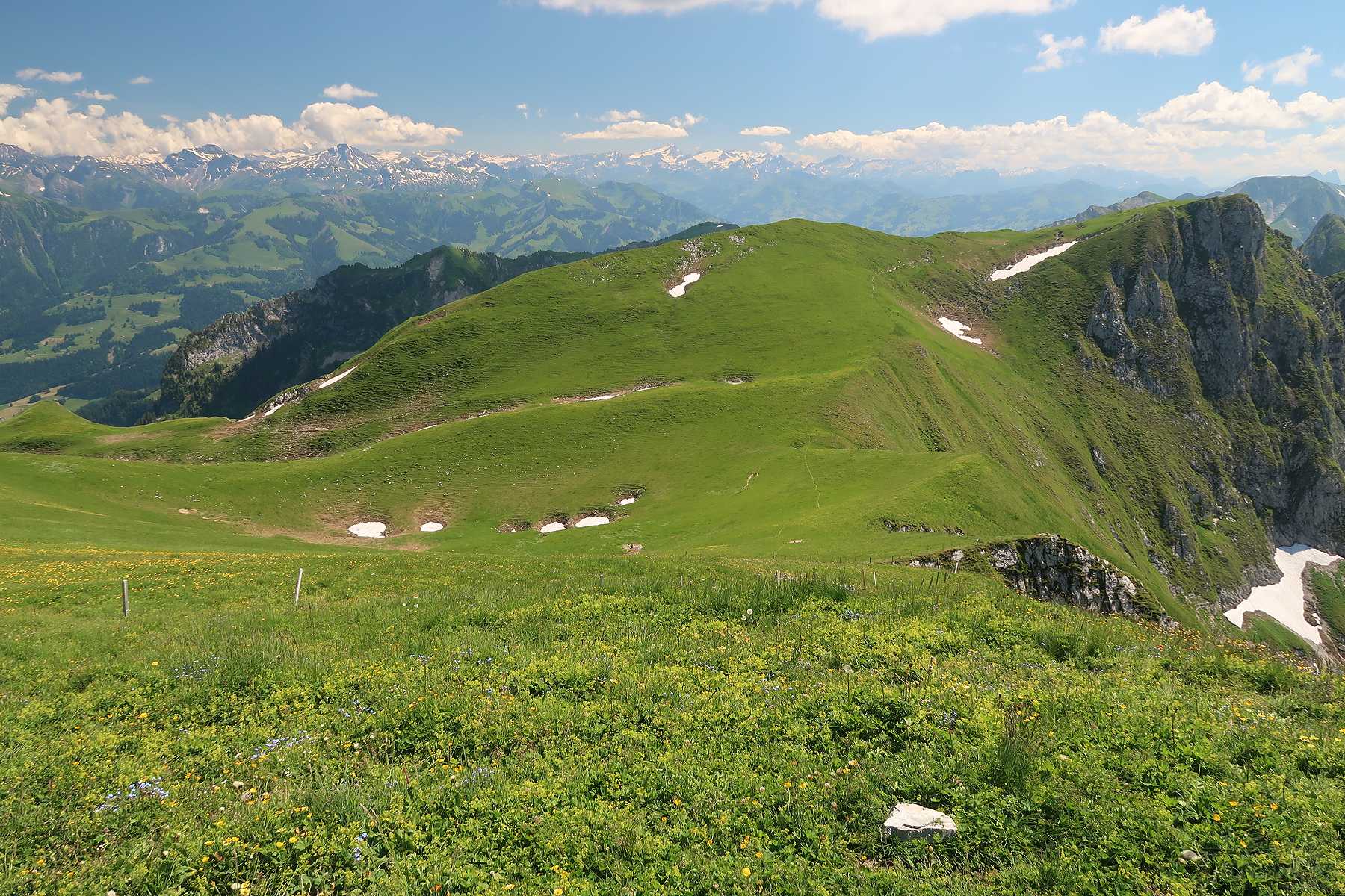 Nous rejoignons le premier parking au Pt1580, pour longer une route goudronnée et passer devant le deuxième parking. La vue s’ouvre sur la gauche sur les préalpes bernoises. Deux parapentes sont dans les pentes du pâturage et profitent du vent. Joli à voir.