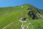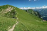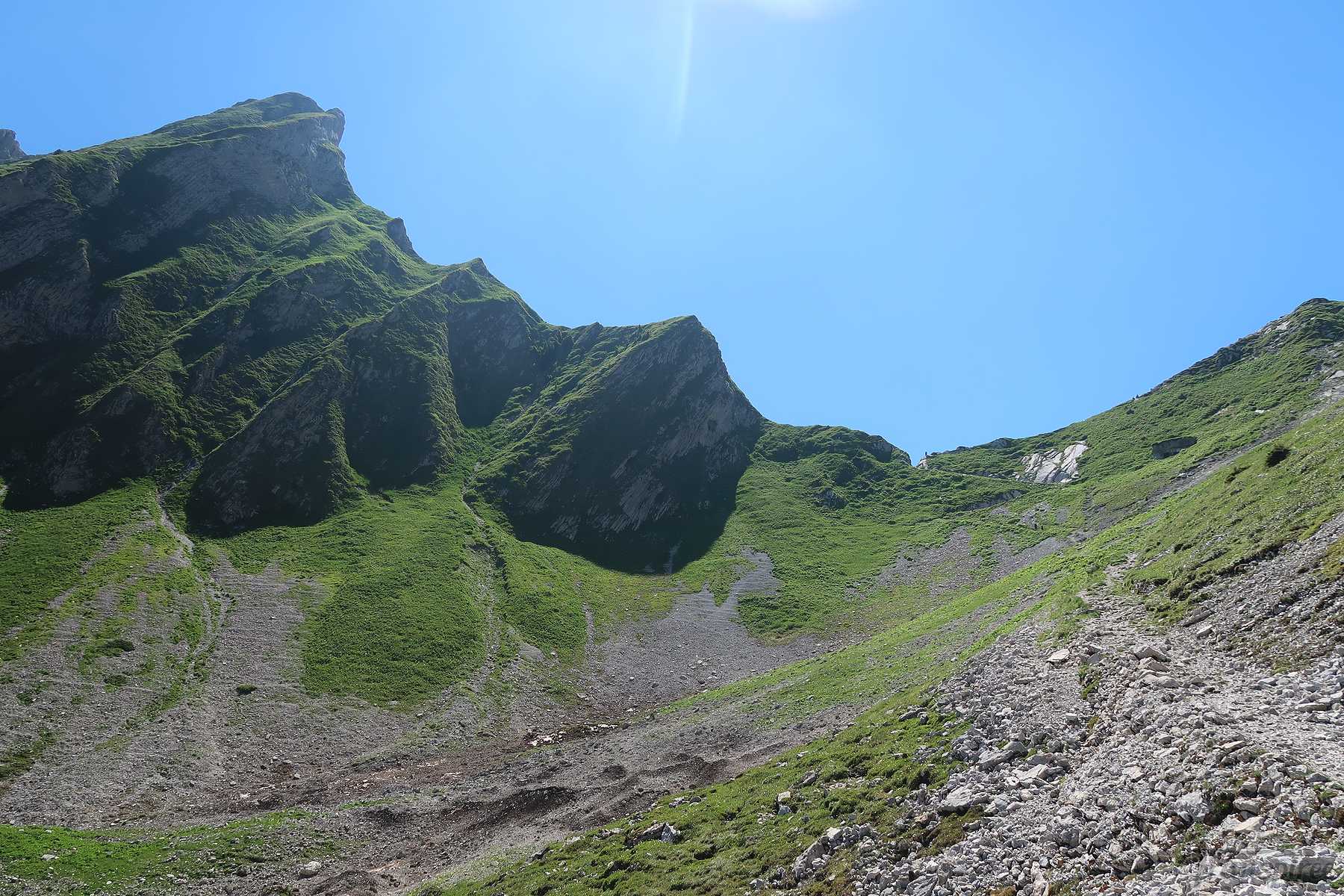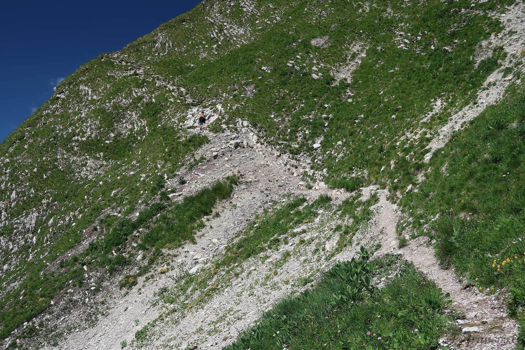 A ce col, wouah la vue s’ouvre sur les 4000m bernois, l’Eiger et sa face N bien reconnaissable. Magnifique. Il faut poursuivre brièvement sur l’arête pour filer en léger contrebas dans la face N. Le chemin demande de l’attention (un câble sur une section) car rocailleux. On rejoint la face S du Gantrisch. Le sentier est en pente régulière, mais il est peu agréable et demande de l’attention : en devers et parfois abîmé.