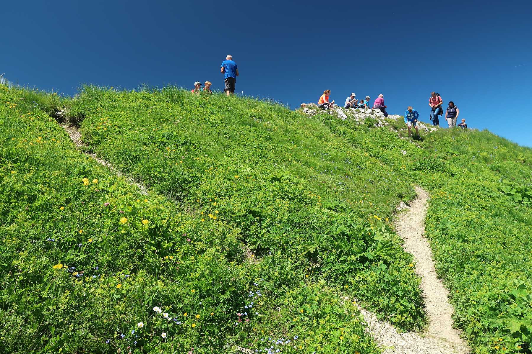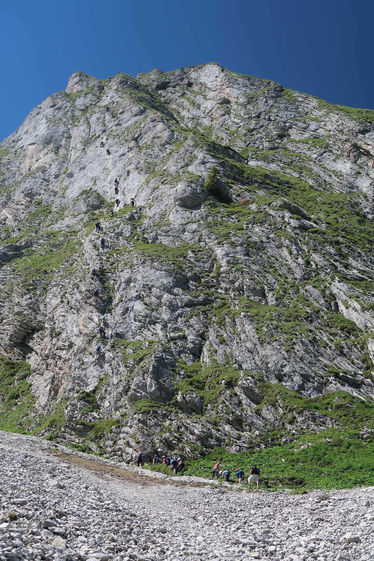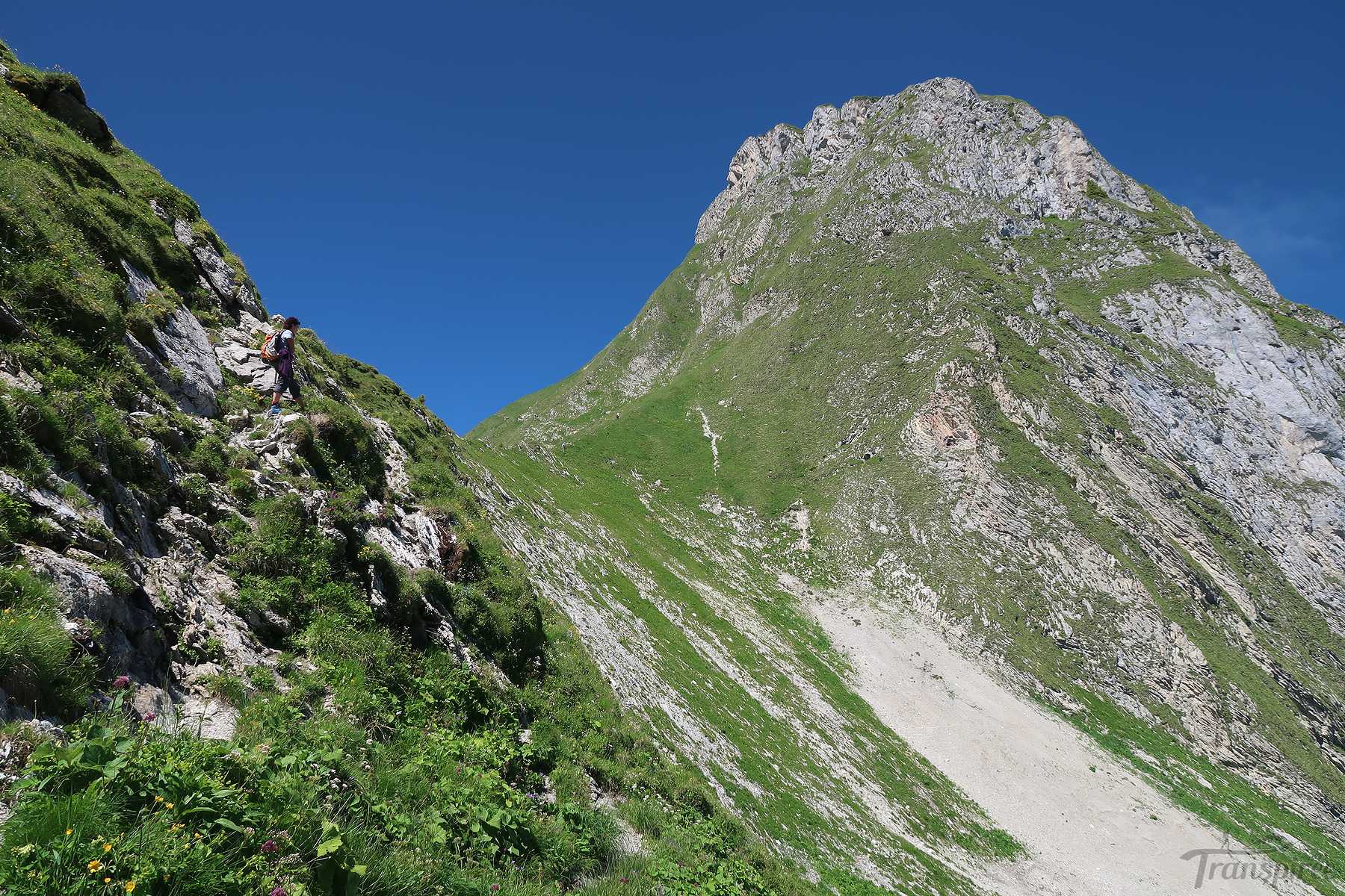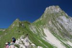 Nous poursuivons, désormais sur un sentier parfois caillouteux. Les pâturages sont teintés de rose par les silènes dioïques, les renouées bistortes et quelques becs de grue. On croise de plus en plus d’alpinistes avec le matériel de Via Ferrata. L’explication se dévoile vite : la face E du Gantrisch est équipée d’une Via Ferrata, quasi droit en haut. Mazette, il y a bien du monde. C’est limite comme à la poste où il faut prendre un ticket !