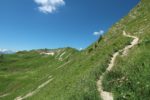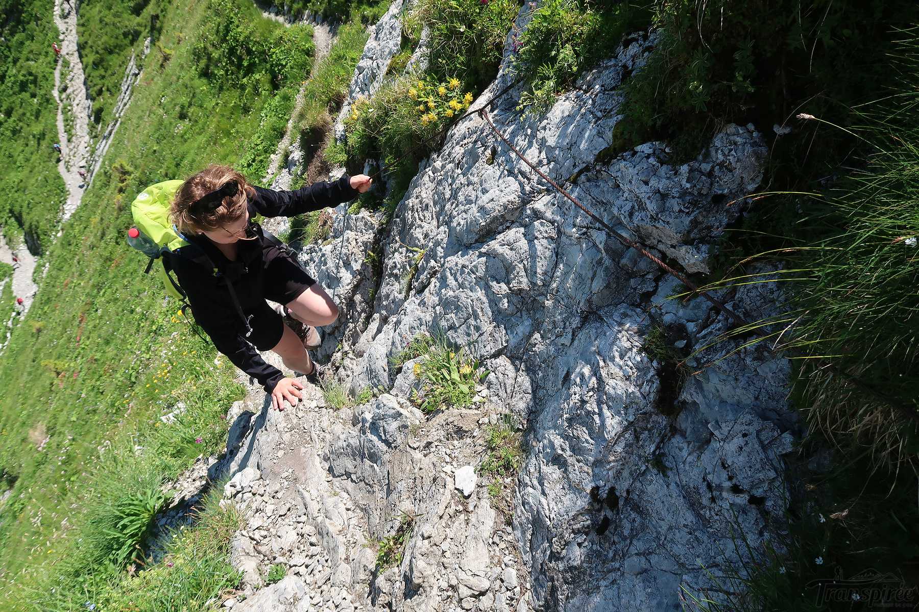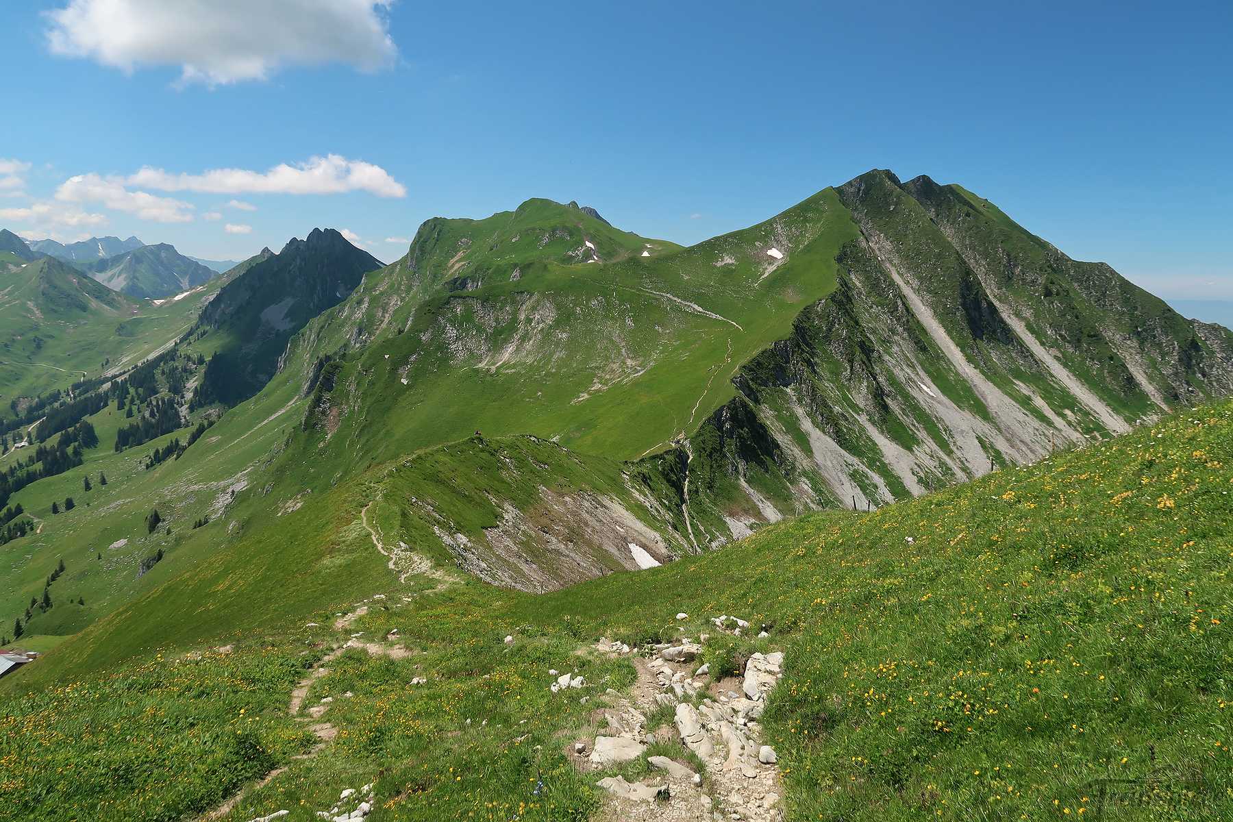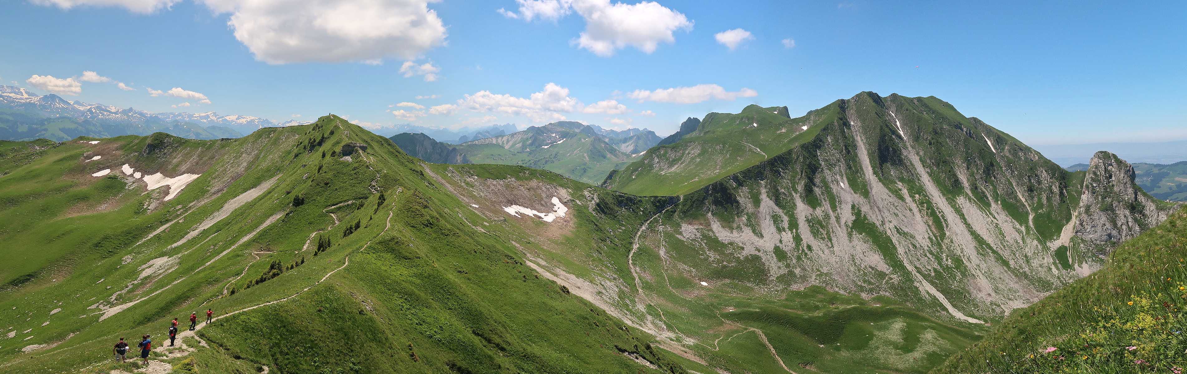 Nous poursuivons, désormais sur un sentier parfois caillouteux. Les pâturages sont teintés de rose par les silènes dioïques, les renouées bistortes et quelques becs de grue. On croise de plus en plus d’alpinistes avec le matériel de Via Ferrata. L’explication se dévoile vite : la face E du Gantrisch est équipée d’une Via Ferrata, quasi droit en haut. Mazette, il y a bien du monde. C’est limite comme à la poste où il faut prendre un ticket !