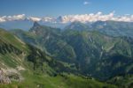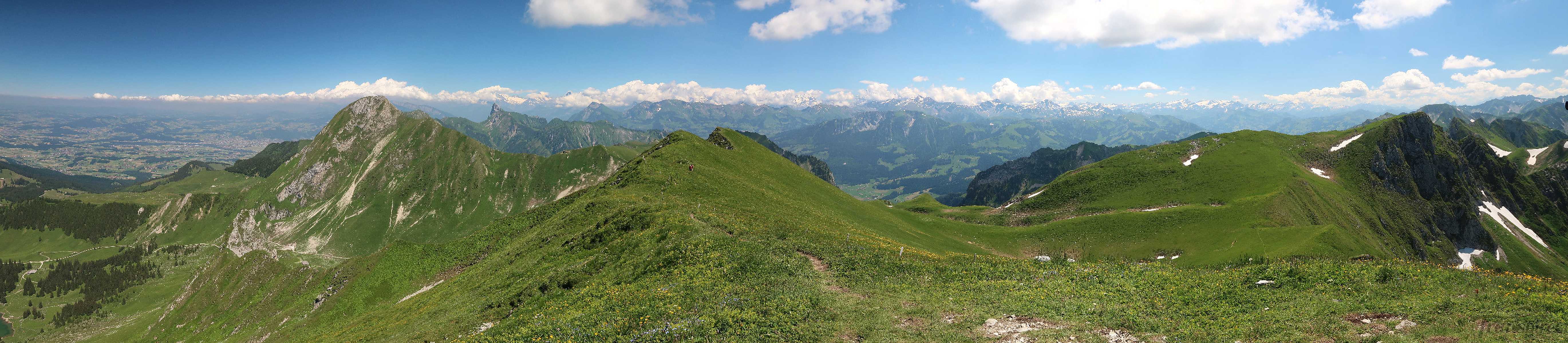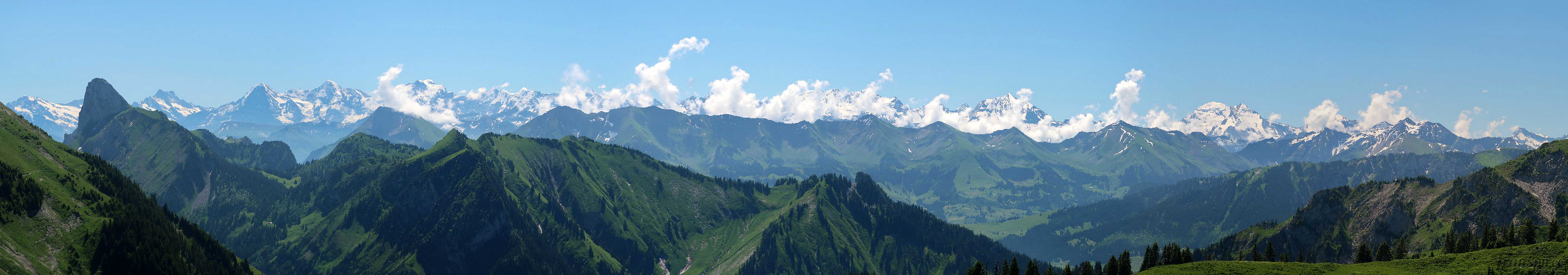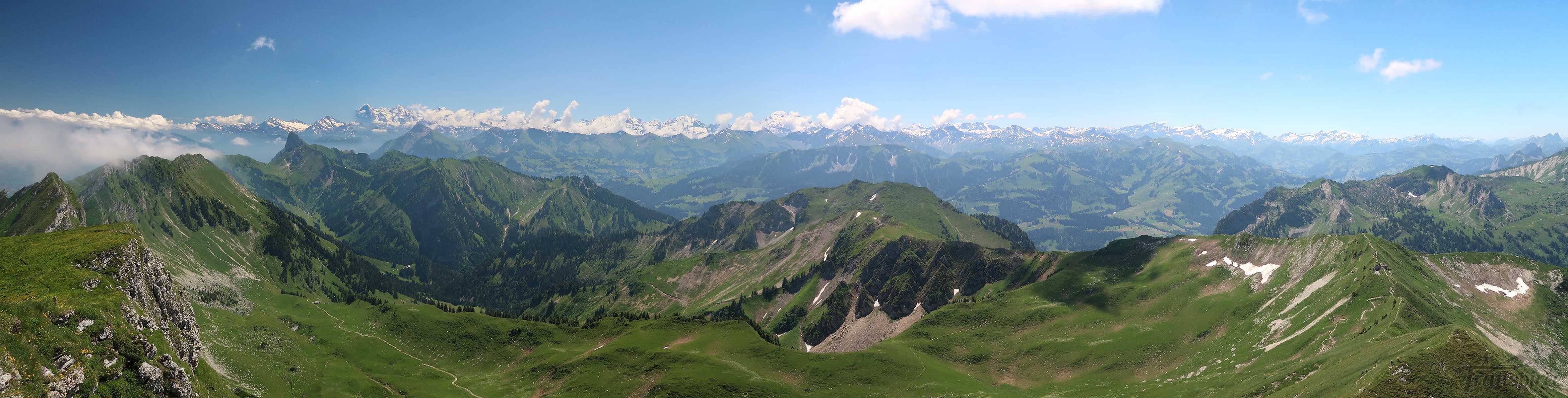 La vue est presque à 360°, la face N de l’Eiger facilement repérable. On distingue aussi en partie le Mont Blanc. Superbe.
