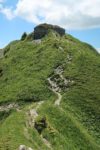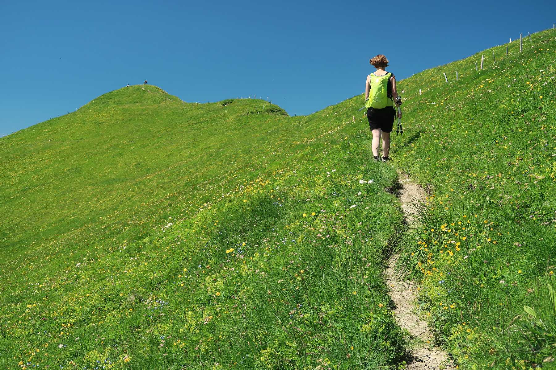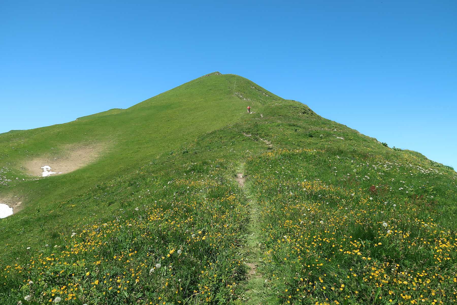 On poursuit par un chemin agréable en arc de cercle. Nous arrivons à une croisée des chemins et nous filons presque au N pour le Bürgle. Le chemin devient bien pentu, presque raide. La pente s’adoucit après l’antécime du Bürgle. Un dernier effort en douceur permet de rejoindre le sommet du Bürgle. Un modeste cairn marque ce sommet. Je préfère ce sommet car nettement moins fréquenté (au passage plus facile d’accès) et avec ceux rencontrés on s’autorise à discuter.