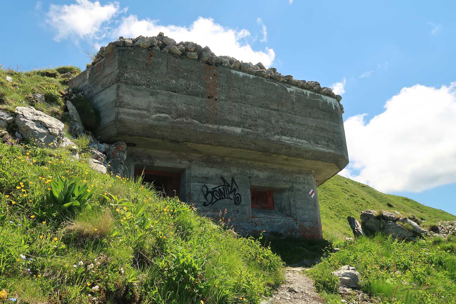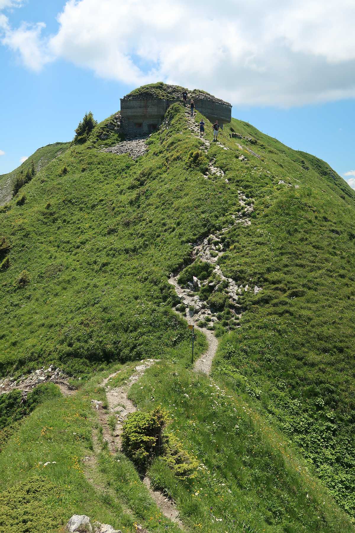Après la pause, on descend par le chemin de la montée et retrouvons ses câbles. En descendant cela demande plus de concentration. On poursuit ensuite sur la crête confortable pour arriver à un col. Devant nous se dresse un blockhaus. On le contourne pour arriver au sommet du Schibespitz. Rien de spécial à voir.