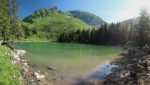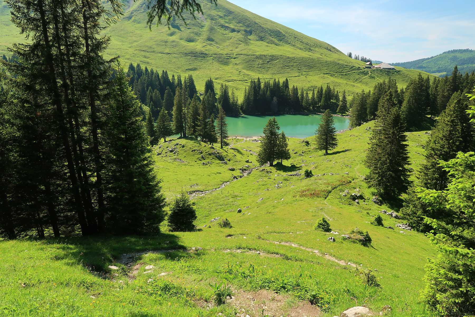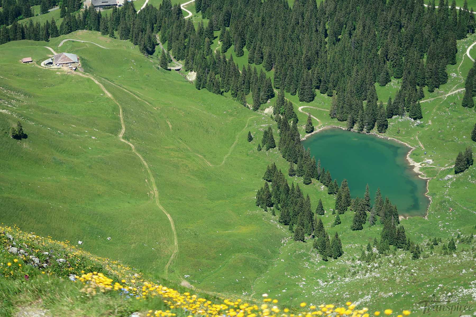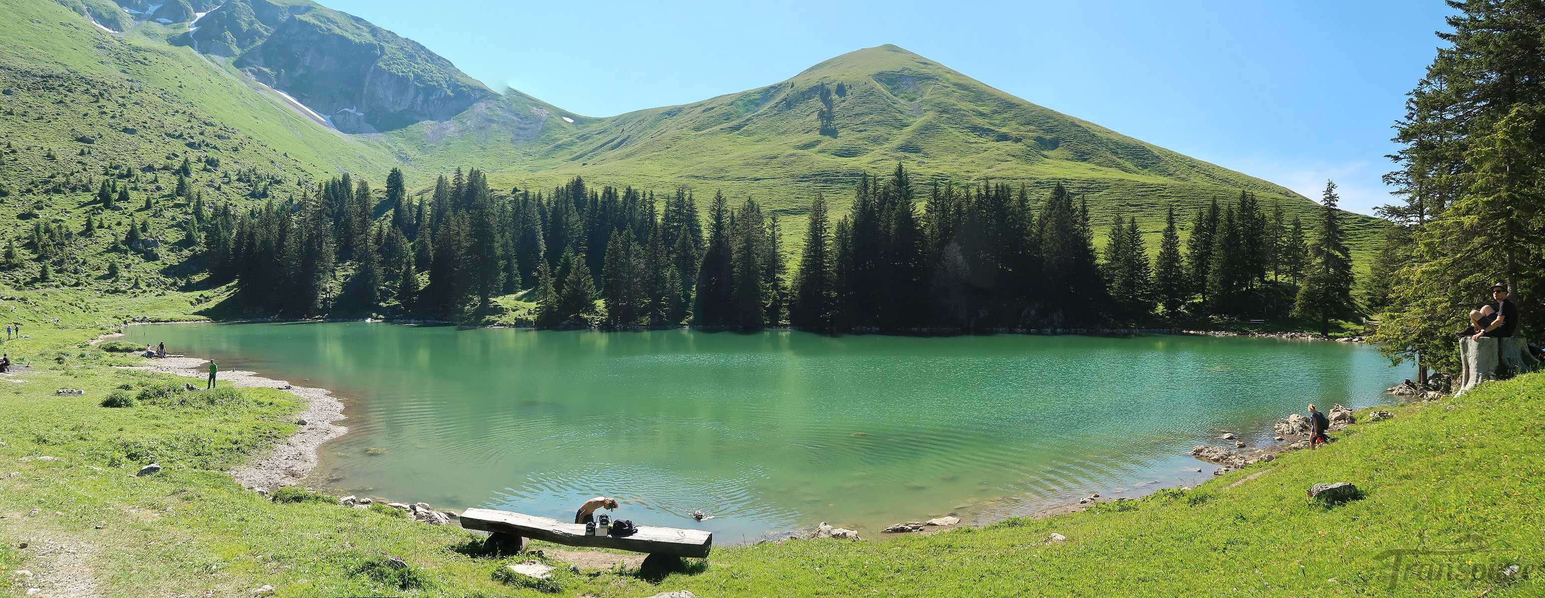 En dessous de la ferme, un bref instant sur la route pour ensuite suivre un chemin pédestre. Un bref passage en forêt, un léger passage pentu et nous débouchons sur le lac de Gantrischseeli. Wouah que c’est beau ! Il y pas mal de monde. Nous nous arrêtons là. Le lac est froid, on se baigne jusqu’aux cuisses (qui oublie son maillot et ne veux pas rentrer en culotte mouillée). Les alvins vous chatouillent les pieds. Moment de quiétude malgré le passage. Puis il nous reste à rentrer et en moins de 15 minutes par une marche tranquille nous rejoignons le parking du jour.