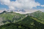 J’arrive sous la Pointe des Lanches, la vue s’ouvre sous la Pointe de la Chavache. Le sentier, en dévers, devient franchement inconfortable et délicat. J’arrive au sommet de la Pointe des Lanches lorsque je vois trous personnes descendre le long de l’arête. Hum je dois avoir raté une section du chemin. Je marque une pause casse-croûte. Jolie vue. Entre Mont de Grange et Dents du Midi dont on ne voit que la partie haute. Surtout qu’en ce jour un nuage en contrebas renforce ce charme.