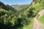 Je descends par un débonnaire dégagé. Puis il s’enfonce en forêt avec une section raide, parmi des racines et aiguilles d’épicéa. La gravité me rappelle à l’ordre, je suis tombé par terre c’est la faute à Voltaire. Le sentier traverse un ruisseau puis descend en forêt avec des trouées. Cela permet de voir les chalets d’Ardens et la Pointe d’Ardens. Joli.