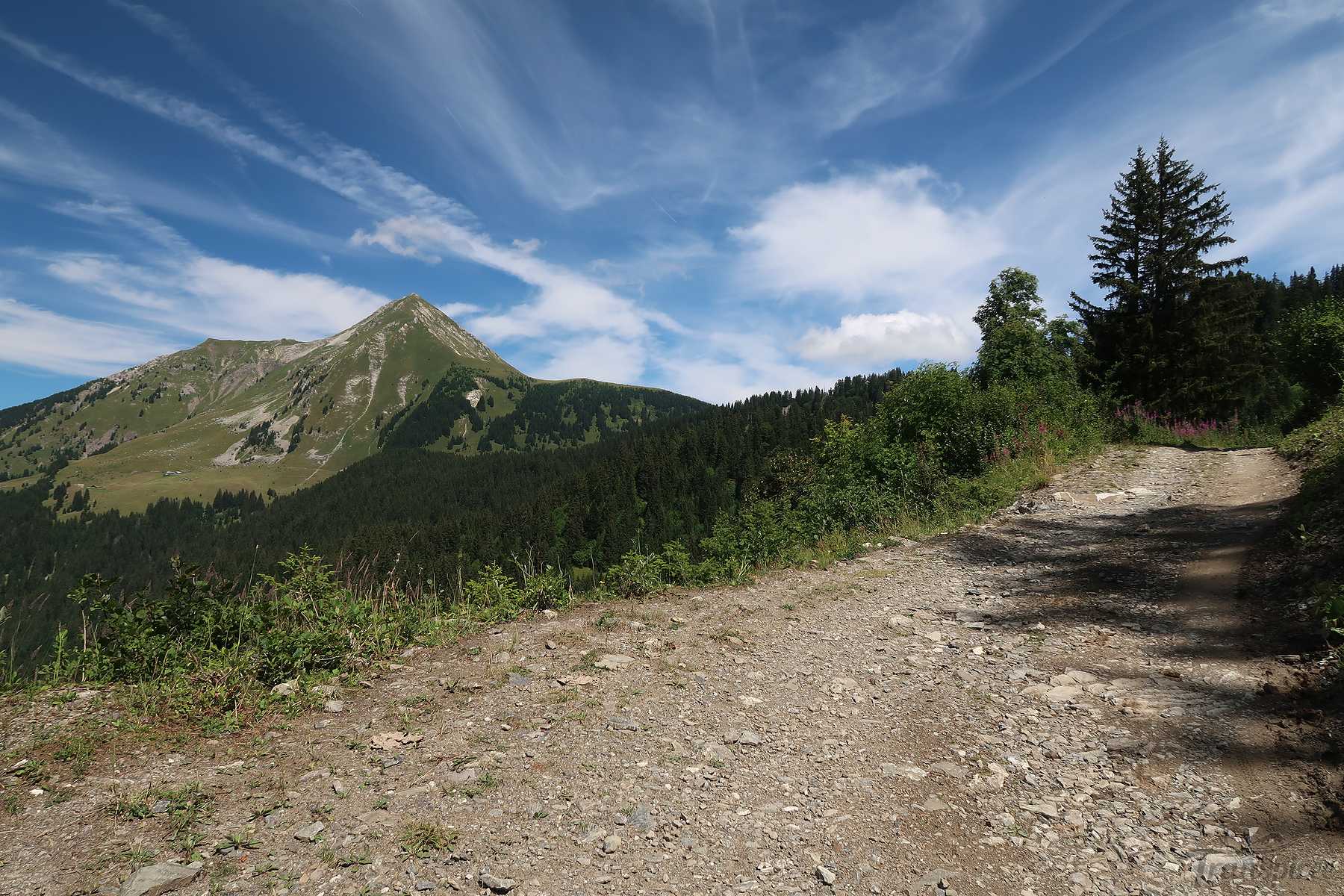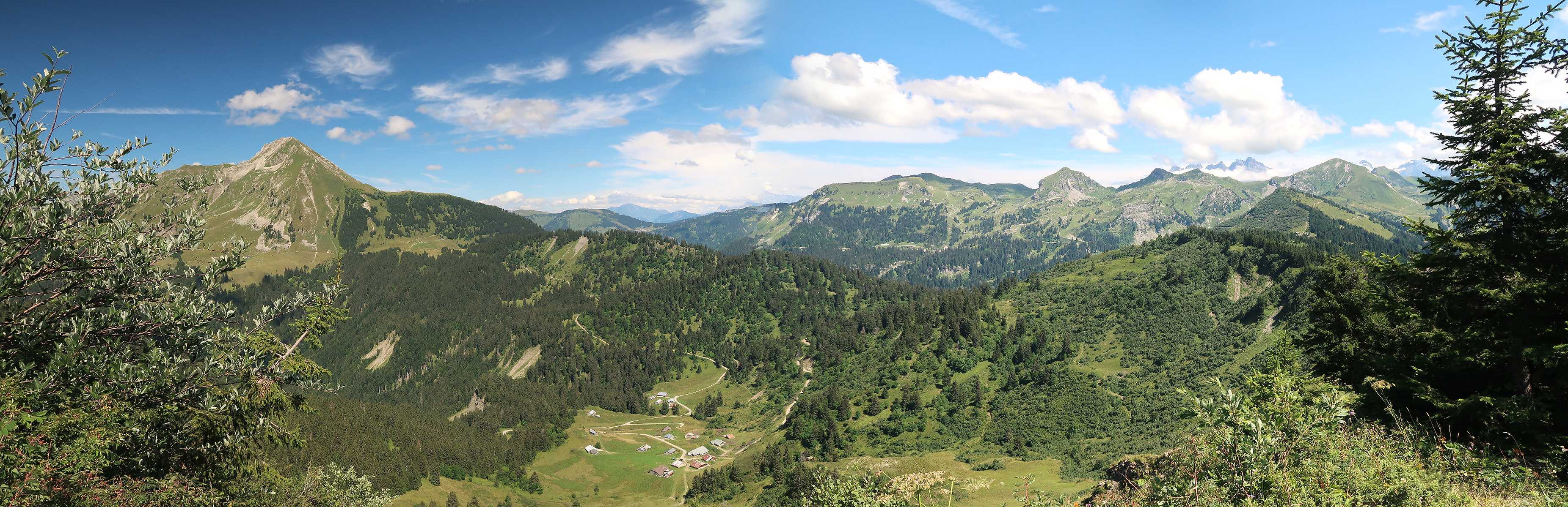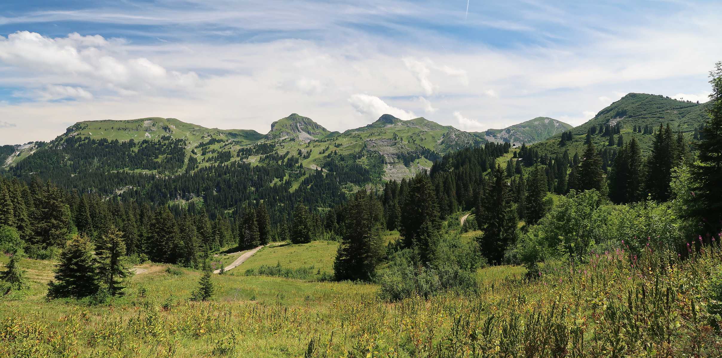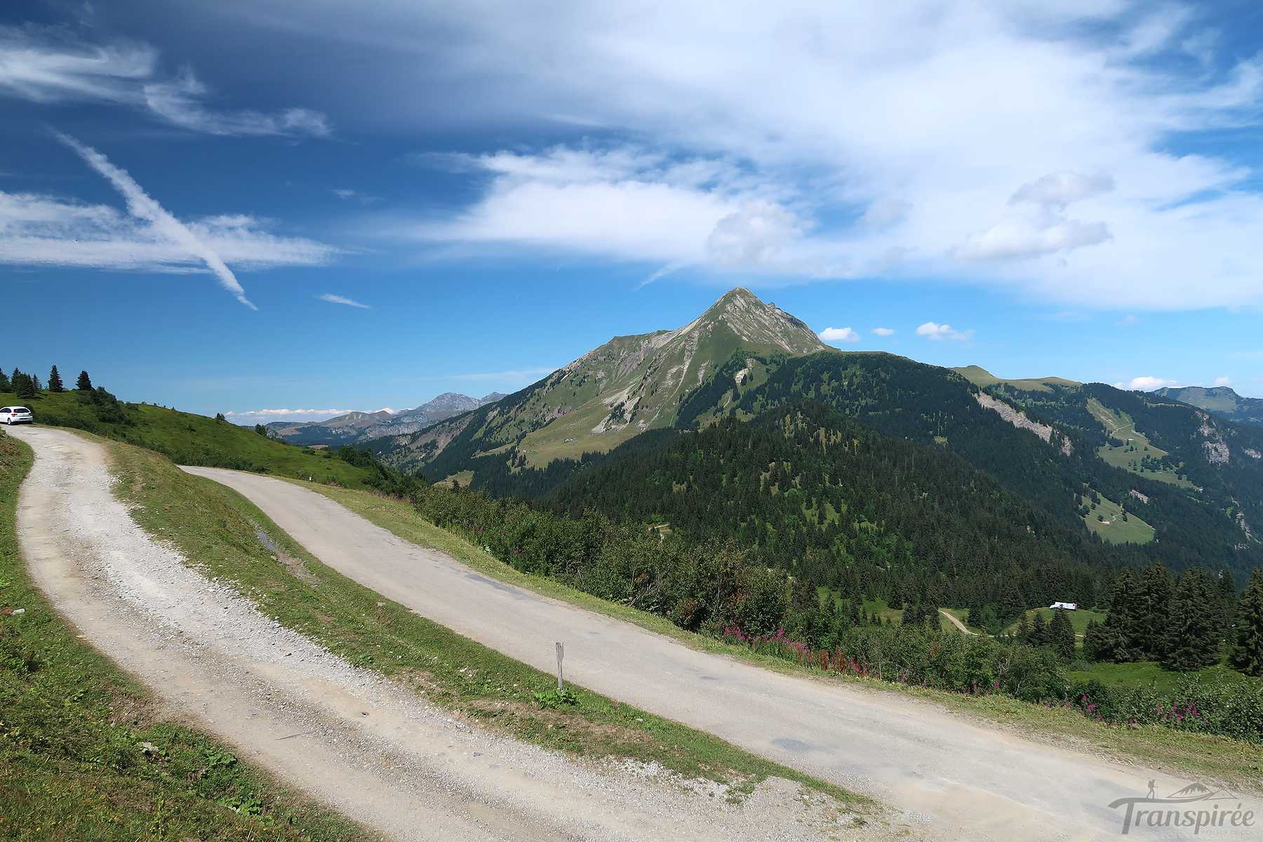 Il existe un sentier, mais je poursuis par la route que je trouve bien agréable. J’arrive à un col, Pt1663. La vue s’ouvre sur le domaine skiable des Portes du Soleil des Lindarets. Joli cadre.