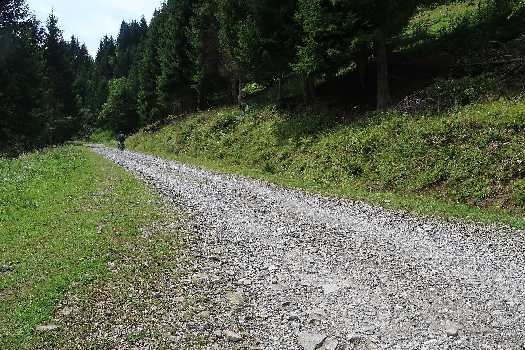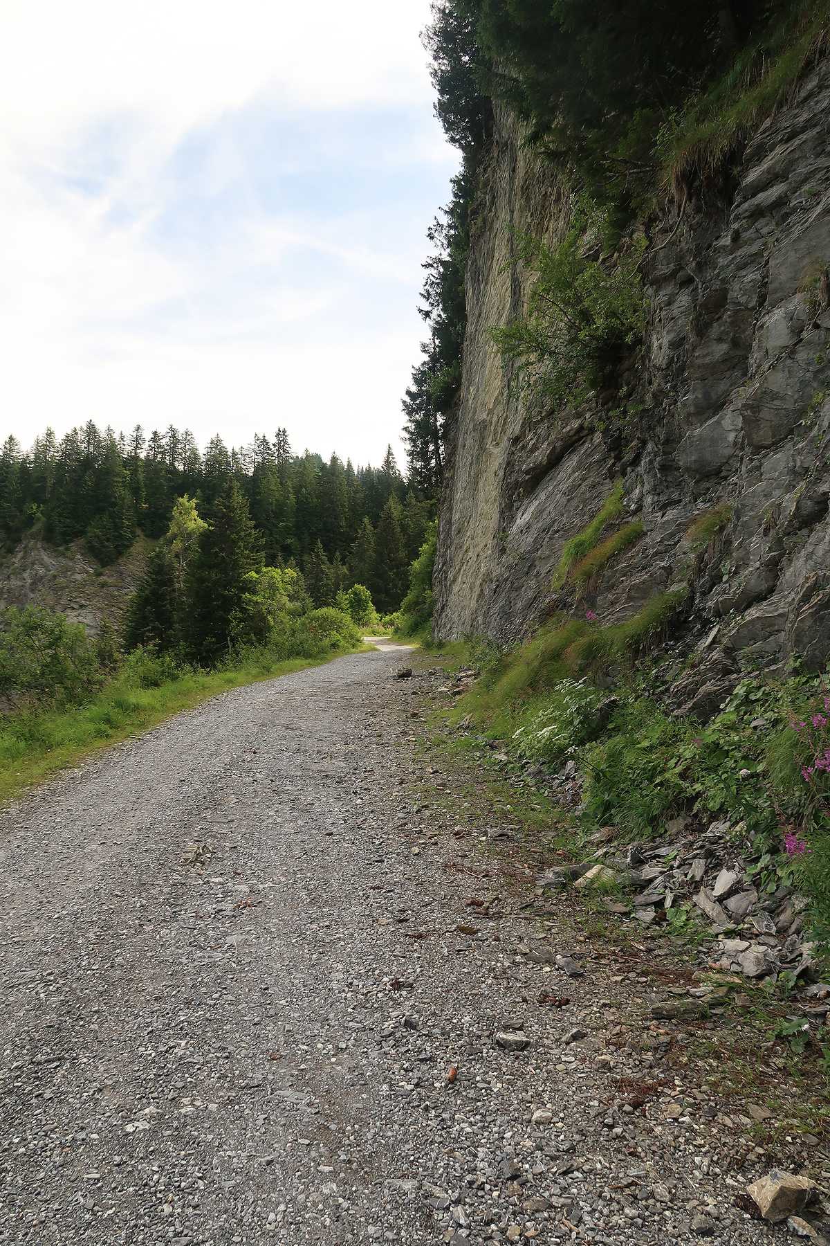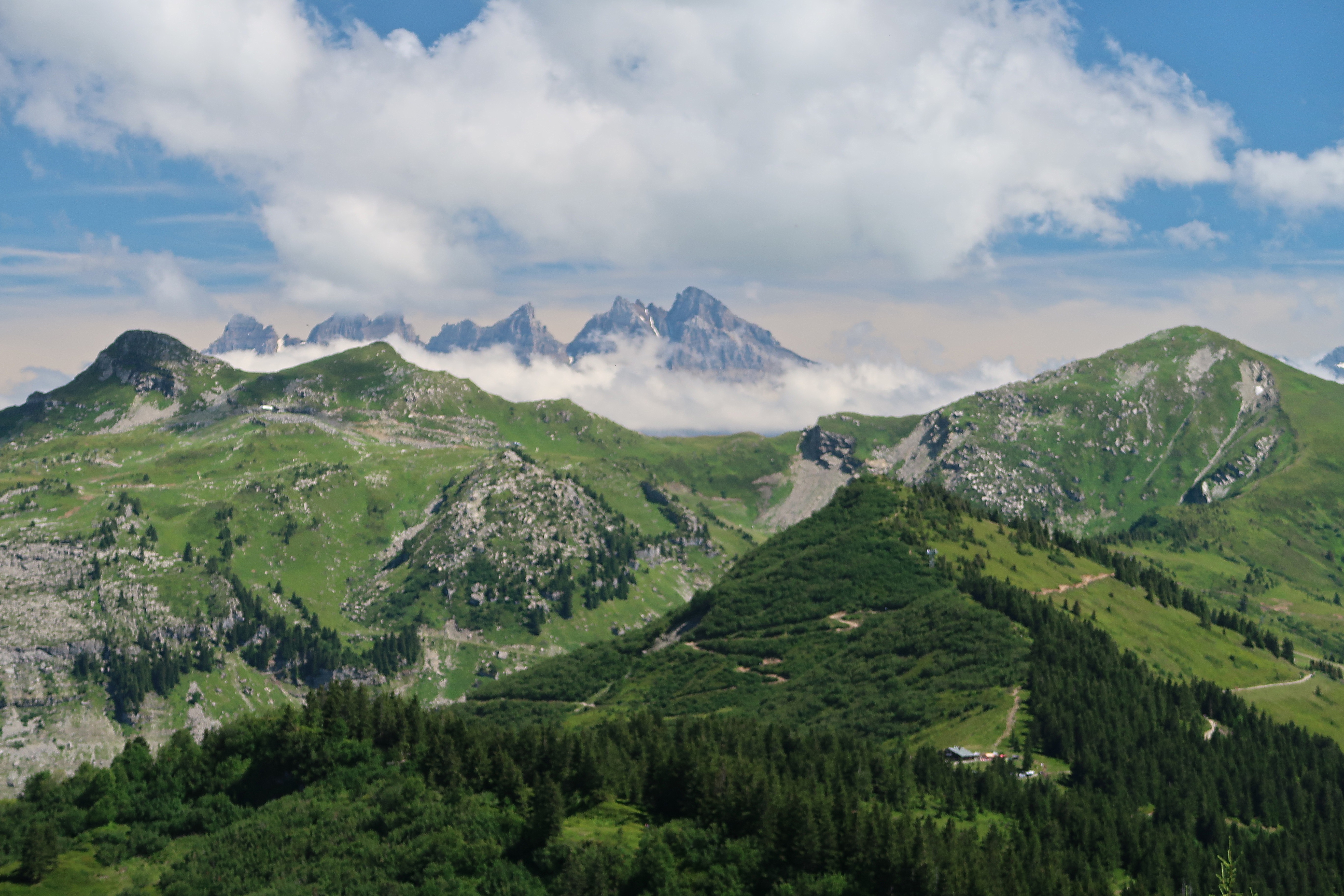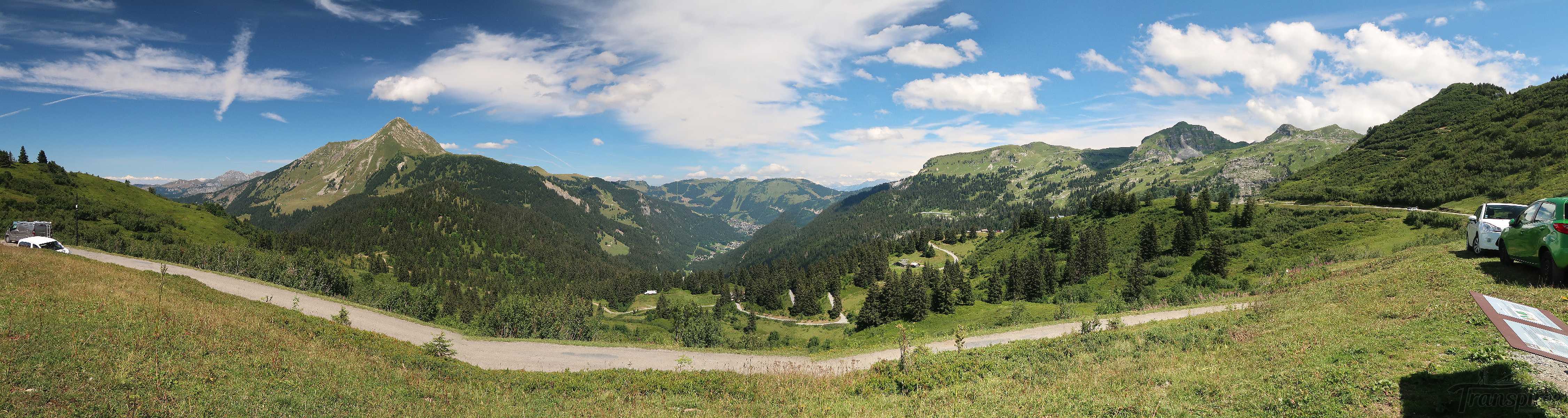 Il existe un sentier, mais je poursuis par la route que je trouve bien agréable. J’arrive à un col, Pt1663. La vue s’ouvre sur le domaine skiable des Portes du Soleil des Lindarets. Joli cadre.