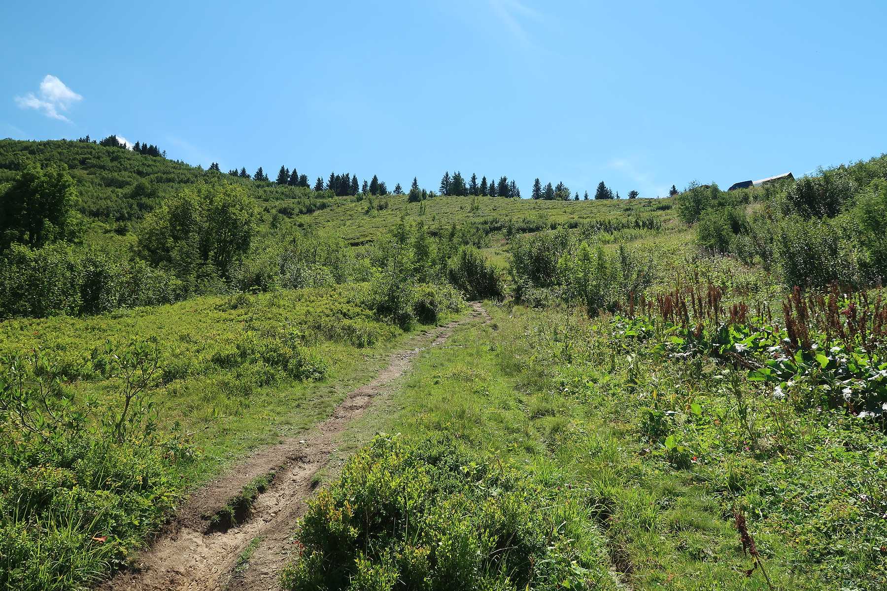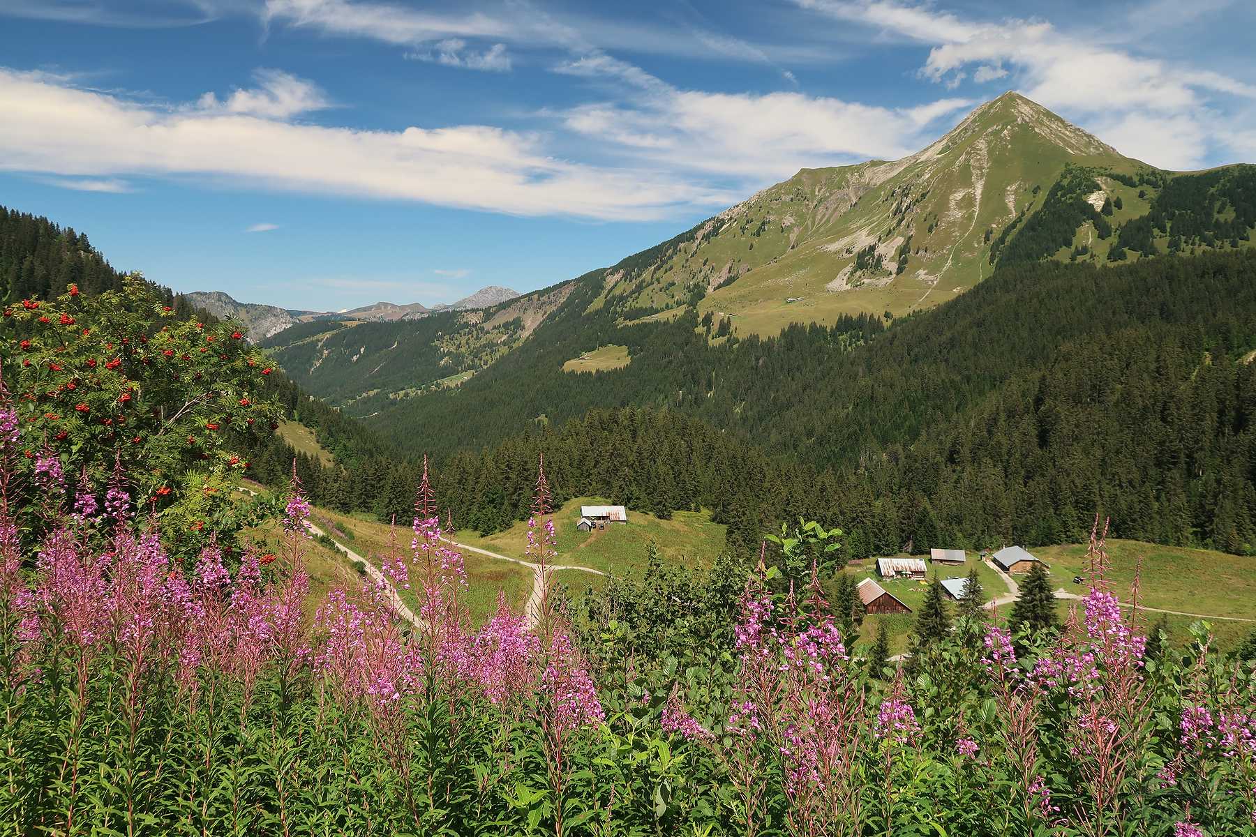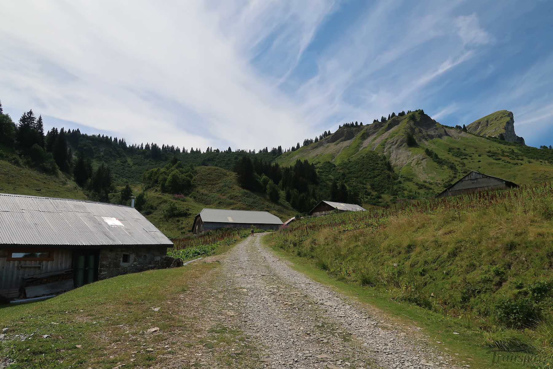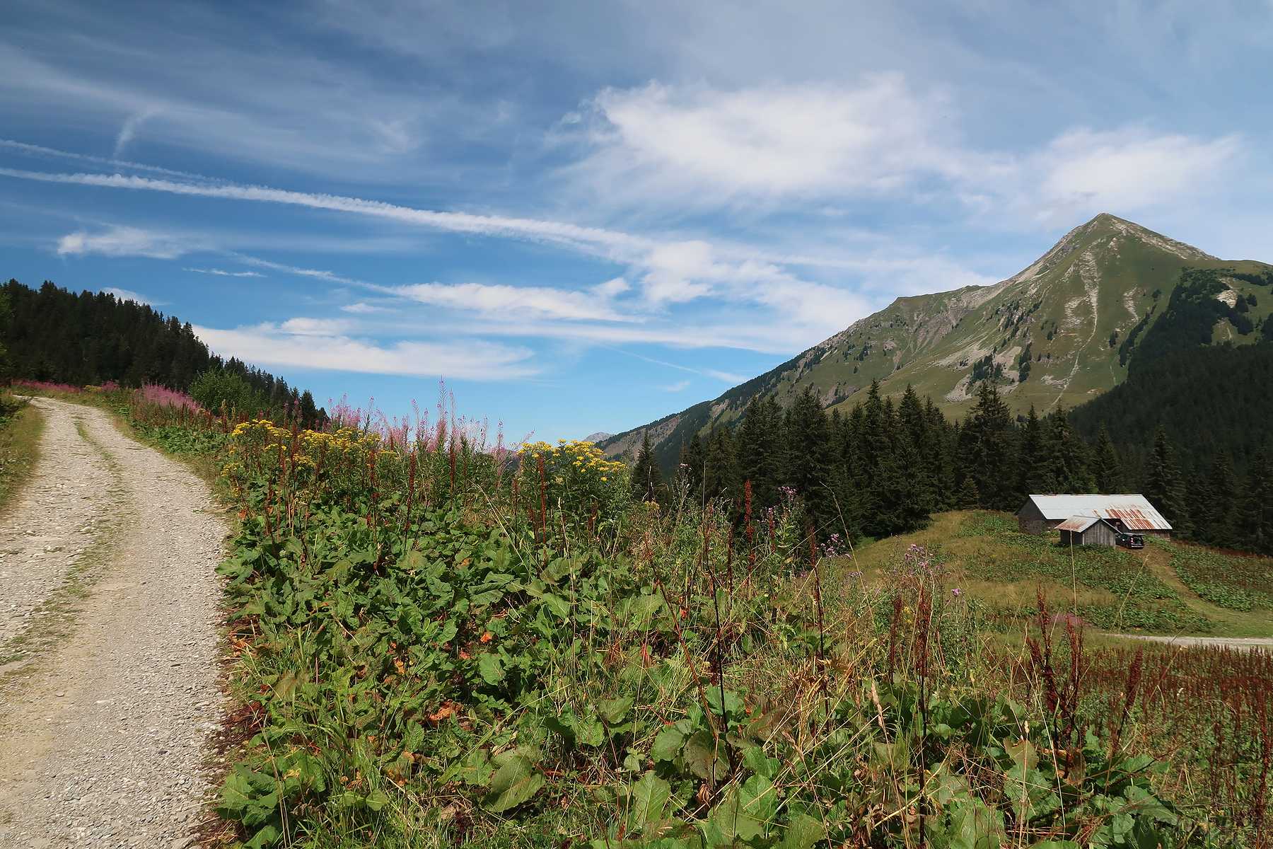 Je ne fais pas le tour entier du lac des Plagnes, coupant à travers champ par une courte section raide. Je retrouve la route d’alpage pour les chalets de Lens. C’est tranquille avec un peu de monde et quelques voitures qui montent. La vue s’ouvre parmi les trouées sur le Mont de Grange. Superbe. La route est tranquille avec bien des épilobes à feuilles étroites. J’arrive dans le bas des chalets de Lens et toujours par la route arrive aux chalets de Lens du haut. Joli cadre avec cet envoûtant Mont de Grange. De là il serait possible de directement filer au refuge des Tinderets, mais je poursuis.