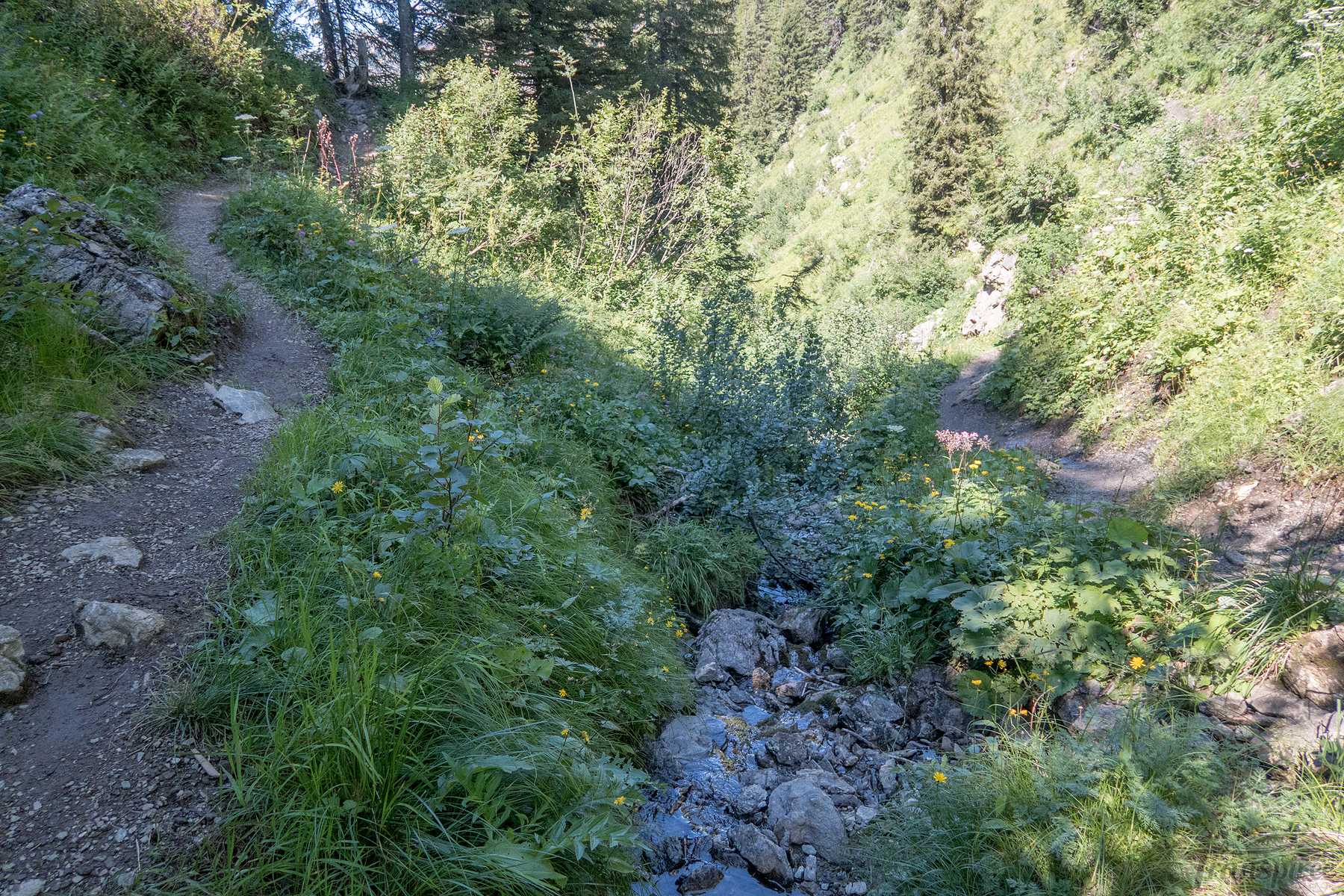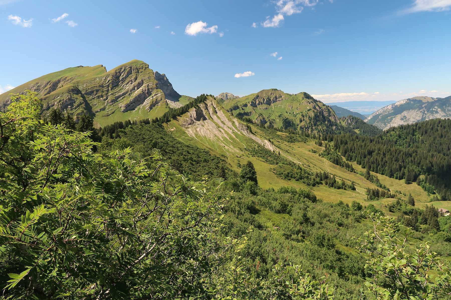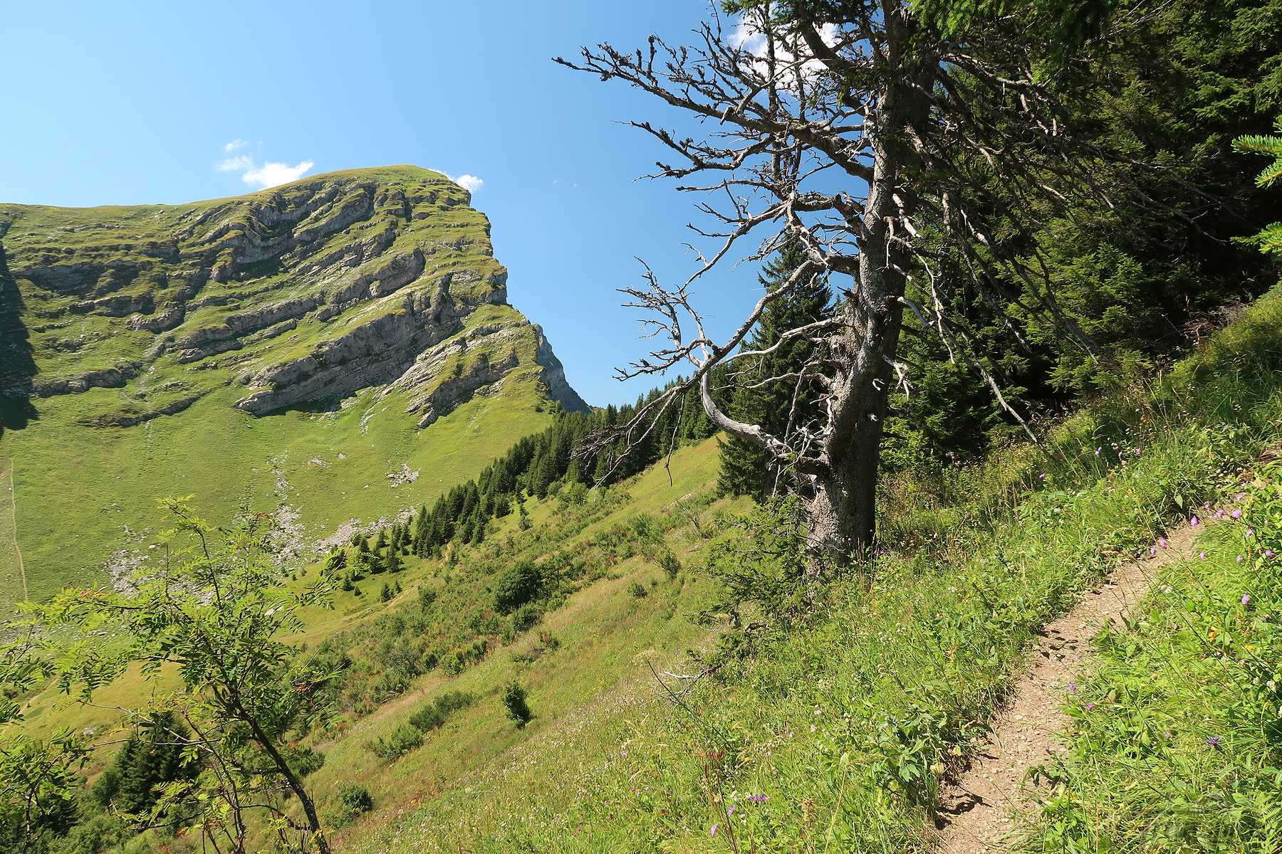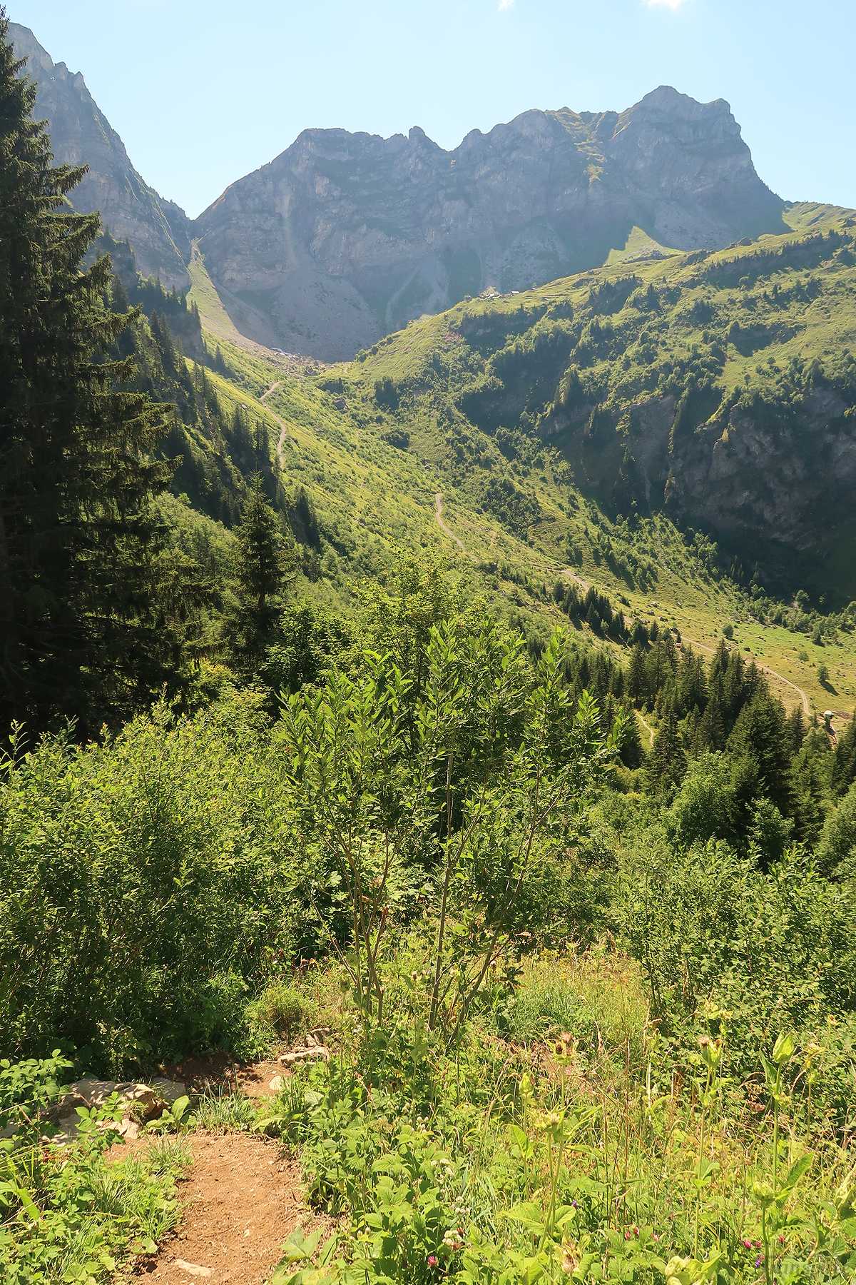 Je descends par un débonnaire dégagé. Puis il s’enfonce en forêt avec une section raide, parmi des racines et aiguilles d’épicéa. La gravité me rappelle à l’ordre, je suis tombé par terre c’est la faute à Voltaire. Le sentier traverse un ruisseau puis descend en forêt avec des trouées. Cela permet de voir les chalets d’Ardens et la Pointe d’Ardens. Joli.