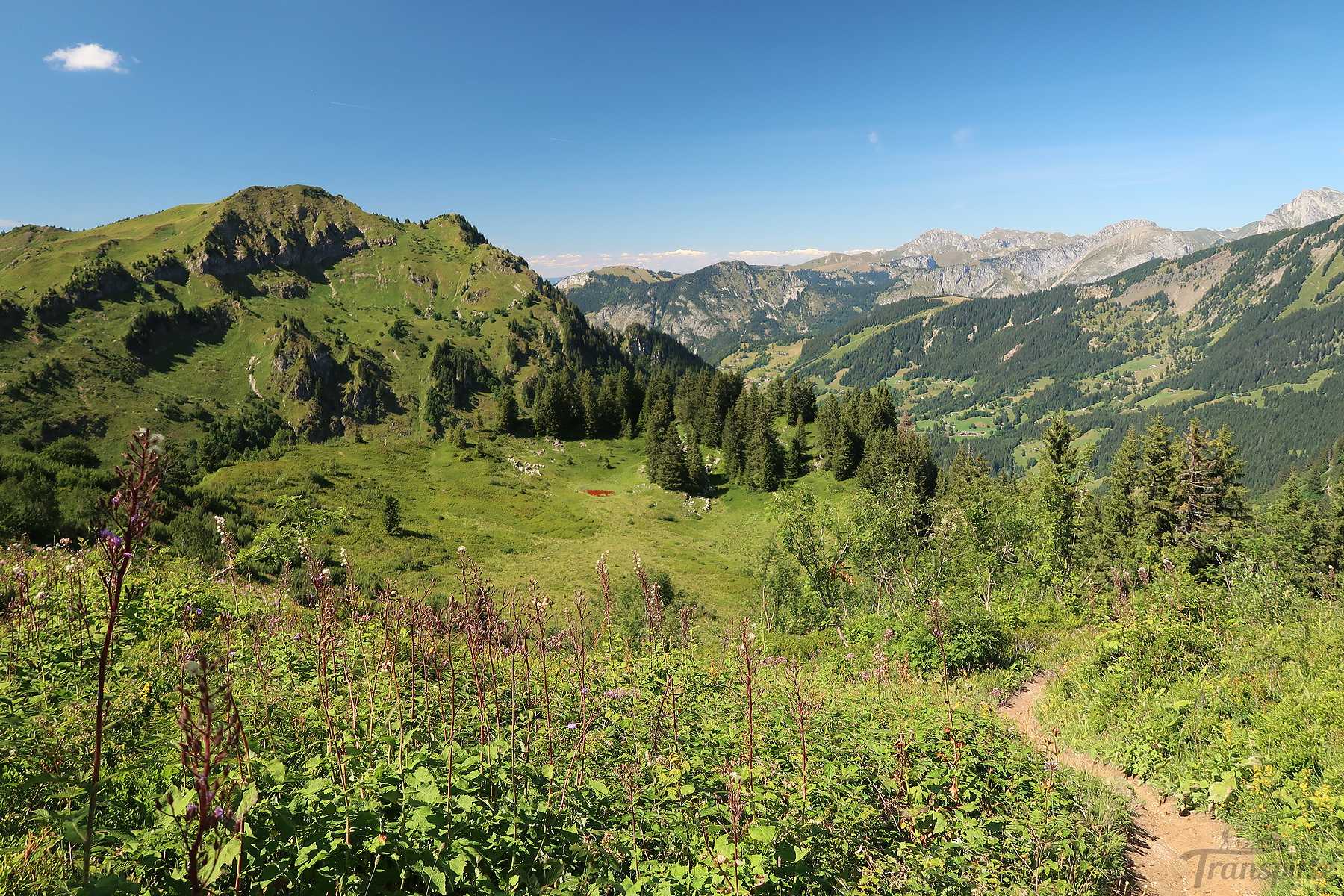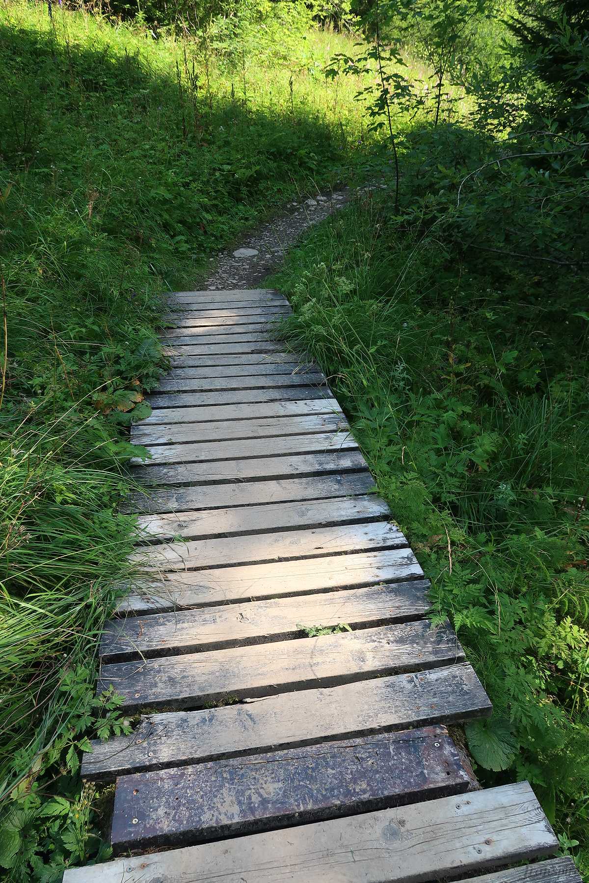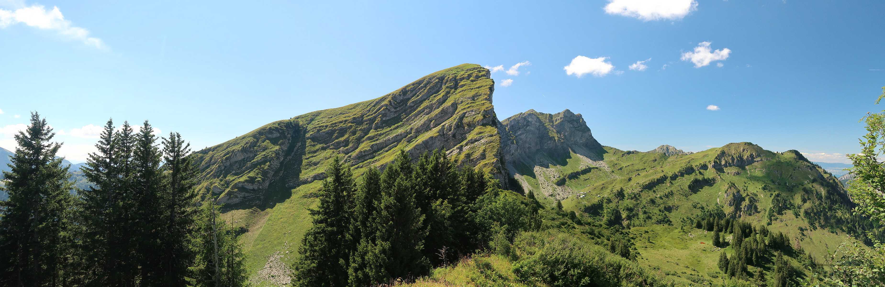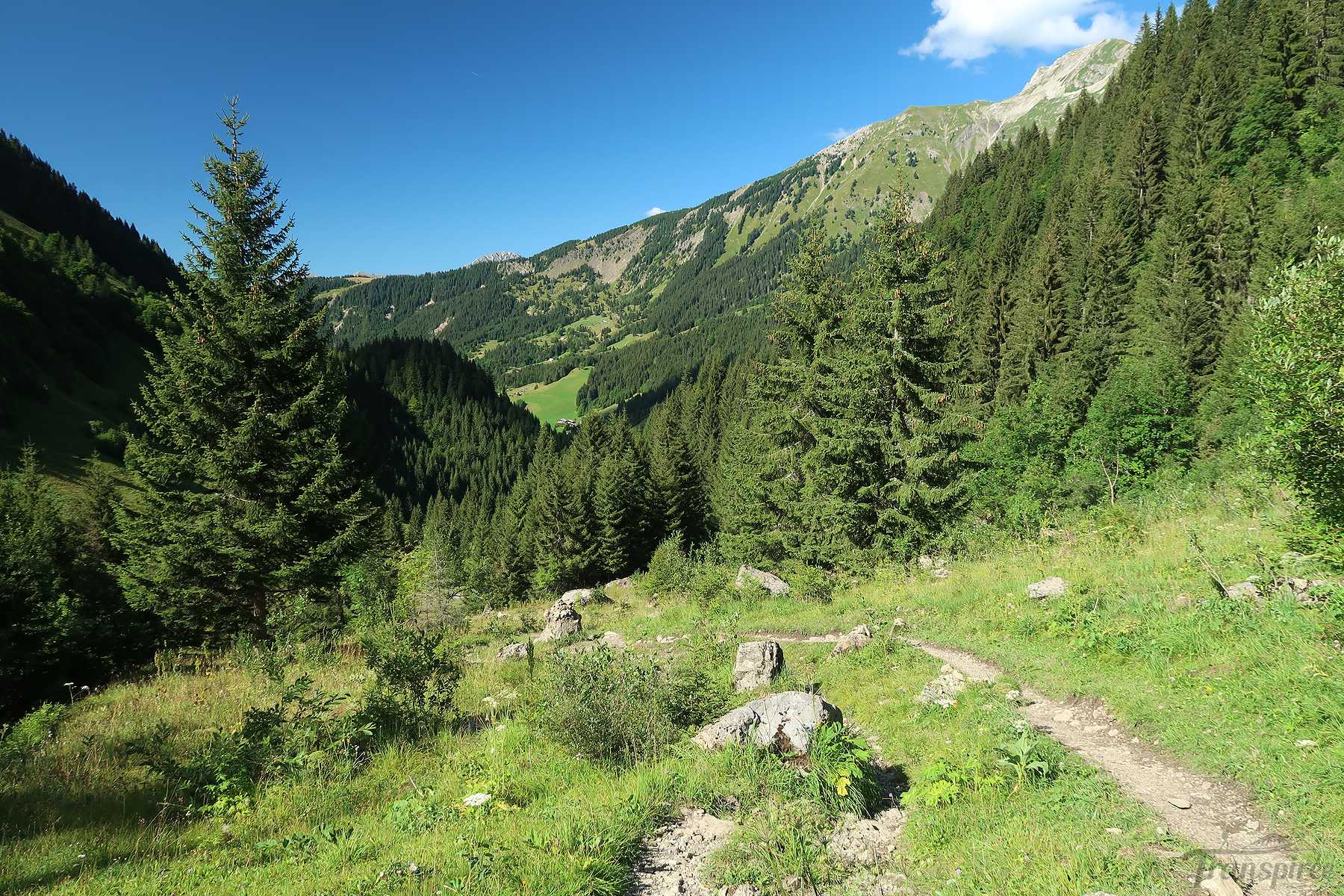 Je descends par un débonnaire dégagé. Puis il s’enfonce en forêt avec une section raide, parmi des racines et aiguilles d’épicéa. La gravité me rappelle à l’ordre, je suis tombé par terre c’est la faute à Voltaire. Le sentier traverse un ruisseau puis descend en forêt avec des trouées. Cela permet de voir les chalets d’Ardens et la Pointe d’Ardens. Joli.