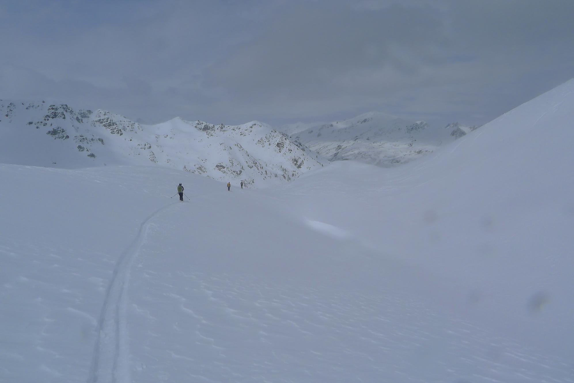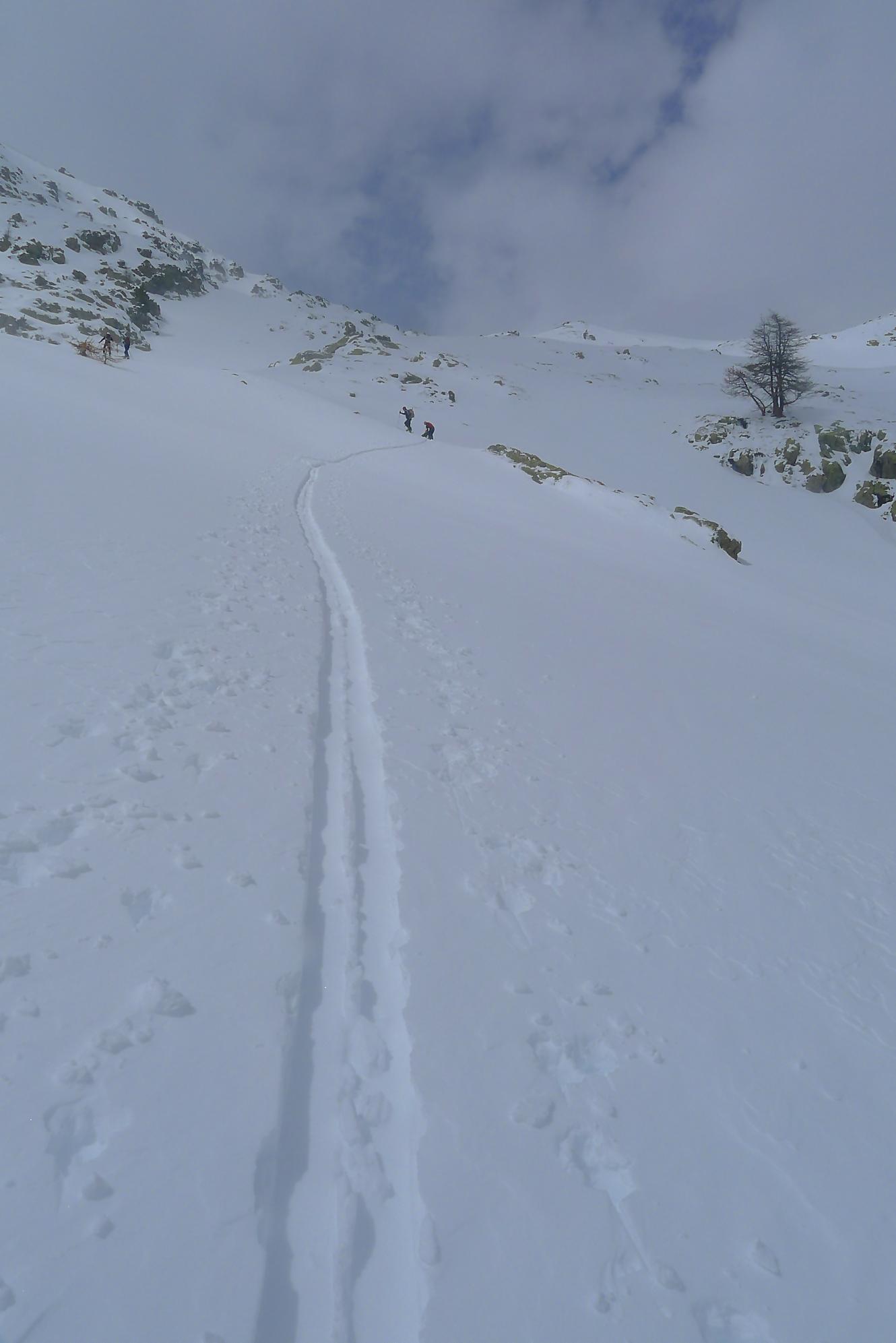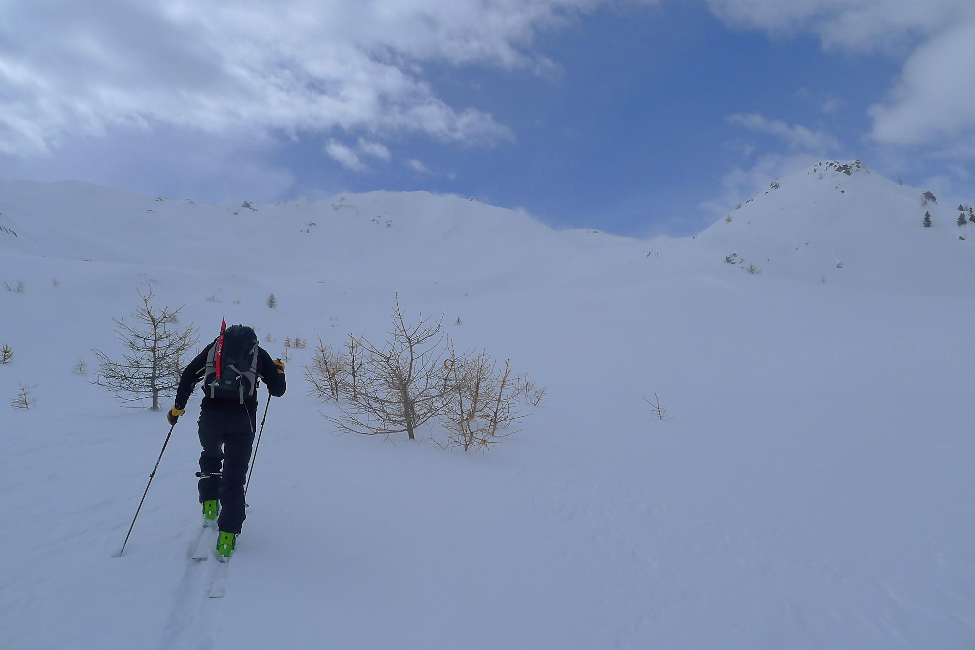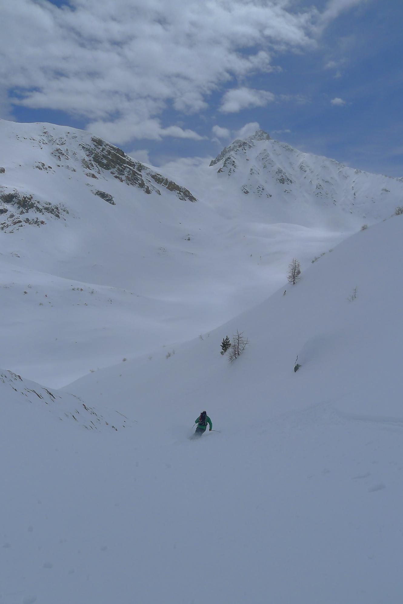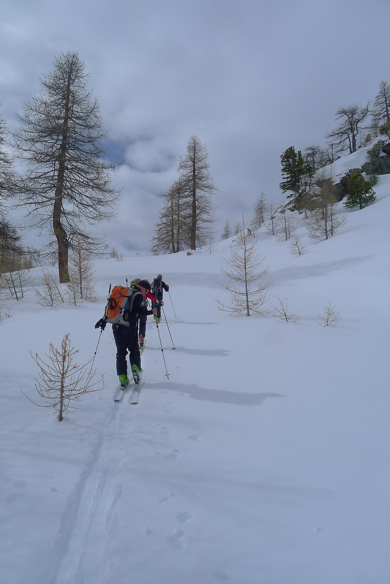 Nous remettons les peaux au Pt2232 et partons par une forêt clairsemée vers le Pic du Longet. Une fois la forêt dépassée, nous remontons par des pentes régulières, une poudreuse sur fond offrant parfois peu d’accroche. J’observais et questionnait le guide sur le choix de telle pente plutôt que telle autre, profitant de son expérience pour enrichir la mienne. Nous arrivons sur la jolie crête et filons vers le sommet du Pic du Longet (2573m), affublé d’un vieux tronc et d’un cairn. Un vent assez fort (environ 50 km/h), nous fait quitter les lieux assez rapidement et descendons par de jolies pentes poudreuses vers le Pt2300 du Torrent de l’Oule. Nous remettons les peaux et profitons d’une mini pause casse-croute. Vu le vent, ça n’est que 5 min. Le ciel se couvre.