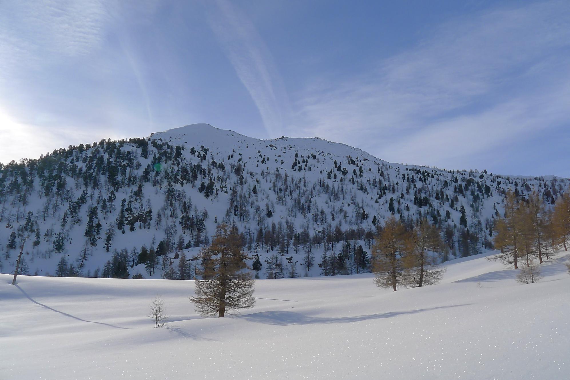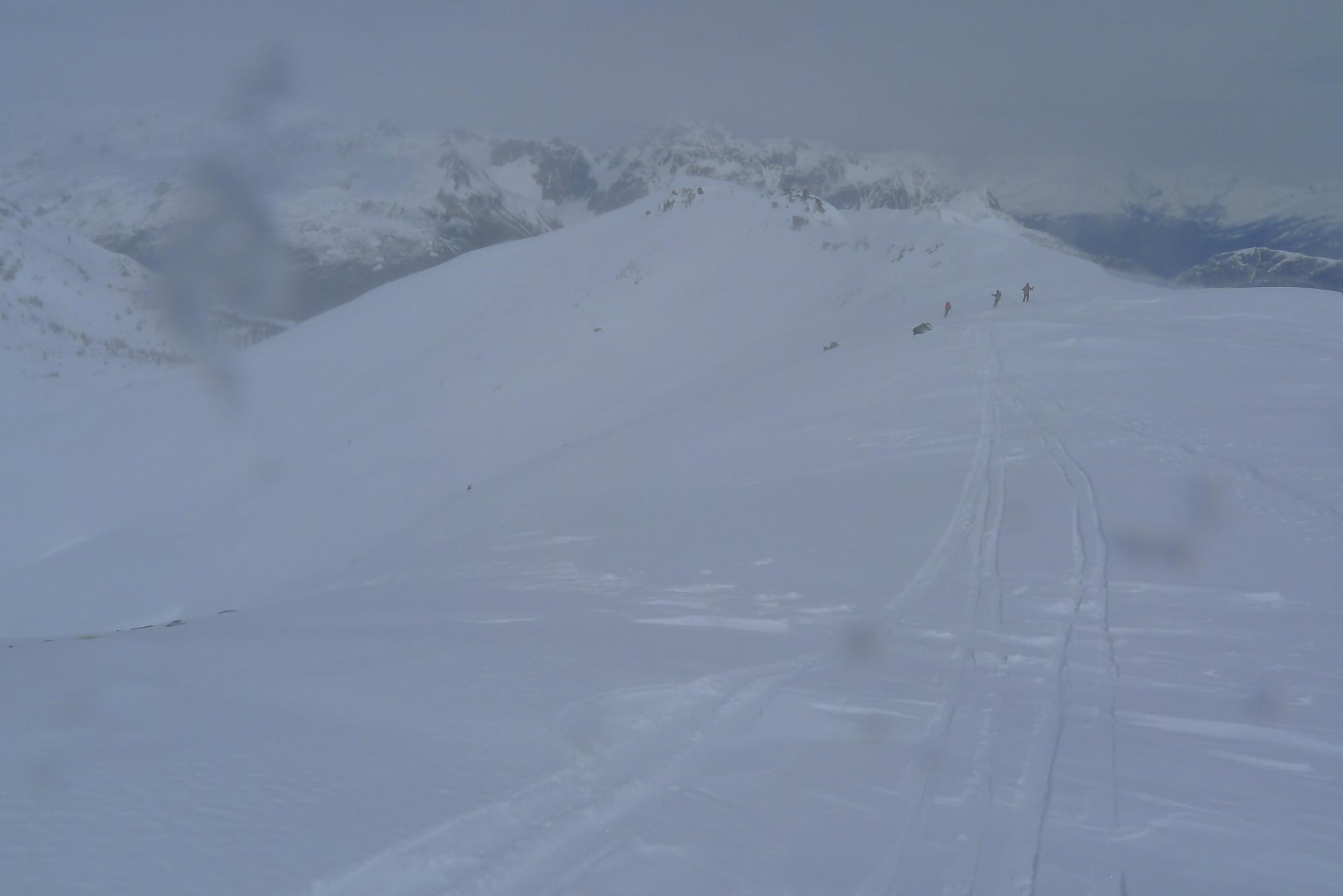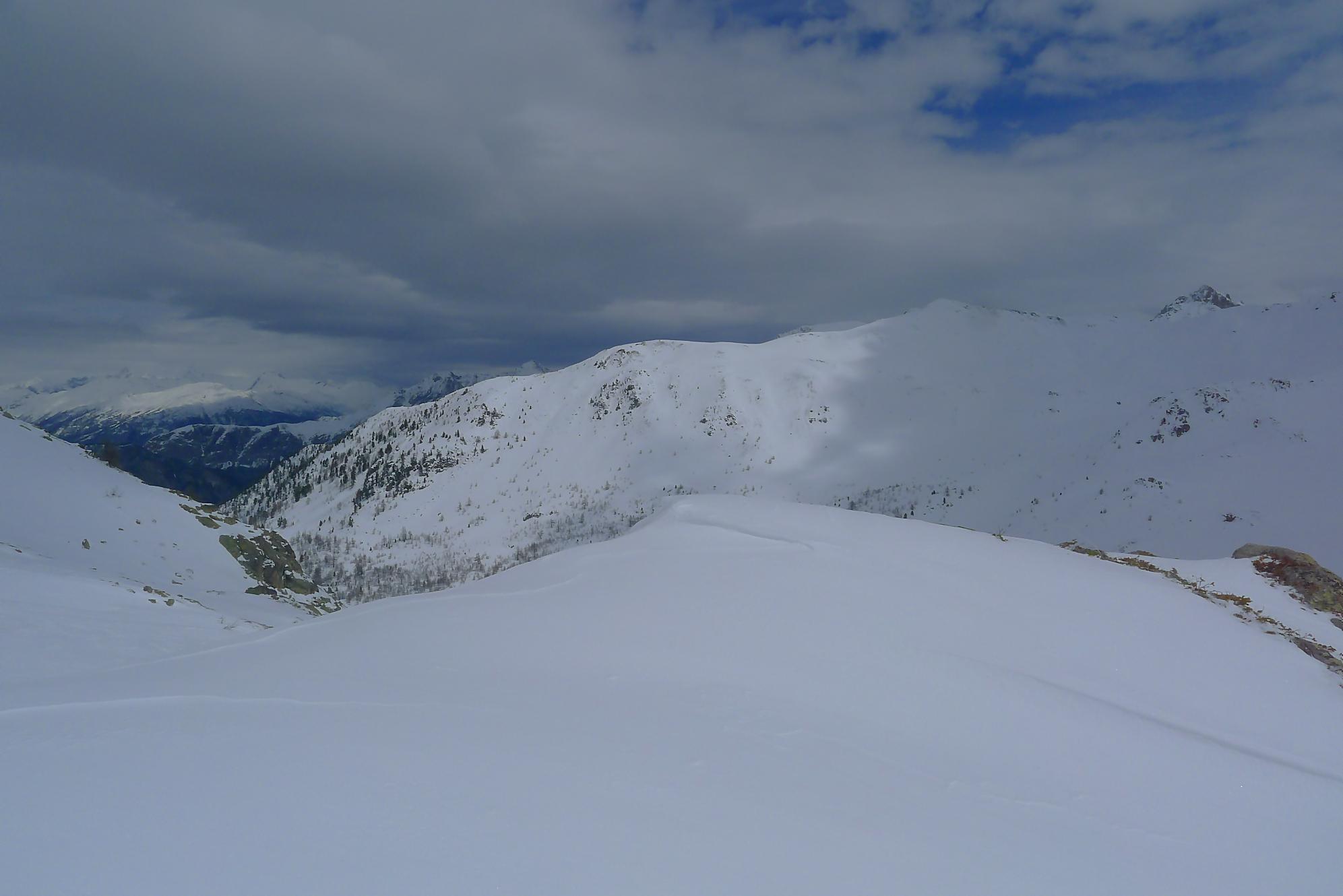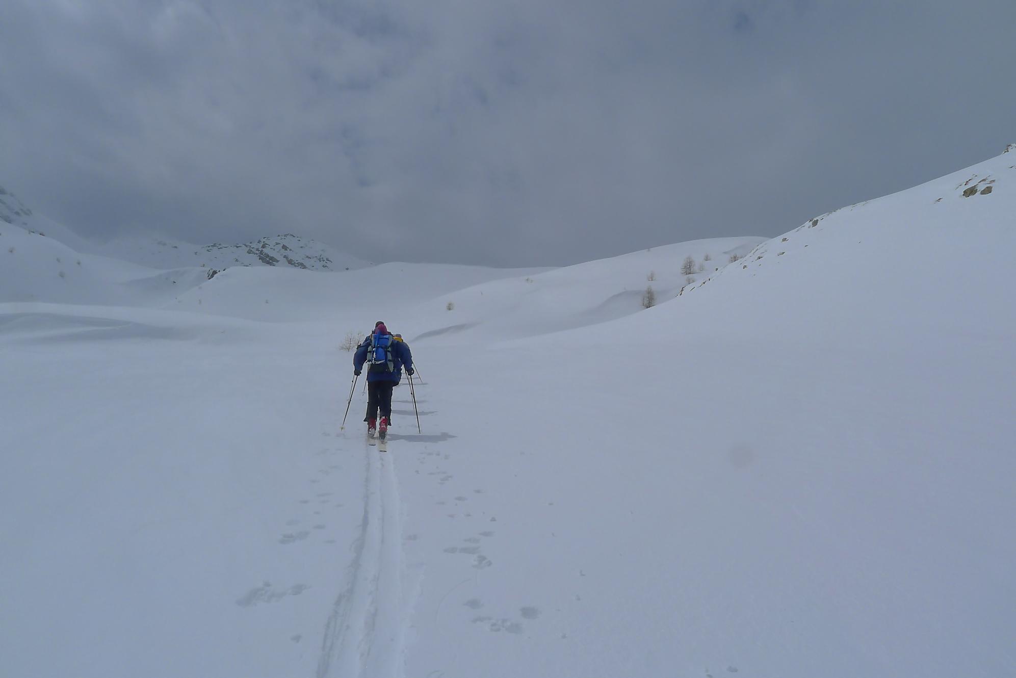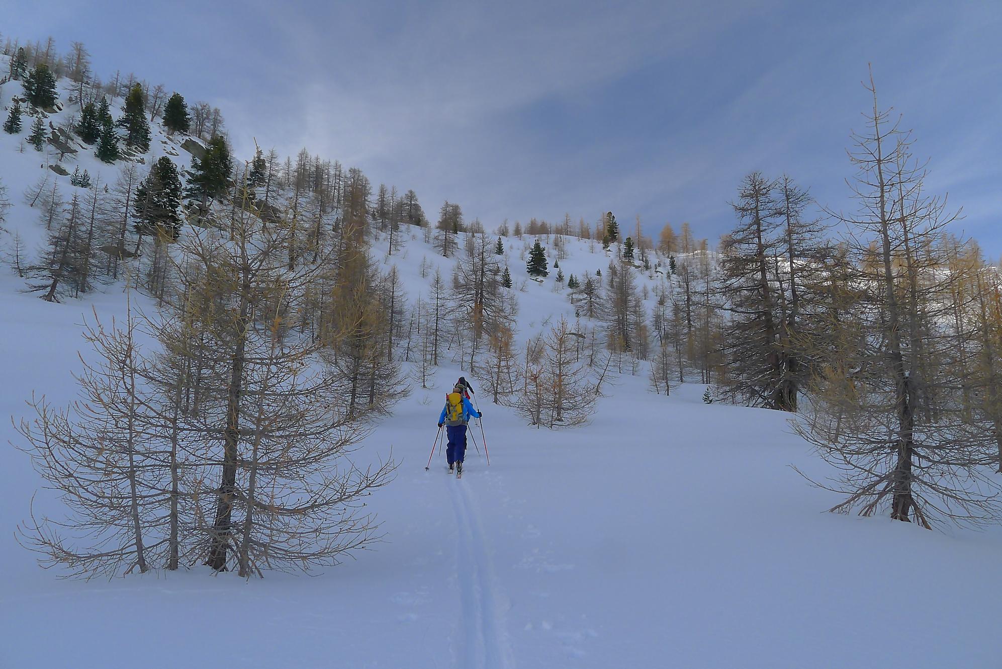 Nous remettons les peaux au Pt2232 et partons par une forêt clairsemée vers le Pic du Longet. Une fois la forêt dépassée, nous remontons par des pentes régulières, une poudreuse sur fond offrant parfois peu d’accroche. J’observais et questionnait le guide sur le choix de telle pente plutôt que telle autre, profitant de son expérience pour enrichir la mienne. Nous arrivons sur la jolie crête et filons vers le sommet du Pic du Longet (2573m), affublé d’un vieux tronc et d’un cairn. Un vent assez fort (environ 50 km/h), nous fait quitter les lieux assez rapidement et descendons par de jolies pentes poudreuses vers le Pt2300 du Torrent de l’Oule. Nous remettons les peaux et profitons d’une mini pause casse-croute. Vu le vent, ça n’est que 5 min. Le ciel se couvre.