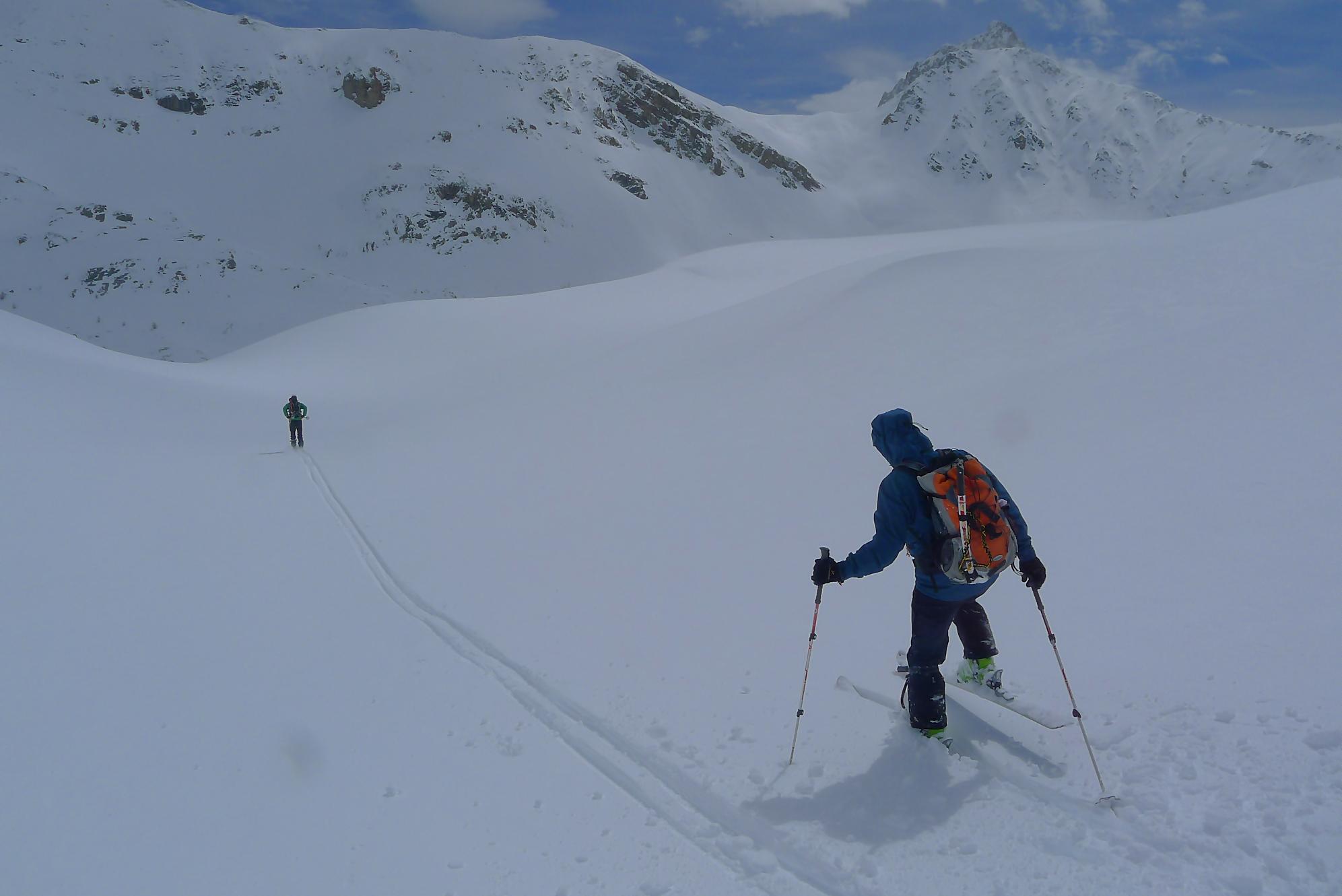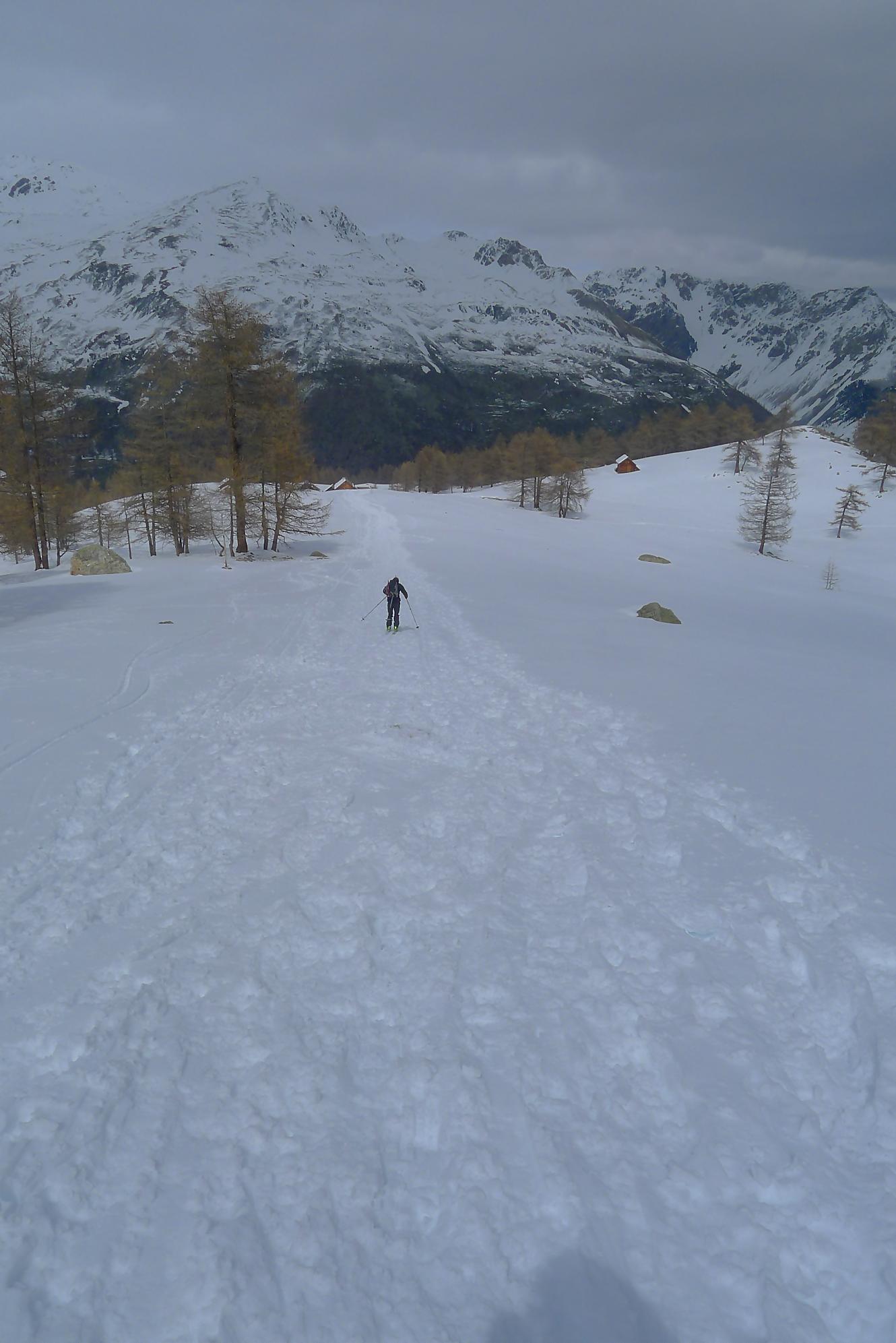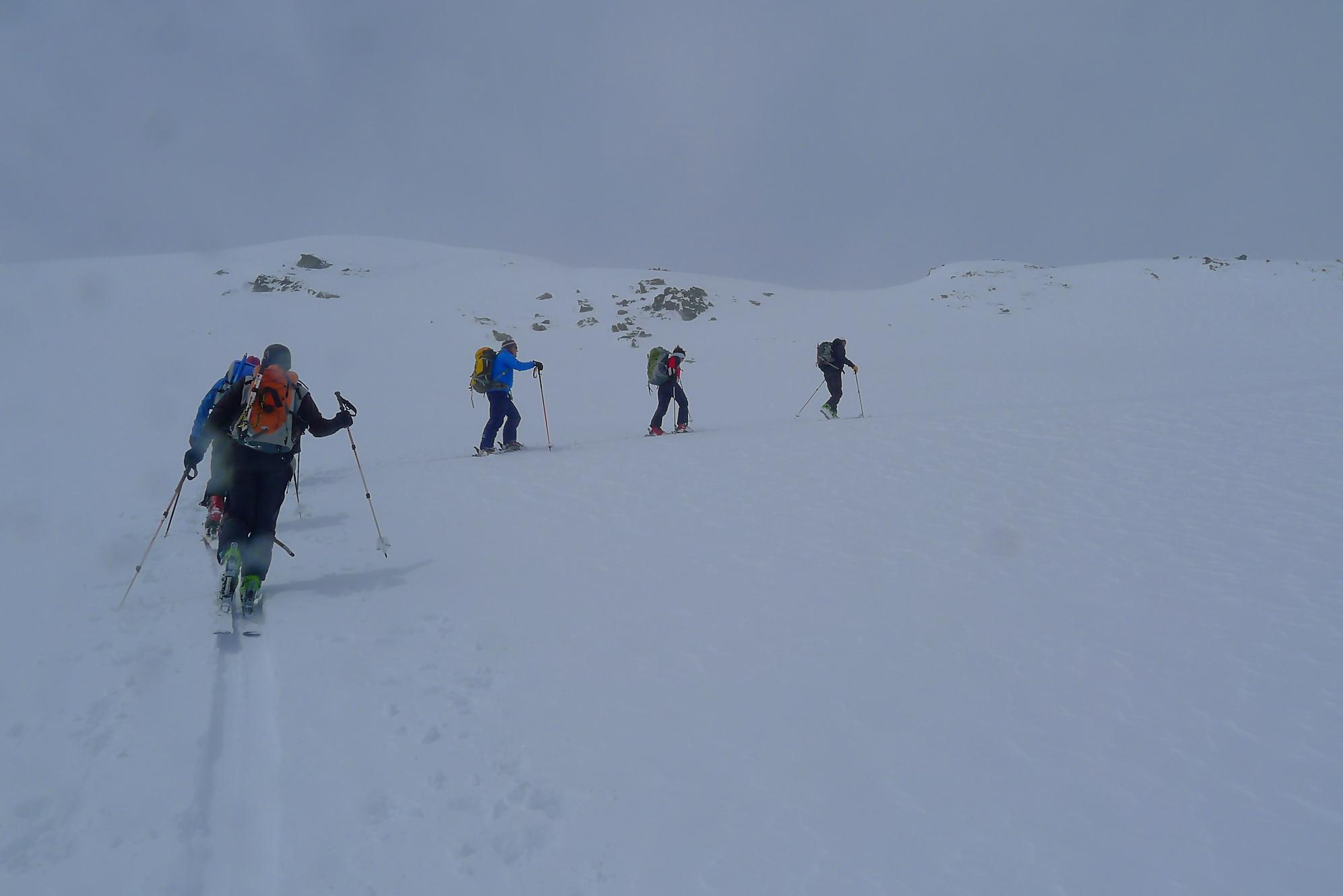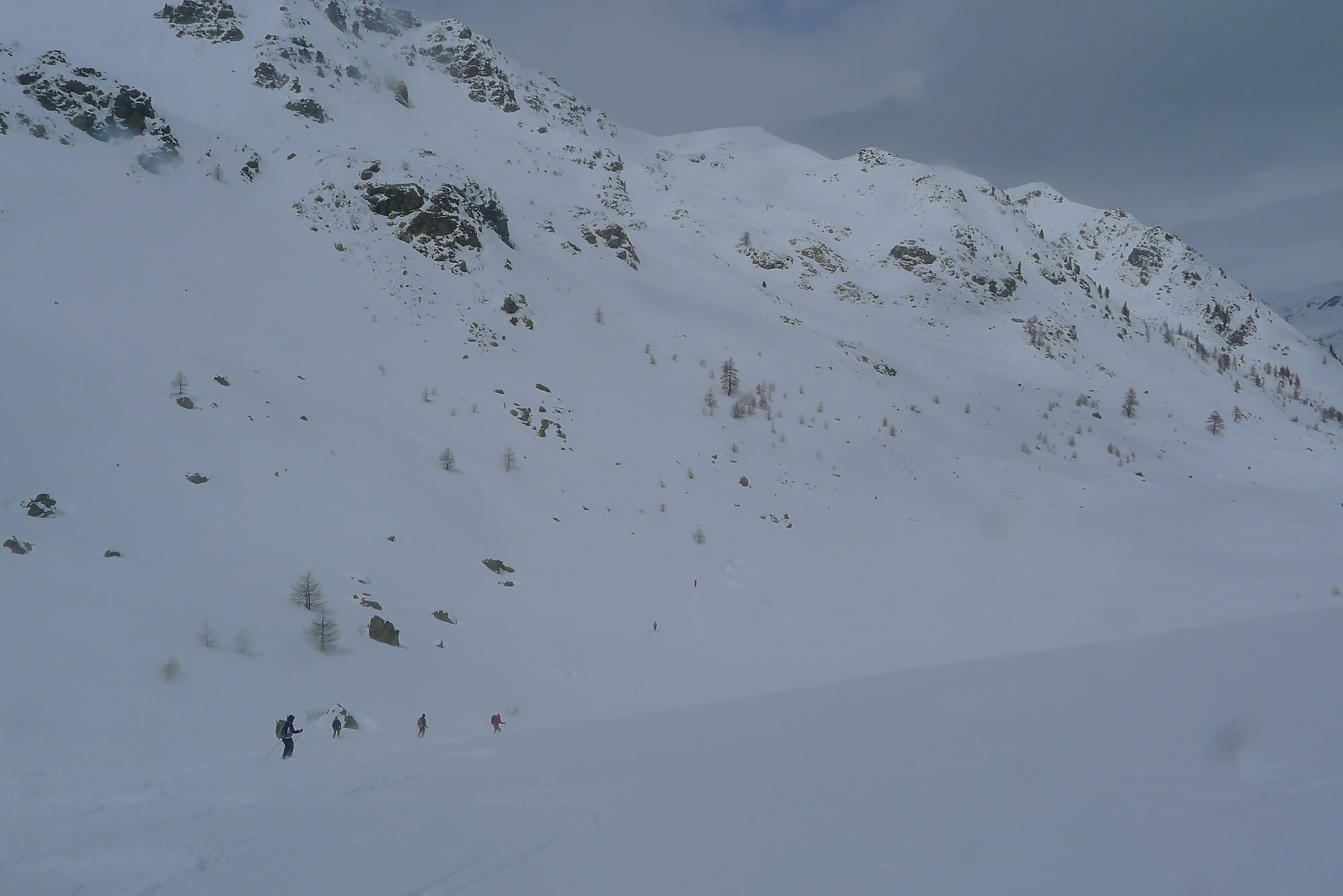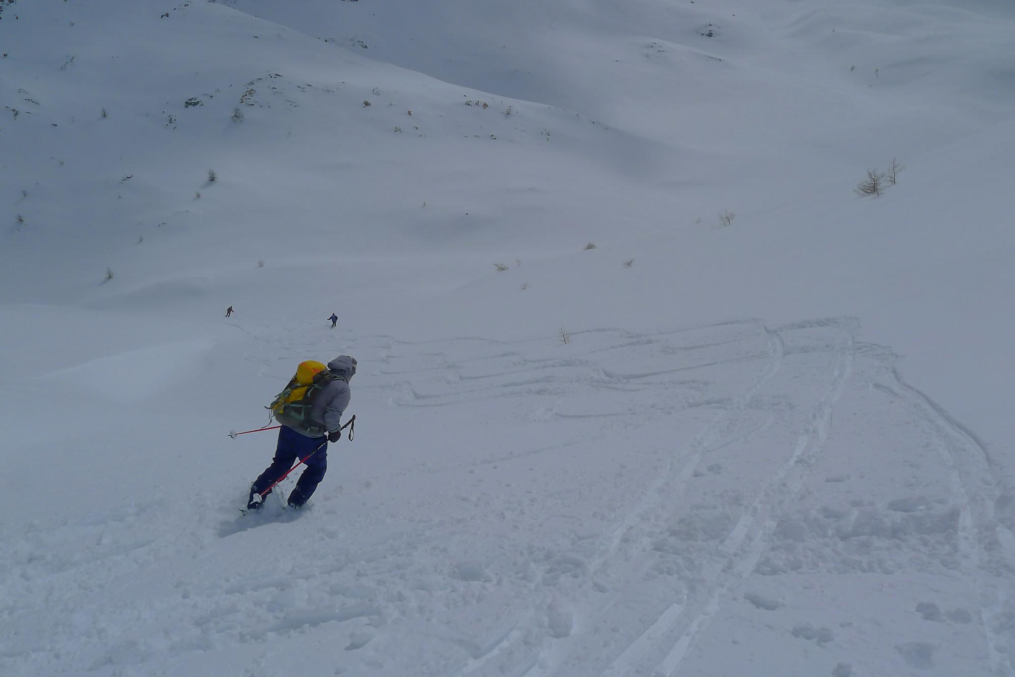 Nous remettons les peaux au Pt2232 et partons par une forêt clairsemée vers le Pic du Longet. Une fois la forêt dépassée, nous remontons par des pentes régulières, une poudreuse sur fond offrant parfois peu d’accroche. J’observais et questionnait le guide sur le choix de telle pente plutôt que telle autre, profitant de son expérience pour enrichir la mienne. Nous arrivons sur la jolie crête et filons vers le sommet du Pic du Longet (2573m), affublé d’un vieux tronc et d’un cairn. Un vent assez fort (environ 50 km/h), nous fait quitter les lieux assez rapidement et descendons par de jolies pentes poudreuses vers le Pt2300 du Torrent de l’Oule. Nous remettons les peaux et profitons d’une mini pause casse-croute. Vu le vent, ça n’est que 5 min. Le ciel se couvre.