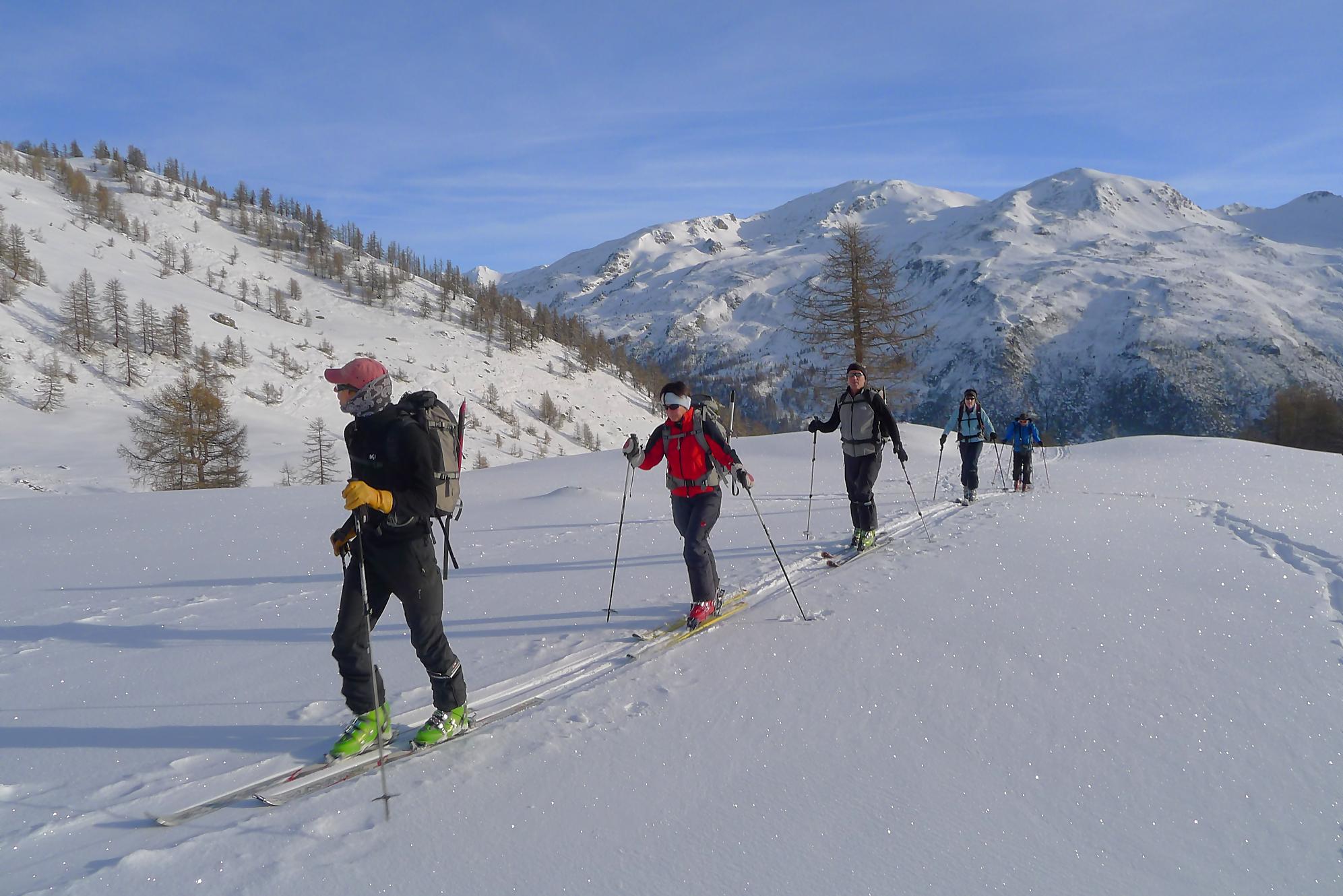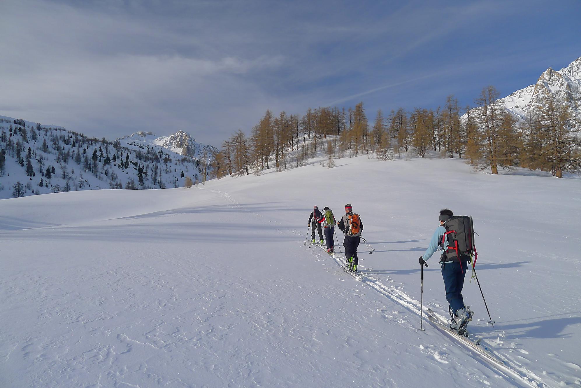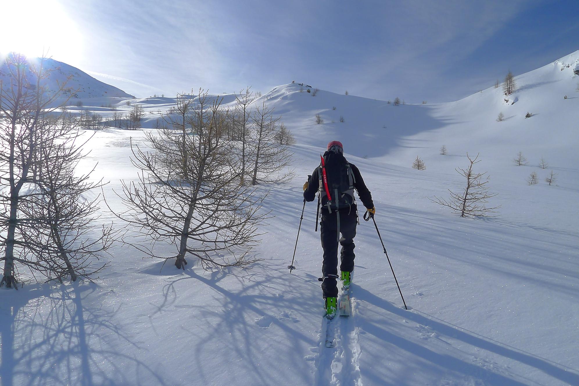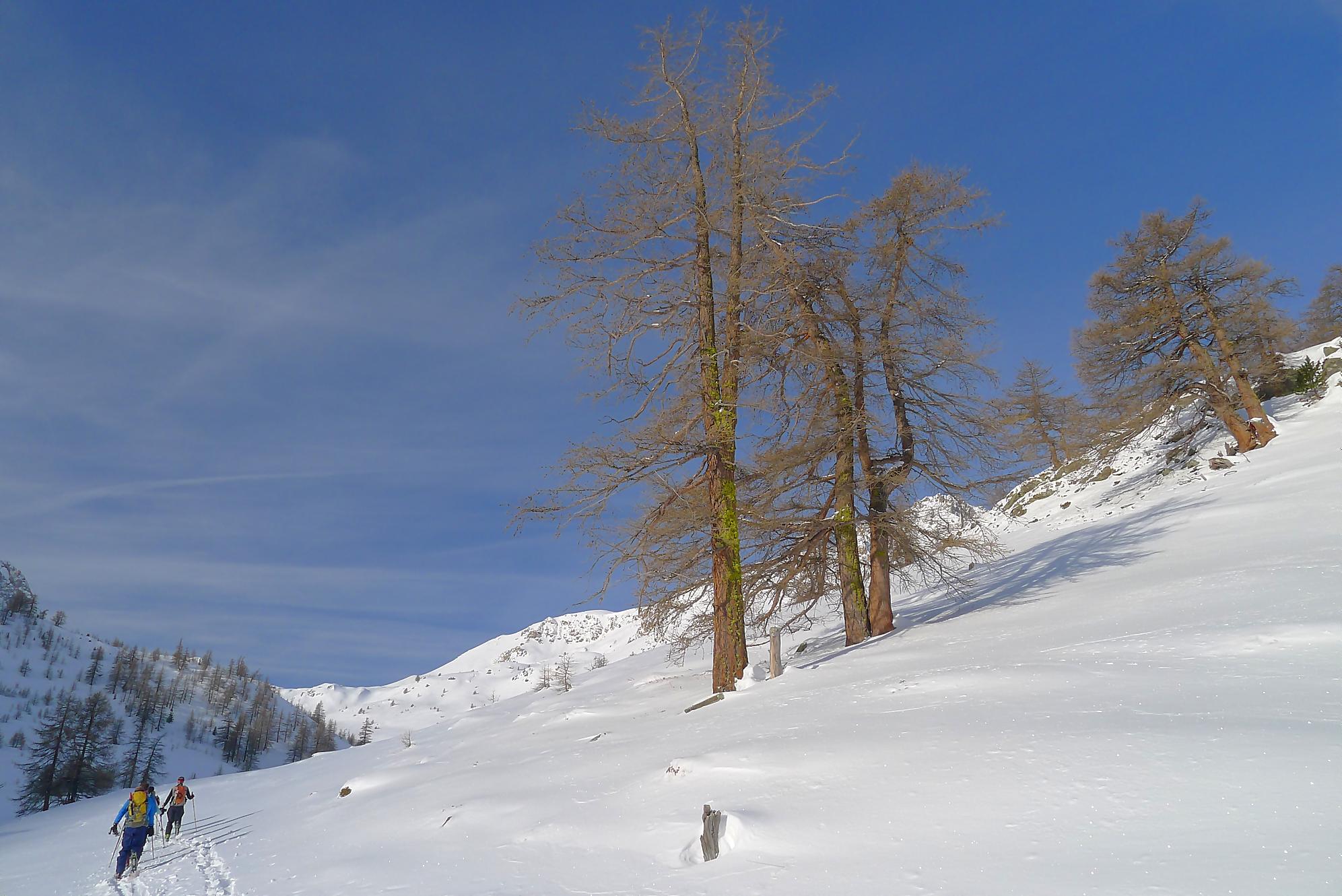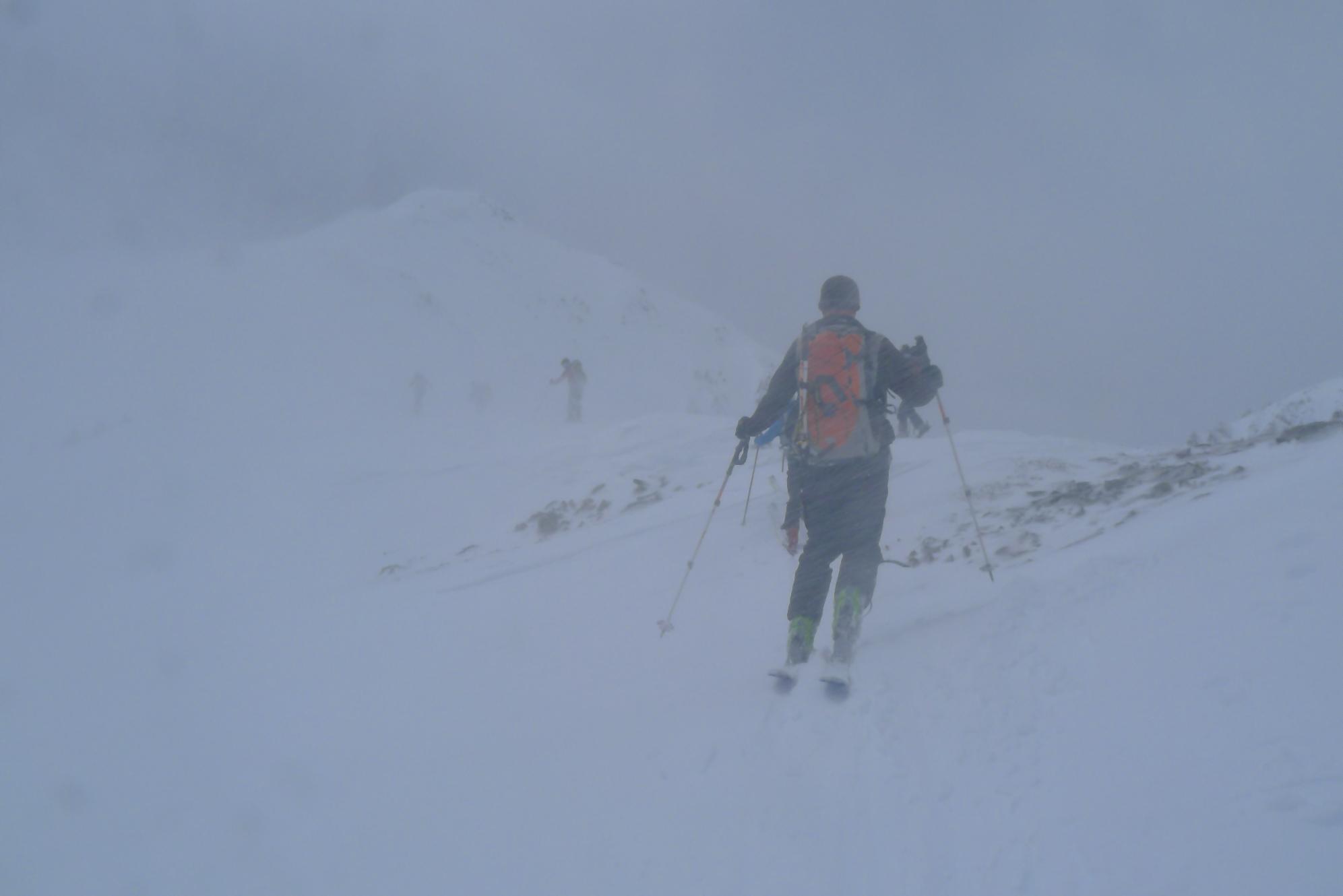 Nous remettons les peaux au Pt2232 et partons par une forêt clairsemée vers le Pic du Longet. Une fois la forêt dépassée, nous remontons par des pentes régulières, une poudreuse sur fond offrant parfois peu d’accroche. J’observais et questionnait le guide sur le choix de telle pente plutôt que telle autre, profitant de son expérience pour enrichir la mienne. Nous arrivons sur la jolie crête et filons vers le sommet du Pic du Longet (2573m), affublé d’un vieux tronc et d’un cairn. Un vent assez fort (environ 50 km/h), nous fait quitter les lieux assez rapidement et descendons par de jolies pentes poudreuses vers le Pt2300 du Torrent de l’Oule. Nous remettons les peaux et profitons d’une mini pause casse-croute. Vu le vent, ça n’est que 5 min. Le ciel se couvre.