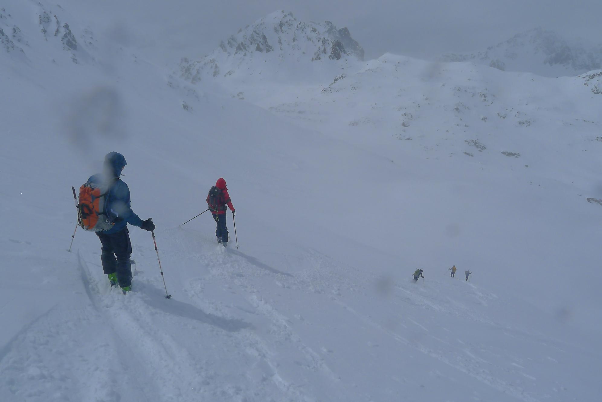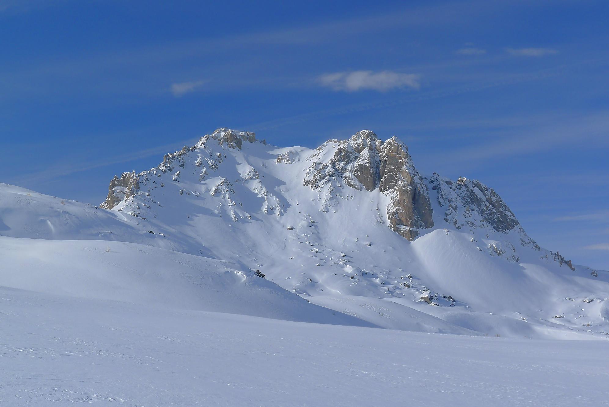 De là nous partons en diagonale SO vers une antécime du Pic Gardiol, le Pt2608. Sur la carte que venait d’achetet le guide, une cabane est mentionnée sous le Col de l’Oule, sur celle de geoportail.fr, elle est remplacée par Rnes et la cabane est indiquée plus au N (c’est plus juste). Nous arrivons au Pt2608, accueille par un fort vent (environ 80 km/h), cela pique nos joues et me fait pleurer (non pas de joie !). Nous longeons la crête jusque vers le Pt2803. La pente NO ne parait pas skiable, vu le danger d’avalanche et nous revenons sur nos pas pour descendre la pente NO sous le Pt2608, plus douce.