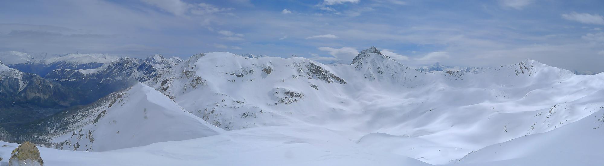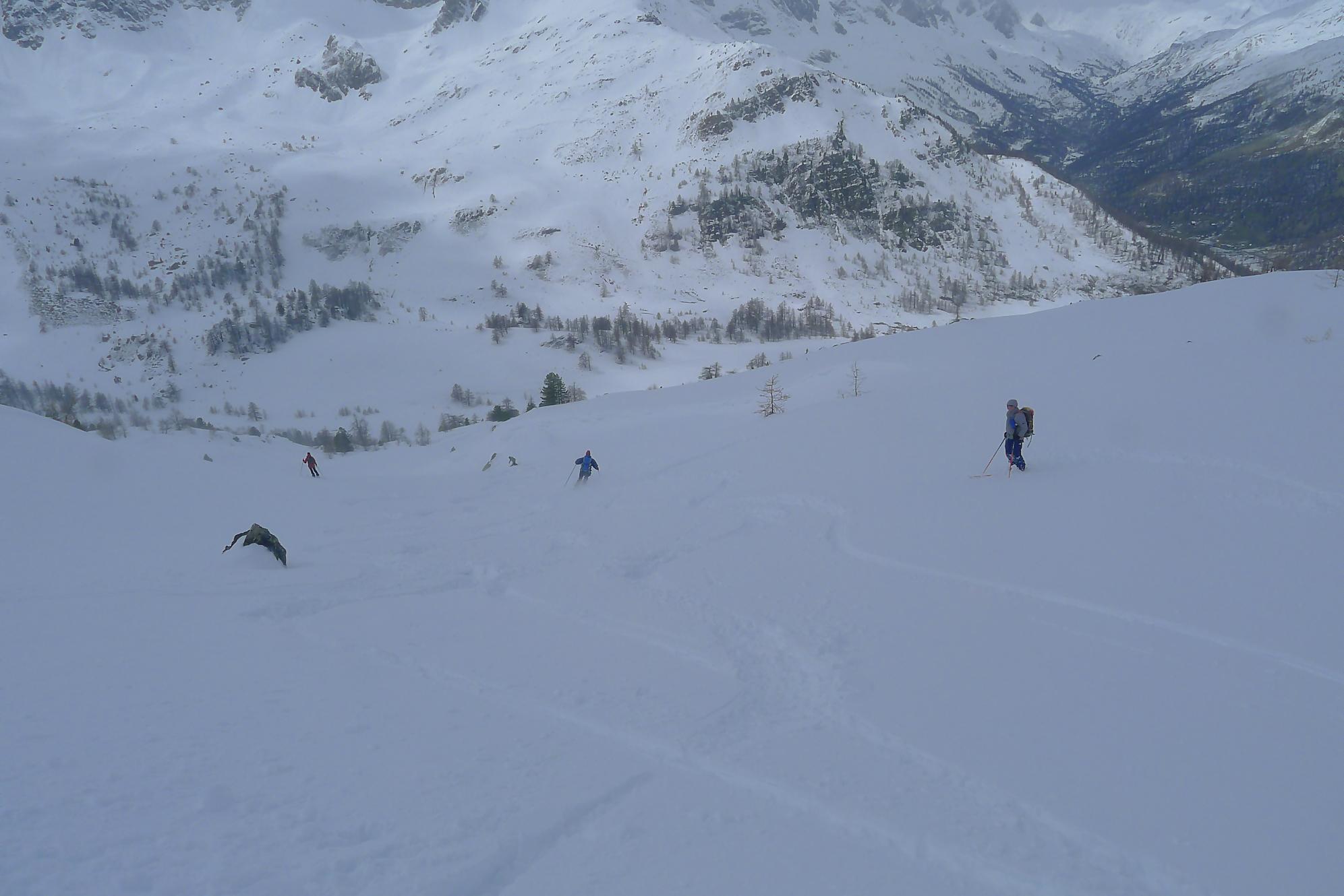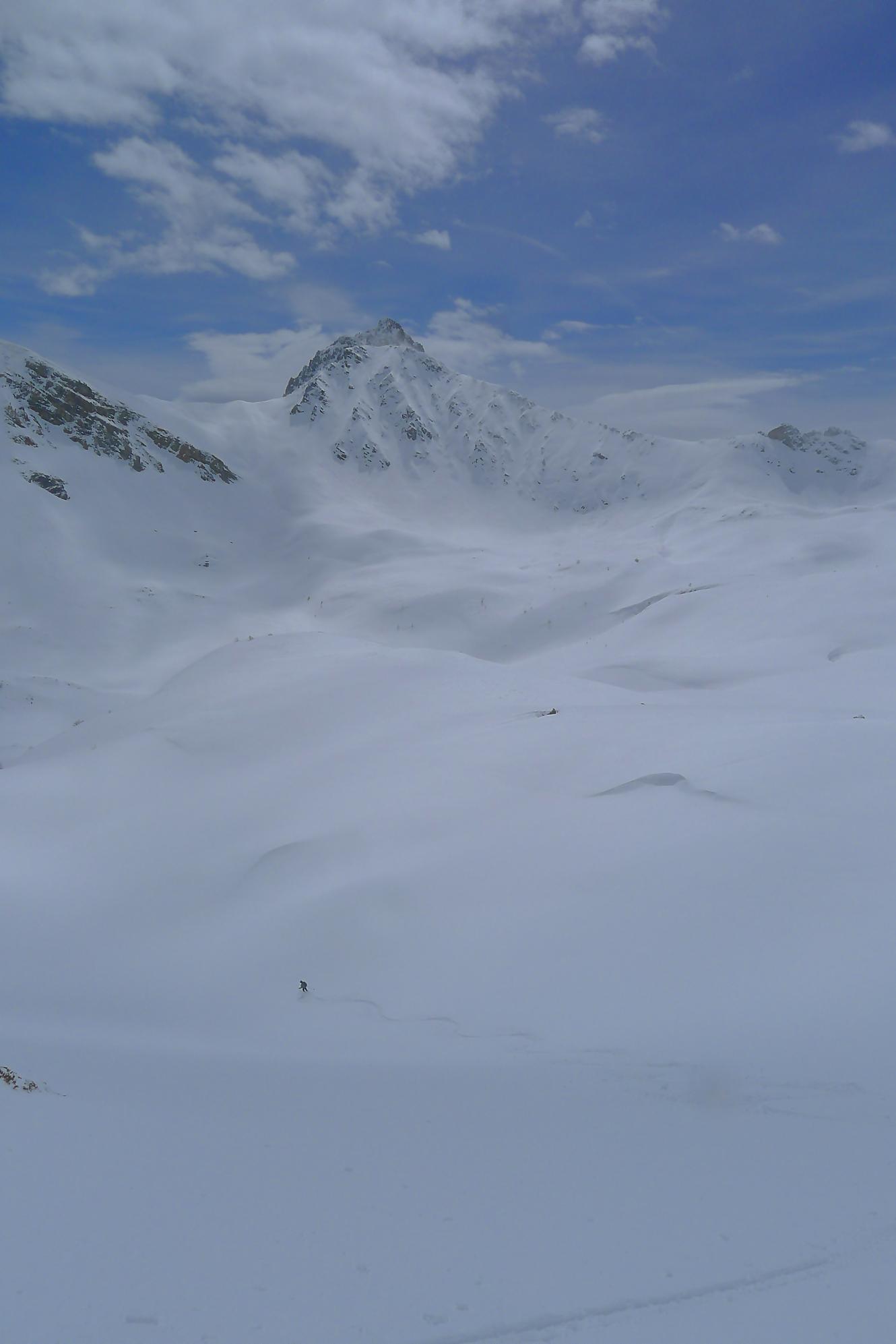 Nous remontons tranquillement le joli vallon du Torrent de Buffère pour bifurquer ensuite sur la gauche pour l’Echaillon (sommet du Pt2576 de la Crête de l’Echaillon sur la carte). Nous atteignons le sommet l’Echaillon (ni croix ni cairn) sans difficulté. Le panorama est superbe et la visibilité est bonne, j’en profite pour les photos panoramiques et ce seront les seules de la journée car le ciel se couvrira dans le courant de la journée. Un petit vent nous rafraichit et nous force à réajuster nos vêtements (une quatrième couche). Nous descendons brièvement dans la face E pour filer dans la face NE. Météo France ne donne plus de bulletin d’avalanche depuis le 19 avril, je ne comprends pas pourquoi cet arrêt si tôt (en Suisse les bulletins régionaux sont aussi terminés, mais il reste le bulletin national presqu’autant détaillé). Donc le danger d’avalanche doit se situer vers 3 et la pente est à 40° (vu qu’il fait -10°c, est-ce que cela fait plus que du 30° ? C’est beau les maths !). Greg le guide, s’en va en tête, tapant du pied dans le sol (ça veut dire que l’heure est grave !) pour tester la solidité du manteau neigeux. Il descend en premier et nous entendons un bruit, puis revoyons le guide suivi peu après d’une coulée qu’il venait de déclencher. On se lance un à un, dans une magnifique poudreuse et arrivons sain et sauf vers le guide.