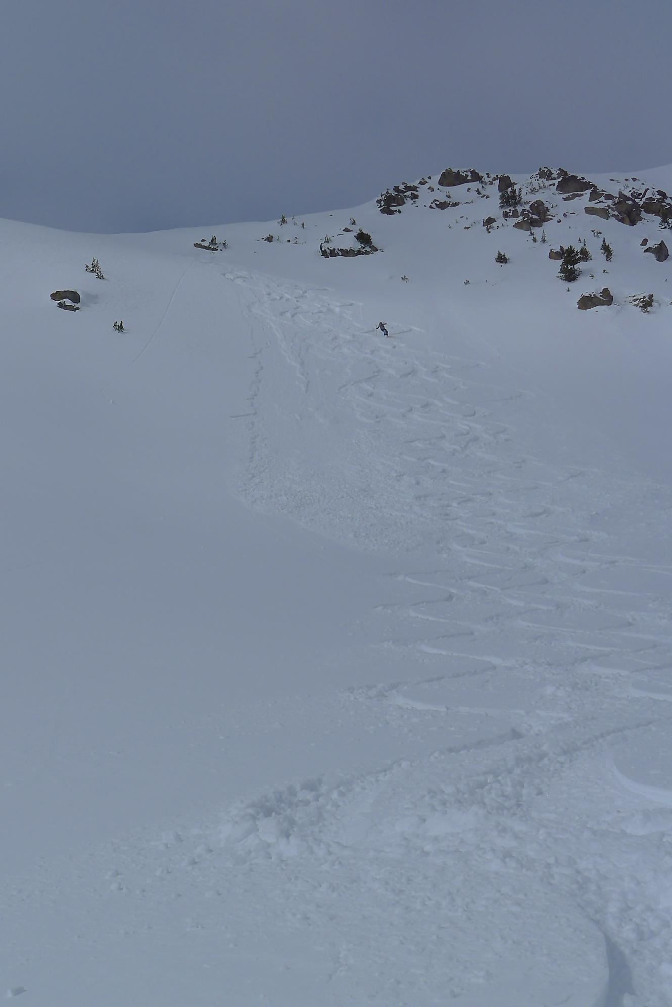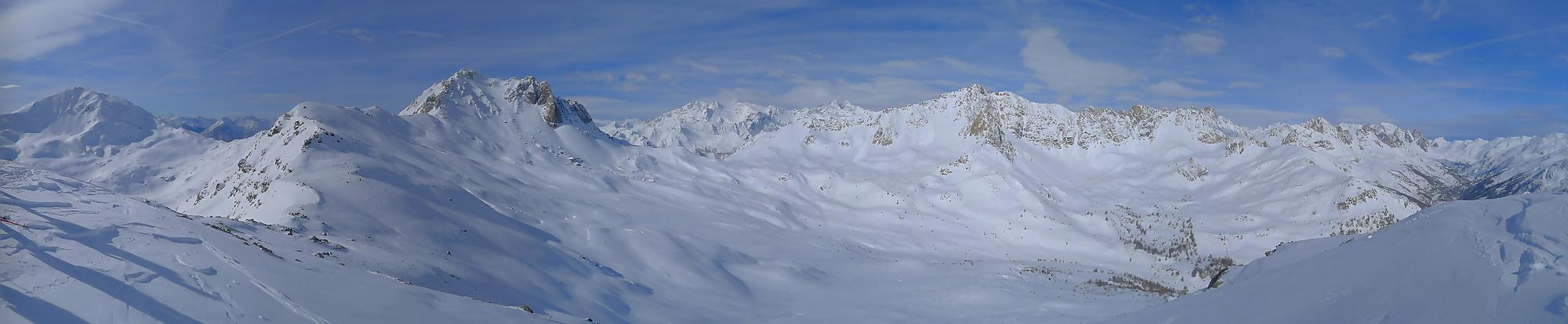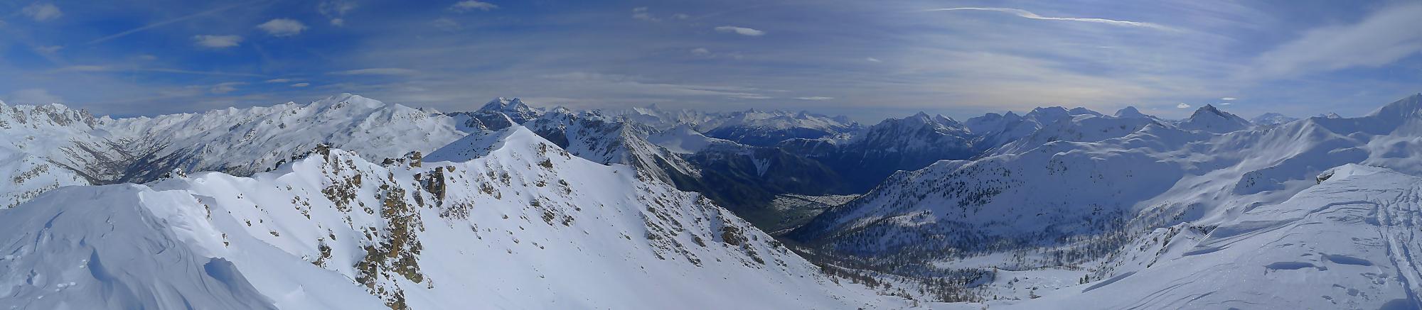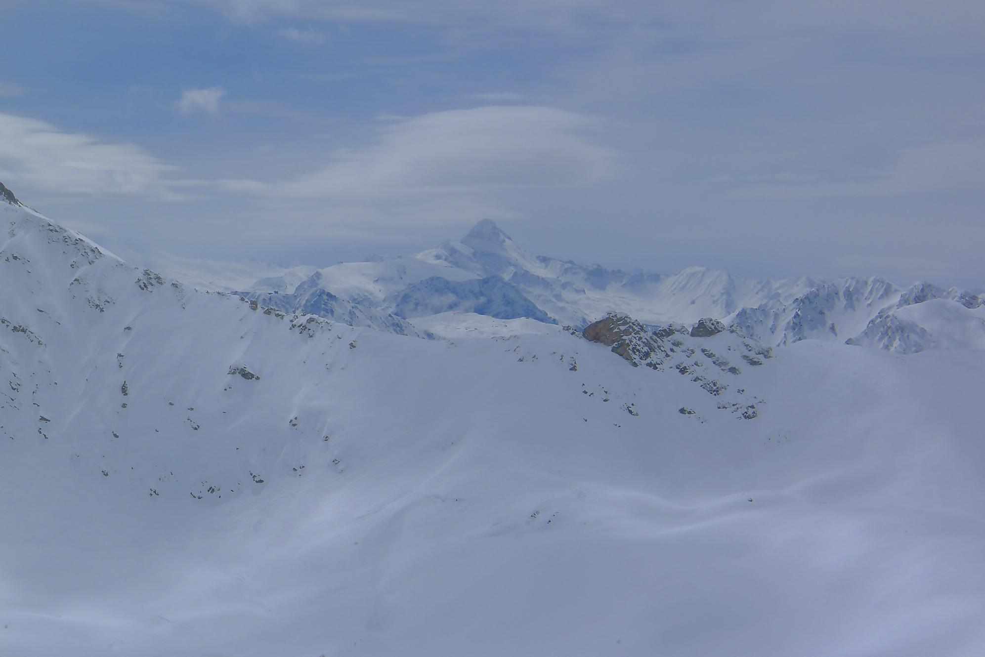Nous remontons tranquillement le joli vallon du Torrent de Buffère pour bifurquer ensuite sur la gauche pour l’Echaillon (sommet du Pt2576 de la Crête de l’Echaillon sur la carte). Nous atteignons le sommet l’Echaillon (ni croix ni cairn) sans difficulté. Le panorama est superbe et la visibilité est bonne, j’en profite pour les photos panoramiques et ce seront les seules de la journée car le ciel se couvrira dans le courant de la journée. Un petit vent nous rafraichit et nous force à réajuster nos vêtements (une quatrième couche). Nous descendons brièvement dans la face E pour filer dans la face NE. Météo France ne donne plus de bulletin d’avalanche depuis le 19 avril, je ne comprends pas pourquoi cet arrêt si tôt (en Suisse les bulletins régionaux sont aussi terminés, mais il reste le bulletin national presqu’autant détaillé). Donc le danger d’avalanche doit se situer vers 3 et la pente est à 40° (vu qu’il fait -10°c, est-ce que cela fait plus que du 30° ? C’est beau les maths !). Greg le guide, s’en va en tête, tapant du pied dans le sol (ça veut dire que l’heure est grave !) pour tester la solidité du manteau neigeux. Il descend en premier et nous entendons un bruit, puis revoyons le guide suivi peu après d’une coulée qu’il venait de déclencher. On se lance un à un, dans une magnifique poudreuse et arrivons sain et sauf vers le guide.