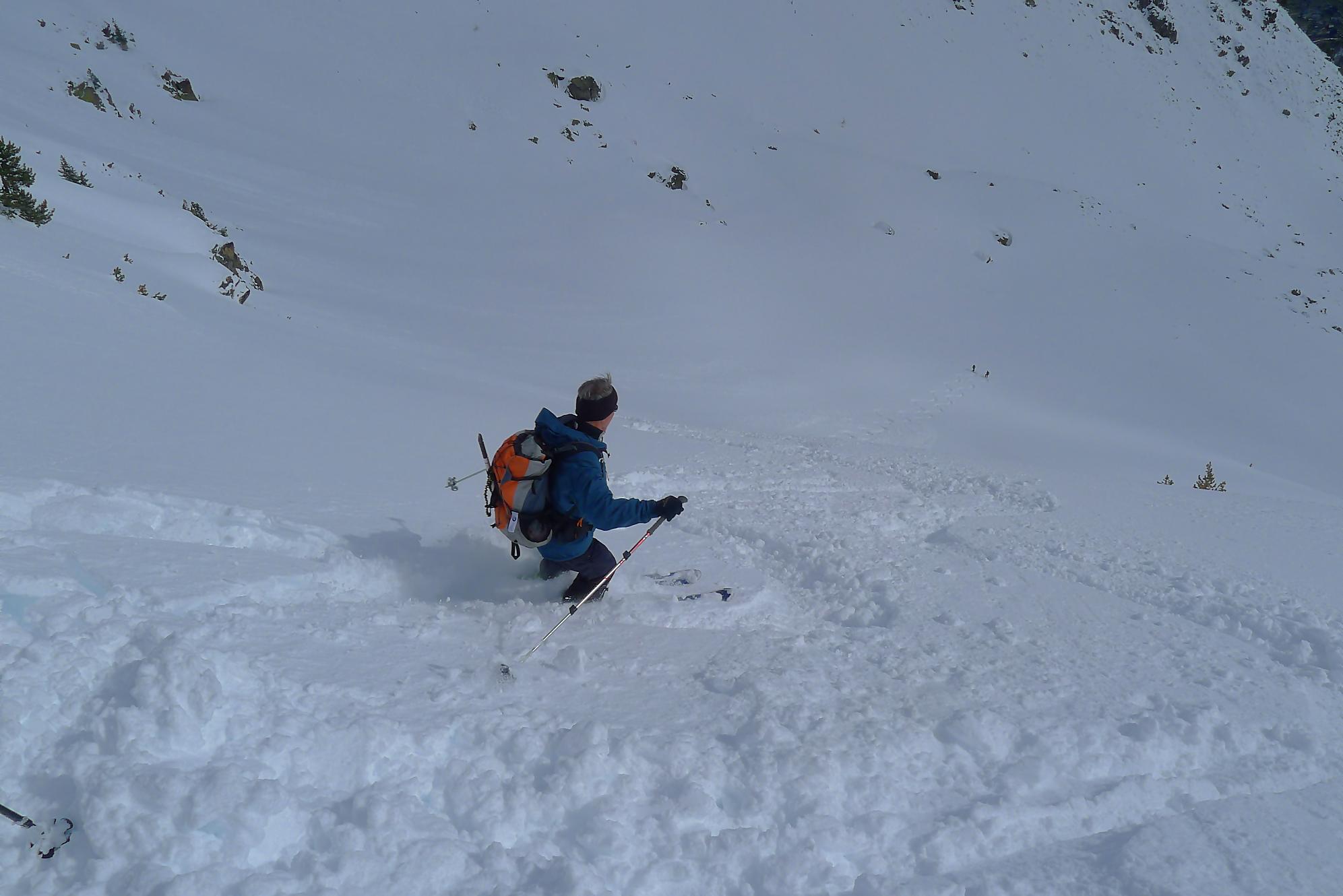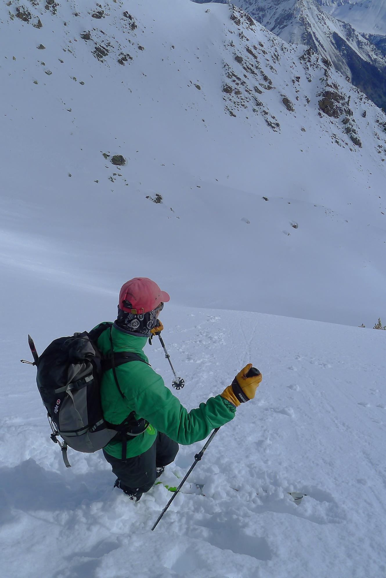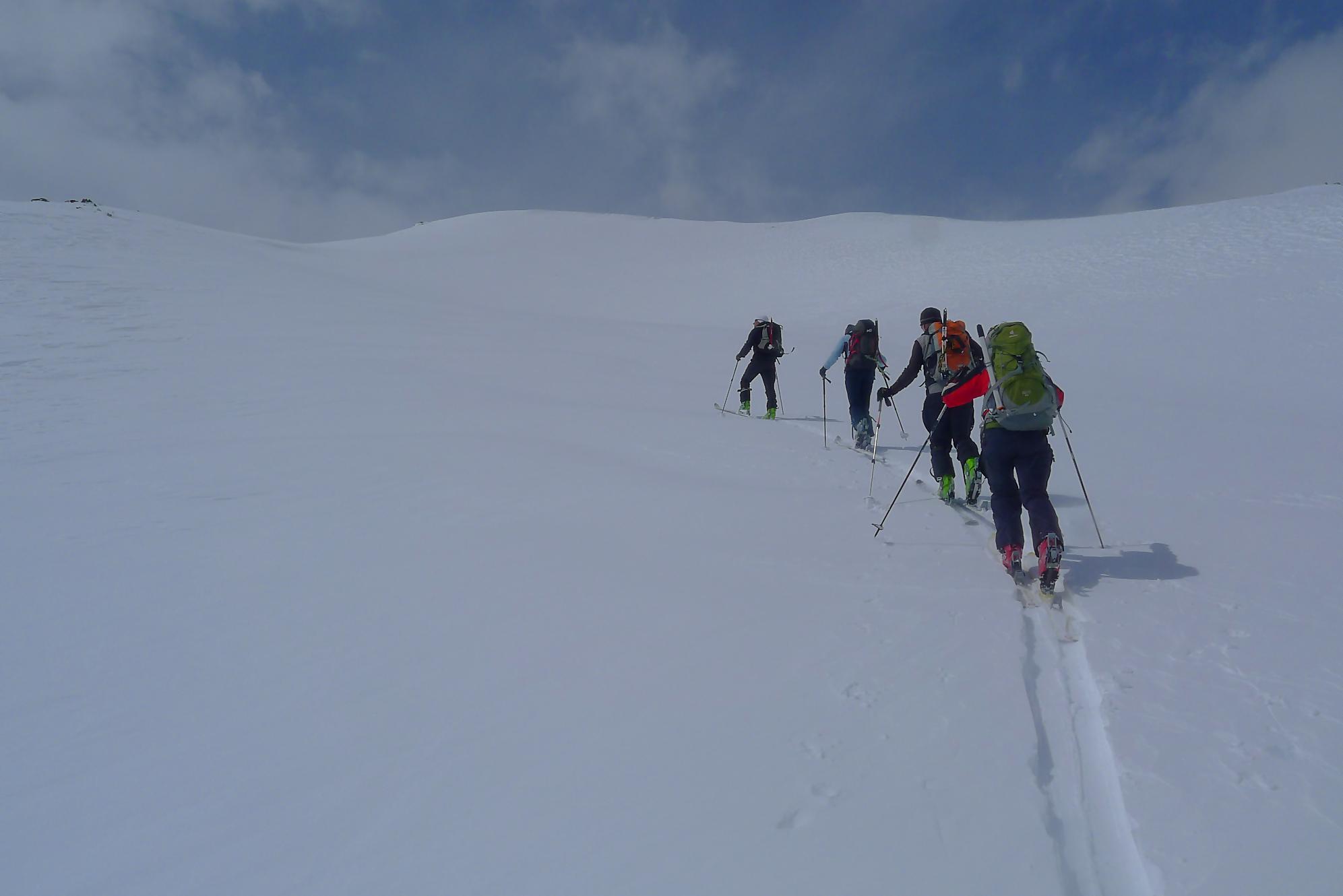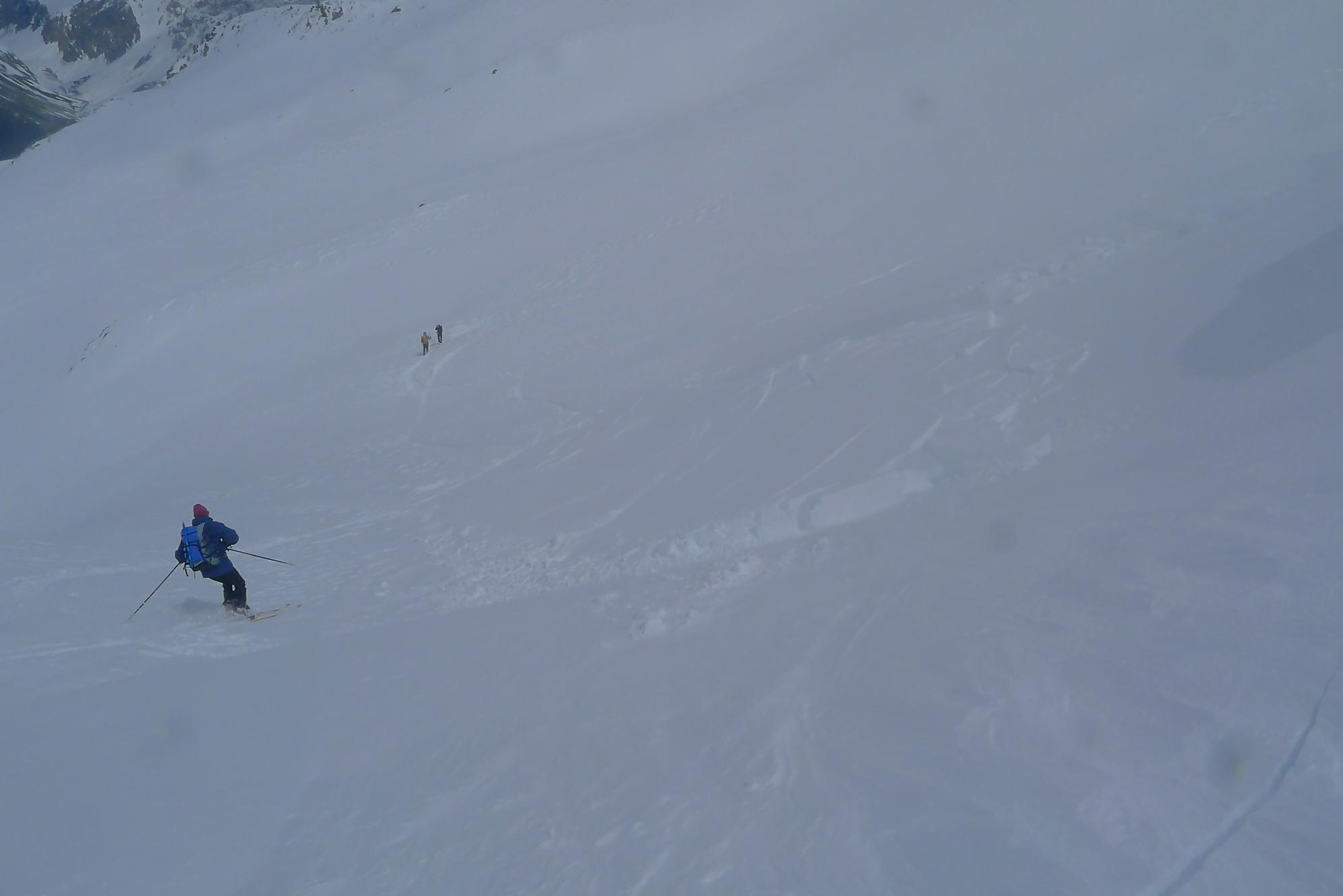 Dans cette descente, le guide provoque une nouvelle coulée et se fait une nouvelle frayeur, sans dommage. Nous arrivons sur le replat du Lac de Cristol et remontons une pente régulière pour l’Echaillon, notre premier sommet. La neige se fait lourde. Ce sommet rejoint nous continuons par la jolie arête N (de jolis rochers). Il est possible de descendre la face NO (“Crazy Slope” sur le site du refuge) du sommet du Pt2569, mais en bonne condition. De plus il y a une petite remontée pour revenir au refuge. Nous descendons donc la pente O et là le guide en a profité pour distiller ses conseils sur notre façon de skier. C’est cela que j’apprécie chez un guide, en plus de son relationnel, c’est son envie de formation envers ses clients. Merci Greg !