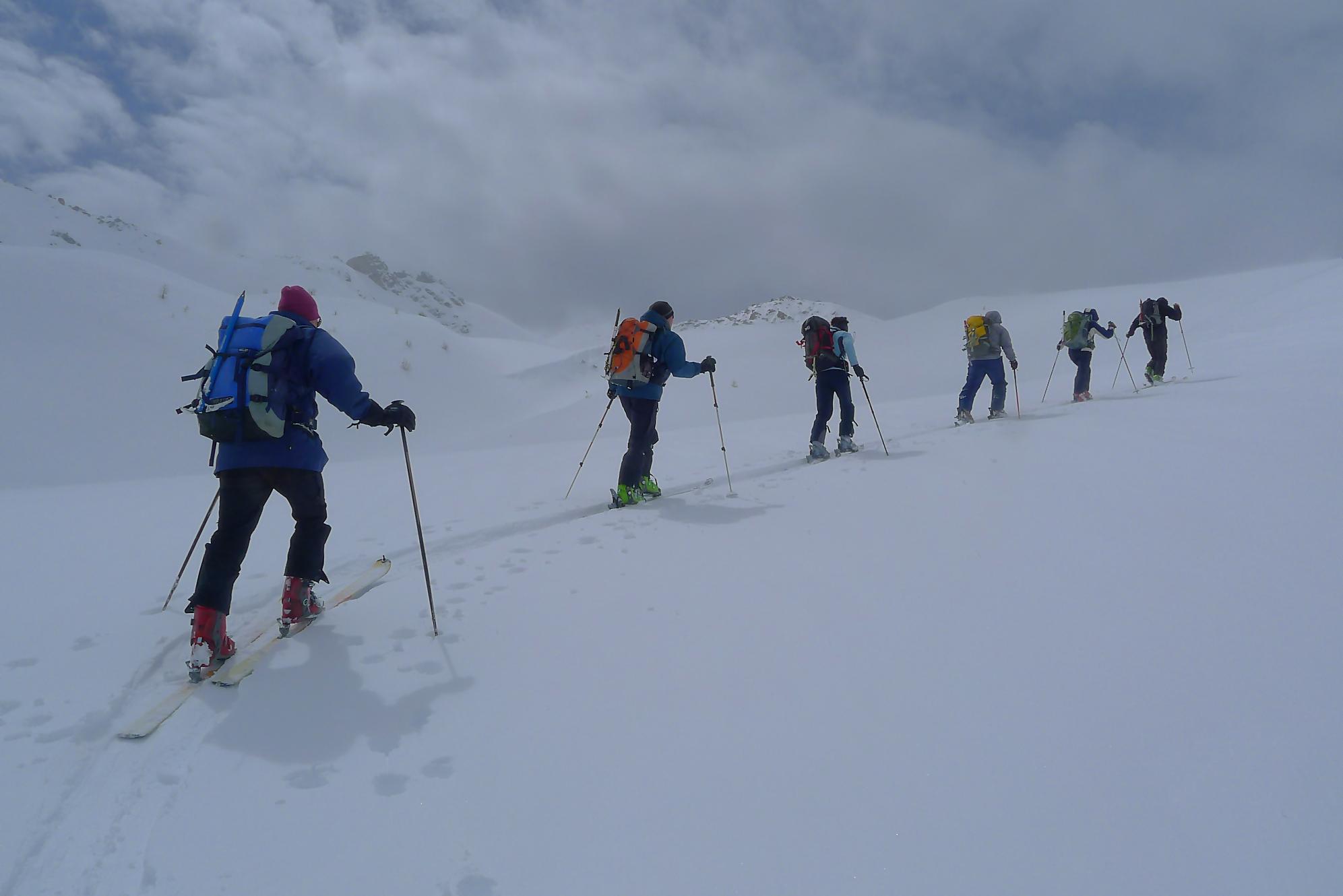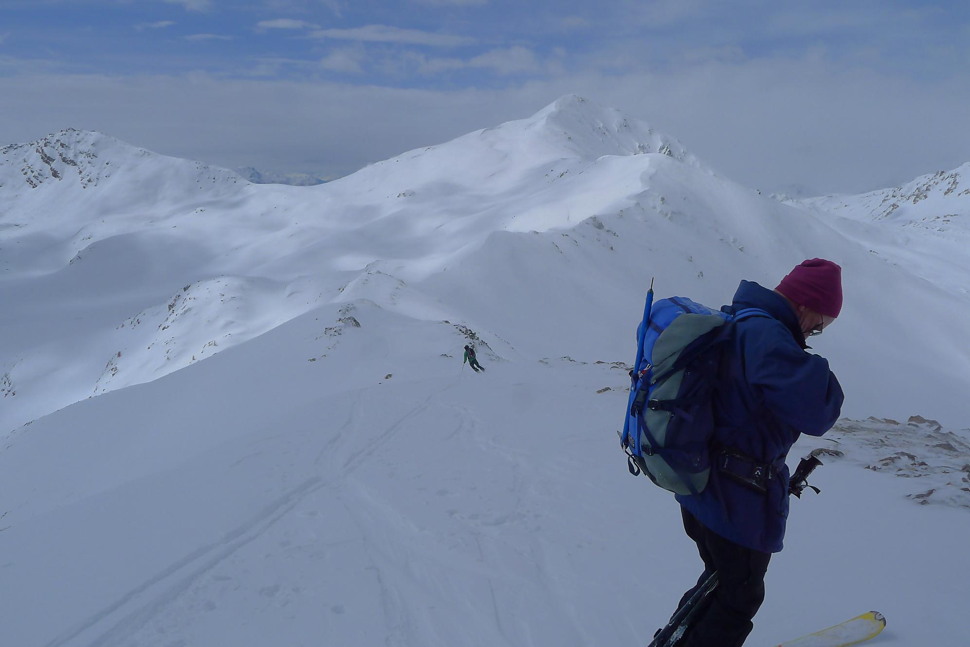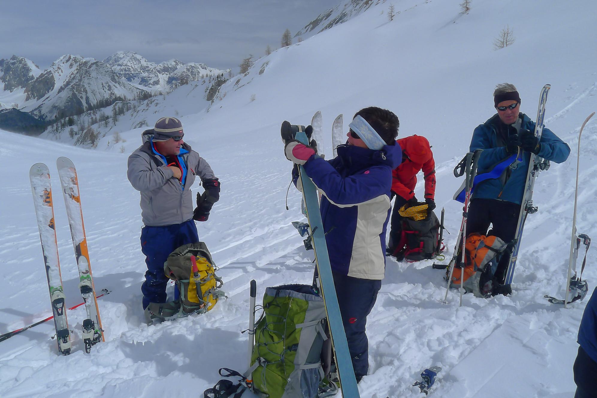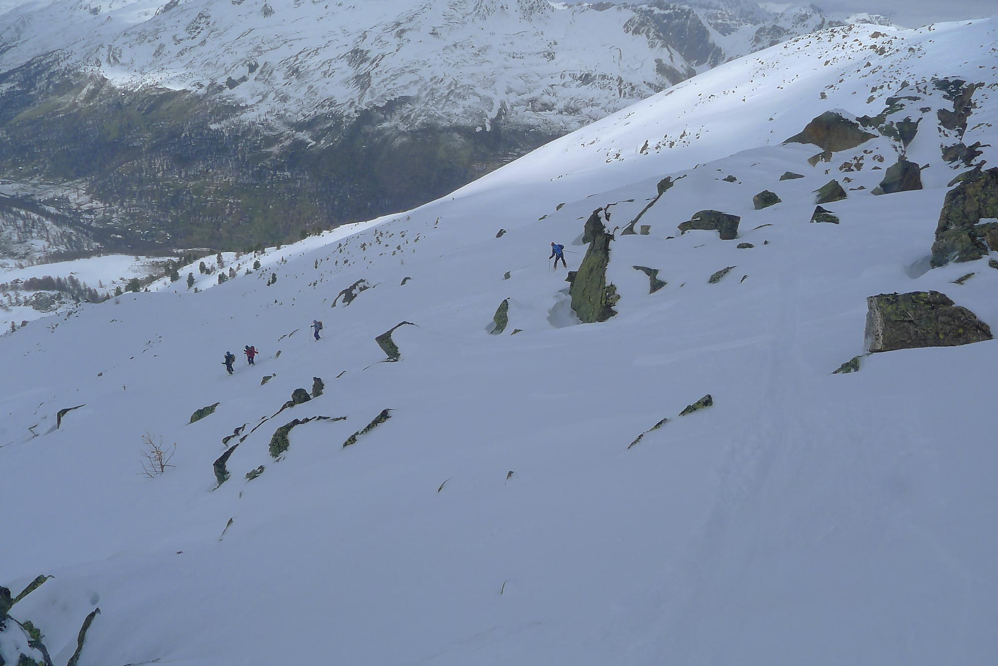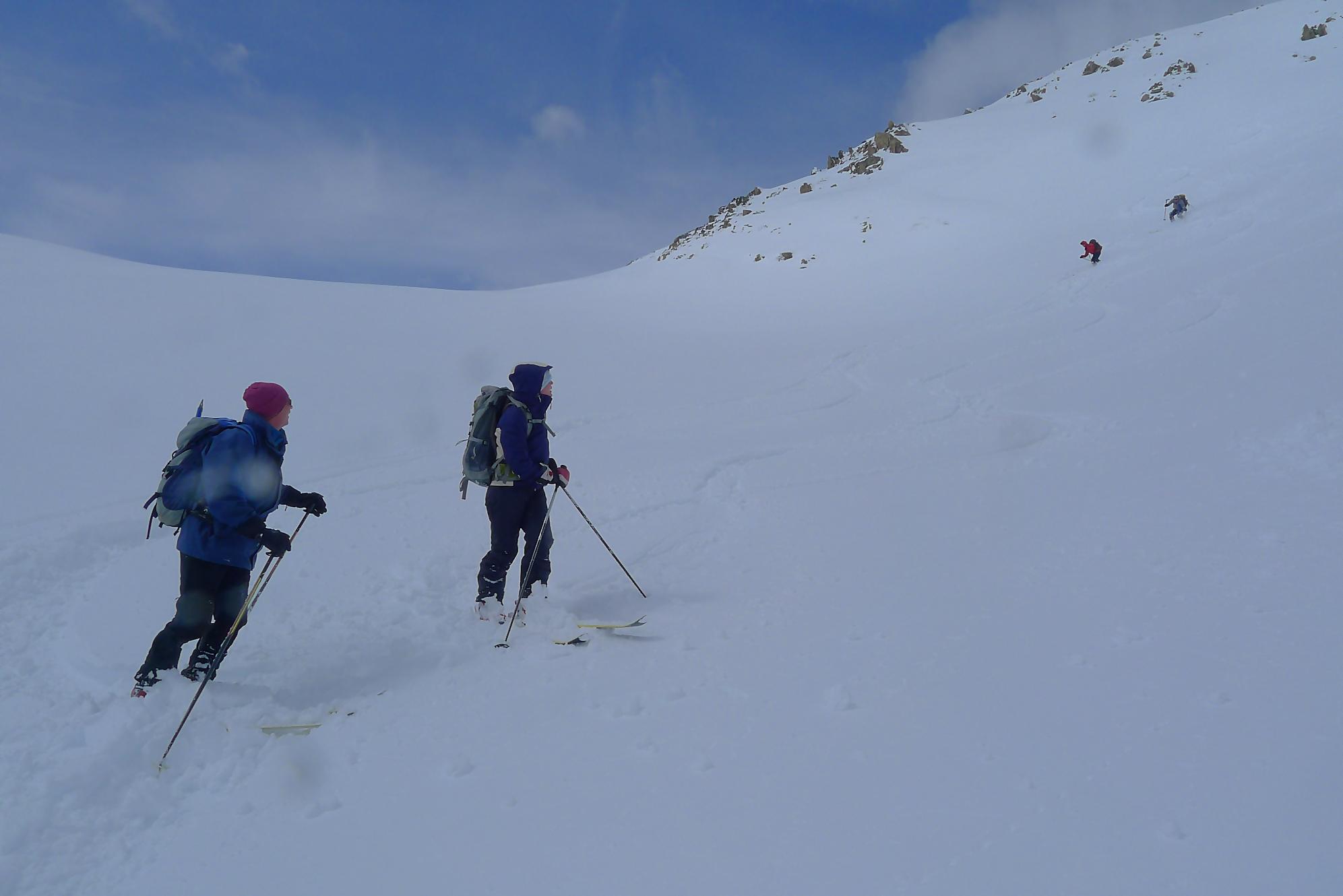 Dans cette descente, le guide provoque une nouvelle coulée et se fait une nouvelle frayeur, sans dommage. Nous arrivons sur le replat du Lac de Cristol et remontons une pente régulière pour l’Echaillon, notre premier sommet. La neige se fait lourde. Ce sommet rejoint nous continuons par la jolie arête N (de jolis rochers). Il est possible de descendre la face NO (“Crazy Slope” sur le site du refuge) du sommet du Pt2569, mais en bonne condition. De plus il y a une petite remontée pour revenir au refuge. Nous descendons donc la pente O et là le guide en a profité pour distiller ses conseils sur notre façon de skier. C’est cela que j’apprécie chez un guide, en plus de son relationnel, c’est son envie de formation envers ses clients. Merci Greg !