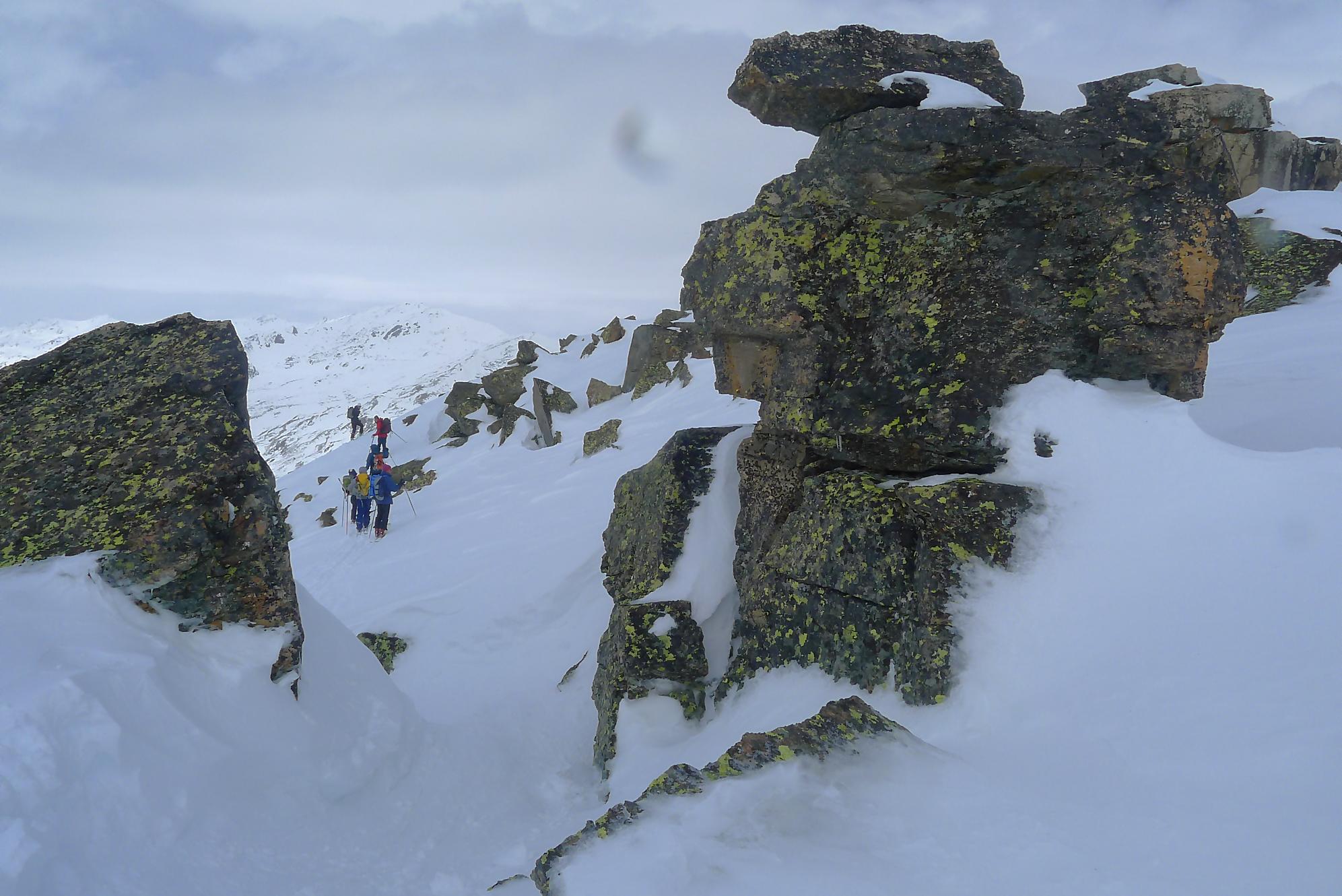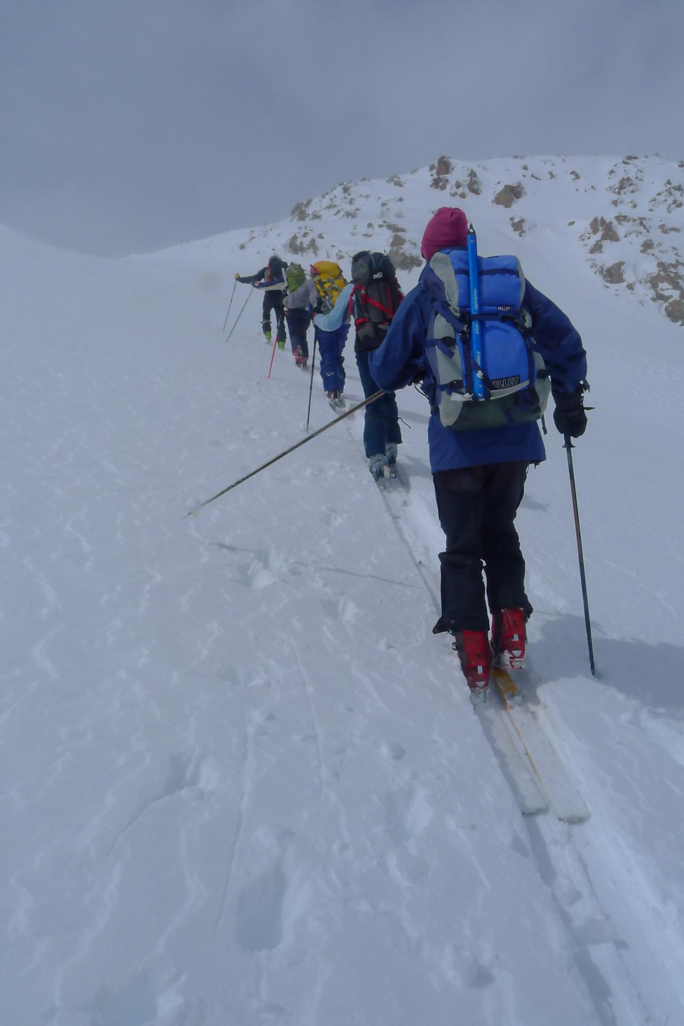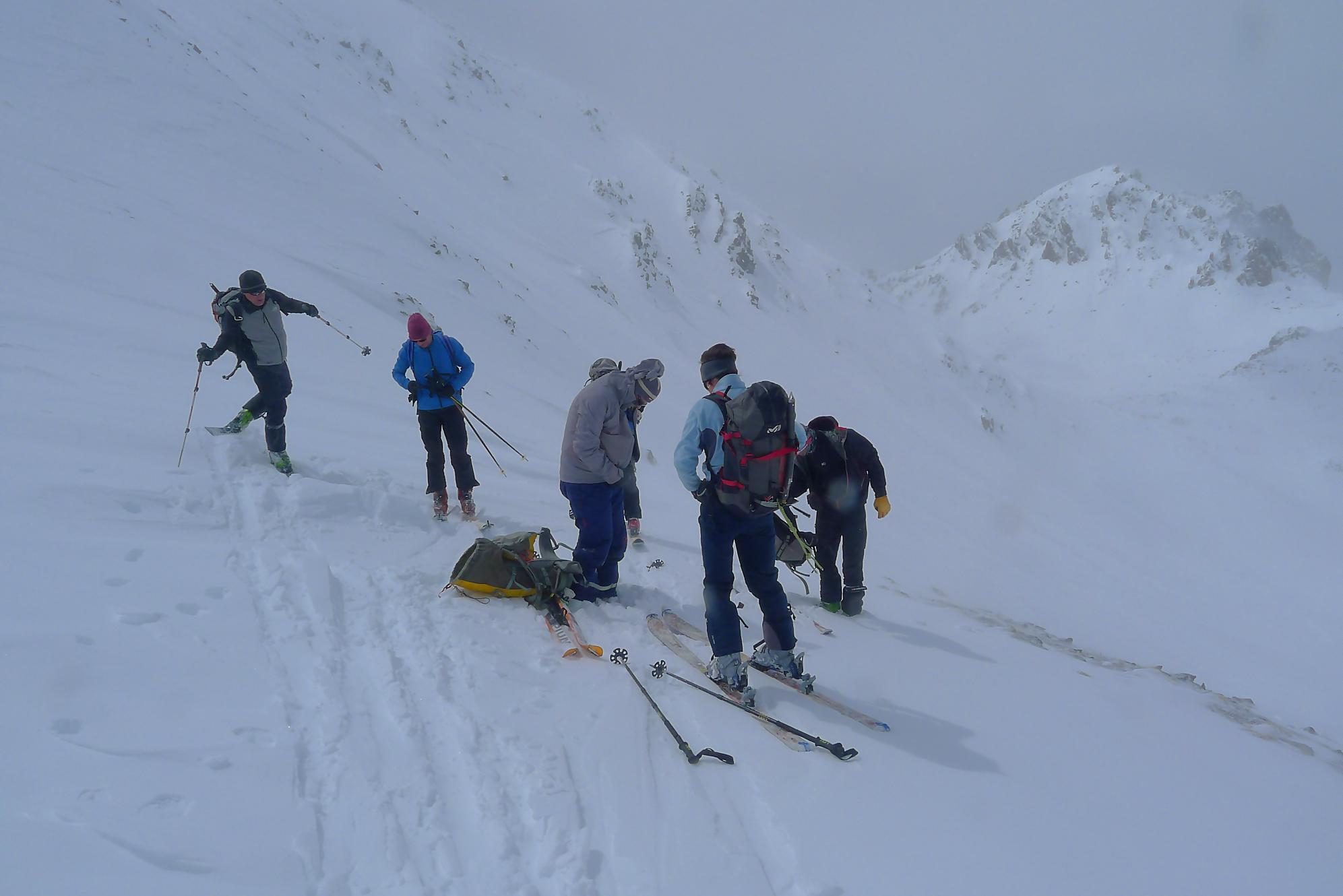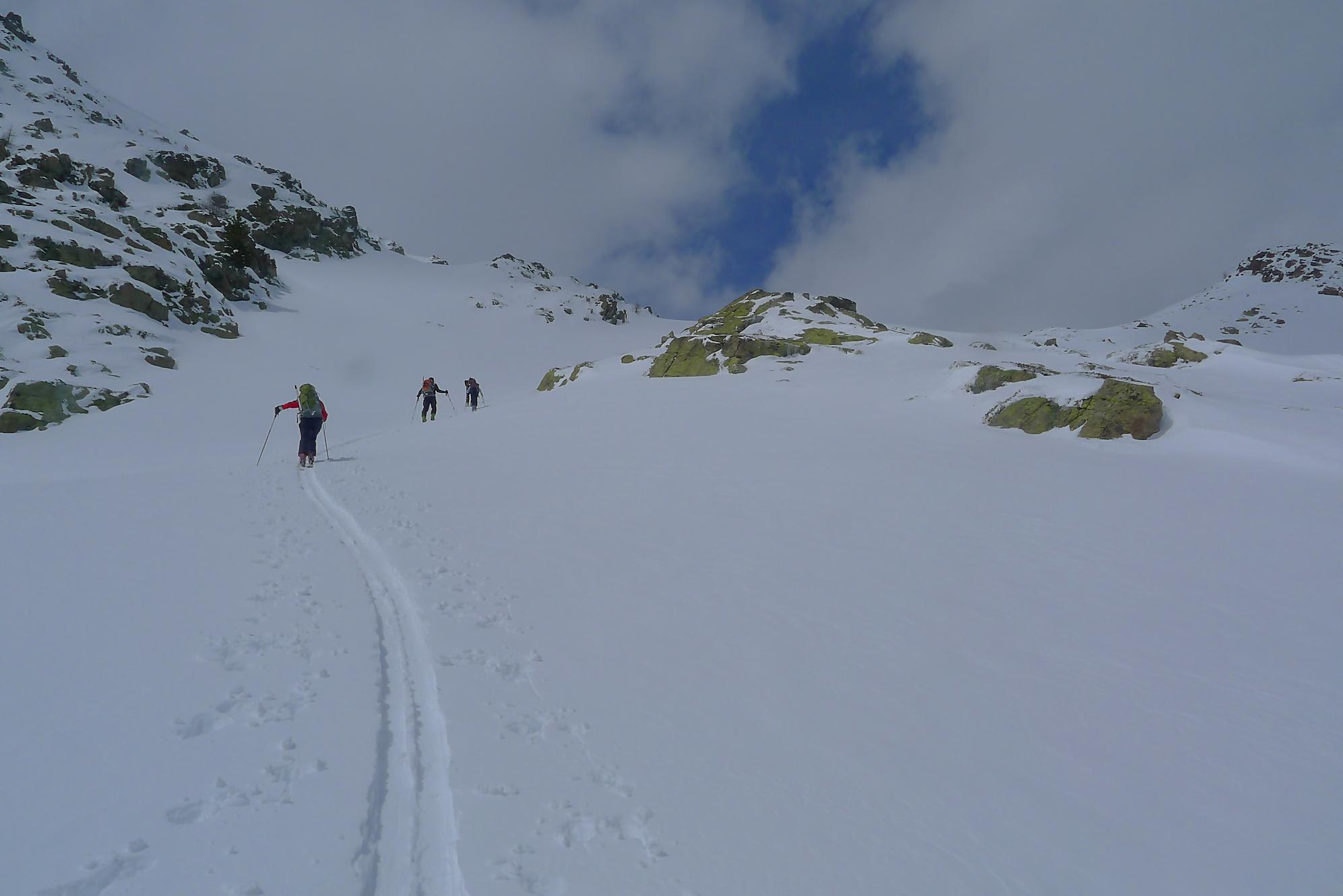 Dans cette descente, le guide provoque une nouvelle coulée et se fait une nouvelle frayeur, sans dommage. Nous arrivons sur le replat du Lac de Cristol et remontons une pente régulière pour l’Echaillon, notre premier sommet. La neige se fait lourde. Ce sommet rejoint nous continuons par la jolie arête N (de jolis rochers). Il est possible de descendre la face NO (“Crazy Slope” sur le site du refuge) du sommet du Pt2569, mais en bonne condition. De plus il y a une petite remontée pour revenir au refuge. Nous descendons donc la pente O et là le guide en a profité pour distiller ses conseils sur notre façon de skier. C’est cela que j’apprécie chez un guide, en plus de son relationnel, c’est son envie de formation envers ses clients. Merci Greg !