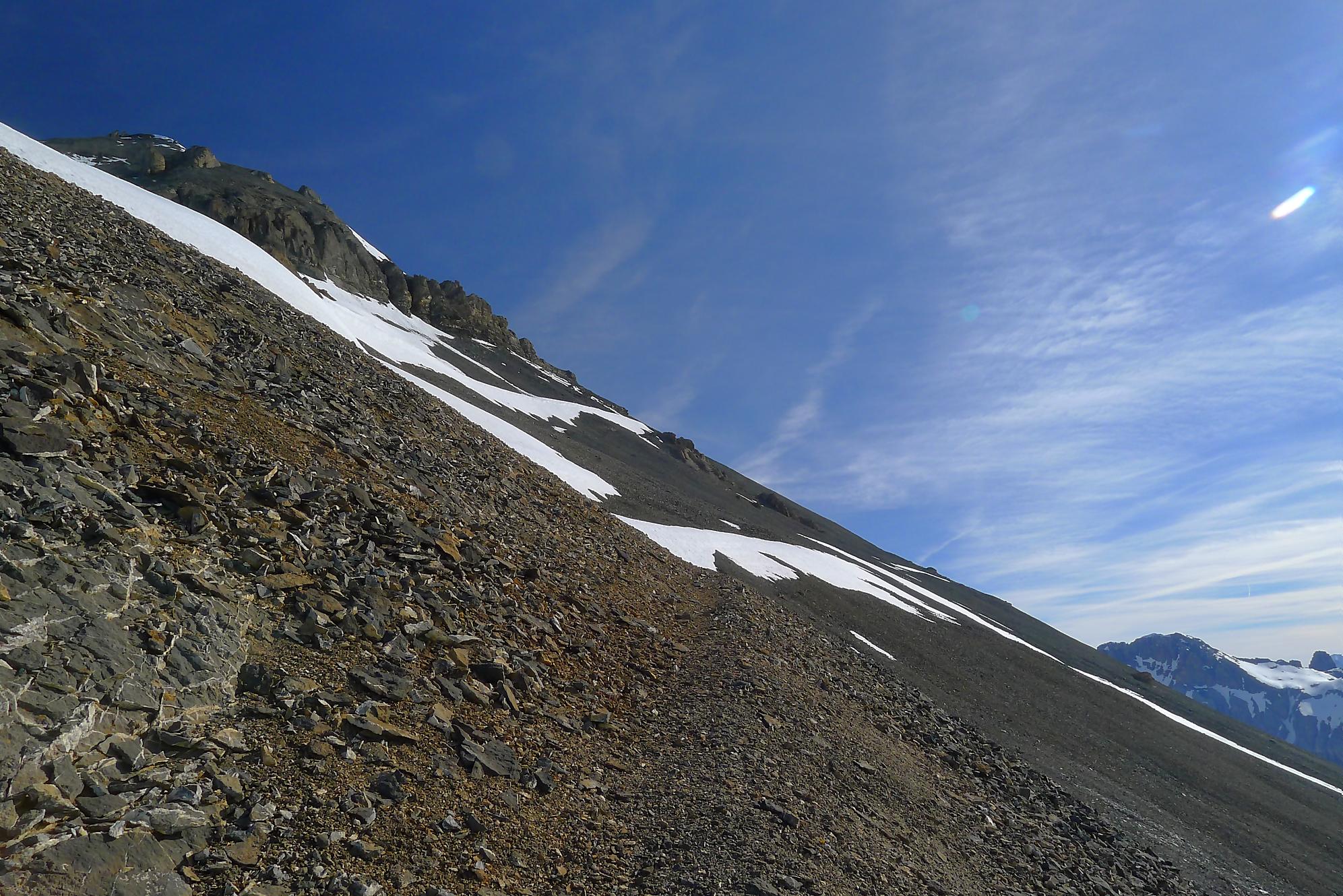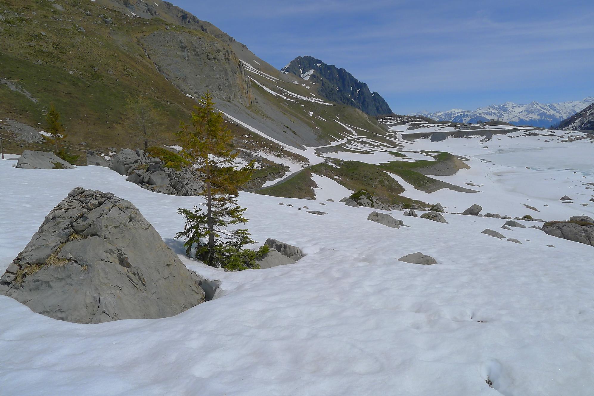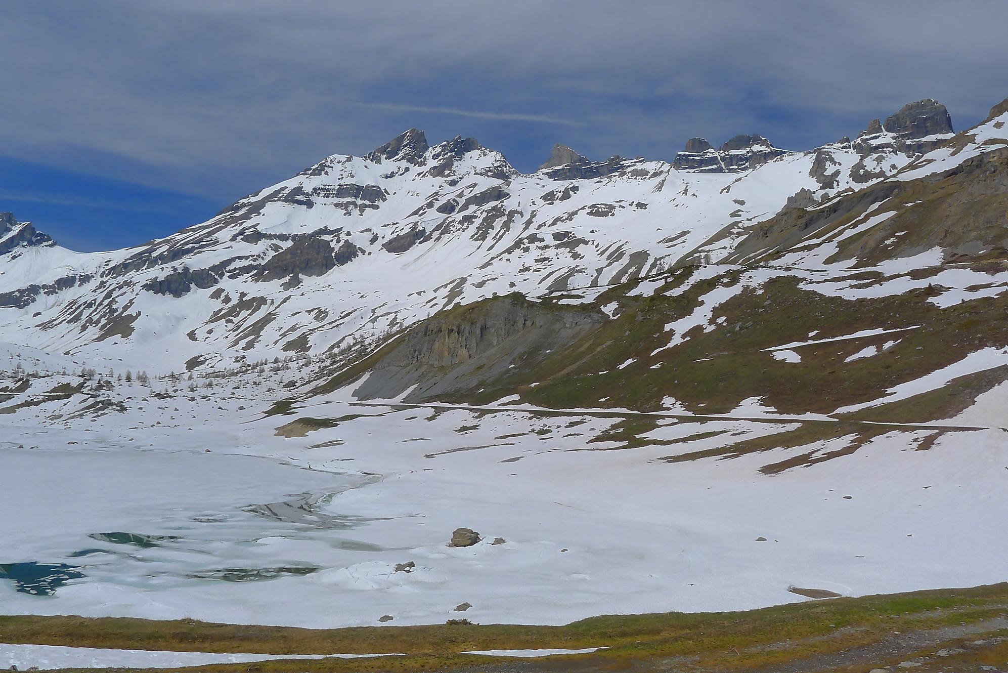 Au Col de Susanfe, j’ai la grosse surprise de voir qu’il n’y a plus (excepté quelques névés) de neige pour la suite. Je mets les skis sur le sac et file à pied via le chemin d’été. En résumé, porter les skis et marcher avec les chaussures de ski n’est pas ce que je préfère ! En milieu de parcours, une crampe a pointé le bout de son nez (forcément crochu). Je l’ai renvoyé dans ses 20m via des pastilles de magnésium, mais 1h plus tard elle revient se présenter (sans invitation d’ailleurs), mais j’avais épuisé la potion magique ! C’est elle qui m’a renvoyé dans mes 20m. Je fus quitte pour composer avec, m’accordant des répits.