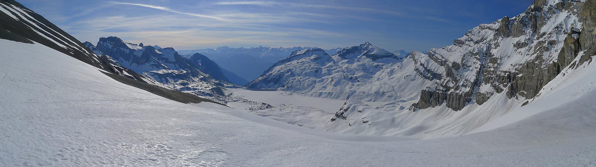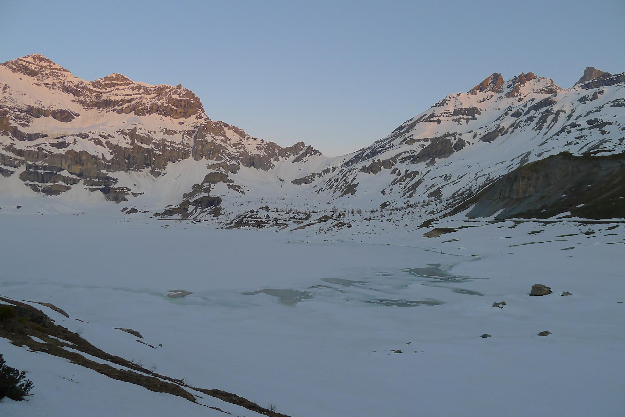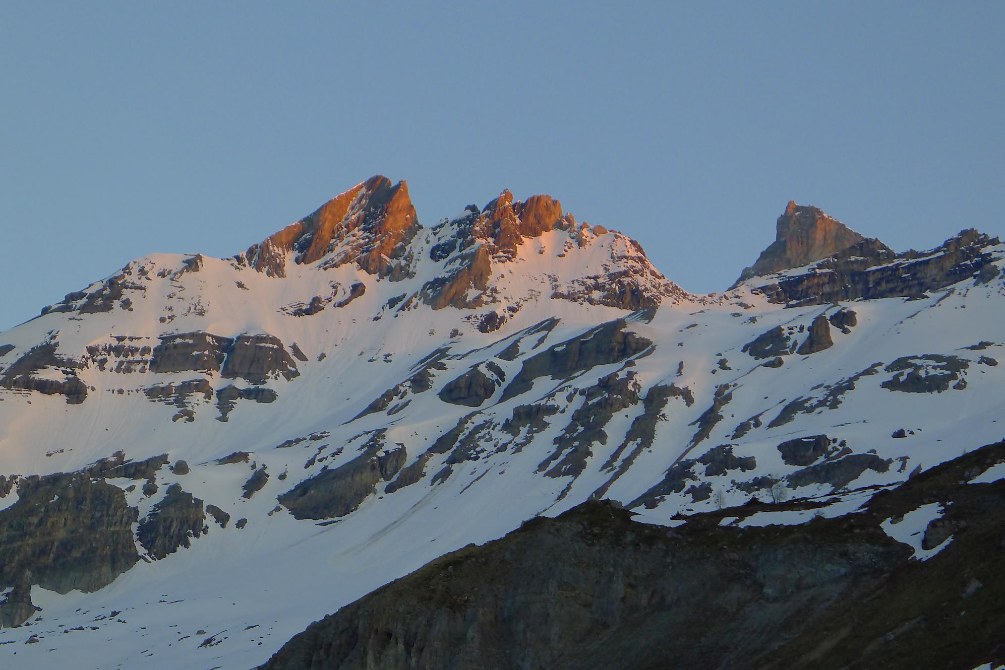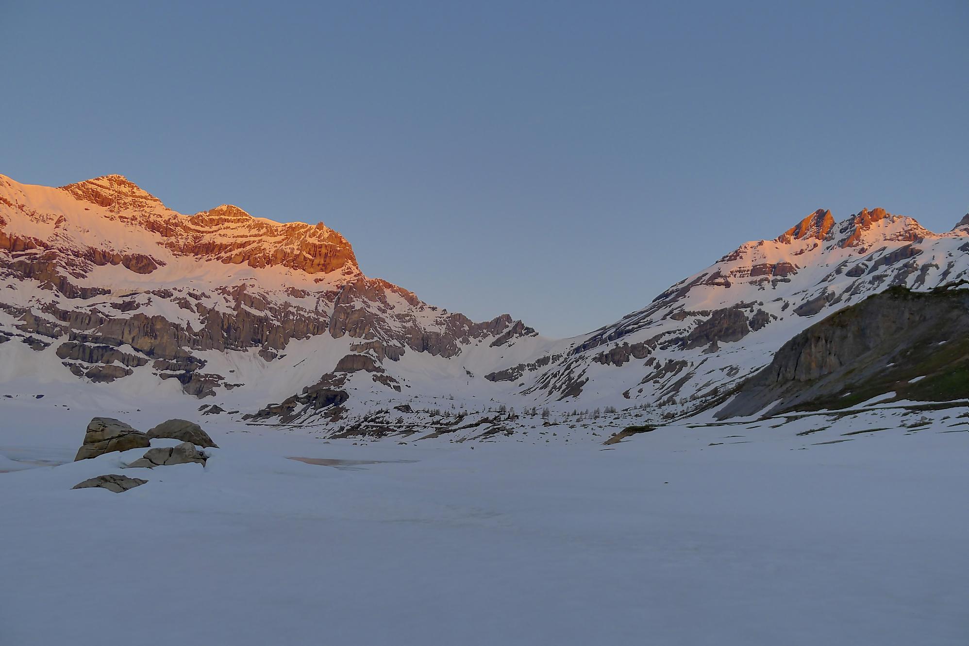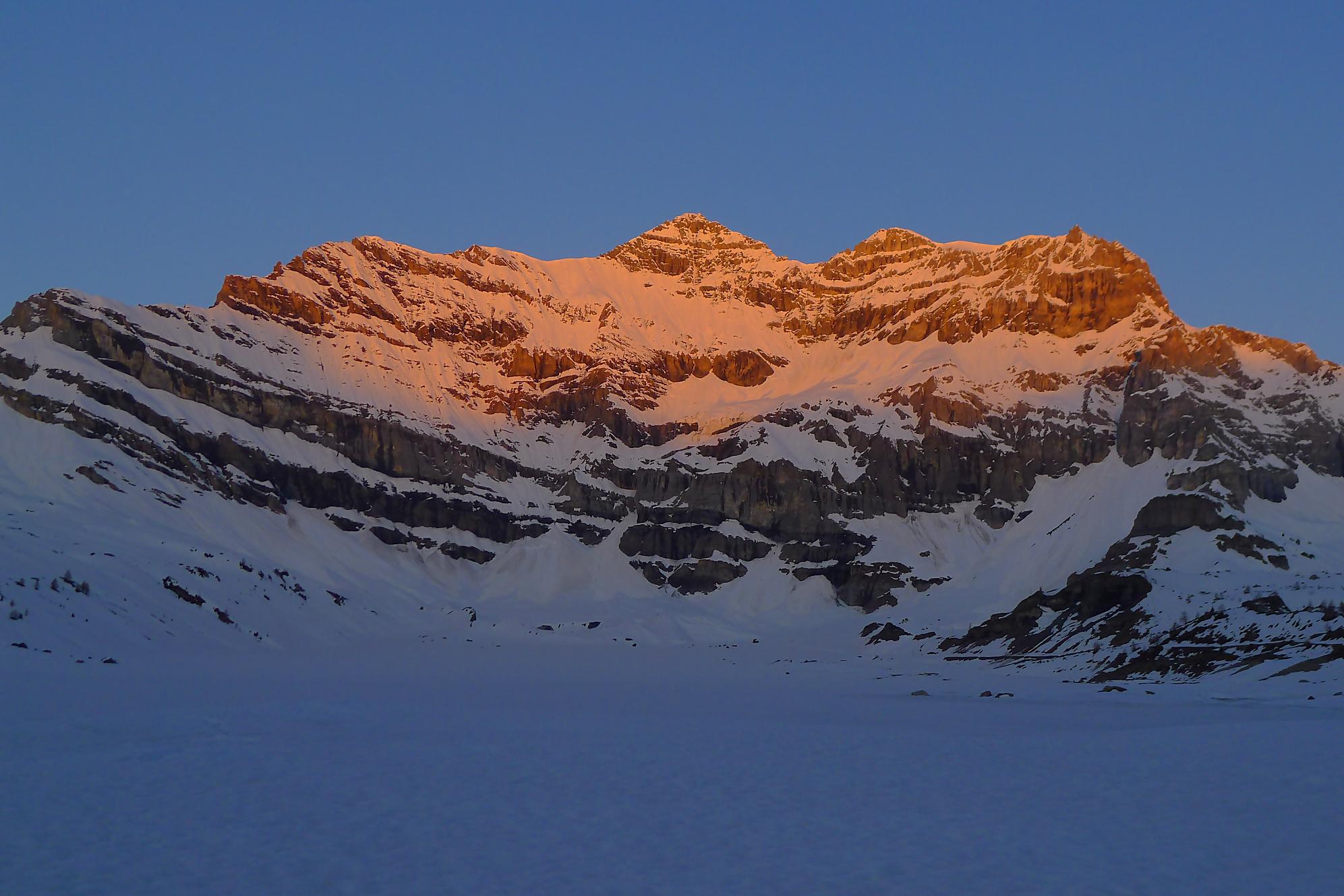 La veille, je suis monté au refuge d’hiver de Salanfe pour y passer la nuit. Je pars du refuge vers 6h du matin, +5°c devant la porte. La neige à l’ombre est pourtant dure et je longe le barrage de Salanfe, profitant des premières lueurs de la journée sur la Tour Salière et une partie des Dents du Midi. Le départ est assez plat et sera au retour un long faut plat. Après Plan Château, la pente se redresse et j’arrive au soleil, la neige devient déjà lourde. Le bulletin d’avalanche a annoncé un regel vers 2500m, l’altitude du Col de Susanfe. Je poursuis donc dans cette neige, à travers d’anciennes coulées. Mon coeur commence à battre la chamade, me rappelant que la nuit fut courte.