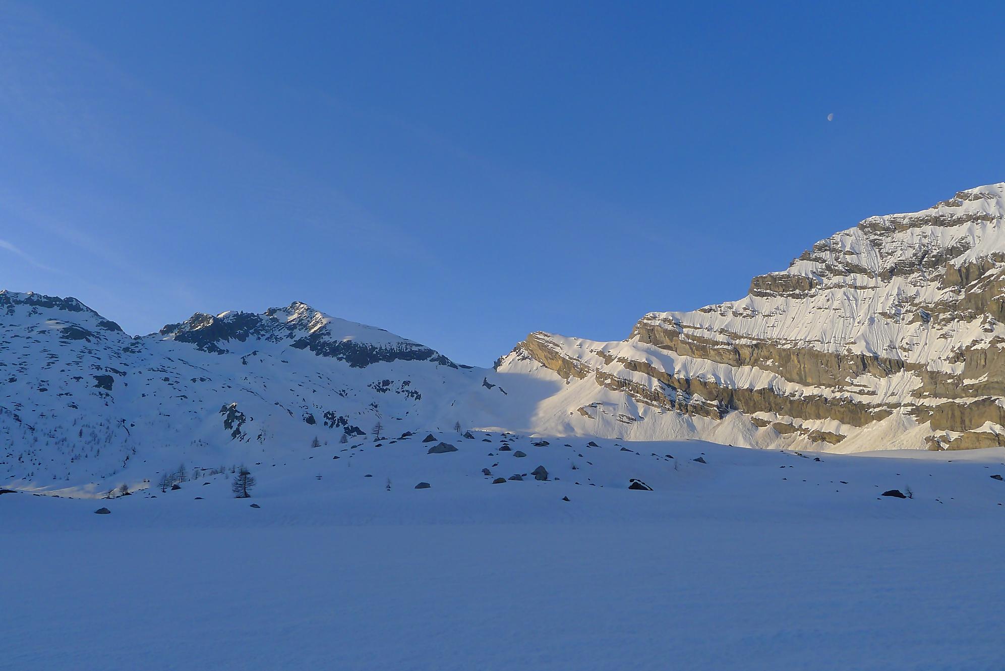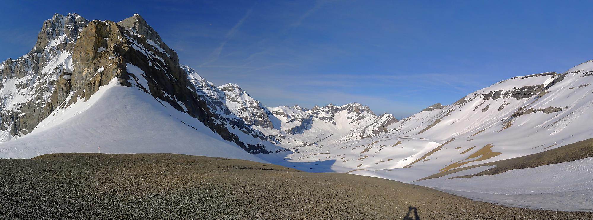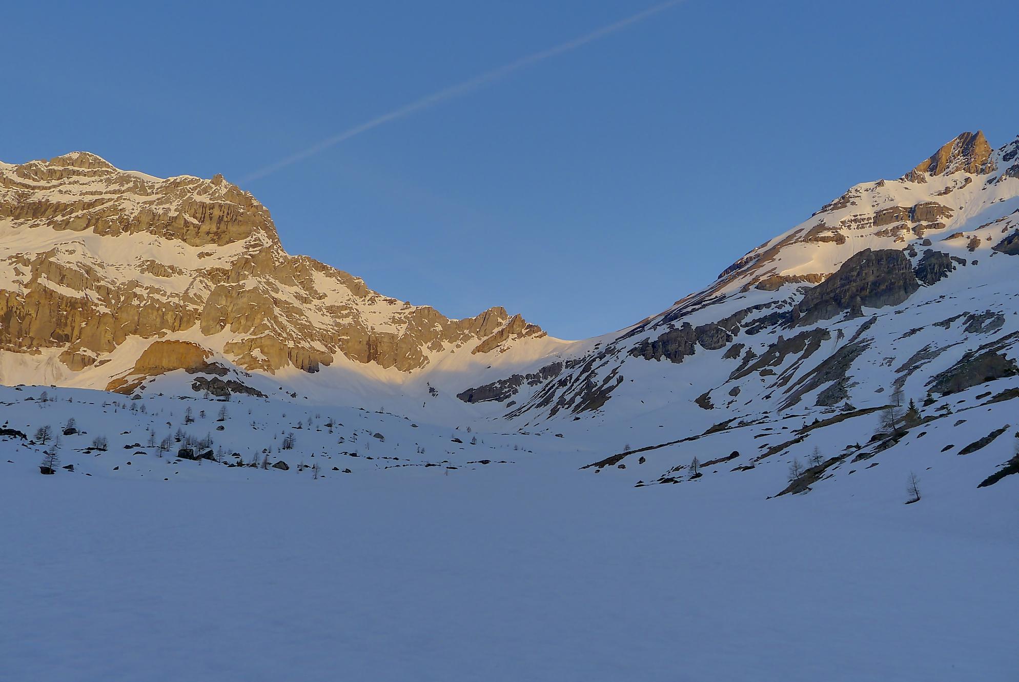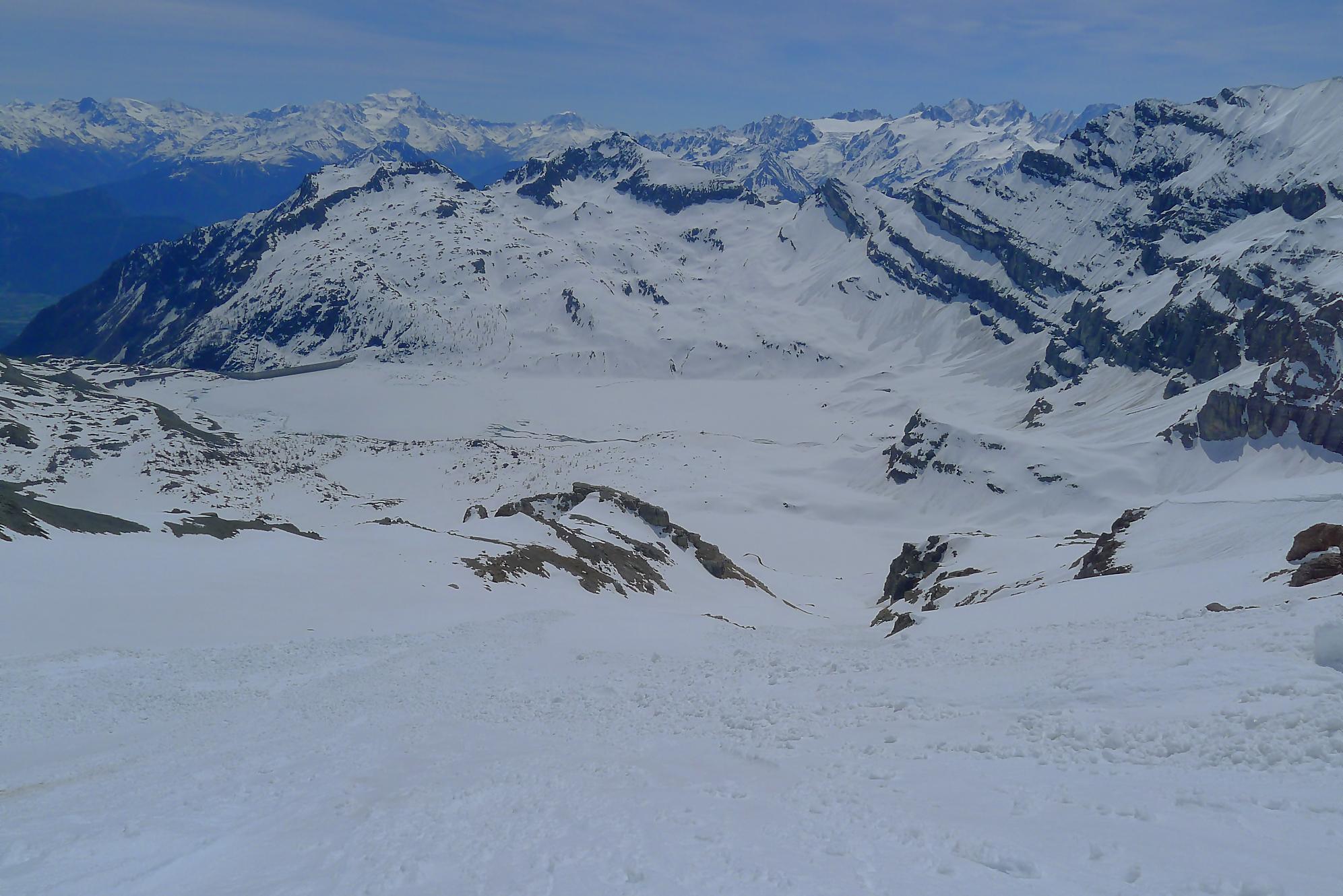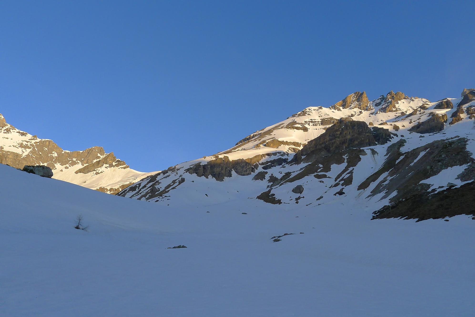 La veille, je suis monté au refuge d’hiver de Salanfe pour y passer la nuit. Je pars du refuge vers 6h du matin, +5°c devant la porte. La neige à l’ombre est pourtant dure et je longe le barrage de Salanfe, profitant des premières lueurs de la journée sur la Tour Salière et une partie des Dents du Midi. Le départ est assez plat et sera au retour un long faut plat. Après Plan Château, la pente se redresse et j’arrive au soleil, la neige devient déjà lourde. Le bulletin d’avalanche a annoncé un regel vers 2500m, l’altitude du Col de Susanfe. Je poursuis donc dans cette neige, à travers d’anciennes coulées. Mon coeur commence à battre la chamade, me rappelant que la nuit fut courte.
