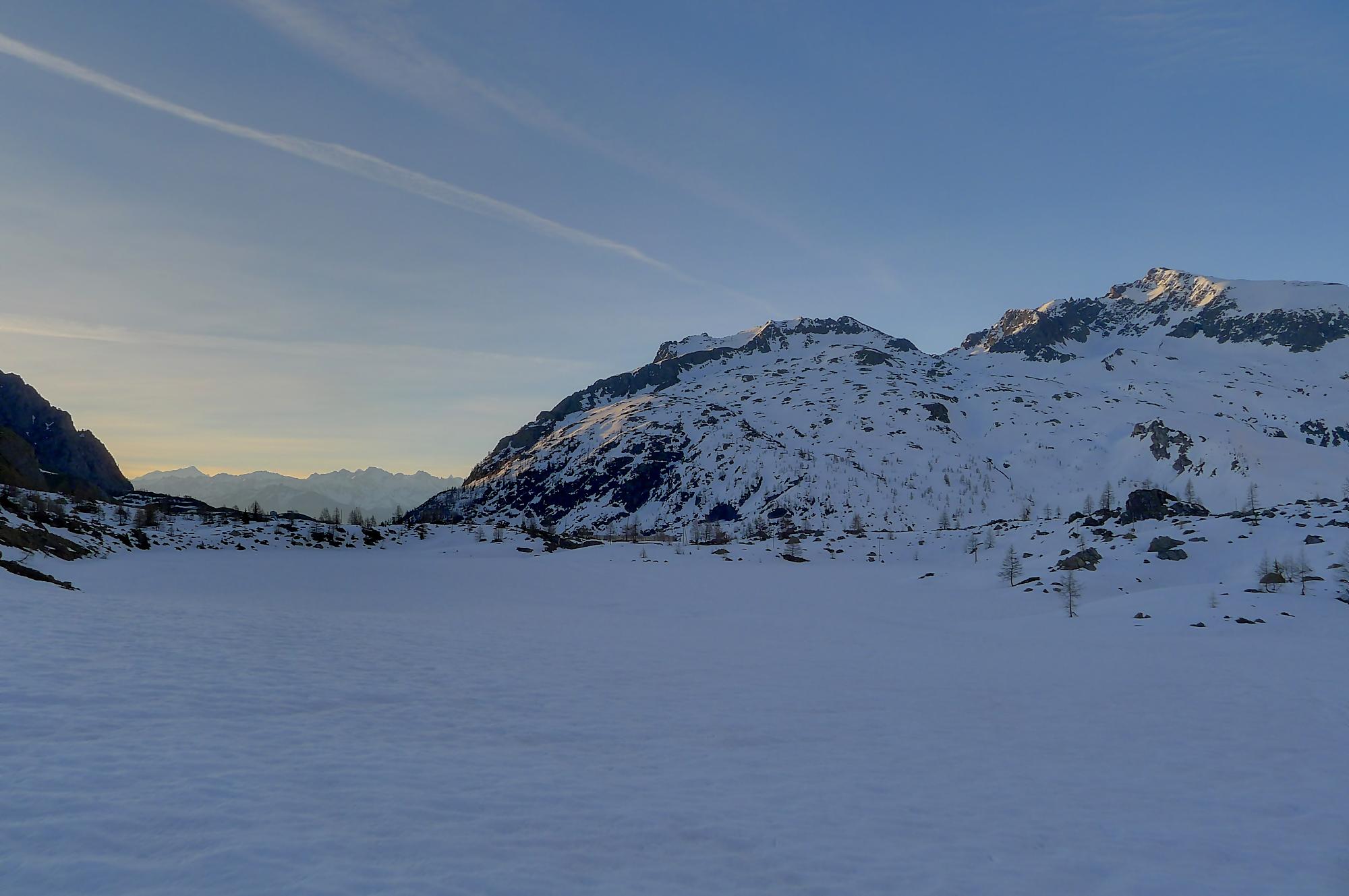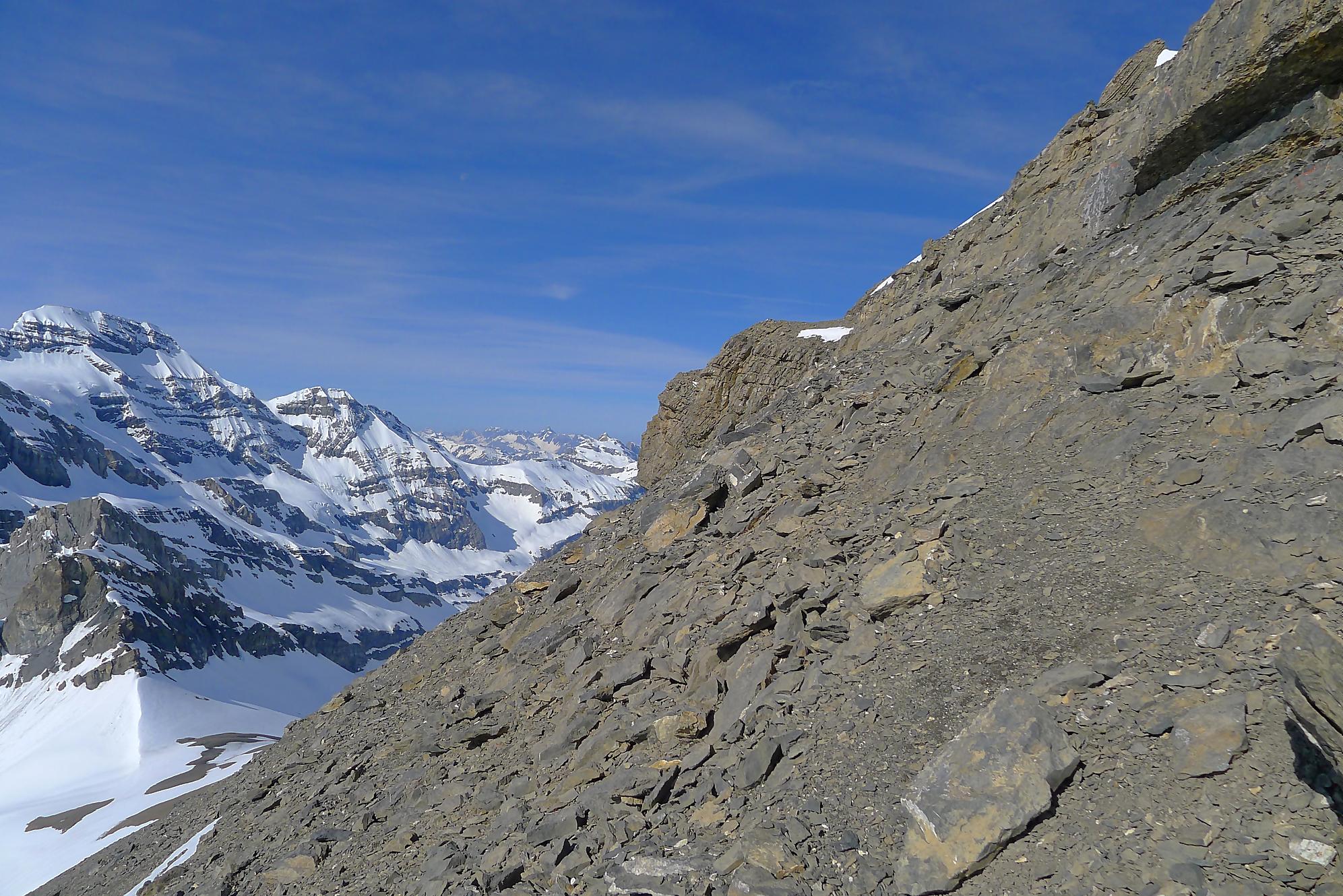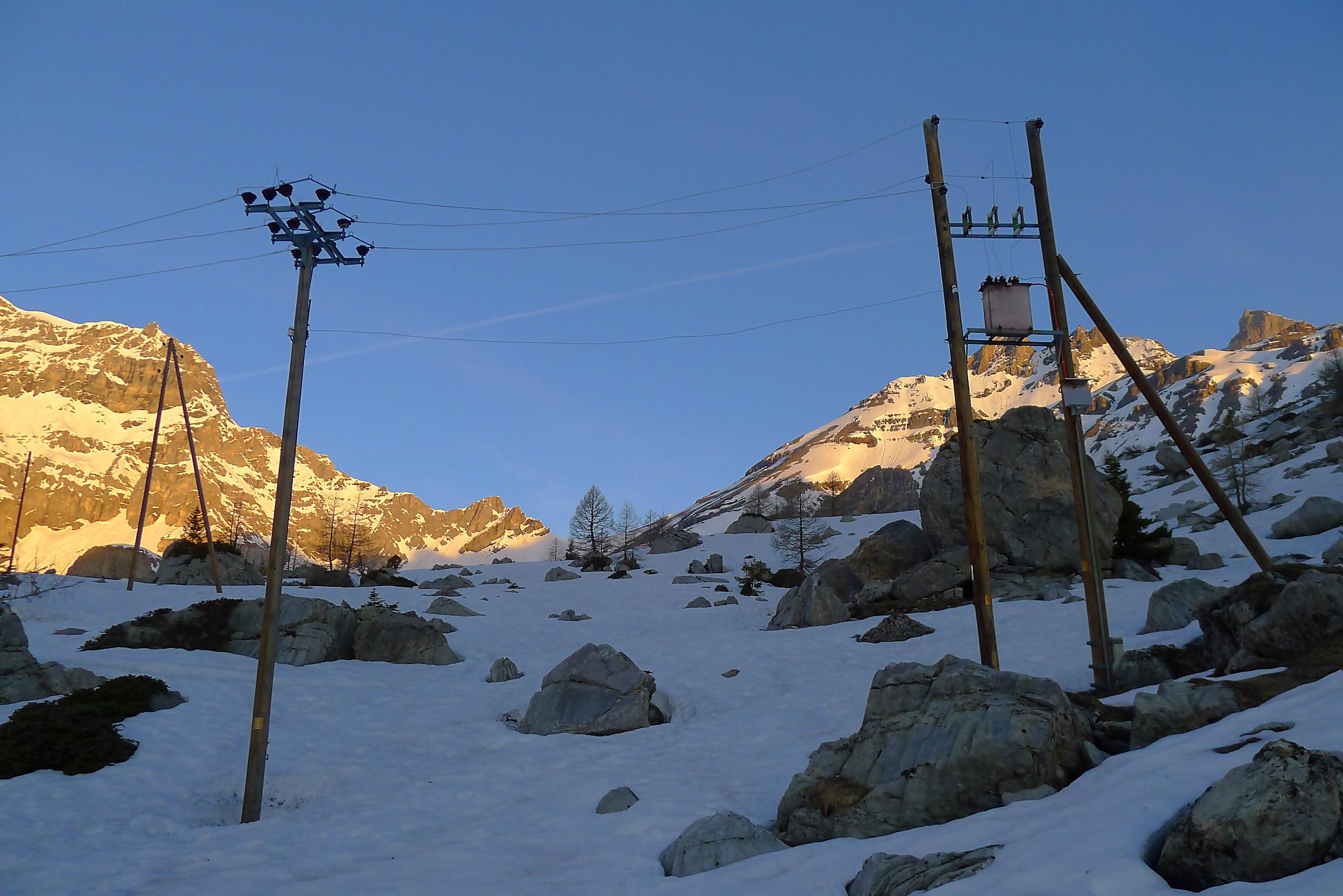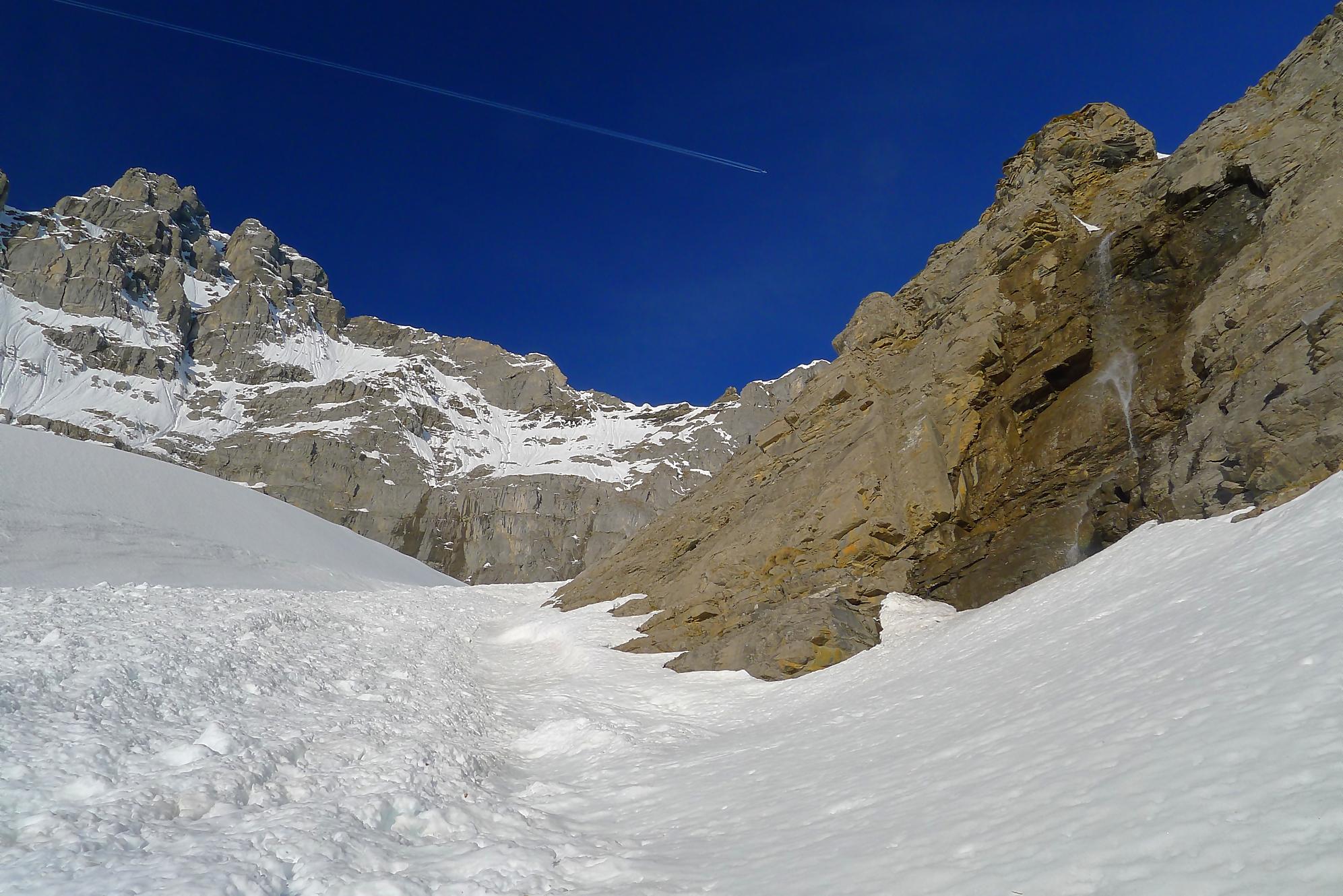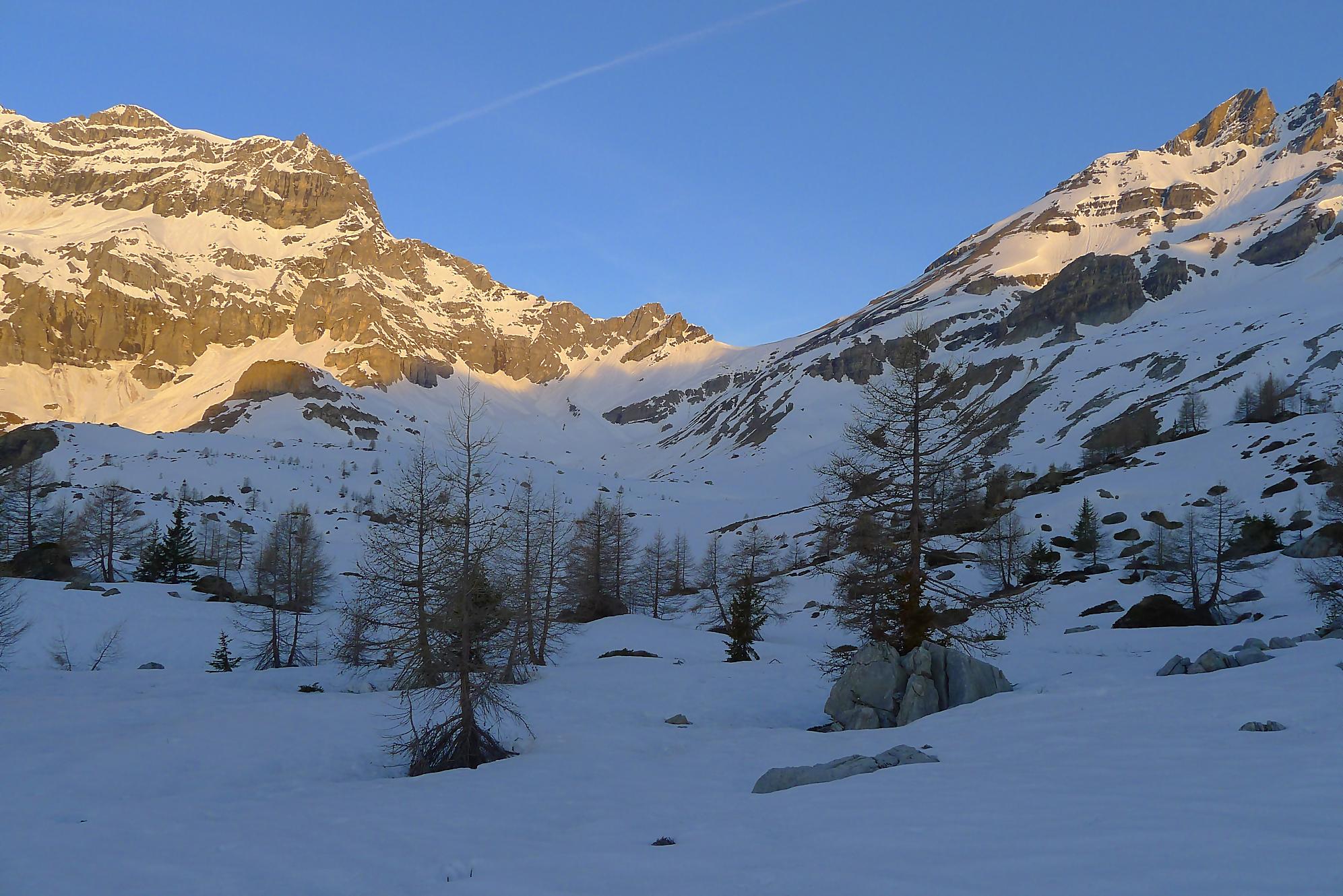 La veille, je suis monté au refuge d’hiver de Salanfe pour y passer la nuit. Je pars du refuge vers 6h du matin, +5°c devant la porte. La neige à l’ombre est pourtant dure et je longe le barrage de Salanfe, profitant des premières lueurs de la journée sur la Tour Salière et une partie des Dents du Midi. Le départ est assez plat et sera au retour un long faut plat. Après Plan Château, la pente se redresse et j’arrive au soleil, la neige devient déjà lourde. Le bulletin d’avalanche a annoncé un regel vers 2500m, l’altitude du Col de Susanfe. Je poursuis donc dans cette neige, à travers d’anciennes coulées. Mon coeur commence à battre la chamade, me rappelant que la nuit fut courte.