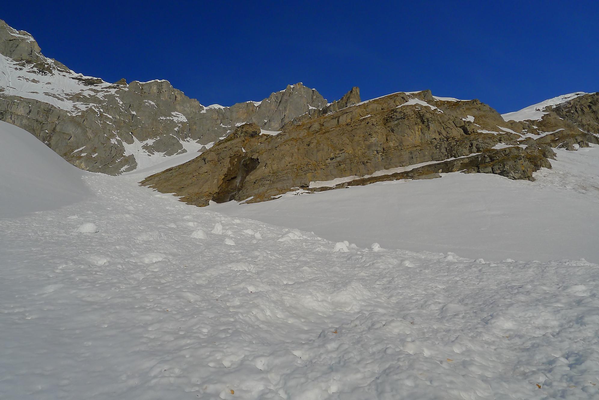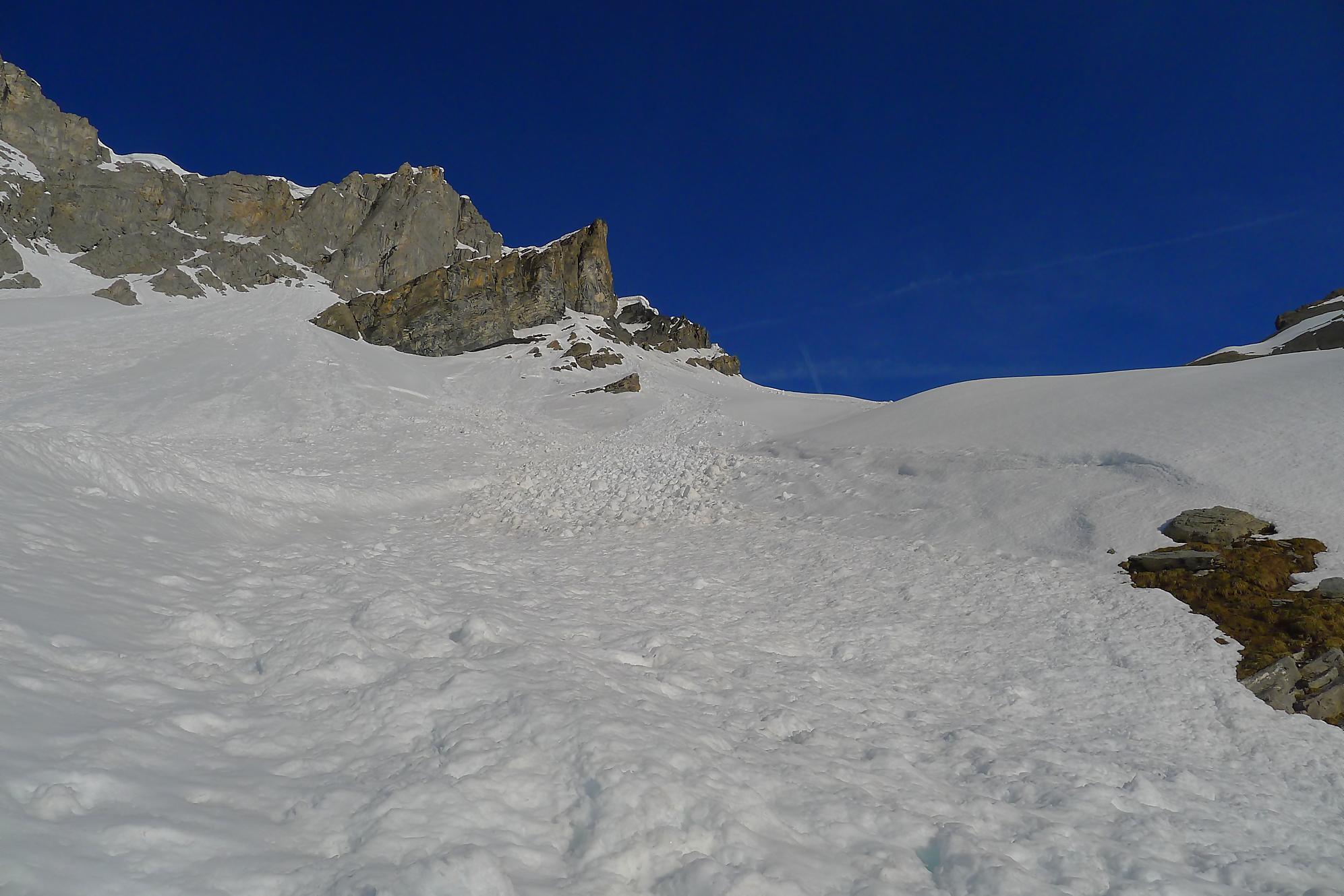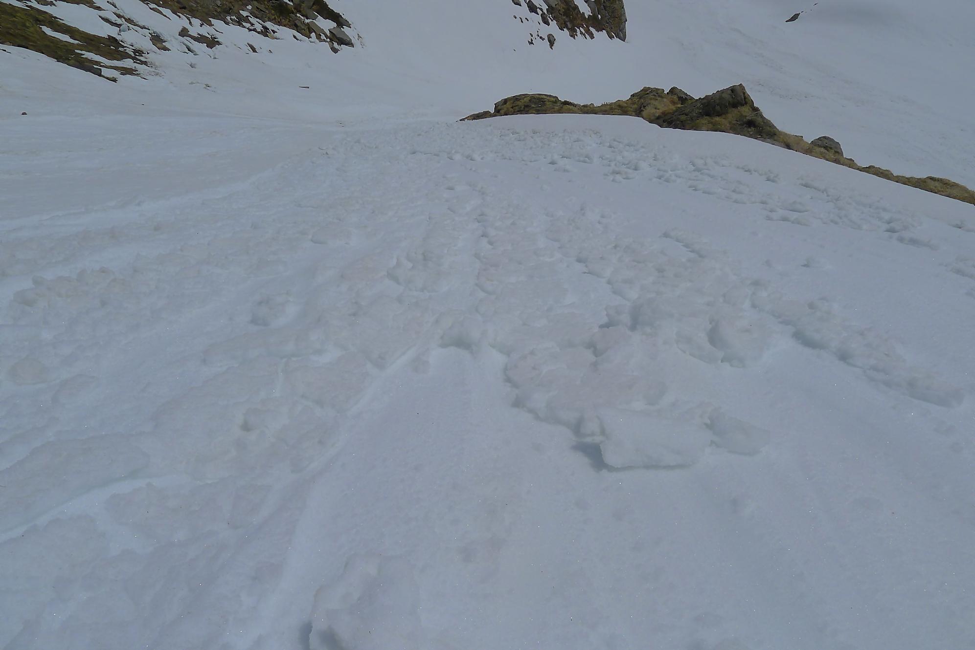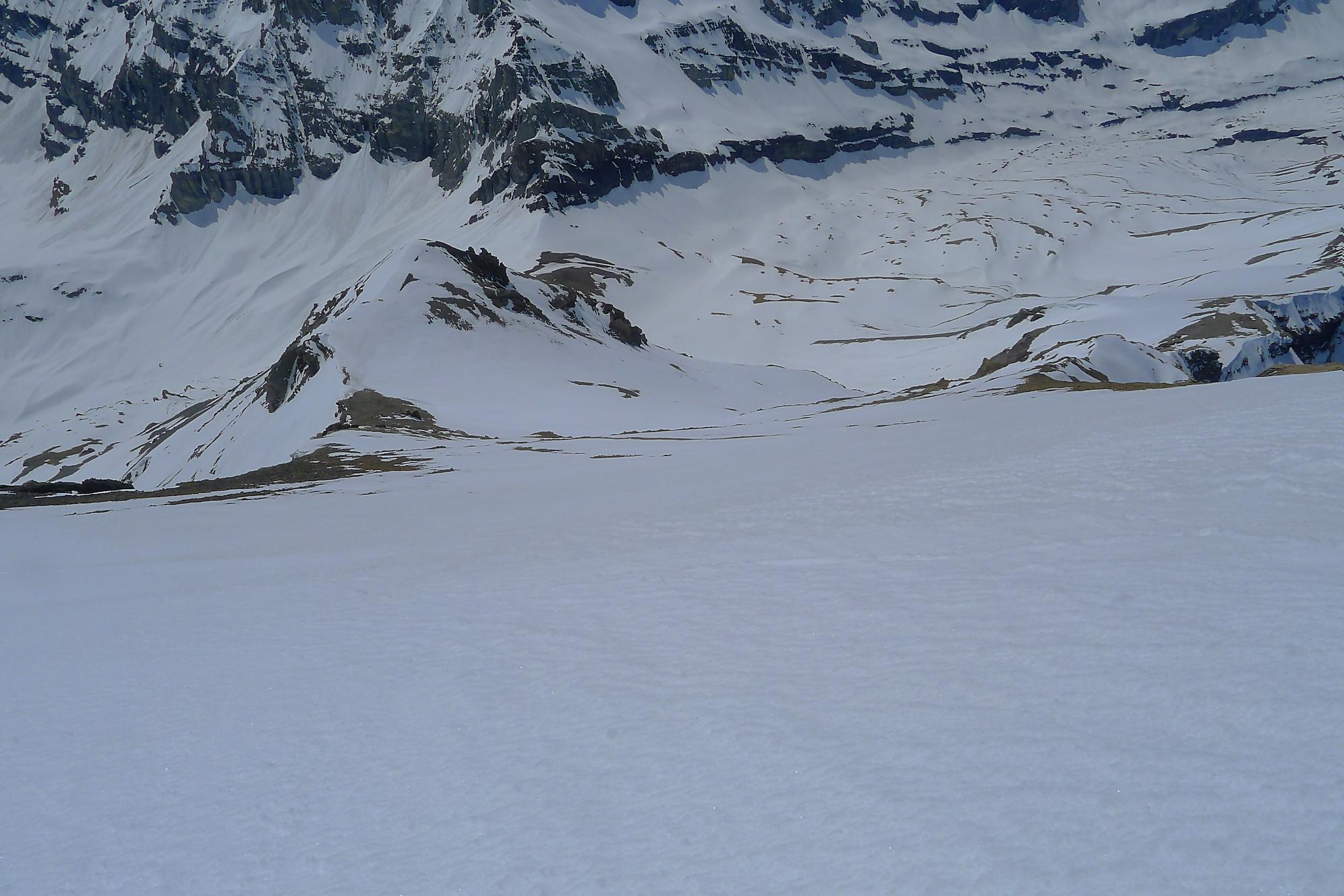 Après 25 min de repos pour les muscles, je descends la face S vers 12h10. Neige de printemps puis très vite lourde, mais skiable. J’arrive au Col des Paresseux (celui qui a donné ce nom, a du le faire depuis son bureau sans jamais avoir mis le nez dehors !) et bascule dans la face E. Le départ est un brin pentu et surtout toujours en neige lourde. Je minimise mes trajectoires, le danger d’avalanche ayant augmenté. Un peu plus bas, je découvre qu’en m’arrêtant, je déclenche une coulée qui engendre une avalanche de surface, parfois importante. J’ai trouvé cela fort agréable car il me suffisait d’attendre et de passer derrière, la neige étant plus dure, enfin moins molle ! J’ai répété ces opérations jusqu’en bas du Pessot, vers Sex Rouge (tiens un Sex Rouge de plus). Dans les dernières pentes, la neige était pourrie, d’habitude je n’aime pas ce type de neige, mais lors de ma sortie au Refuge de Buffère, le guide Greg m’a donné des conseils pour corriger mon style. Je m’en suis souvenu et ai mis en application : de suite cela allait mieux et j’ai même eu du plaisir ! C’est bon d’entendre de précieux conseils et de progresser !