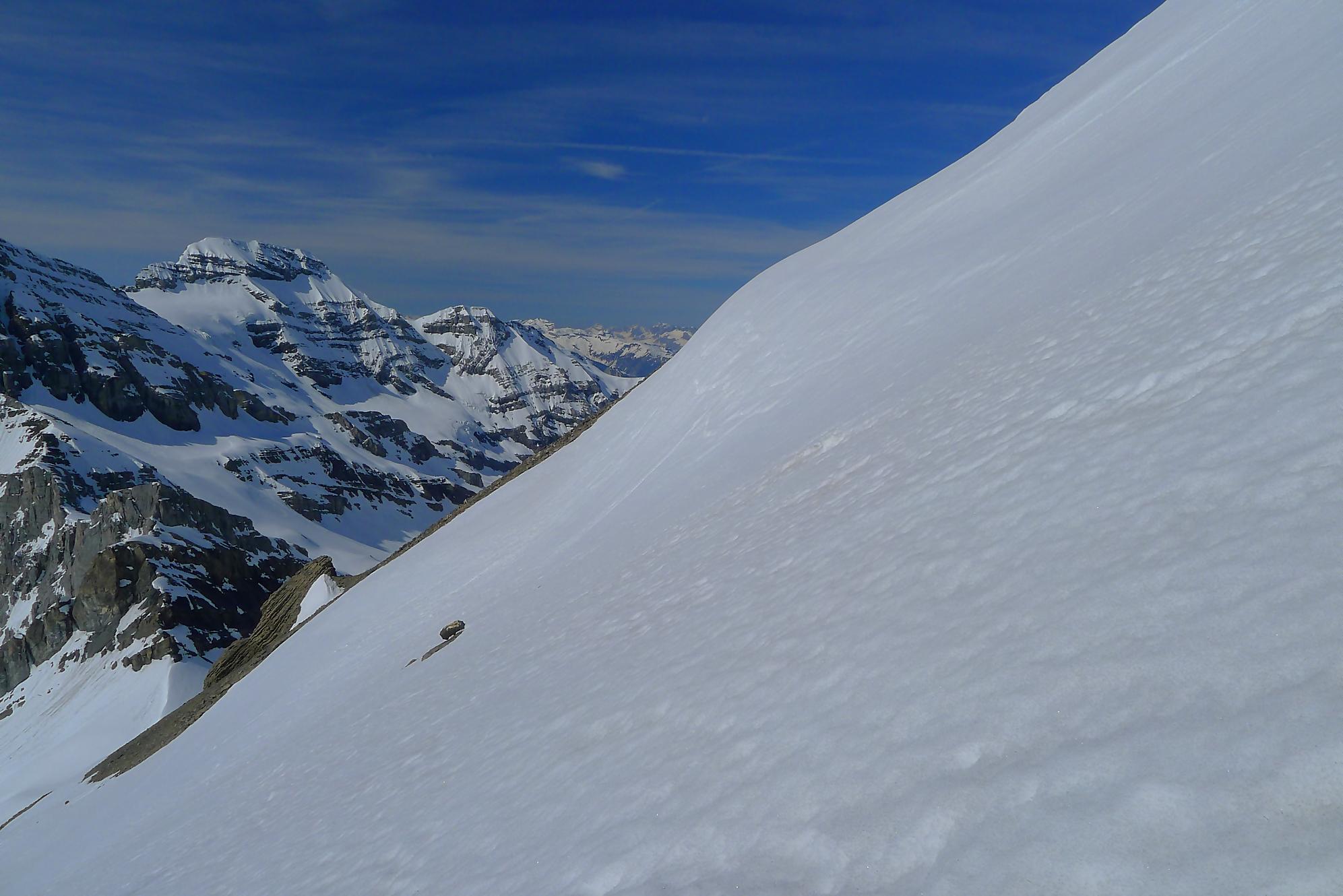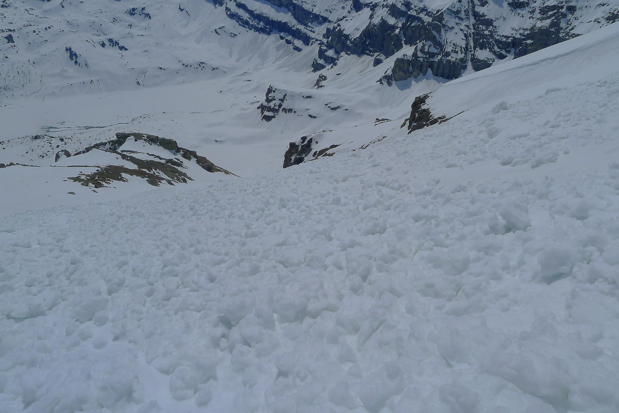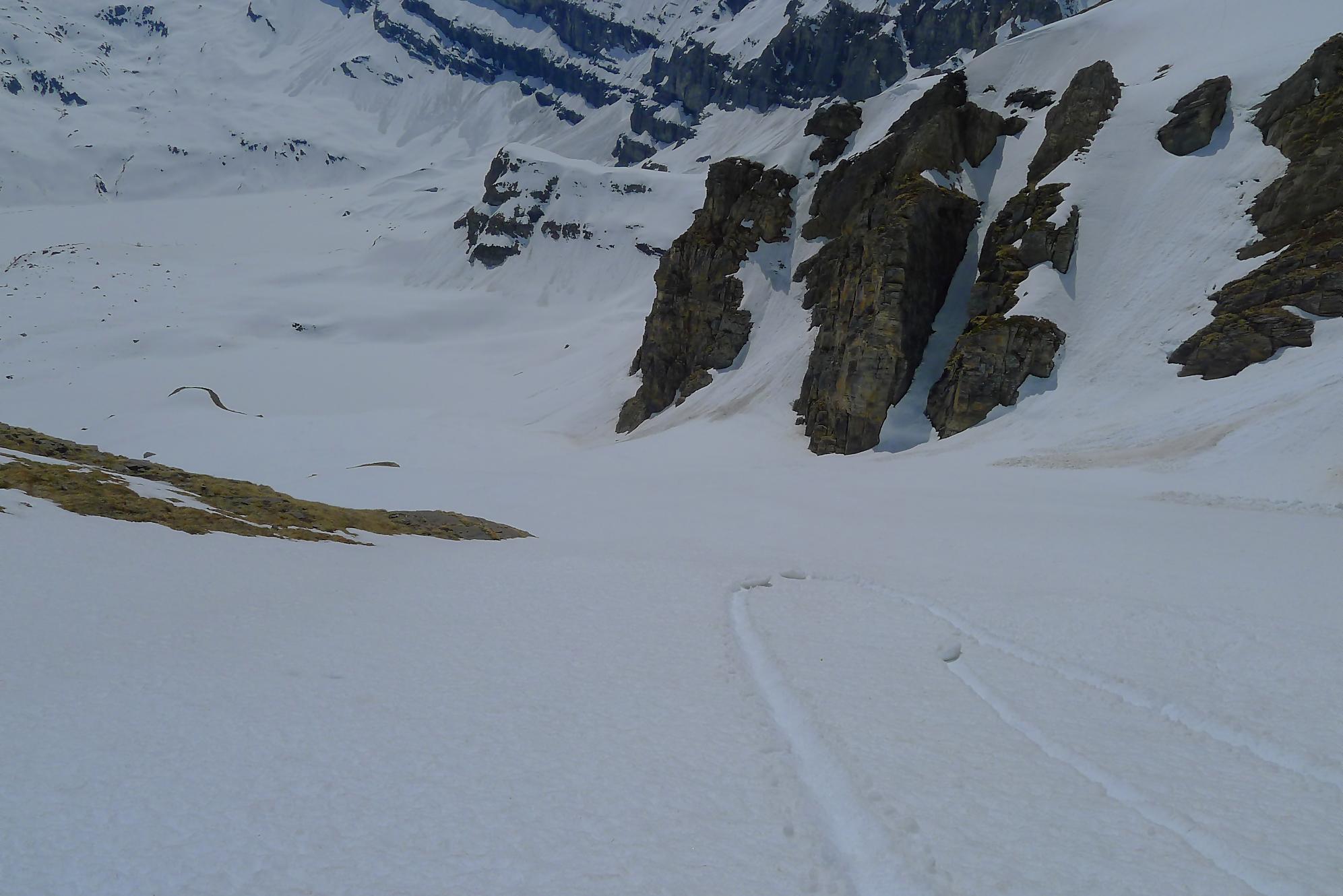 Après 25 min de repos pour les muscles, je descends la face S vers 12h10. Neige de printemps puis très vite lourde, mais skiable. J’arrive au Col des Paresseux (celui qui a donné ce nom, a du le faire depuis son bureau sans jamais avoir mis le nez dehors !) et bascule dans la face E. Le départ est un brin pentu et surtout toujours en neige lourde. Je minimise mes trajectoires, le danger d’avalanche ayant augmenté. Un peu plus bas, je découvre qu’en m’arrêtant, je déclenche une coulée qui engendre une avalanche de surface, parfois importante. J’ai trouvé cela fort agréable car il me suffisait d’attendre et de passer derrière, la neige étant plus dure, enfin moins molle ! J’ai répété ces opérations jusqu’en bas du Pessot, vers Sex Rouge (tiens un Sex Rouge de plus). Dans les dernières pentes, la neige était pourrie, d’habitude je n’aime pas ce type de neige, mais lors de ma sortie au Refuge de Buffère, le guide Greg m’a donné des conseils pour corriger mon style. Je m’en suis souvenu et ai mis en application : de suite cela allait mieux et j’ai même eu du plaisir ! C’est bon d’entendre de précieux conseils et de progresser !