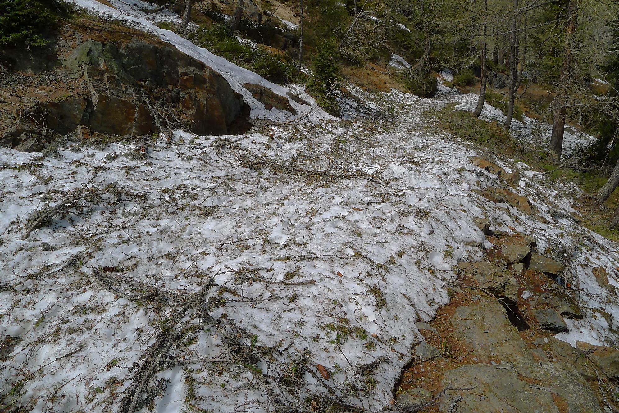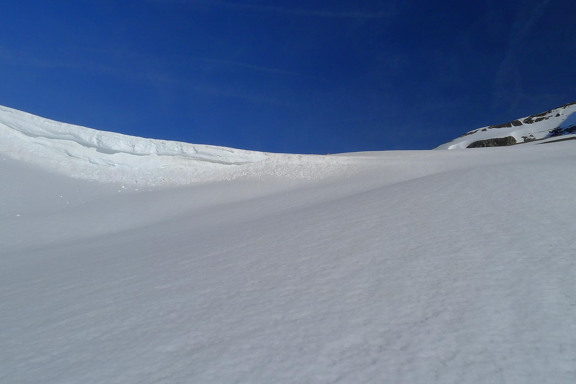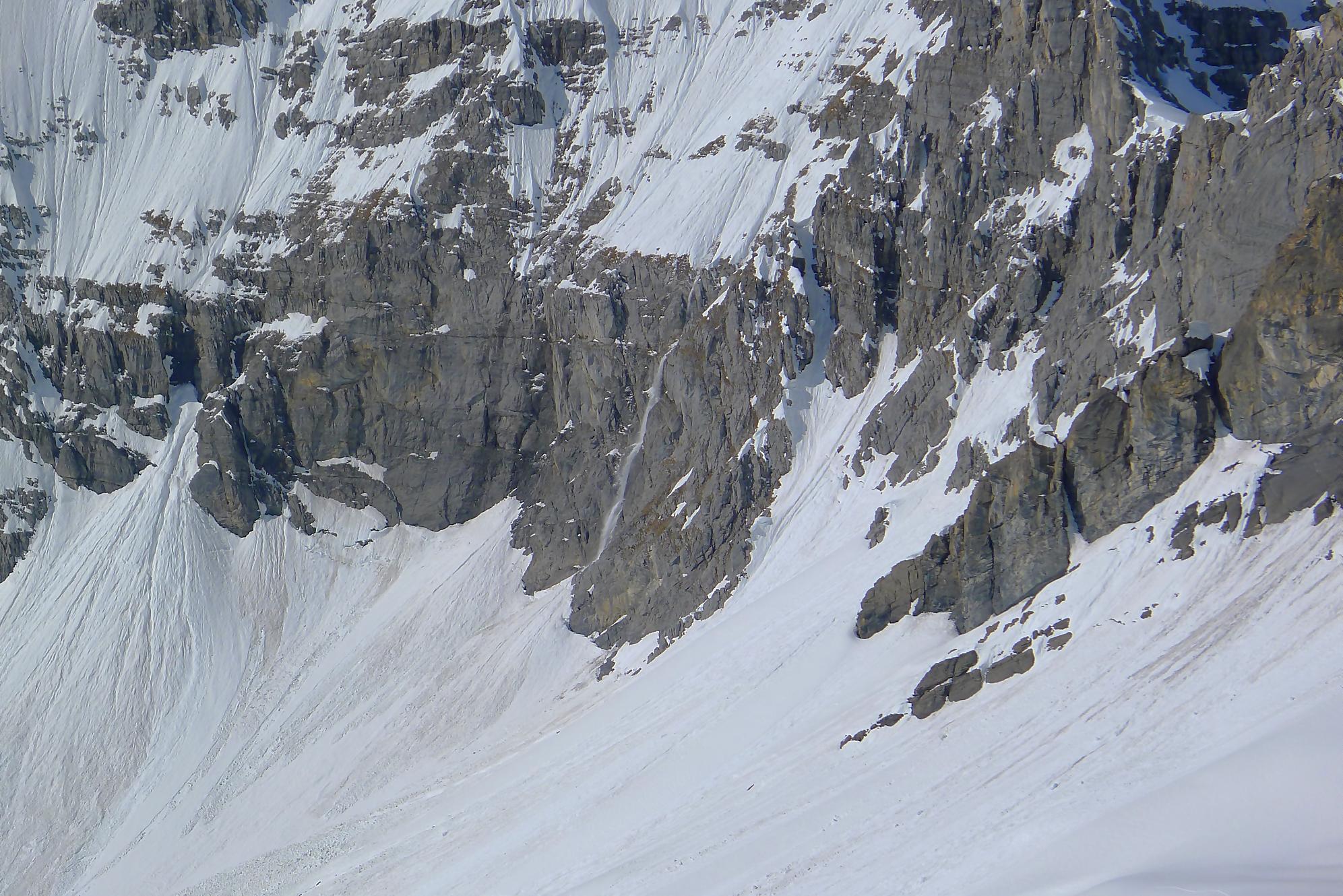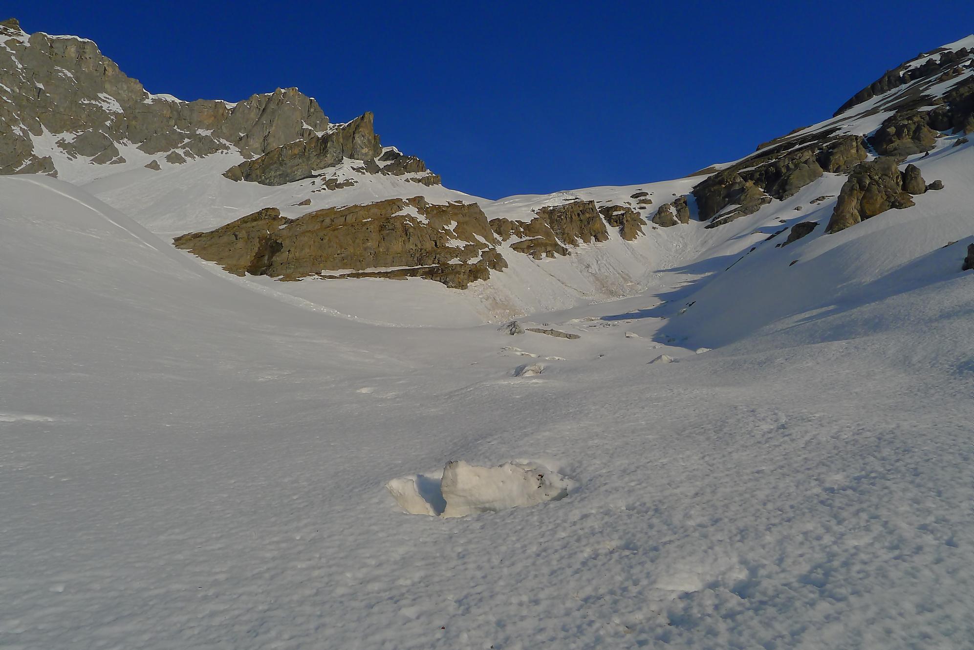 Après 25 min de repos pour les muscles, je descends la face S vers 12h10. Neige de printemps puis très vite lourde, mais skiable. J’arrive au Col des Paresseux (celui qui a donné ce nom, a du le faire depuis son bureau sans jamais avoir mis le nez dehors !) et bascule dans la face E. Le départ est un brin pentu et surtout toujours en neige lourde. Je minimise mes trajectoires, le danger d’avalanche ayant augmenté. Un peu plus bas, je découvre qu’en m’arrêtant, je déclenche une coulée qui engendre une avalanche de surface, parfois importante. J’ai trouvé cela fort agréable car il me suffisait d’attendre et de passer derrière, la neige étant plus dure, enfin moins molle ! J’ai répété ces opérations jusqu’en bas du Pessot, vers Sex Rouge (tiens un Sex Rouge de plus). Dans les dernières pentes, la neige était pourrie, d’habitude je n’aime pas ce type de neige, mais lors de ma sortie au Refuge de Buffère, le guide Greg m’a donné des conseils pour corriger mon style. Je m’en suis souvenu et ai mis en application : de suite cela allait mieux et j’ai même eu du plaisir ! C’est bon d’entendre de précieux conseils et de progresser !